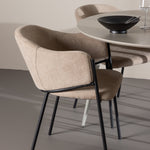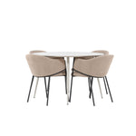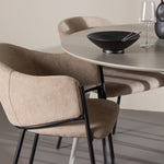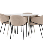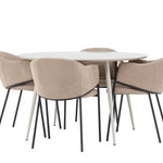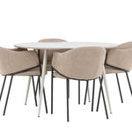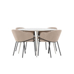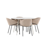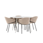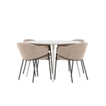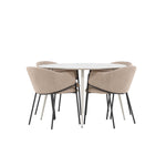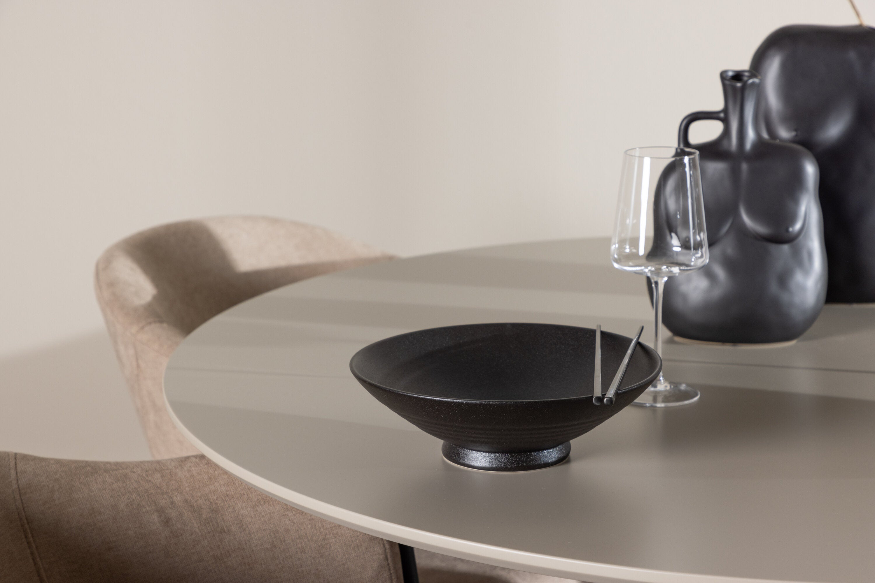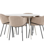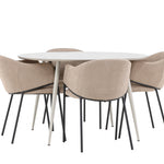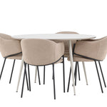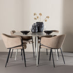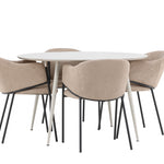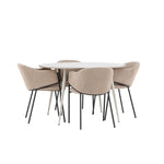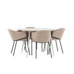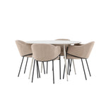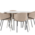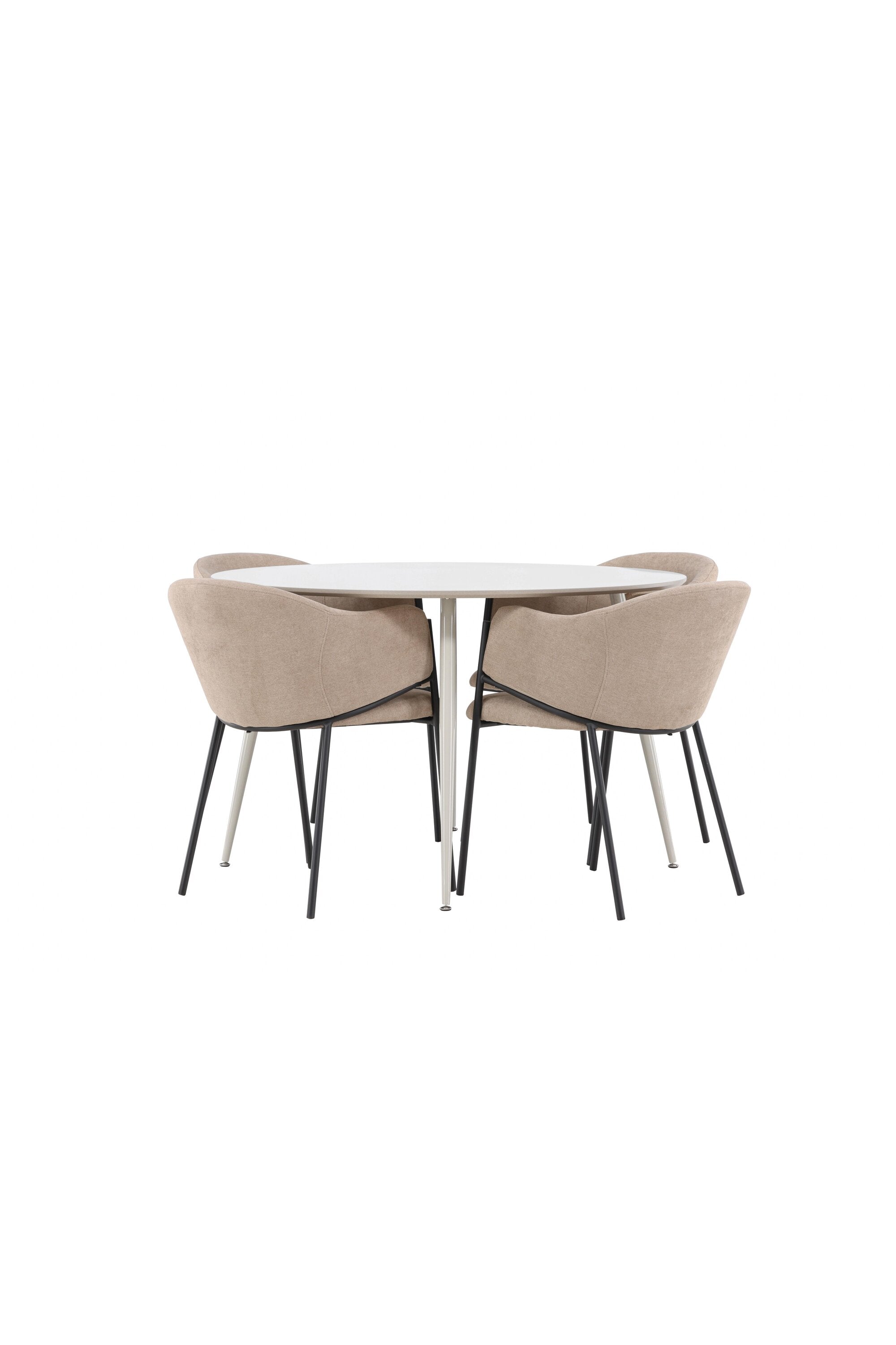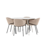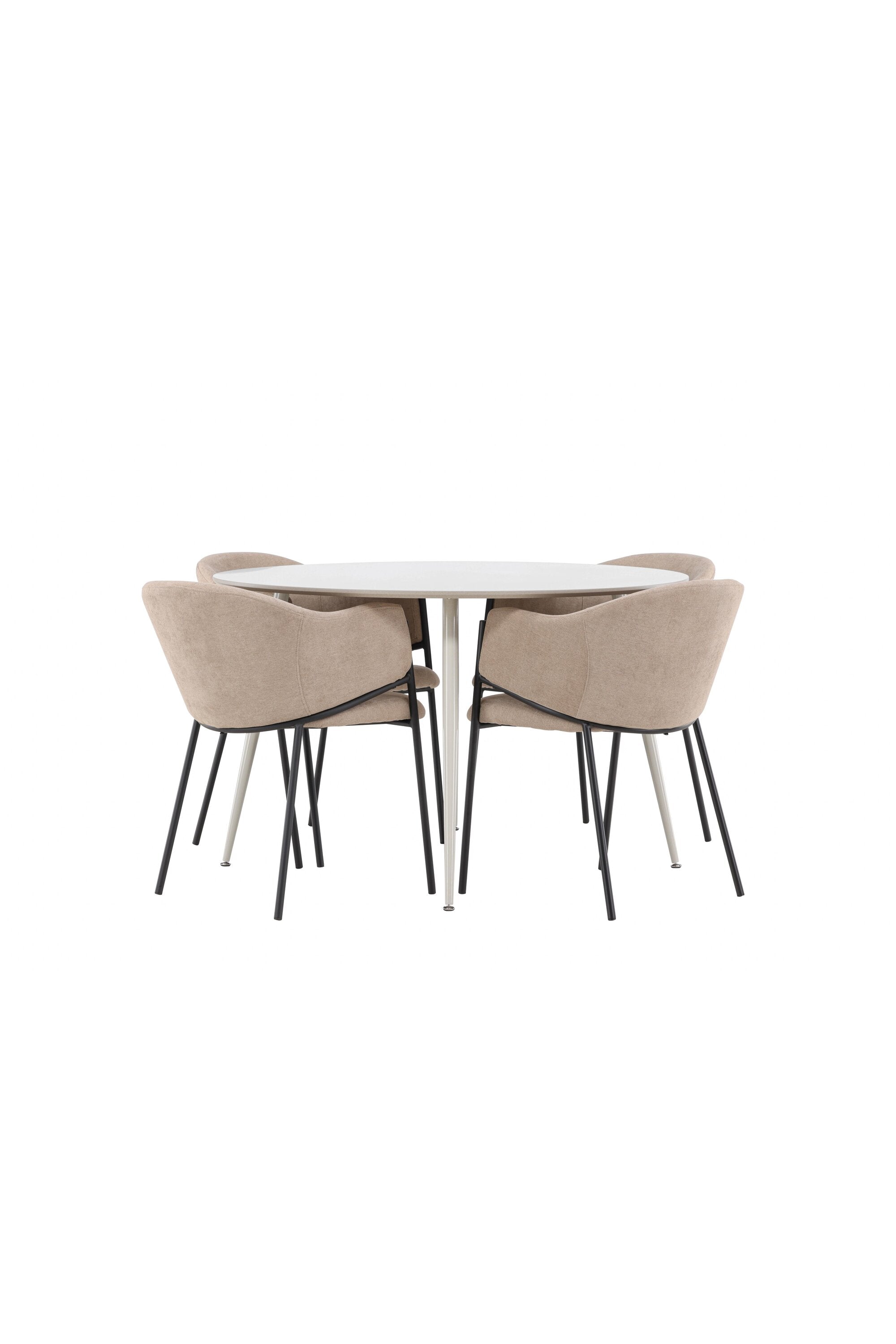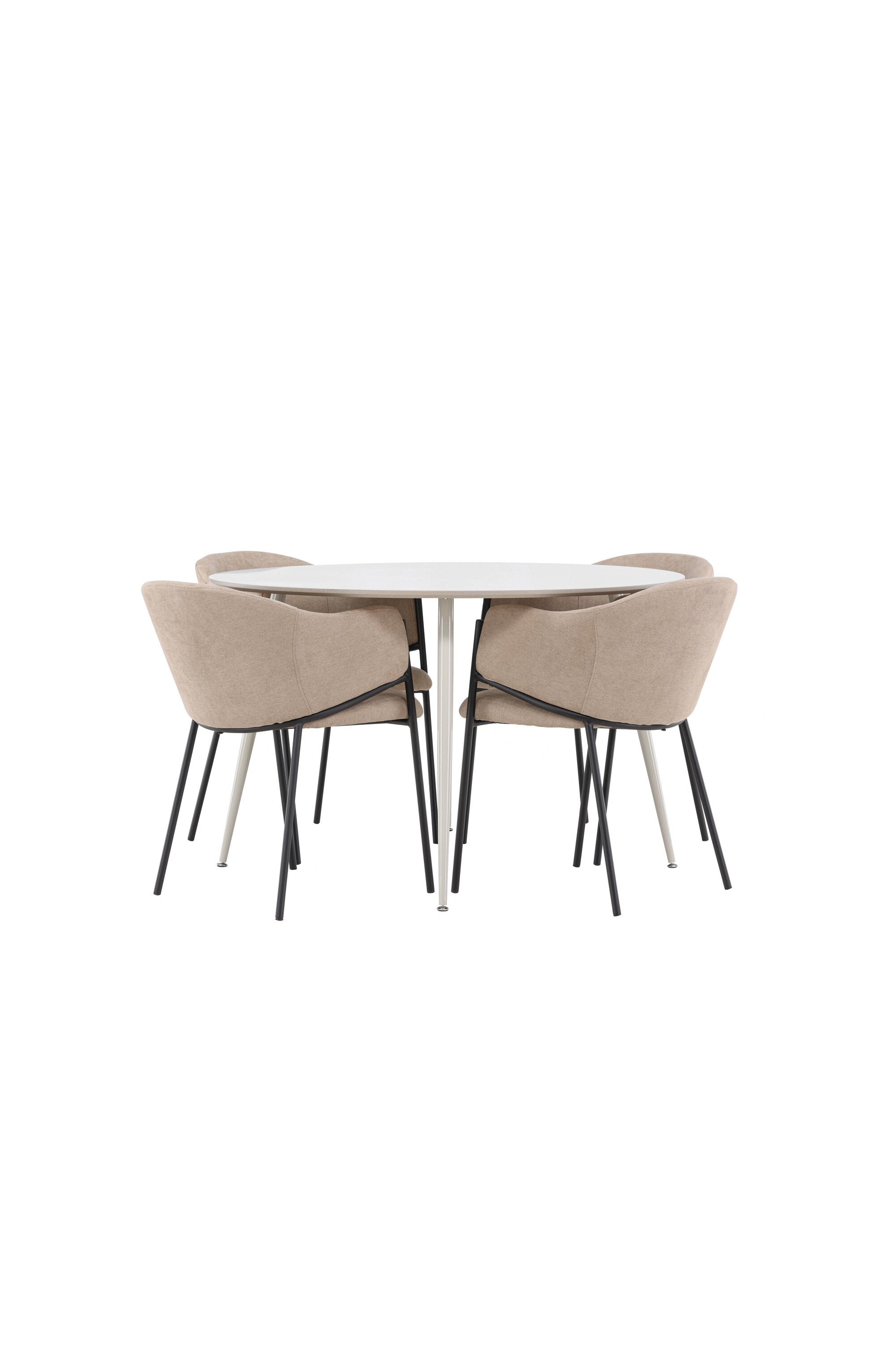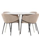 Dodejte své jídelně moderní a elegantní vylepšení s naší stylovou jídelní sadou, která kombinuje sofistikovaný stůl Plaza s pohodlnými židlemi Evelina. Tato jídelní souprava je ideální jak pro každodenní večeři, tak pro zvláštní příležitosti, vytváří příjemnou a harmonickou atmosféru ve vašem domově. Stůl Plaza, vyrobený z MDF, má světle béžovou barvu, která dodá vaší jídelně měkký a hřejivý pocit. Stůl s velkorysým průměrem 120 cm nabízí dostatek prostoru pro jídlo i rozhovory, přičemž jeho kulatý tvar přispívá k vyváženému a útulnému prostředí. Robustní konstrukce stolu zajišťuje dlouhodobé používání a stabilitu. Čtyři židle Evelina skvěle doplňují stůl s elegantními sedáky čalouněnými béžovým lnem a elegantními černými nohami. Tyto židle nabízejí pohodlí i styl, díky čemuž jsou ideální pro dlouhé a příjemné stolování s rodinou a přáteli. Jejich moderní design s vysokými opěradly a pohodlnými sedadly dodá vaší jídelně sofistikovaný a moderní nádech. Tento jídelní set je dokonalou kombinací estetiky a funkčnosti, takže je vynikající volbou pro ty, kteří hledají elegantní a pohodlný jídelní kout. Vylepšete svou jídelnu stylovou kombinací stolu Plaza a židlí Evelina a vytvořte si místo, kde se budou sdílet vzpomínky a radost.