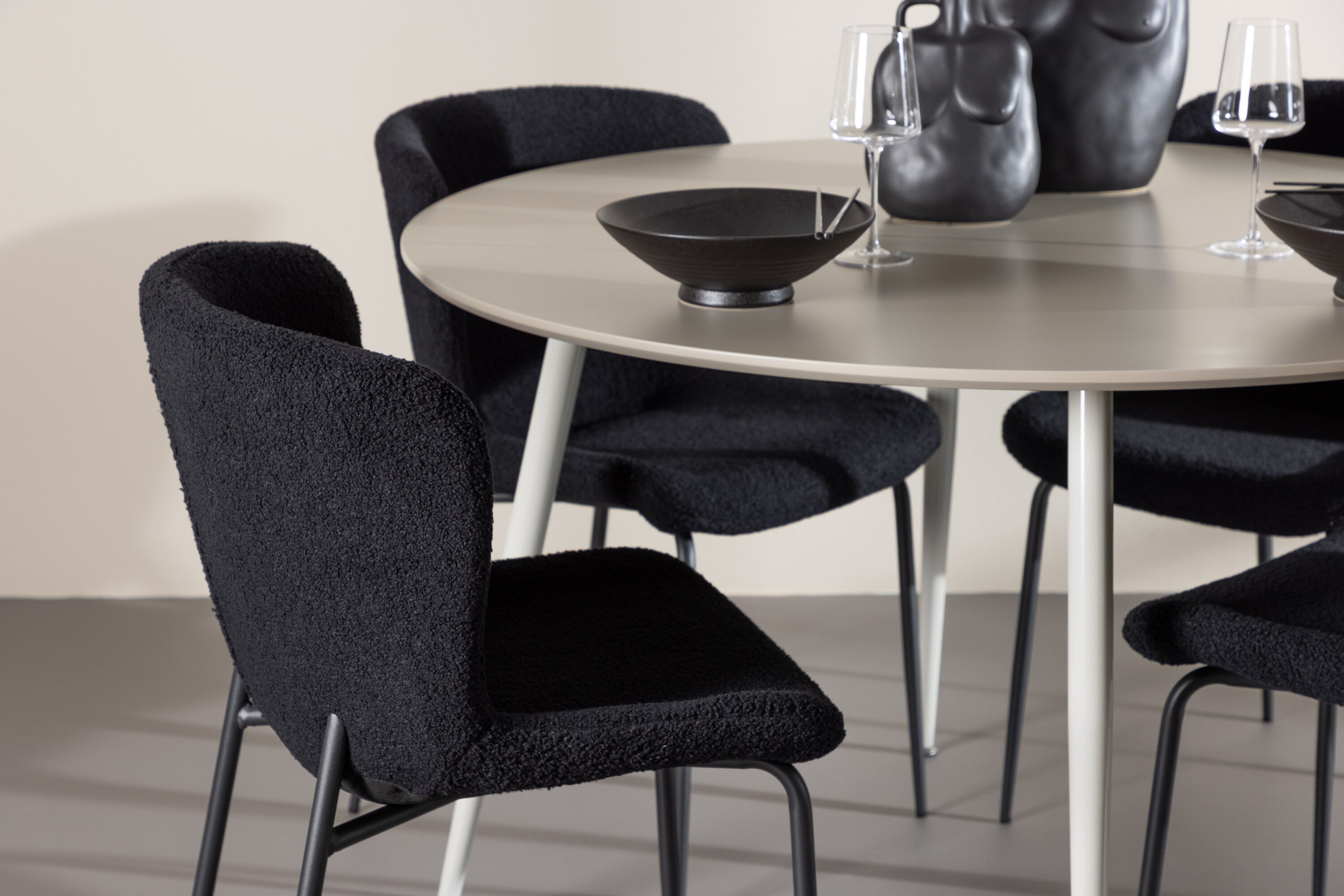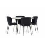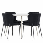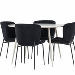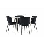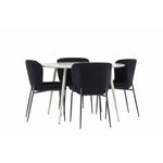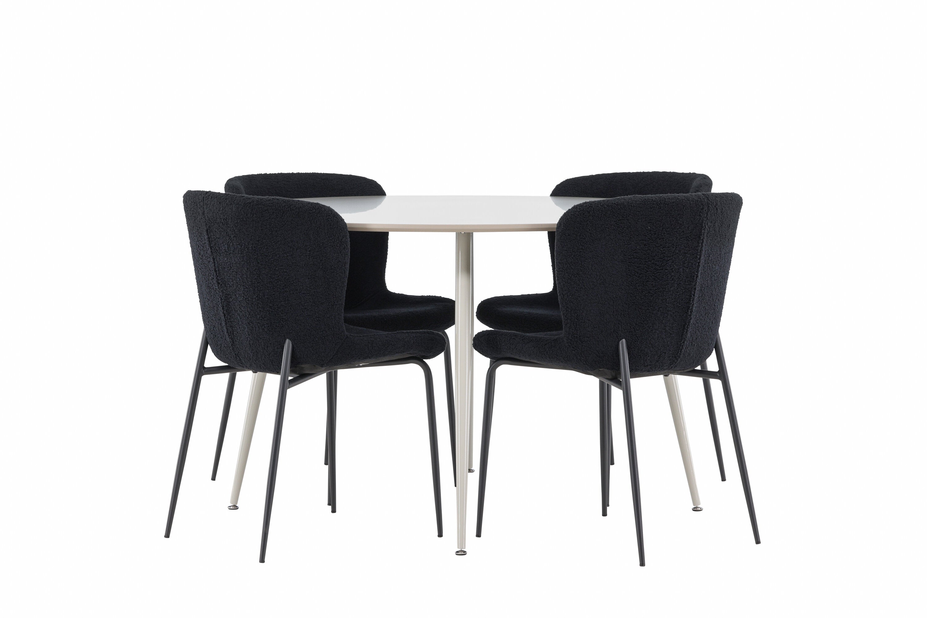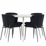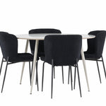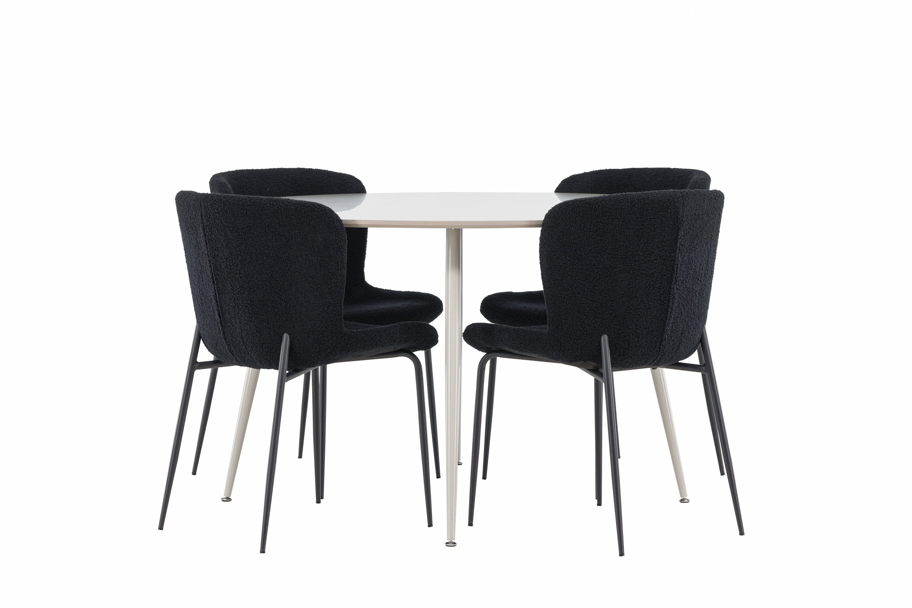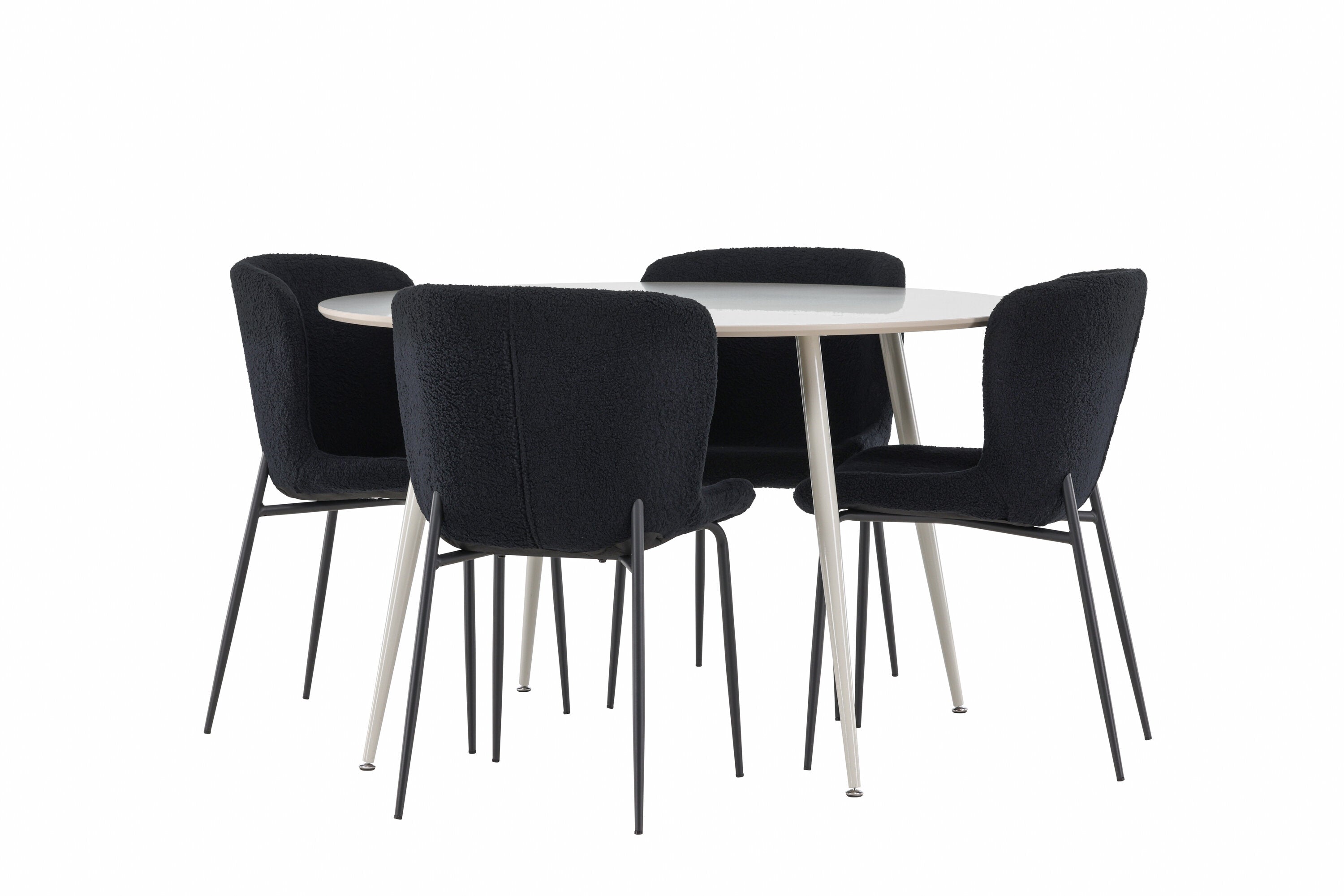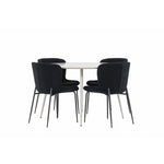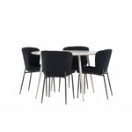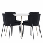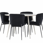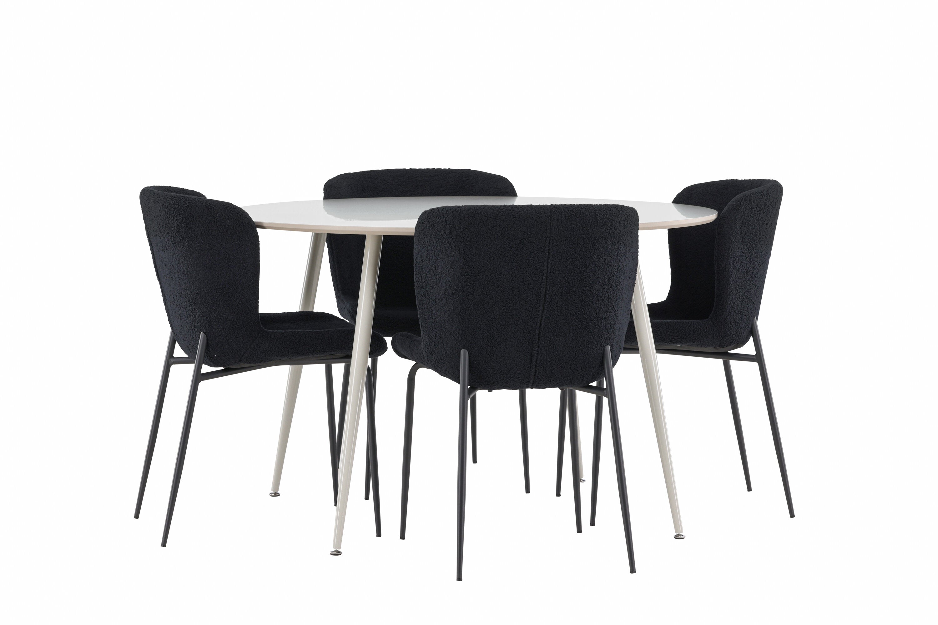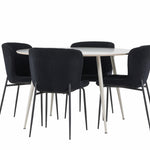 Dopřejte své jídelně moderní a sofistikovaný upgrade s naší elegantní jídelní sadou, která kombinuje stylový stůl Plaza s luxusními židlemi Modesto. Tato jídelní souprava je ideální jak pro každodenní večeři, tak pro zvláštní příležitosti, vytváří příjemnou a elegantní atmosféru ve vašem domově. Stůl Plaza, vyrobený z MDF, má světle béžovou barvu, která dodá vaší jídelně měkký a hřejivý pocit. Stůl s velkorysým průměrem 120 cm nabízí dostatek prostoru pro jídlo i rozhovory, přičemž jeho kulatý tvar přispívá k harmonickému a vyváženému prostředí. Robustní konstrukce stolu zajišťuje odolnost a stabilitu pro dlouhodobé používání. Čtyři židle Modesto jsou čalouněny měkkým a pohodlným polyesterovým plyšem v elegantní černé barvě. Tyto židle nabízejí kombinaci pohodlí a stylu, díky čemuž jsou ideální pro dlouhé a příjemné stolování s rodinou a přáteli. Jejich moderní design s vysokými opěradly a luxusními sedáky dodá vaší jídelně sofistikovaný a moderní nádech. Tento jídelní set je dokonalou kombinací estetiky a funkčnosti, takže je vynikající volbou pro ty, kteří hledají elegantní a pohodlný jídelní kout. Vylepšete svou jídelnu stylovou kombinací stolu Plaza a židlí Modesto a vytvořte si místo, kde se budou sdílet vzpomínky a radost.