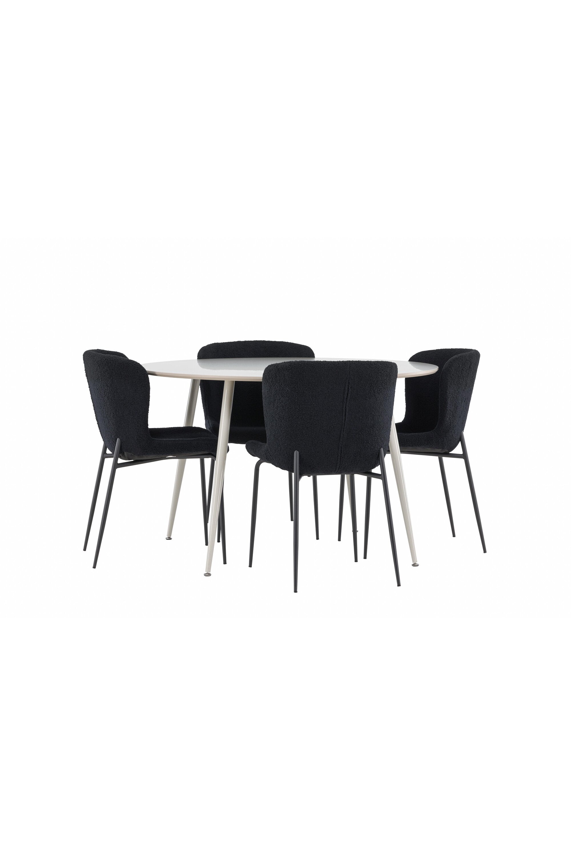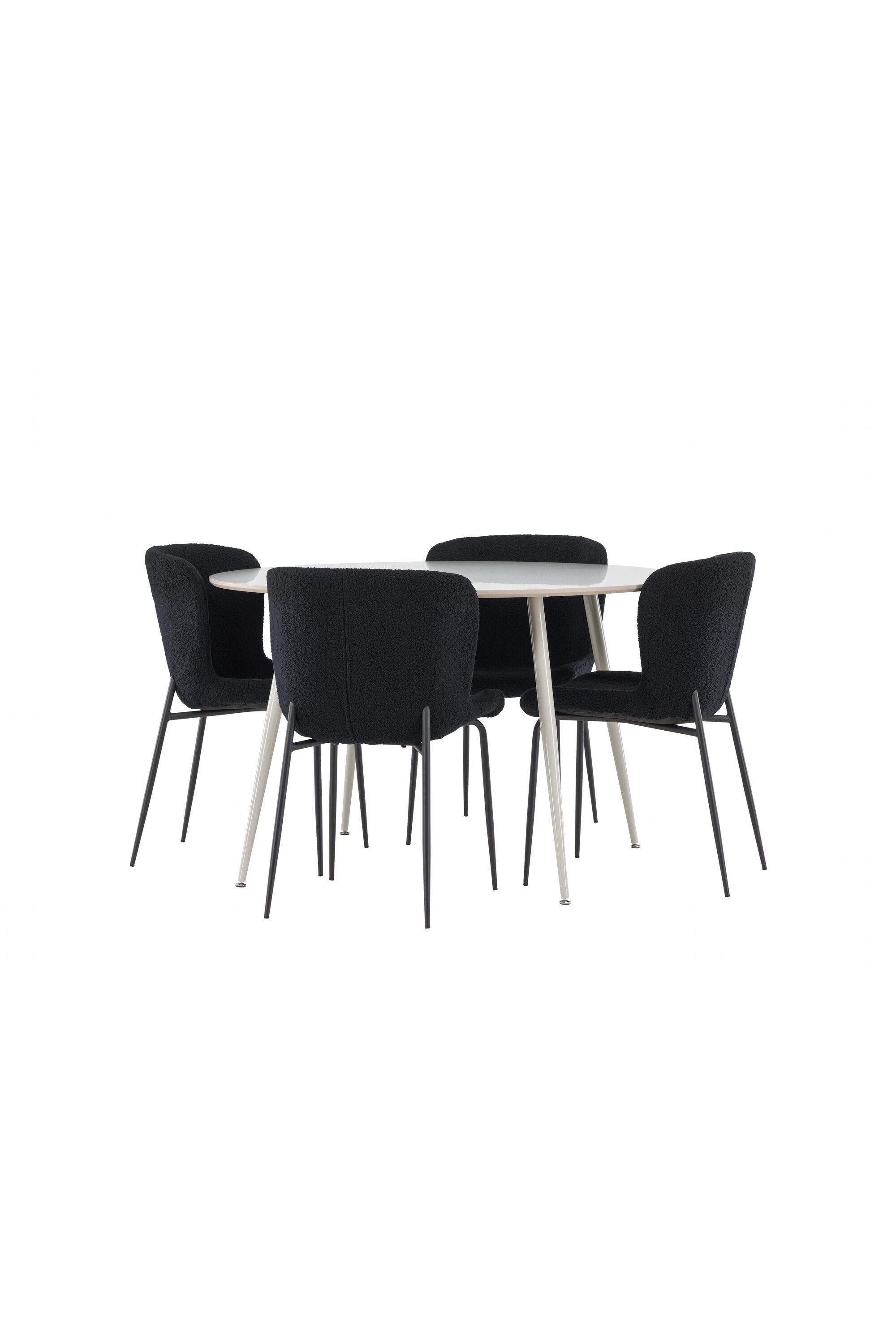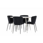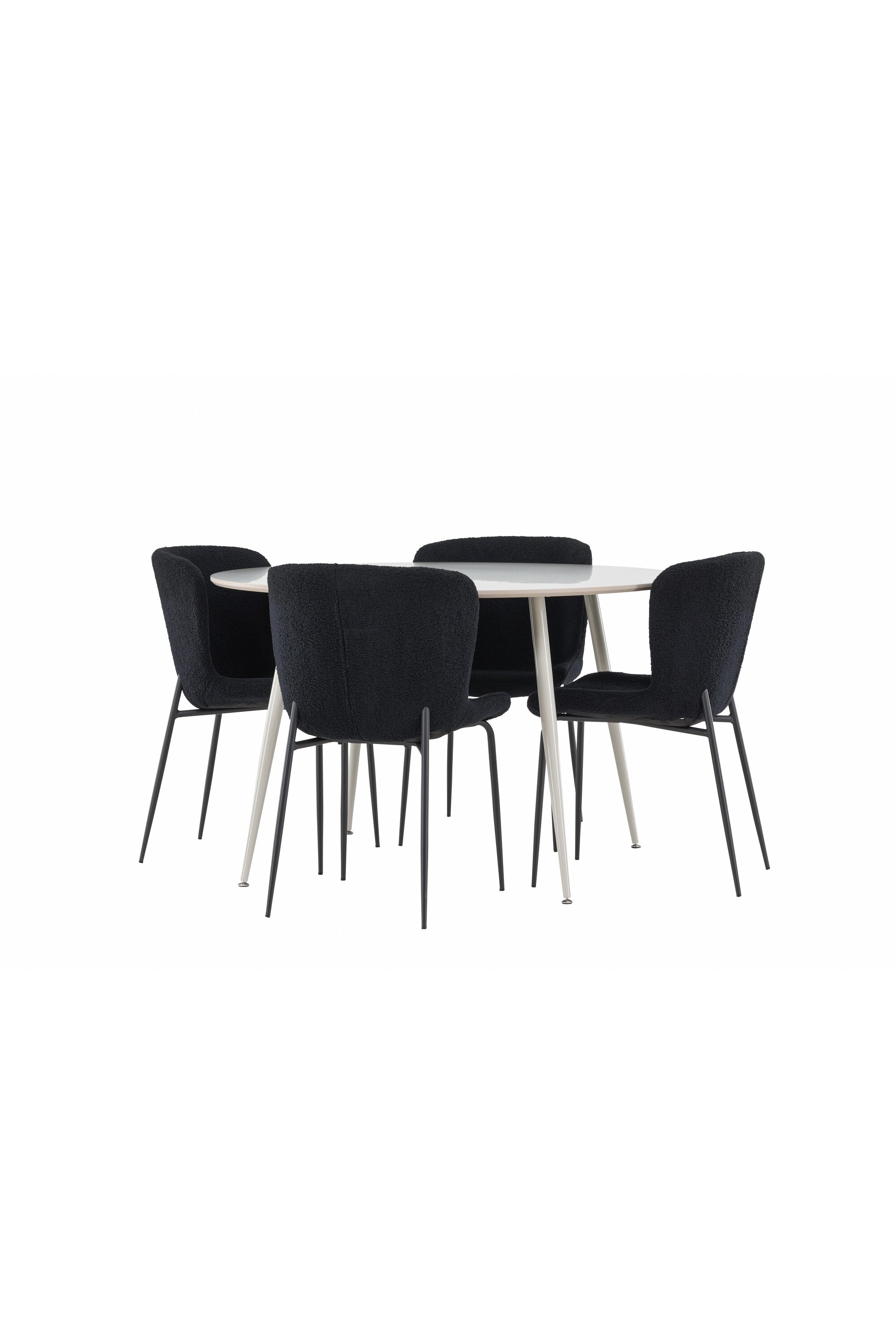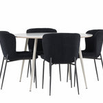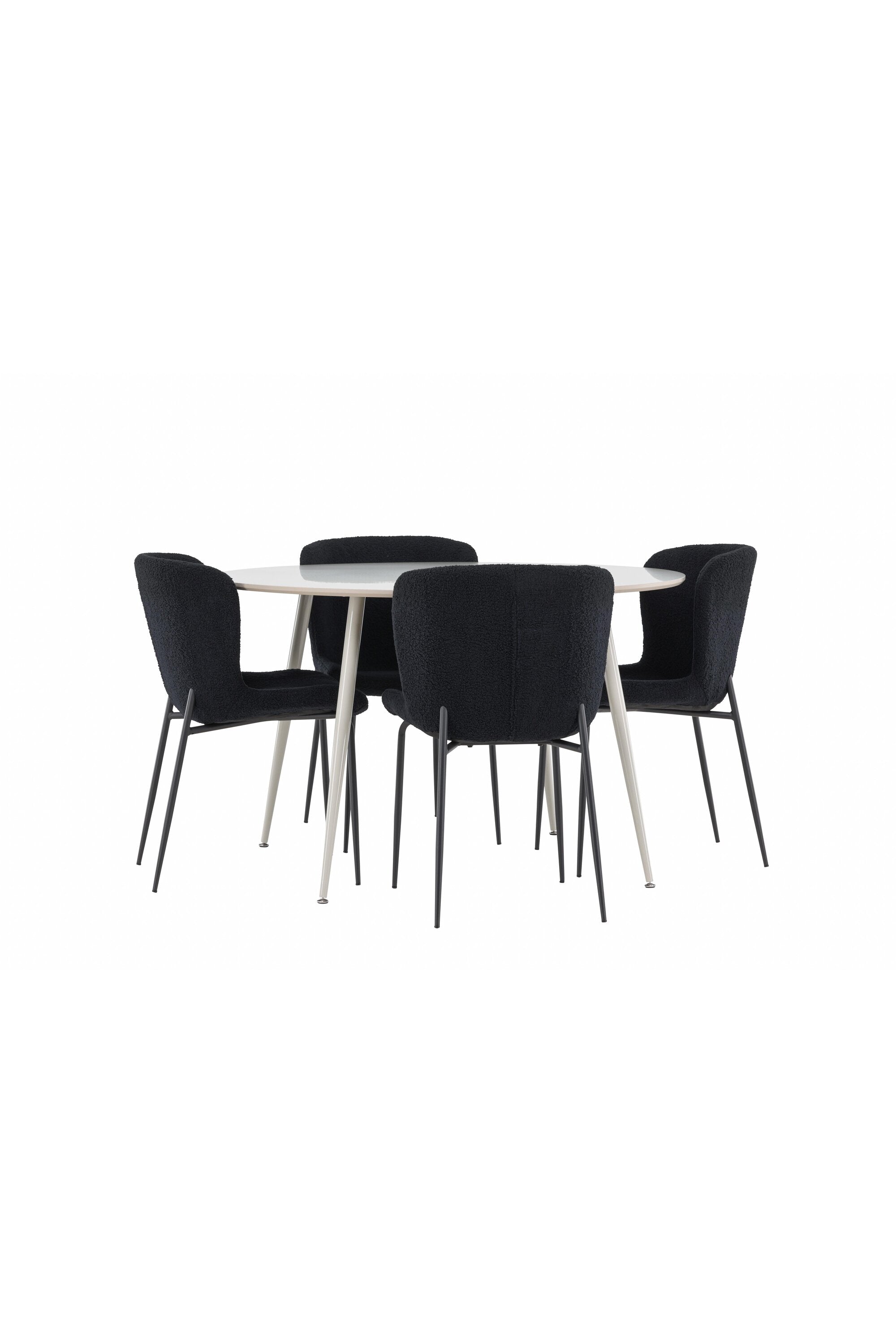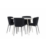 Dopřejte své jídelně moderní a sofistikovaný upgrade s naší elegantní jídelní sadou, která kombinuje stylový stůl Plaza s luxusními židlemi Modesto. Tato jídelní souprava je ideální jak pro každodenní večeři, tak pro zvláštní příležitosti, vytváří příjemnou a elegantní atmosféru ve vašem domově. Stůl Plaza, vyrobený z MDF, má světle béžovou barvu, která dodá vaší jídelně měkký a hřejivý pocit. Stůl s velkorysým průměrem 120 cm nabízí dostatek prostoru pro jídlo i rozhovory, přičemž jeho kulatý tvar přispívá k harmonickému a vyváženému prostředí. Robustní konstrukce stolu zajišťuje odolnost a stabilitu pro dlouhodobé používání. Čtyři židle Modesto jsou čalouněny měkkým a pohodlným polyesterovým plyšem v elegantní černé barvě. Tyto židle nabízejí kombinaci pohodlí a stylu, díky čemuž jsou ideální pro dlouhé a příjemné stolování s rodinou a přáteli. Jejich moderní design s vysokými opěradly a luxusními sedáky dodá vaší jídelně sofistikovaný a moderní nádech. Tento jídelní set je dokonalou kombinací estetiky a funkčnosti, takže je vynikající volbou pro ty, kteří hledají elegantní a pohodlný jídelní kout. Vylepšete svou jídelnu stylovou kombinací stolu Plaza a židlí Modesto a vytvořte si místo, kde se budou sdílet vzpomínky a radost.