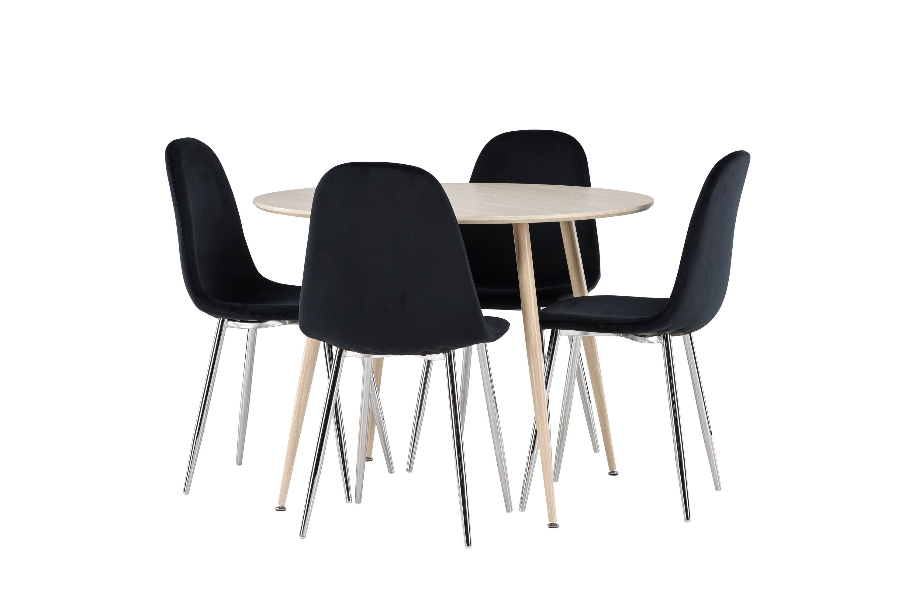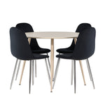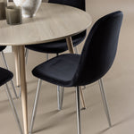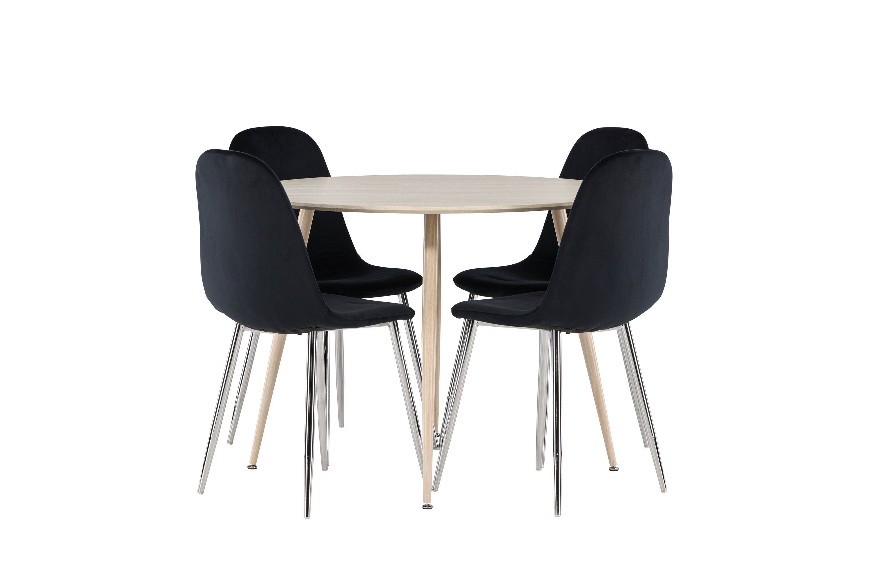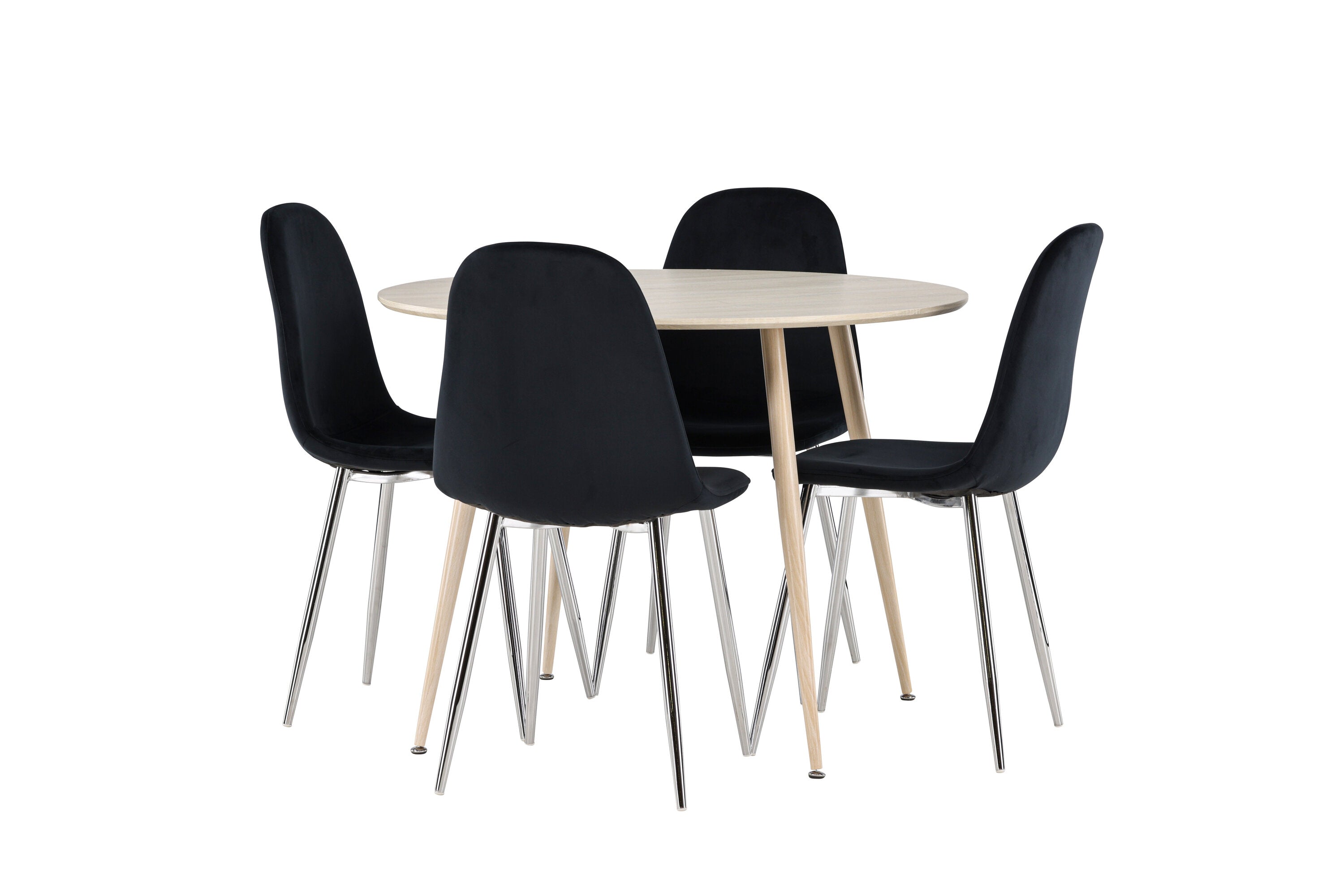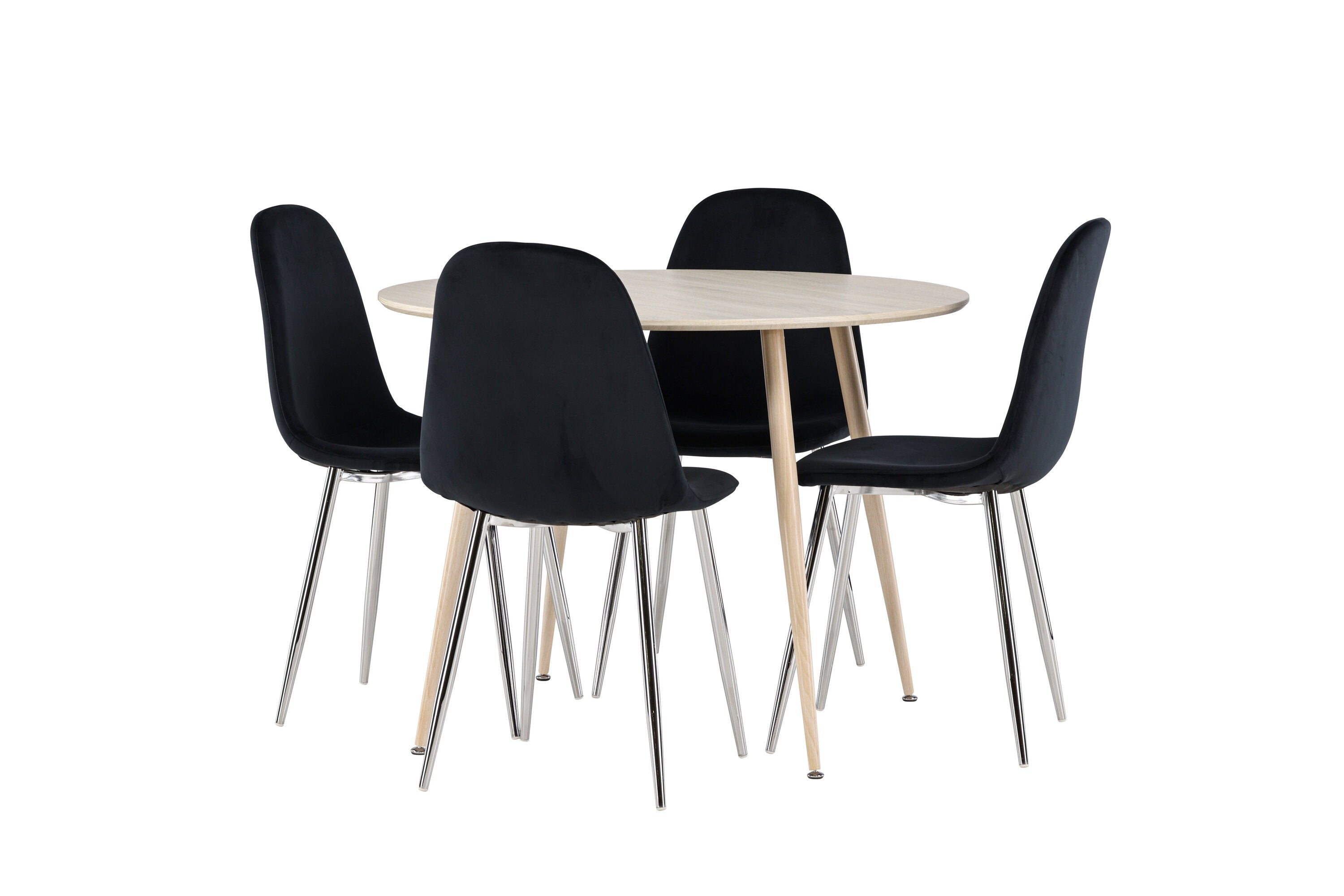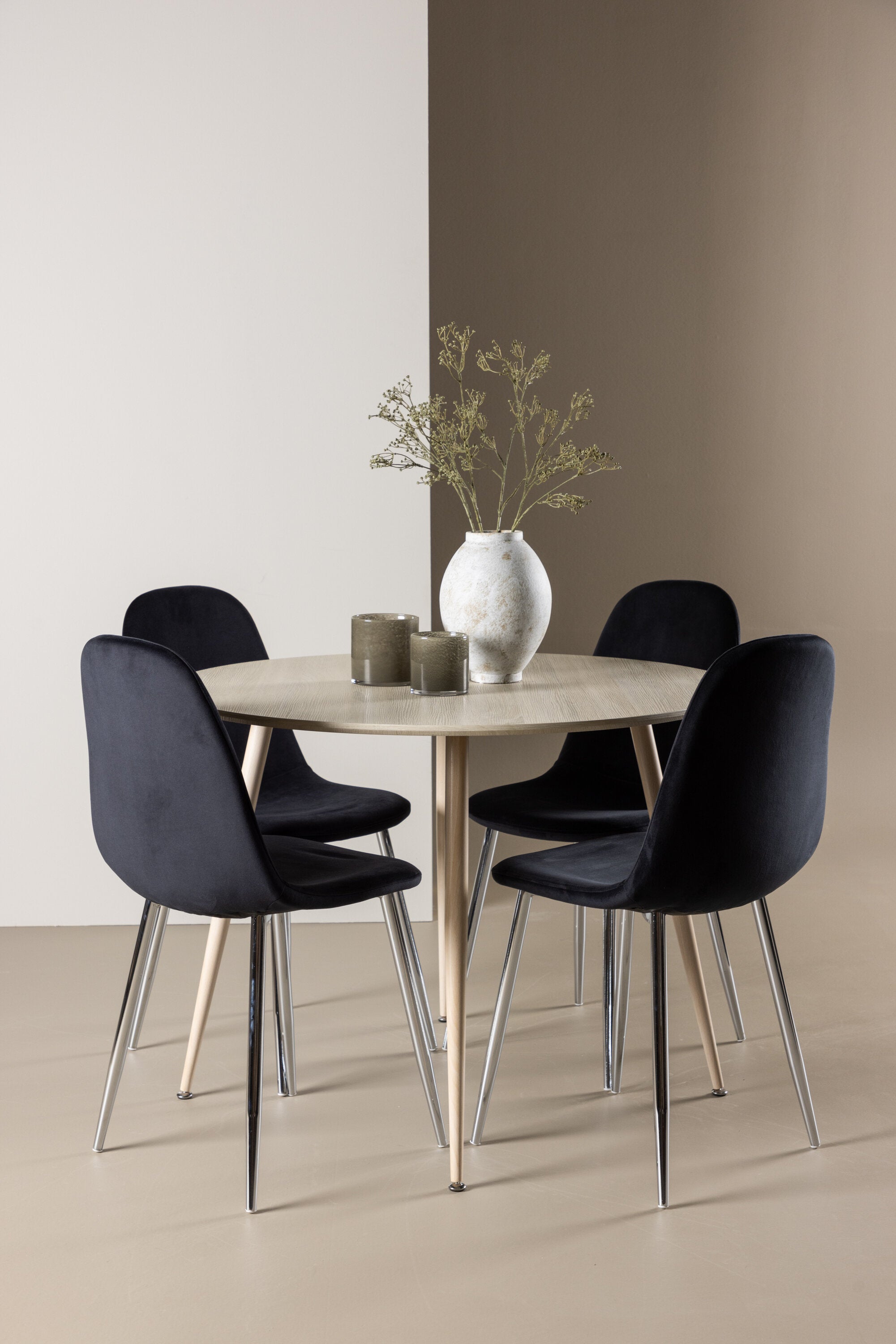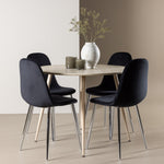 Objevte perfektní jídelní set pro váš domov s jídelním stolem Plaza a jídelními židlemi Polar. Jídelní stůl Plaza s velkorysým průměrem 100 cm je vyroben z odolného MDF materiálu a má bíle pigmentovanou barvu, která dodává místnosti hřejivý a příjemný pocit. Jeho moderní design a čisté linie vytvářejí klidnou a harmonickou atmosféru, díky níž je každé jídlo relaxačním zážitkem. Díky kompaktnímu formátu je Plaza ideální pro menší prostory a zároveň nabízí dostatek prostoru pro pohodlné jídlo s rodinou a přáteli. Doplňte svůj jídelní stůl elegantními jídelními židlemi Polar, které svým celočalouněným designem nabízejí luxusní pocit, nohy z chromovaného kovu, mírně zaoblené opěradlo a sedák z elegantní černé sametové látky s měkkým polstrováním pro extra pohodlí. Zde nemusíte dělat kompromisy mezi pohodlím a designem. Tyto židle dokonale ladí s jídelním stolem Plaza a vytvářejí kompletní a příjemnou jídelní soupravu pro srdce vašeho domova. Dodejte svému domovu moderní a stylový nádech s jídelním stolem Plaza a jídelními židlemi Polar – dokonalá kombinace pro ty, kteří oceňují styl i funkci ve svém interiéru. Užijte si lahodná jídla a příjemné chvíle s tímto stylovým jídelním setem.