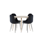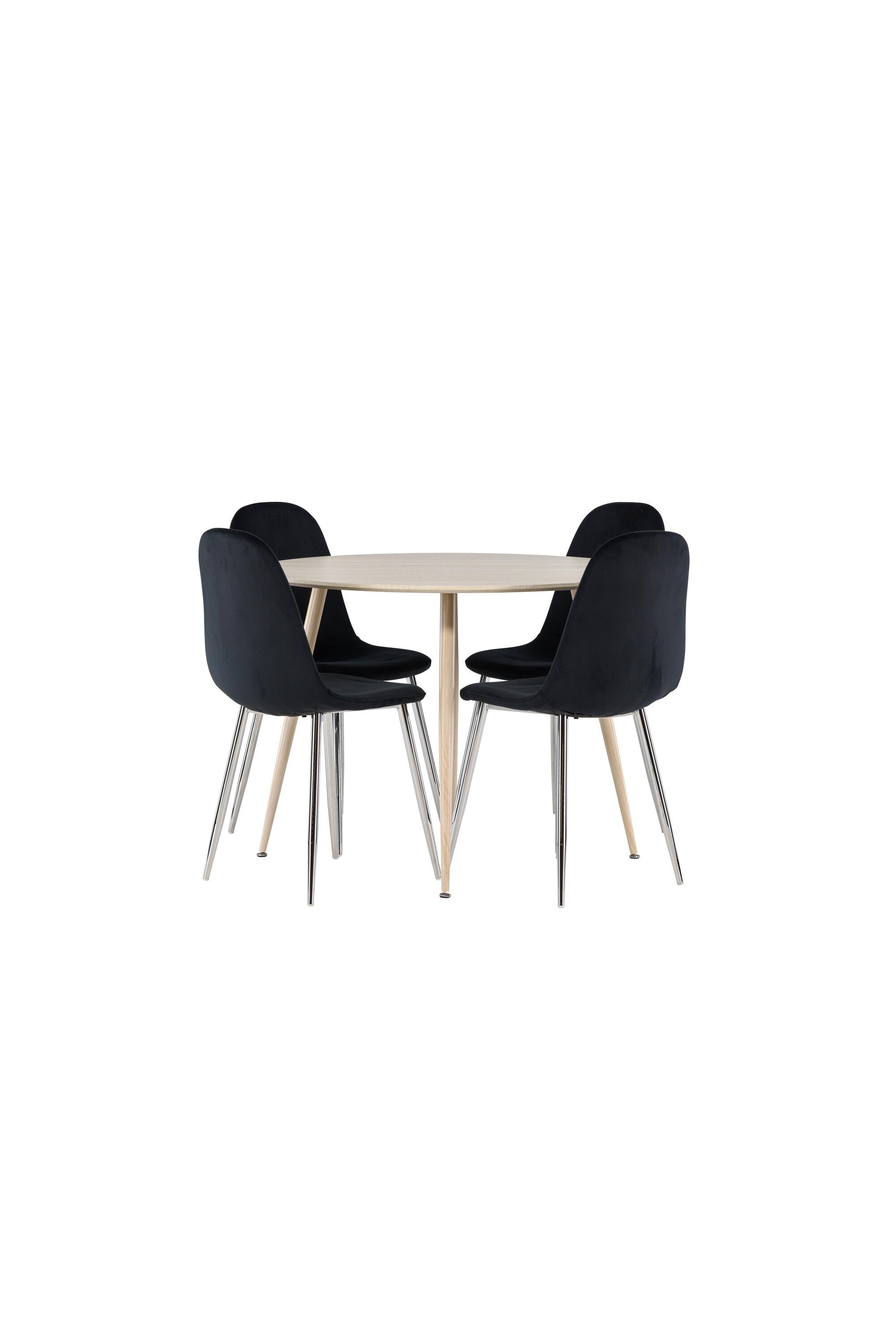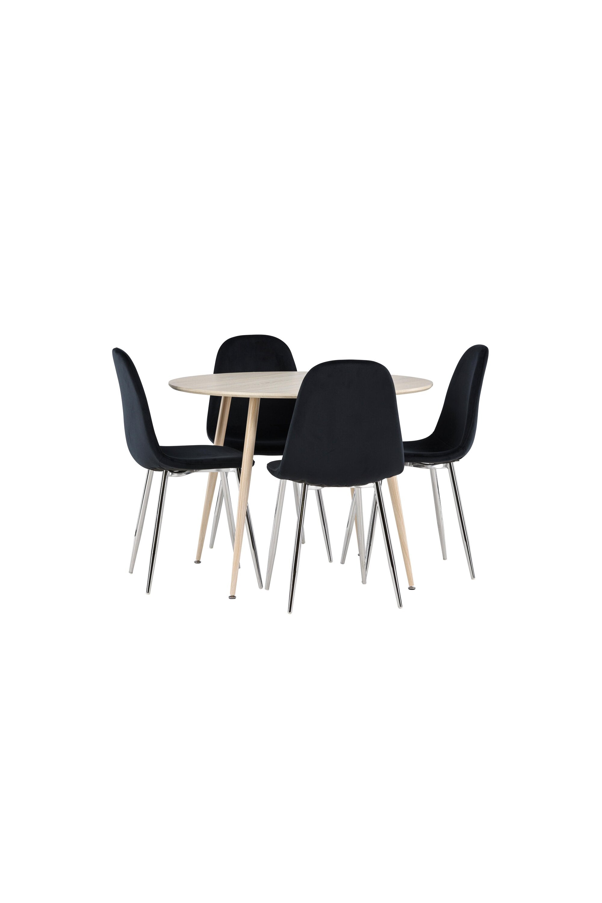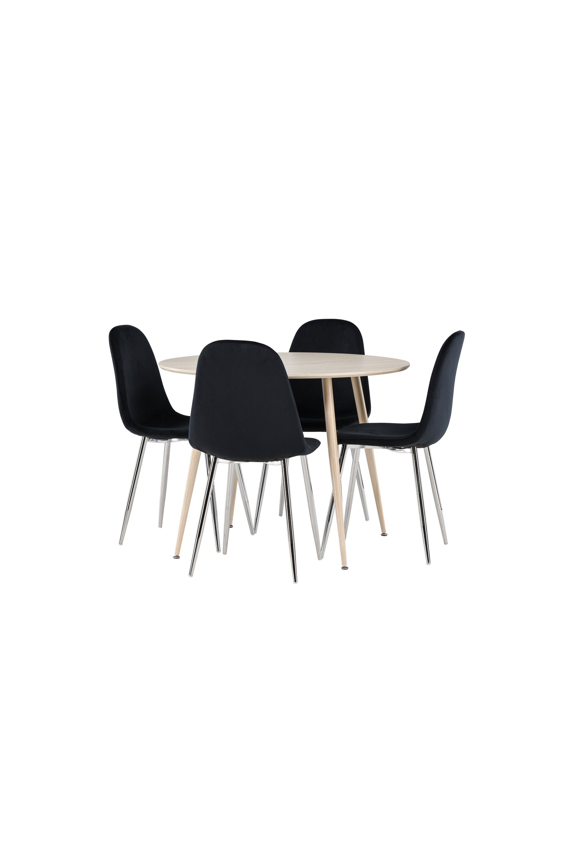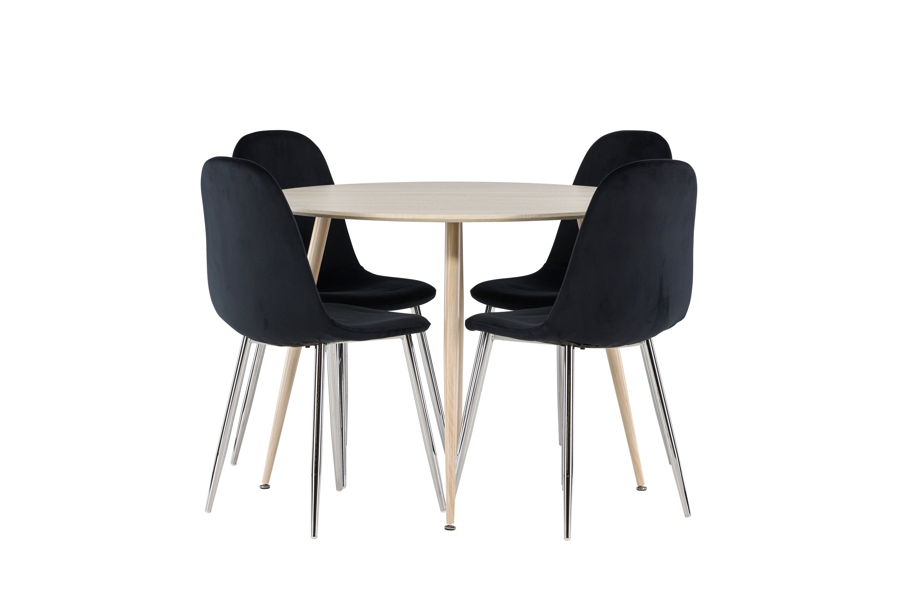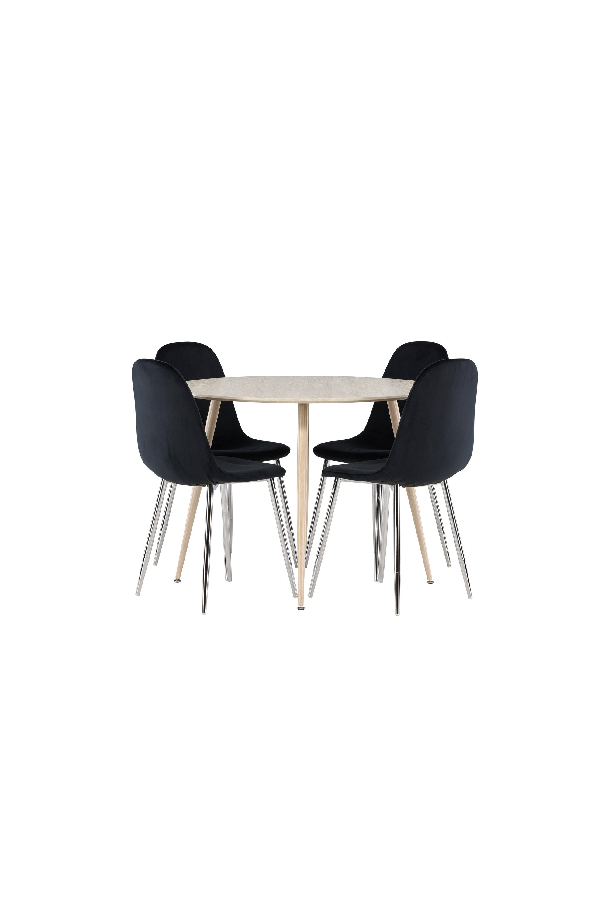 Objevte perfektní jídelní set pro váš domov s jídelním stolem Plaza a jídelními židlemi Polar. Jídelní stůl Plaza s velkorysým průměrem 100 cm je vyroben z odolného MDF materiálu a má bíle pigmentovanou barvu, která dodává místnosti hřejivý a příjemný pocit. Jeho moderní design a čisté linie vytvářejí klidnou a harmonickou atmosféru, díky níž je každé jídlo relaxačním zážitkem. Díky kompaktnímu formátu je Plaza ideální pro menší prostory a zároveň nabízí dostatek prostoru pro pohodlné jídlo s rodinou a přáteli. Doplňte svůj jídelní stůl elegantními jídelními židlemi Polar, které svým celočalouněným designem nabízejí luxusní pocit, nohy z chromovaného kovu, mírně zaoblené opěradlo a sedák z elegantní černé sametové látky s měkkým polstrováním pro extra pohodlí. Zde nemusíte dělat kompromisy mezi pohodlím a designem. Tyto židle dokonale ladí s jídelním stolem Plaza a vytvářejí kompletní a příjemnou jídelní soupravu pro srdce vašeho domova. Dodejte svému domovu moderní a stylový nádech s jídelním stolem Plaza a jídelními židlemi Polar – dokonalá kombinace pro ty, kteří oceňují styl i funkci ve svém interiéru. Užijte si lahodná jídla a příjemné chvíle s tímto stylovým jídelním setem.