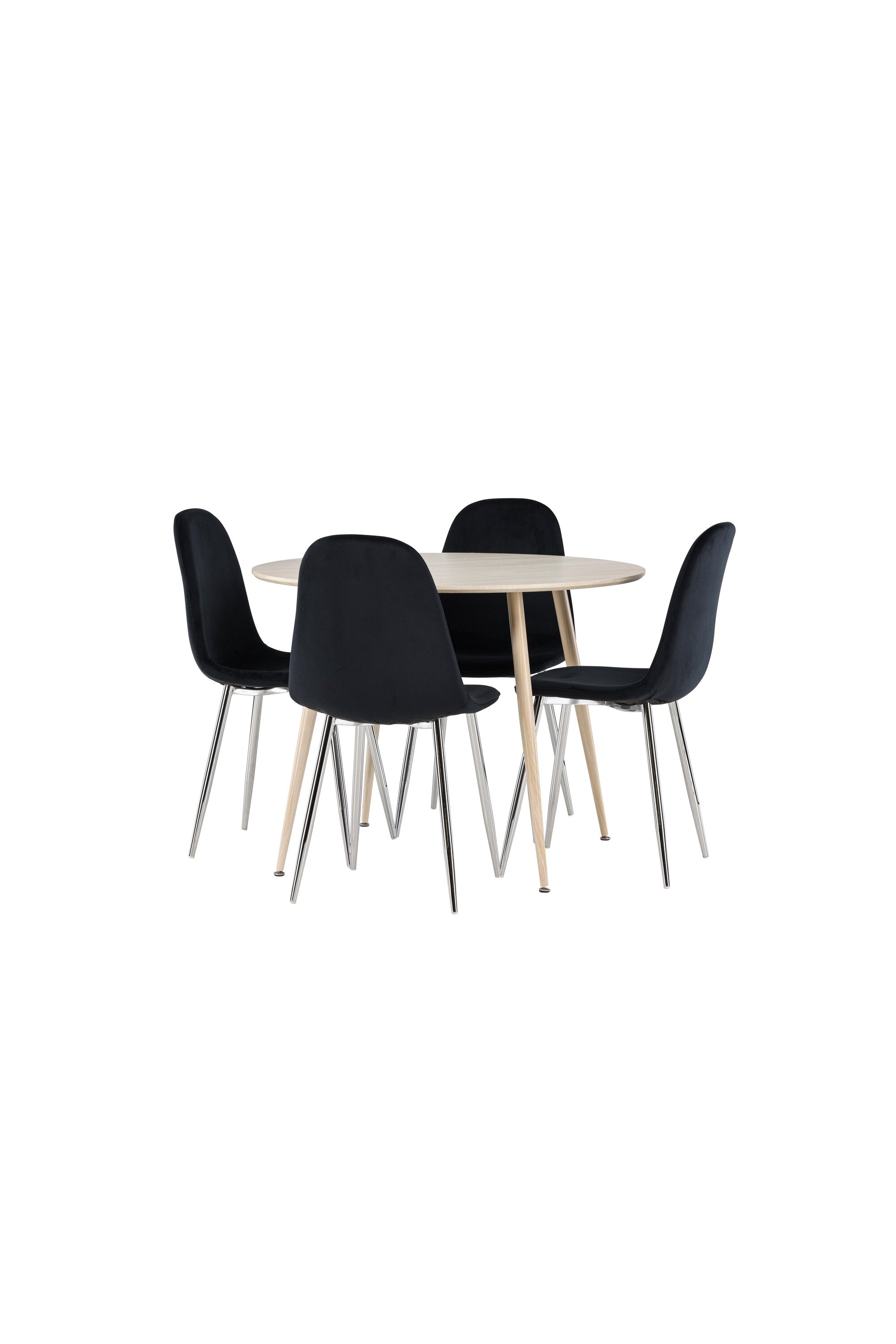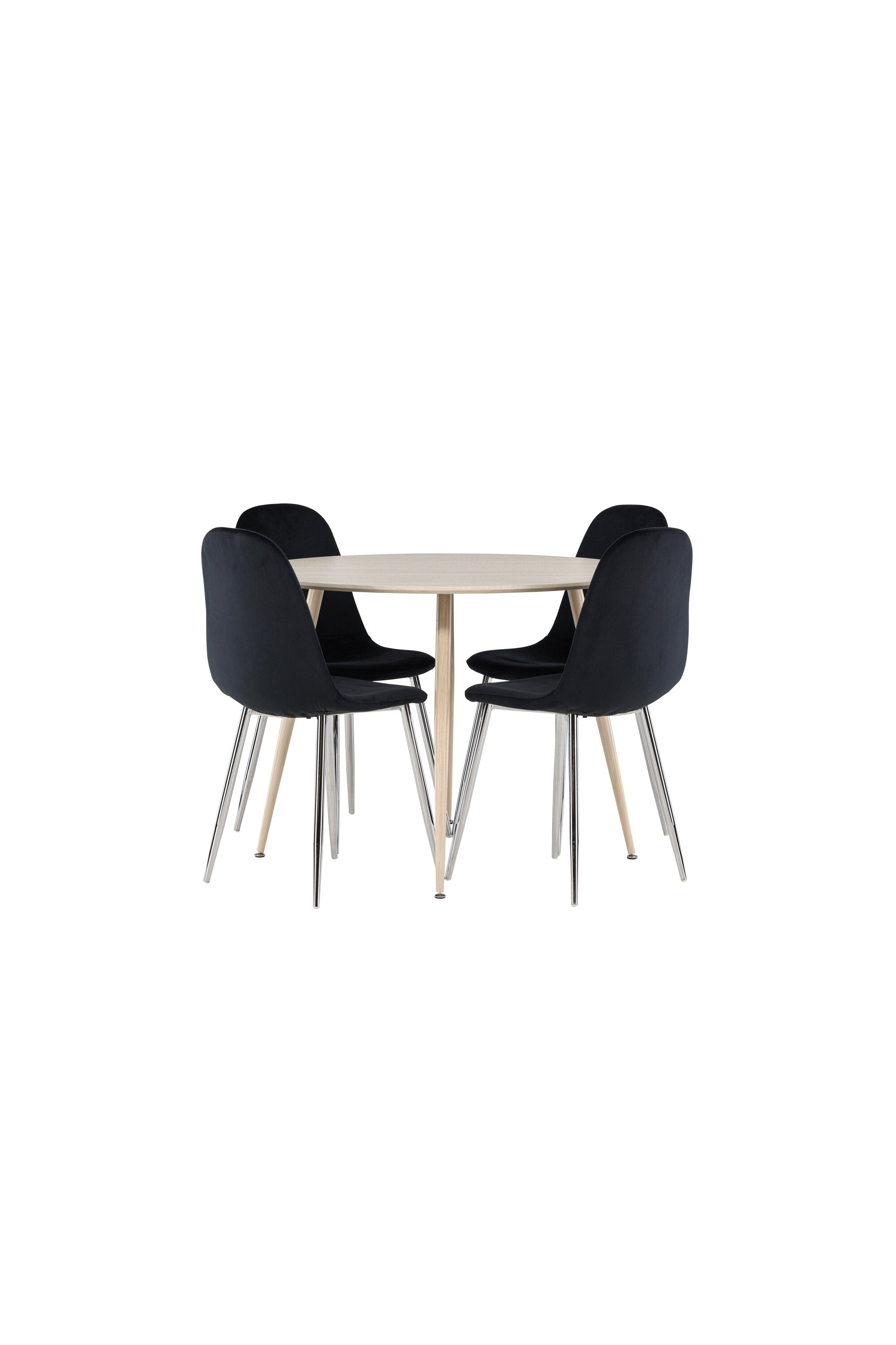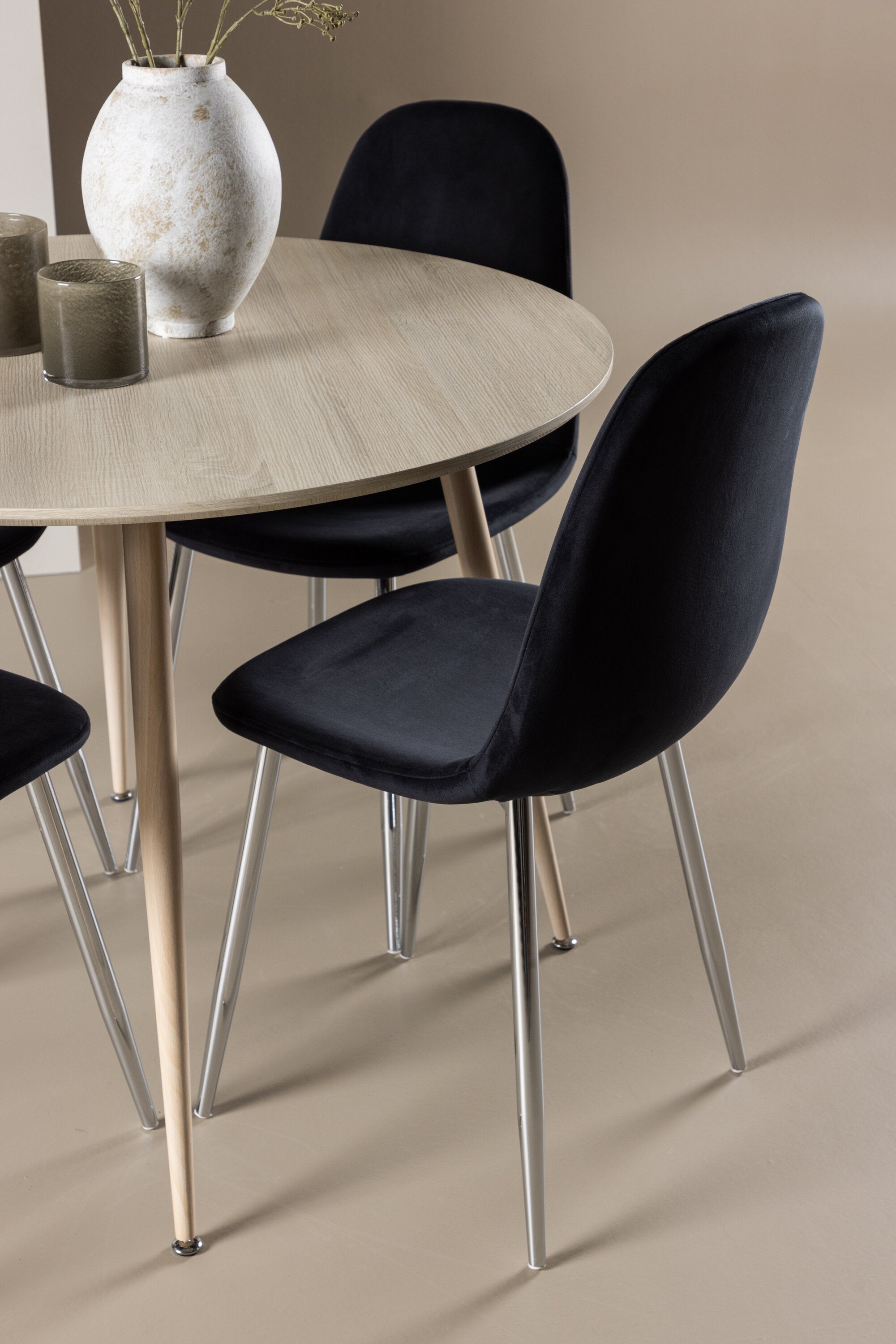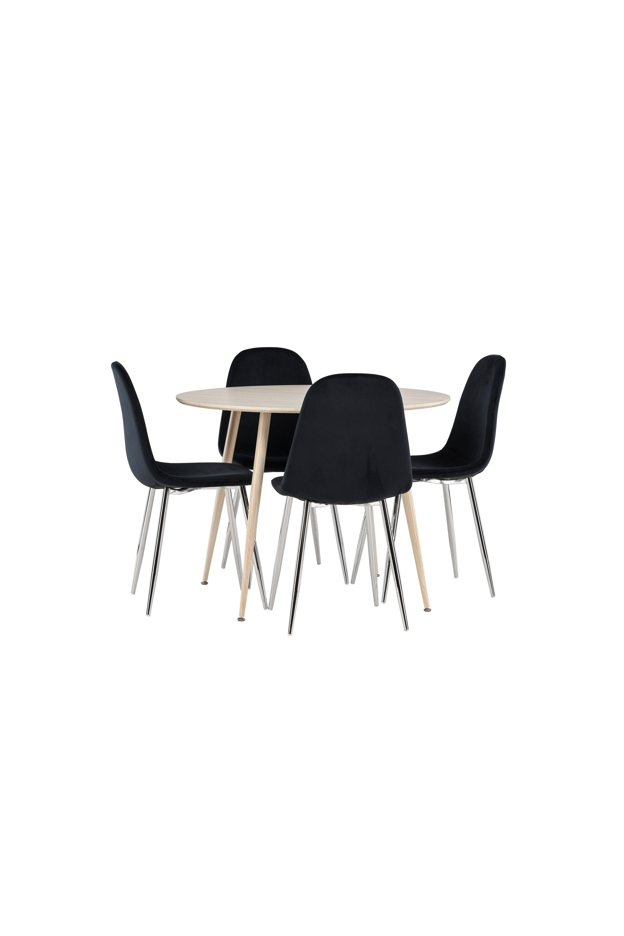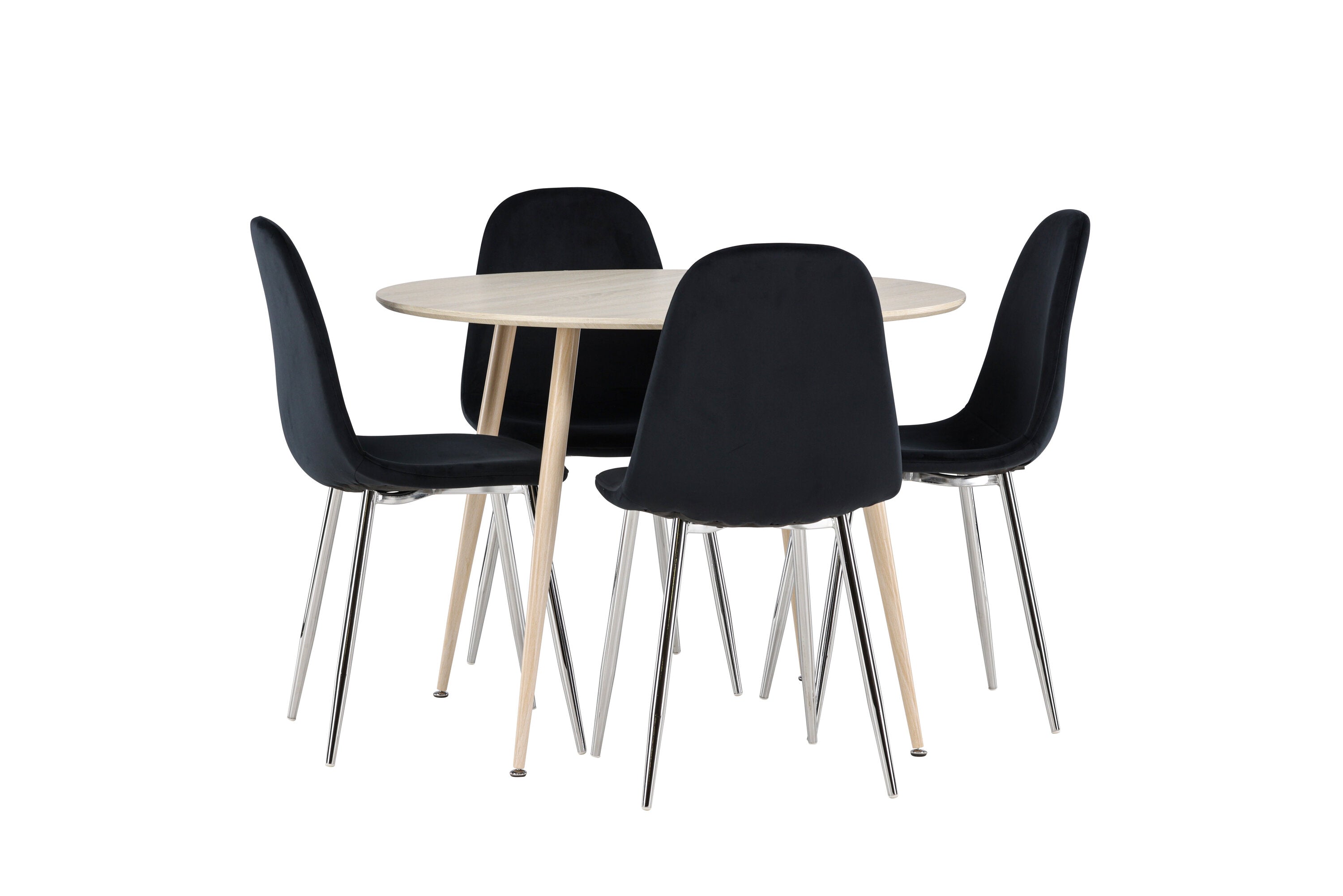 Objevte perfektní jídelní set pro váš domov s jídelním stolem Plaza a jídelními židlemi Polar. Jídelní stůl Plaza s velkorysým průměrem 100 cm je vyroben z odolného MDF materiálu a má bíle pigmentovanou barvu, která dodává místnosti hřejivý a příjemný pocit. Jeho moderní design a čisté linie vytvářejí klidnou a harmonickou atmosféru, díky níž je každé jídlo relaxačním zážitkem. Díky kompaktnímu formátu je Plaza ideální pro menší prostory a zároveň nabízí dostatek prostoru pro pohodlné jídlo s rodinou a přáteli. Doplňte svůj jídelní stůl elegantními jídelními židlemi Polar, které svým celočalouněným designem nabízejí luxusní pocit, nohy z chromovaného kovu, mírně zaoblené opěradlo a sedák z elegantní černé sametové látky s měkkým polstrováním pro extra pohodlí. Zde nemusíte dělat kompromisy mezi pohodlím a designem. Tyto židle dokonale ladí s jídelním stolem Plaza a vytvářejí kompletní a příjemnou jídelní soupravu pro srdce vašeho domova. Dodejte svému domovu moderní a stylový nádech s jídelním stolem Plaza a jídelními židlemi Polar – dokonalá kombinace pro ty, kteří oceňují styl i funkci ve svém interiéru. Užijte si lahodná jídla a příjemné chvíle s tímto stylovým jídelním setem.