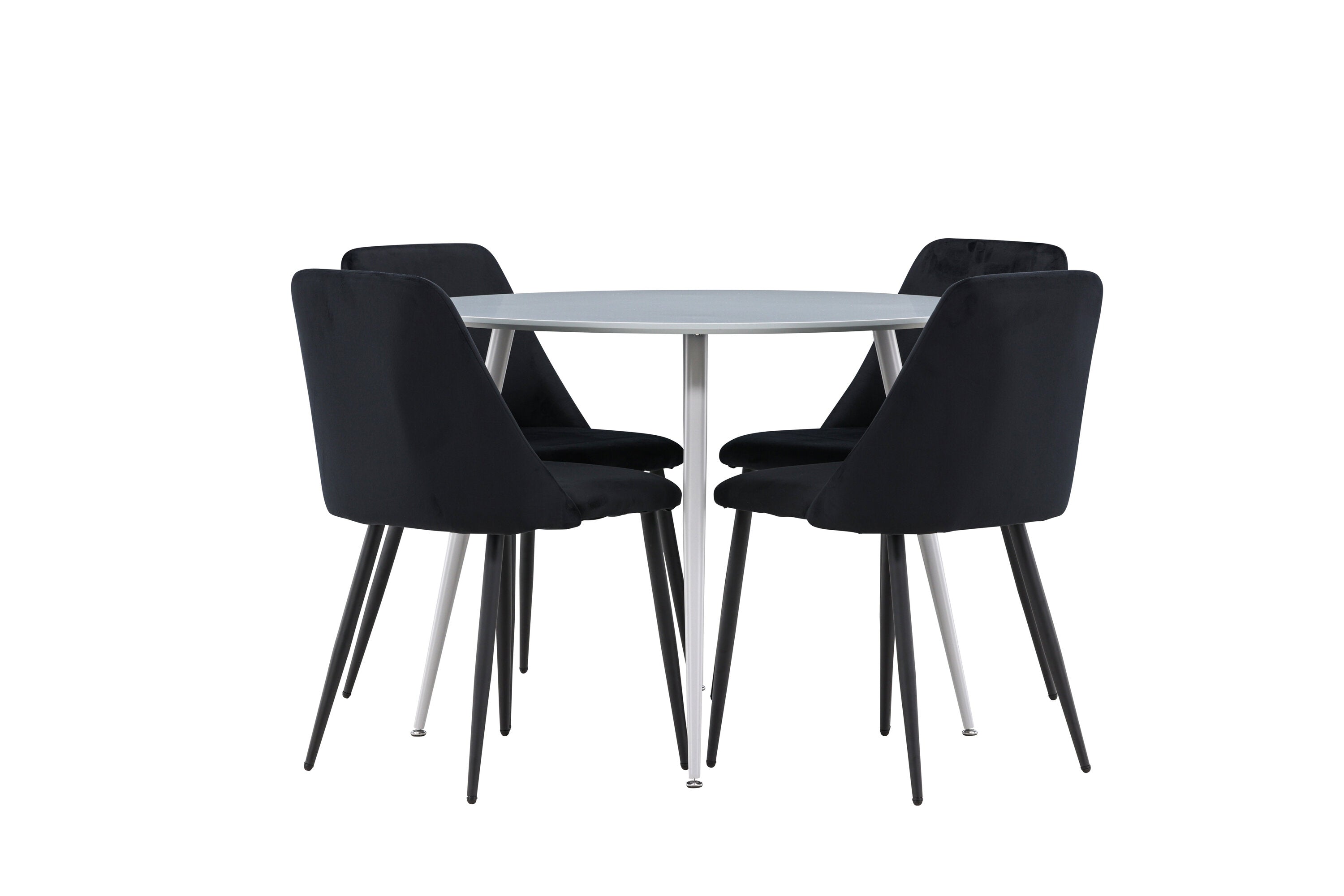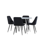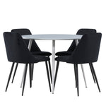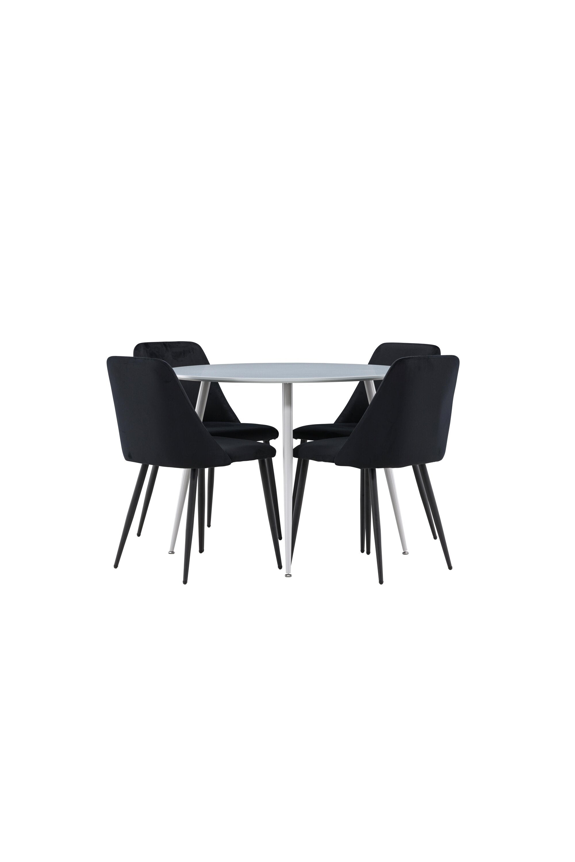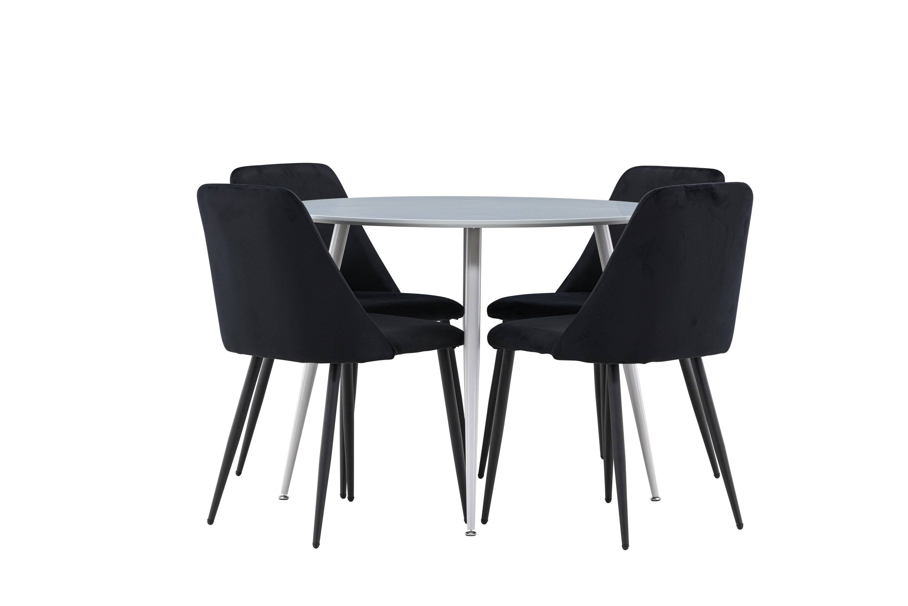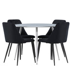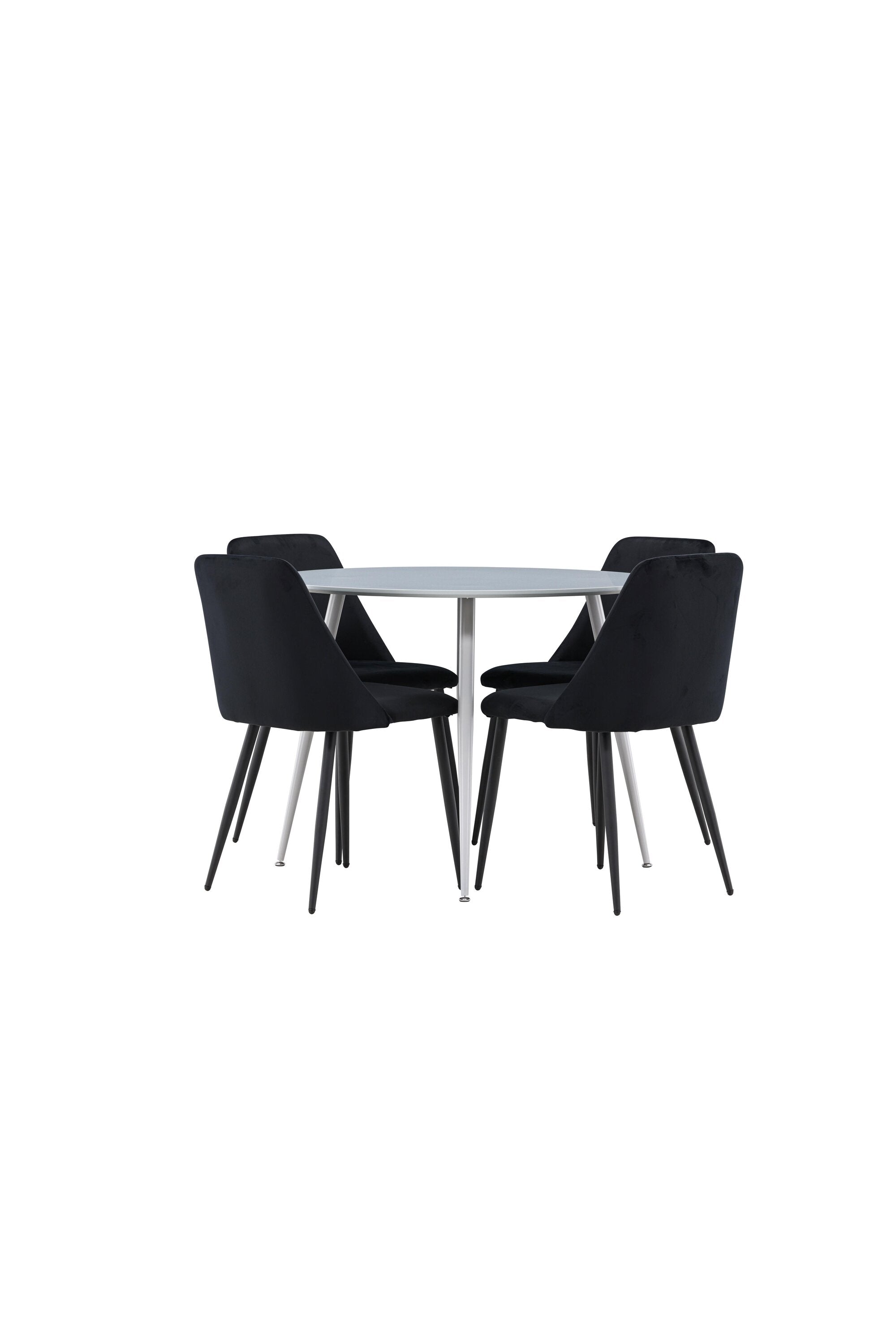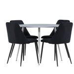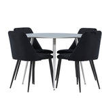 Dodejte své jídelně nádech moderní elegance s jídelním setem, který se skládá ze stolu Plaza a nočních židlí. Tento jídelní set nabízí dokonalou rovnováhu mezi stylem a pohodlím a je ideálním doplňkem vašeho domova. Stůl Plaza je se svou šedou barvou a MDF konstrukcí sofistikovaným středobodem. Stůl s průměrem 100 cm poskytuje dostatek prostoru pro stolování i společenská setkání, přičemž se svými kompaktními rozměry skvěle hodí do malých i velkých místností. Šedý odstín dodá vaší jídelně moderní a elegantní nádech a odolný povrch se snadno čistí a udržuje a zajišťuje dlouhotrvající krásu a funkčnost. Čtyři doprovodná noční křesla skvěle doplňují stůl svým elegantním designem a vysokým komfortem. Židle jsou čalouněny černým sametem, který poskytuje měkké a příjemné sezení. Sametová látka je známá svou elegancí a pohodlím, umožňuje vám i vašim hostům pohodlně sedět při dlouhých jídlech a příjemných rozhovorech. Černé židle vytvářejí stylový kontrast k šedému stolu a dodávají vaší jídelně moderní a sofistikovanou atmosféru. Jídelní set Plaza s nočními židlemi je perfektní volbou pro ty, kteří chtějí vytvořit elegantní a funkční jídelní prostředí. Kombinace moderního designu a vysokého komfortu dělá z každého jídla příjemný zážitek. Vítejte na nové úrovni stylu a pohodlí u vás doma s Plaza and Night!