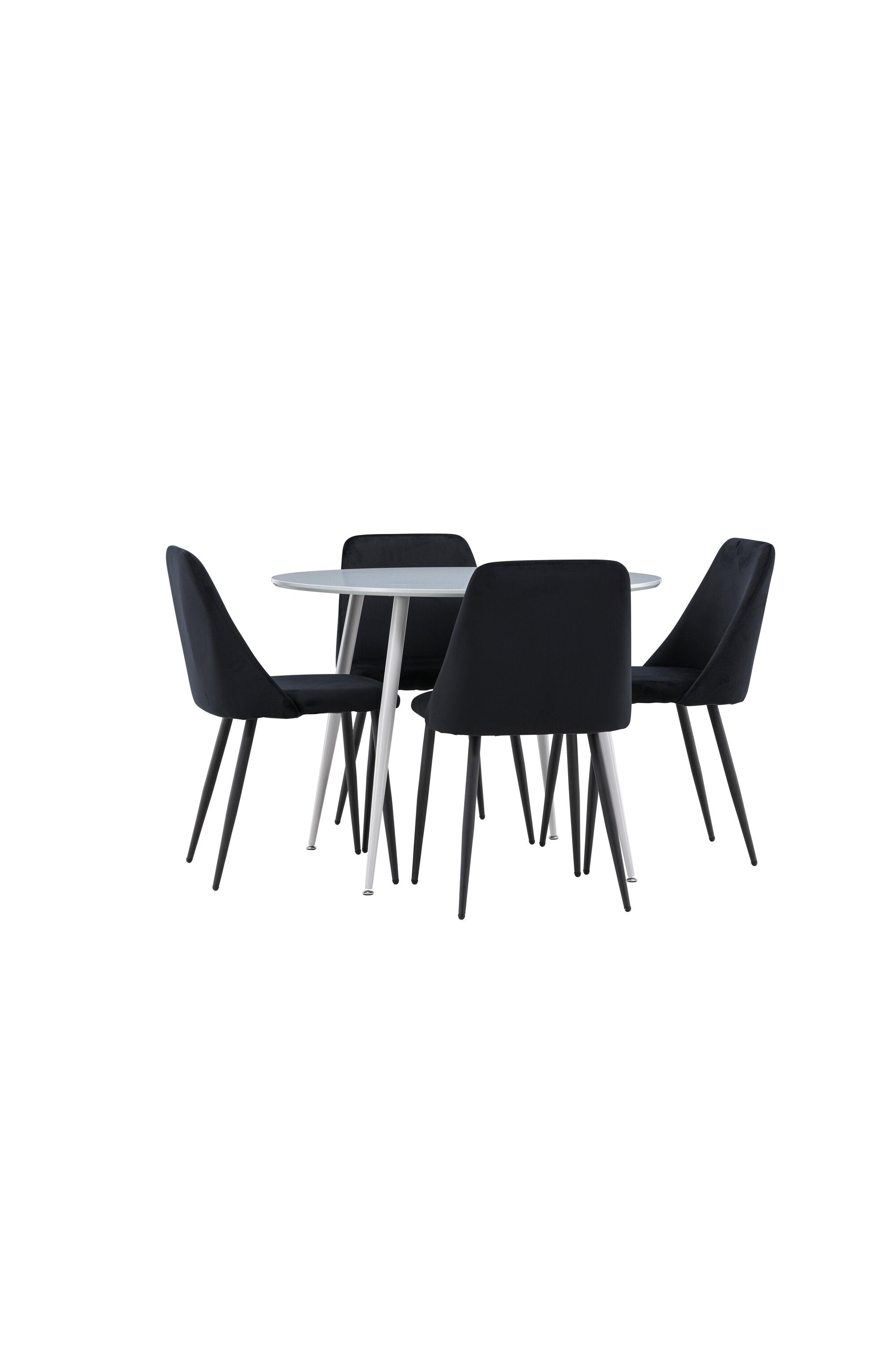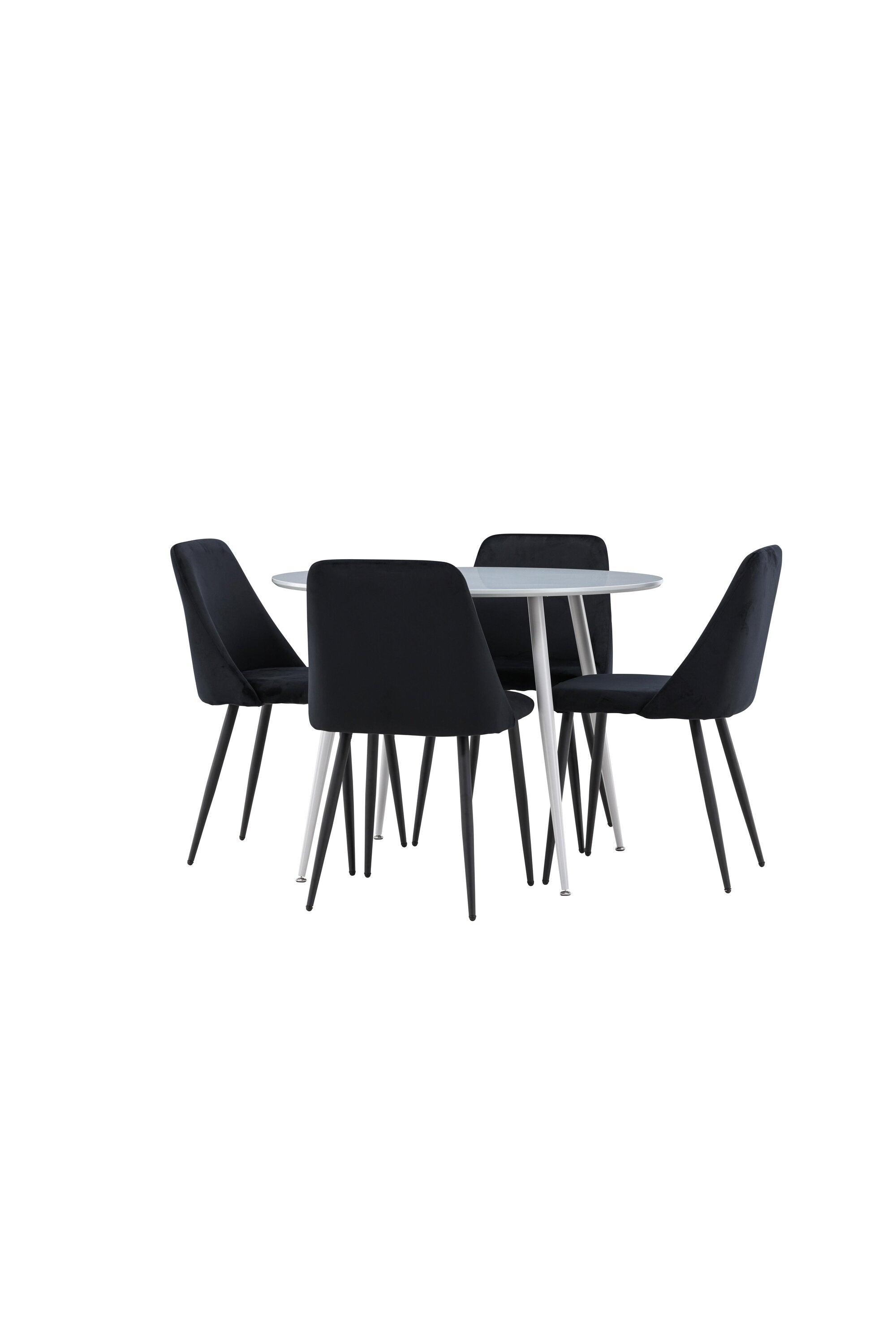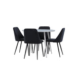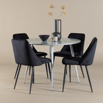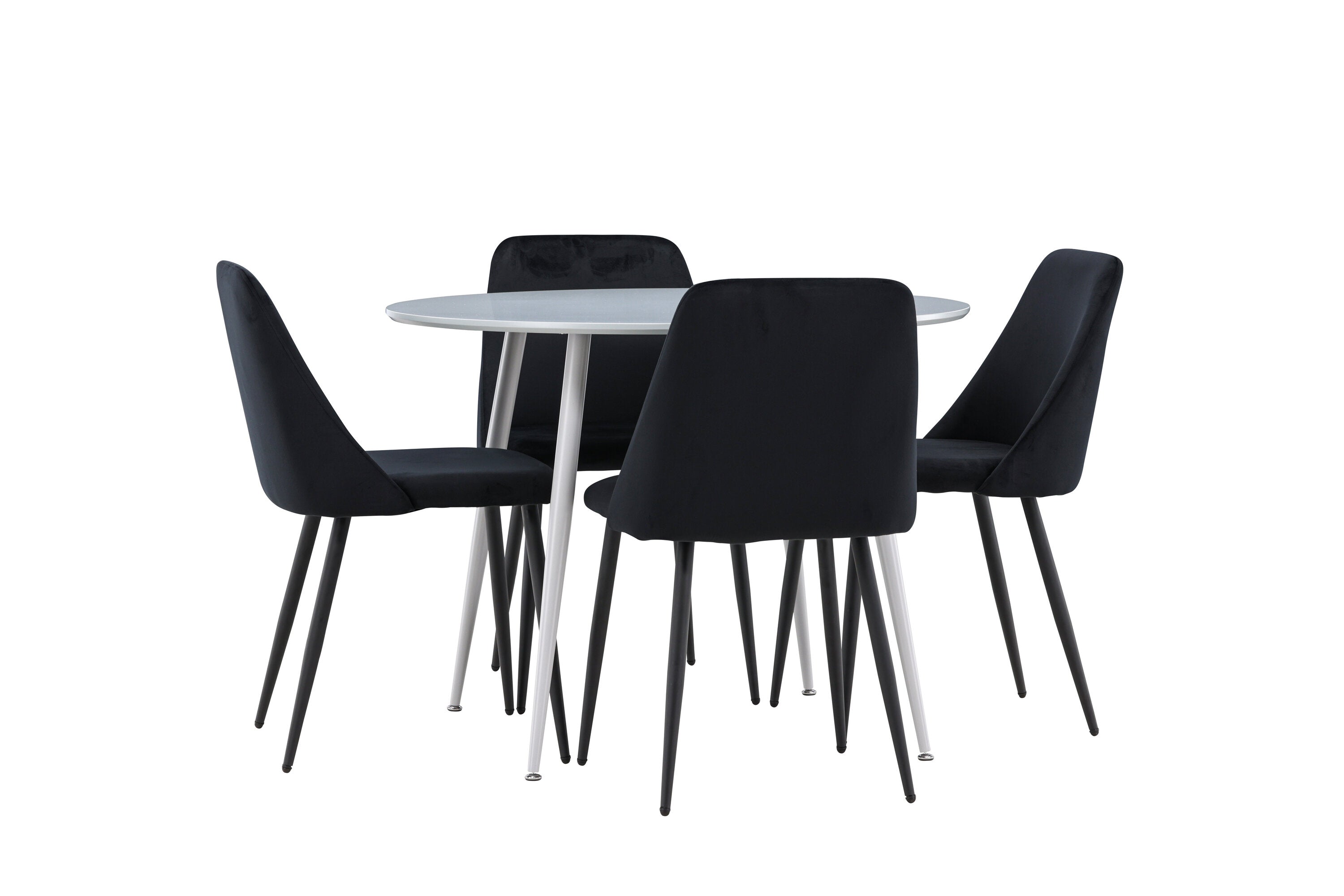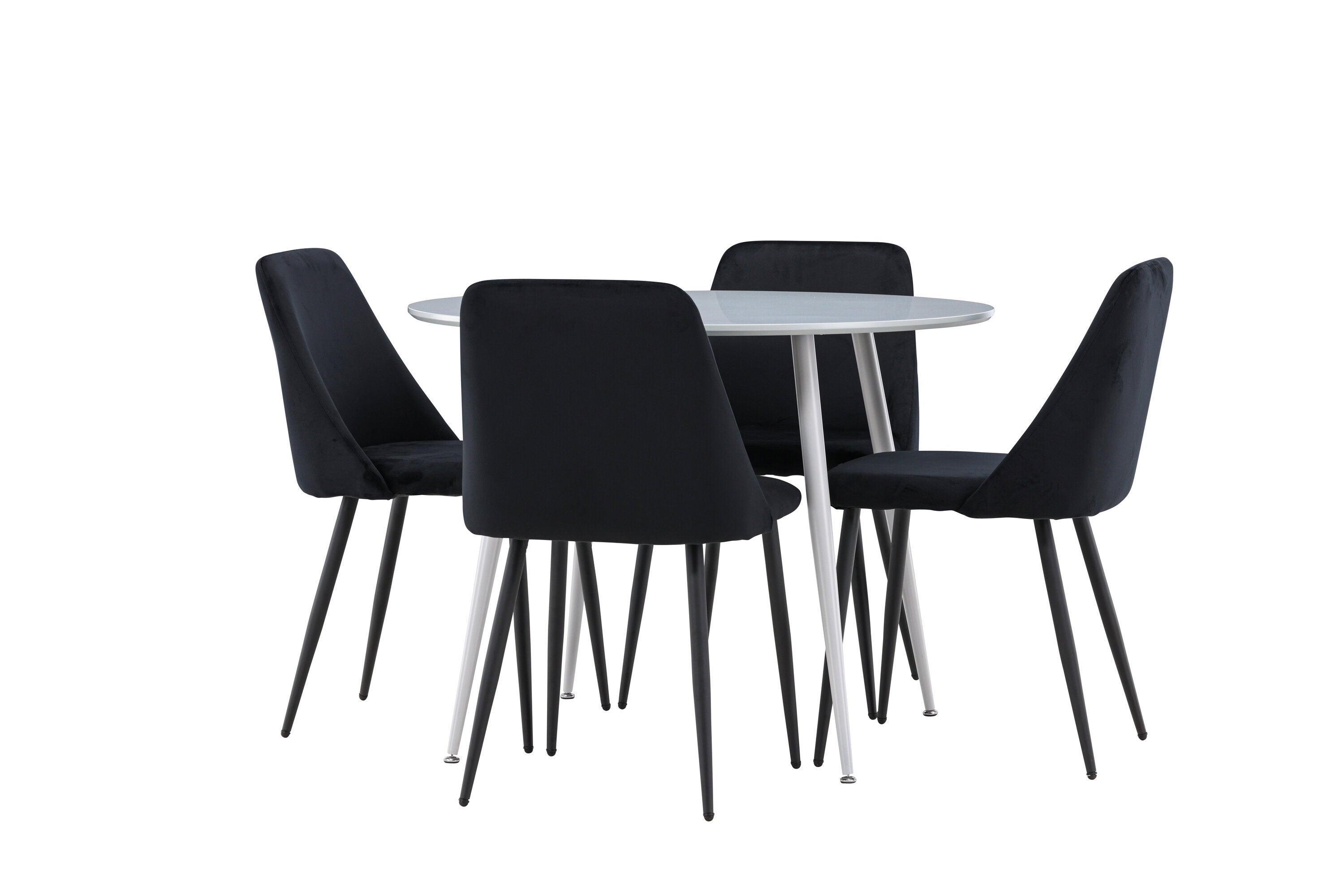 Dodejte své jídelně nádech moderní elegance s jídelním setem, který se skládá ze stolu Plaza a nočních židlí. Tento jídelní set nabízí dokonalou rovnováhu mezi stylem a pohodlím a je ideálním doplňkem vašeho domova. Stůl Plaza je se svou šedou barvou a MDF konstrukcí sofistikovaným středobodem. Stůl s průměrem 100 cm poskytuje dostatek prostoru pro stolování i společenská setkání, přičemž se svými kompaktními rozměry skvěle hodí do malých i velkých místností. Šedý odstín dodá vaší jídelně moderní a elegantní nádech a odolný povrch se snadno čistí a udržuje a zajišťuje dlouhotrvající krásu a funkčnost. Čtyři doprovodná noční křesla skvěle doplňují stůl svým elegantním designem a vysokým komfortem. Židle jsou čalouněny černým sametem, který poskytuje měkké a příjemné sezení. Sametová látka je známá svou elegancí a pohodlím, umožňuje vám i vašim hostům pohodlně sedět při dlouhých jídlech a příjemných rozhovorech. Černé židle vytvářejí stylový kontrast k šedému stolu a dodávají vaší jídelně moderní a sofistikovanou atmosféru. Jídelní set Plaza s nočními židlemi je perfektní volbou pro ty, kteří chtějí vytvořit elegantní a funkční jídelní prostředí. Kombinace moderního designu a vysokého komfortu dělá z každého jídla příjemný zážitek. Vítejte na nové úrovni stylu a pohodlí u vás doma s Plaza and Night!