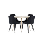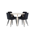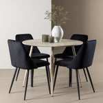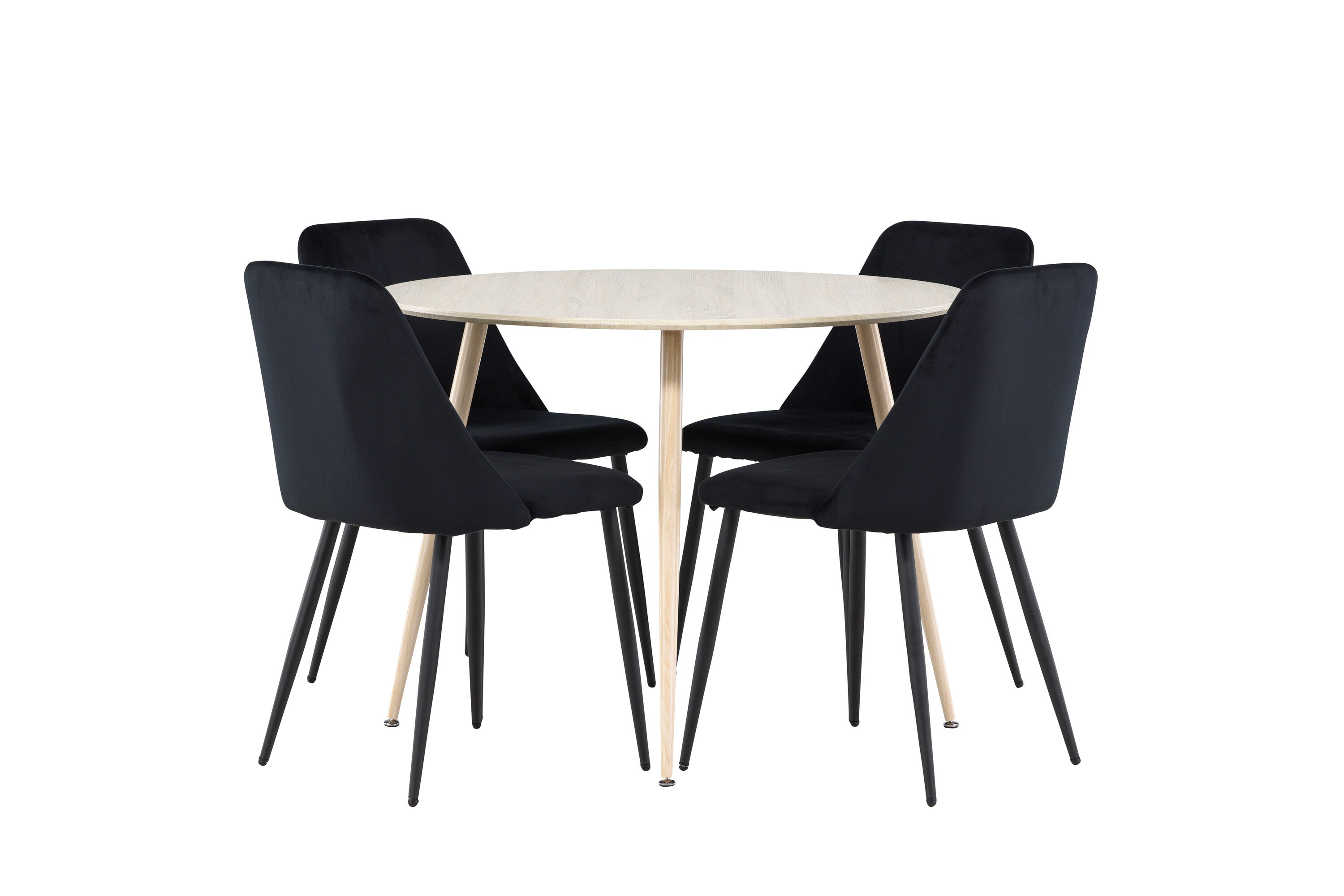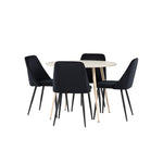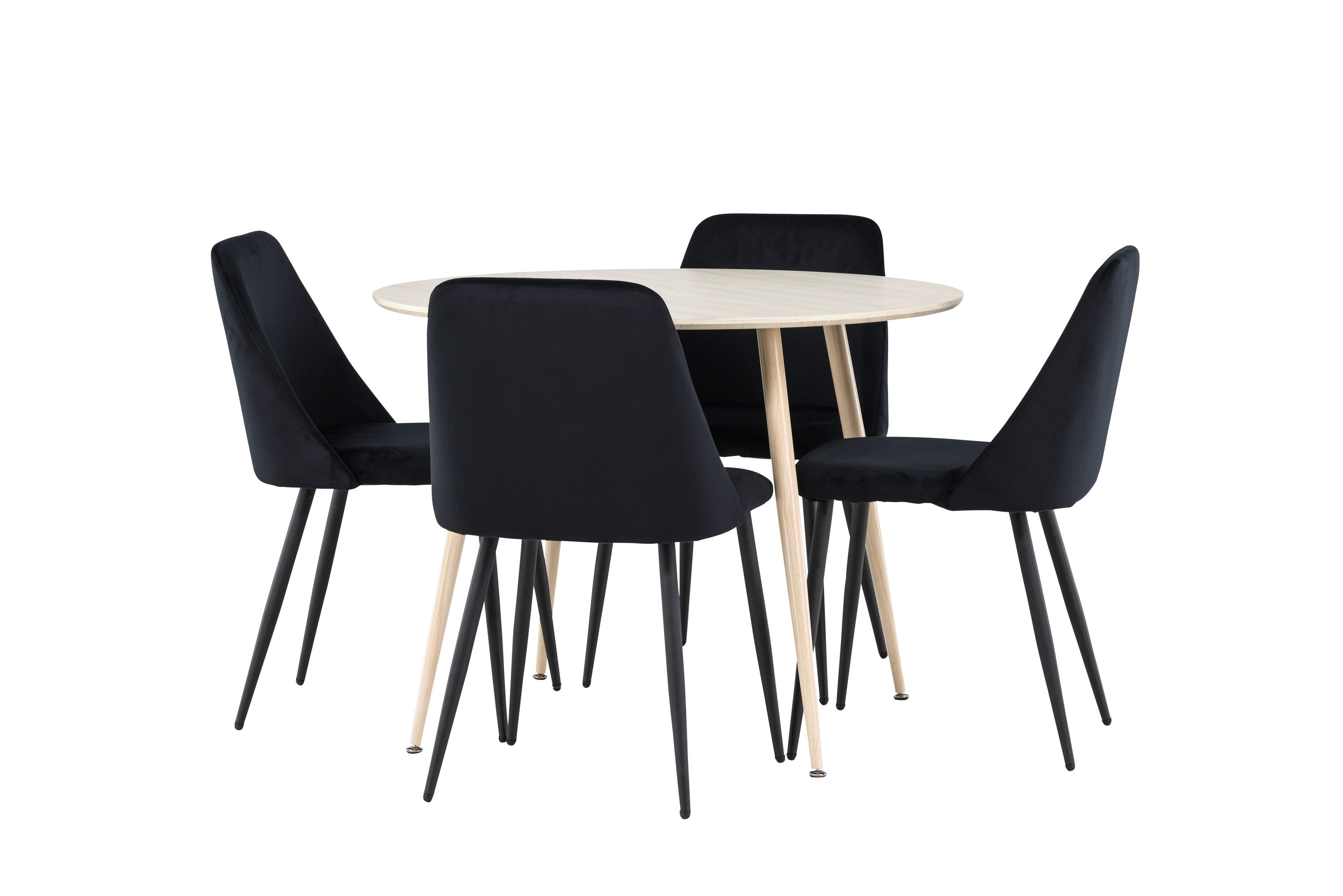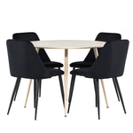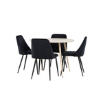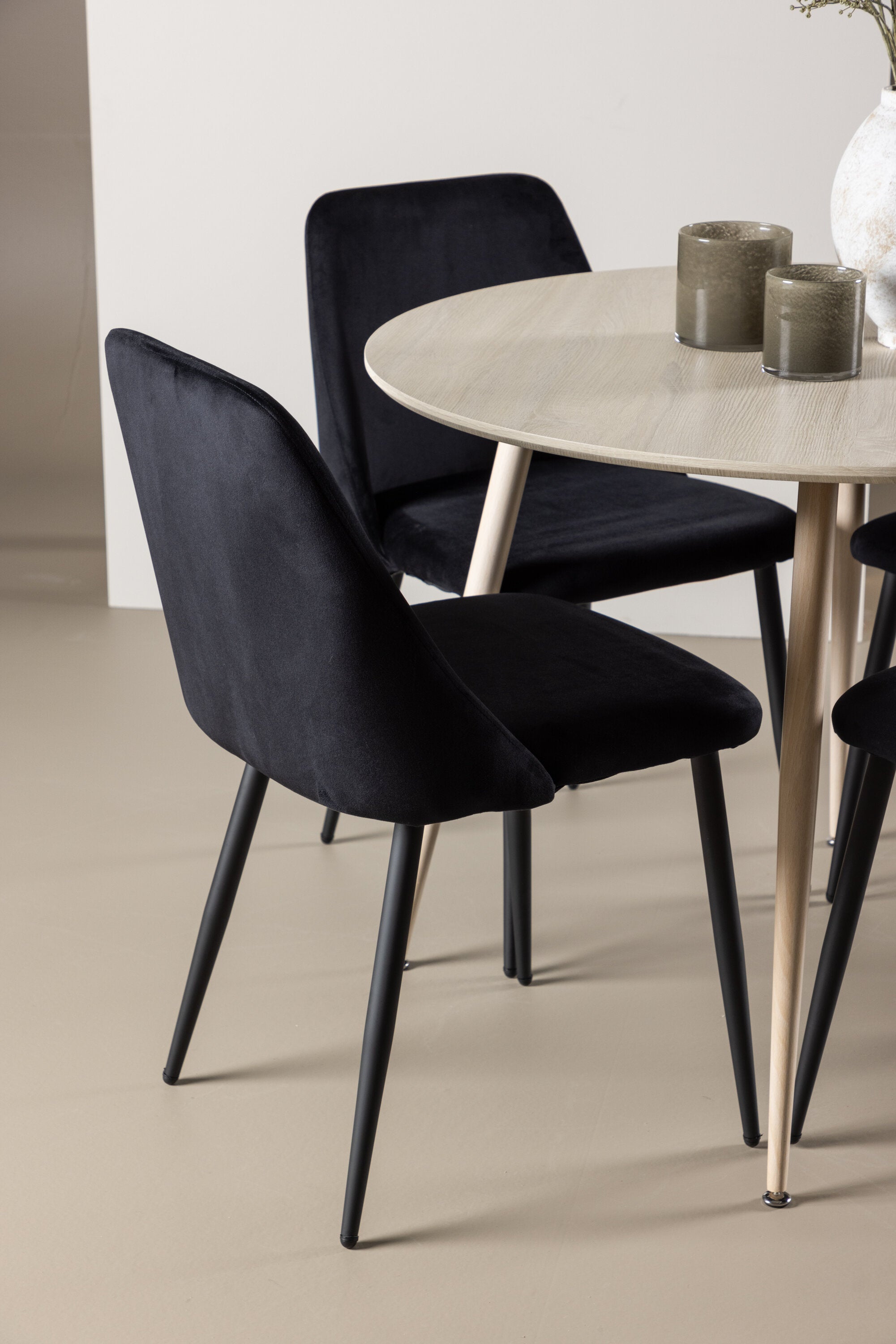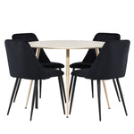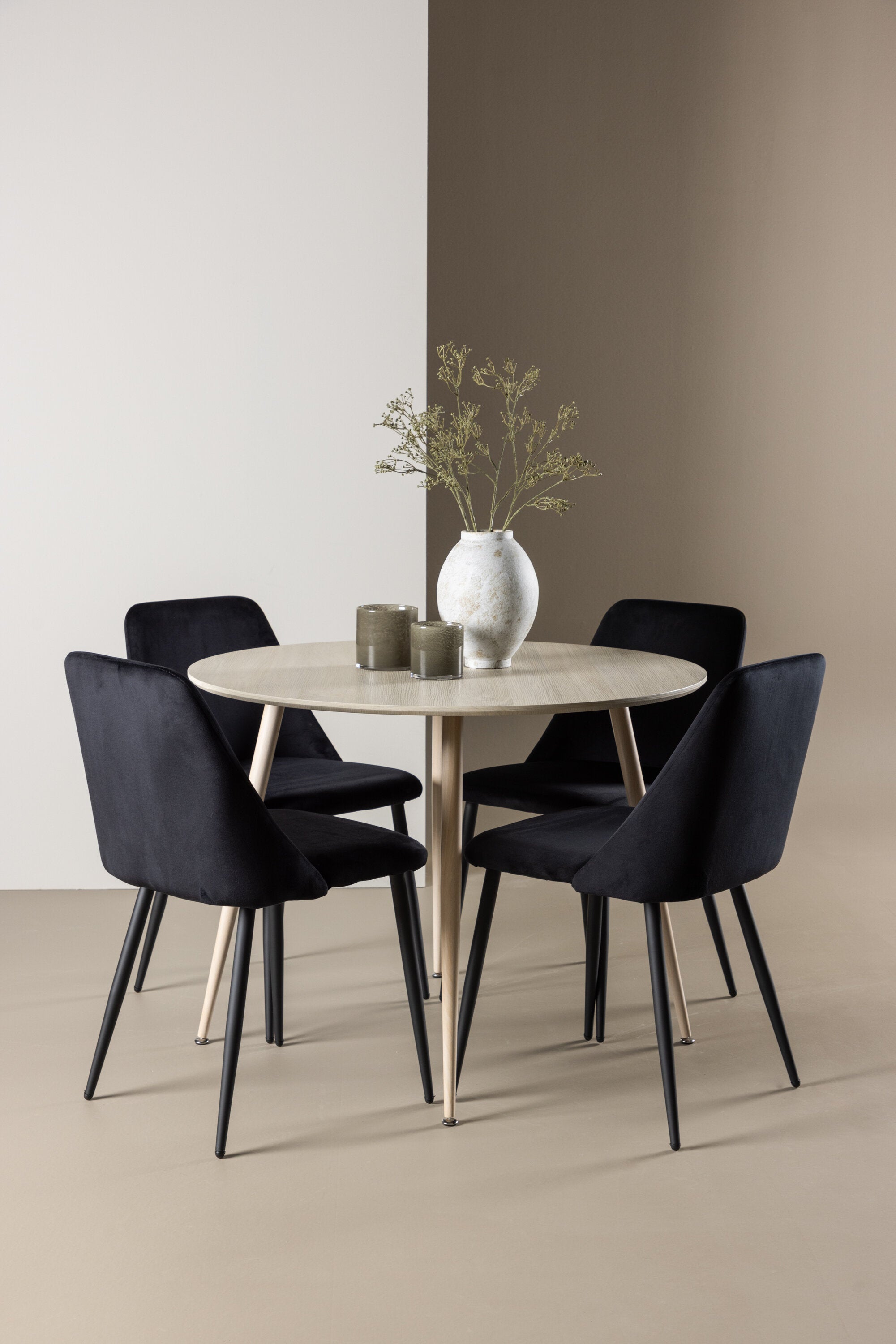 Objevte perfektní jídelní set pro váš domov s jídelním stolem Plaza a jídelními židlemi NIGHT. Jídelní stůl Plaza s velkorysým průměrem 100 cm je vyroben z odolného MDF materiálu a má bíle pigmentovanou barvu, která dodává místnosti hřejivý a příjemný pocit. Jeho moderní design a čisté linie vytvářejí klidnou a harmonickou atmosféru, díky níž je každé jídlo relaxačním zážitkem. Díky kompaktnímu formátu je Plaza ideální pro menší prostory a zároveň nabízí dostatek prostoru pro pohodlné jídlo s rodinou a přáteli. Doplňte svůj jídelní stůl jídelními židlemi NIGHT, které nabízejí pohodlí i styl. Křeslo má plně čalouněný sedák z černé sametové látky a nohy židle v odpovídající černé barvě, které dodávají místnosti luxusní třpyt. Jídelní židle NIGHT přispívají k příjemné a módní atmosféře, díky níž je posezení u lahodného jídla mimořádně příjemné. Sofistikovaný design a pohodlný materiál dělají z NIGHT perfektní volbu jak pro každodenní večeři, tak pro slavnostní příležitosti. Dodejte svému domovu nádech moderní elegance s jídelním stolem Plaza a jídelními židlemi NIGHT – ideální kombinace pro každého, kdo si cení stylu i funkce ve svém dekoru.