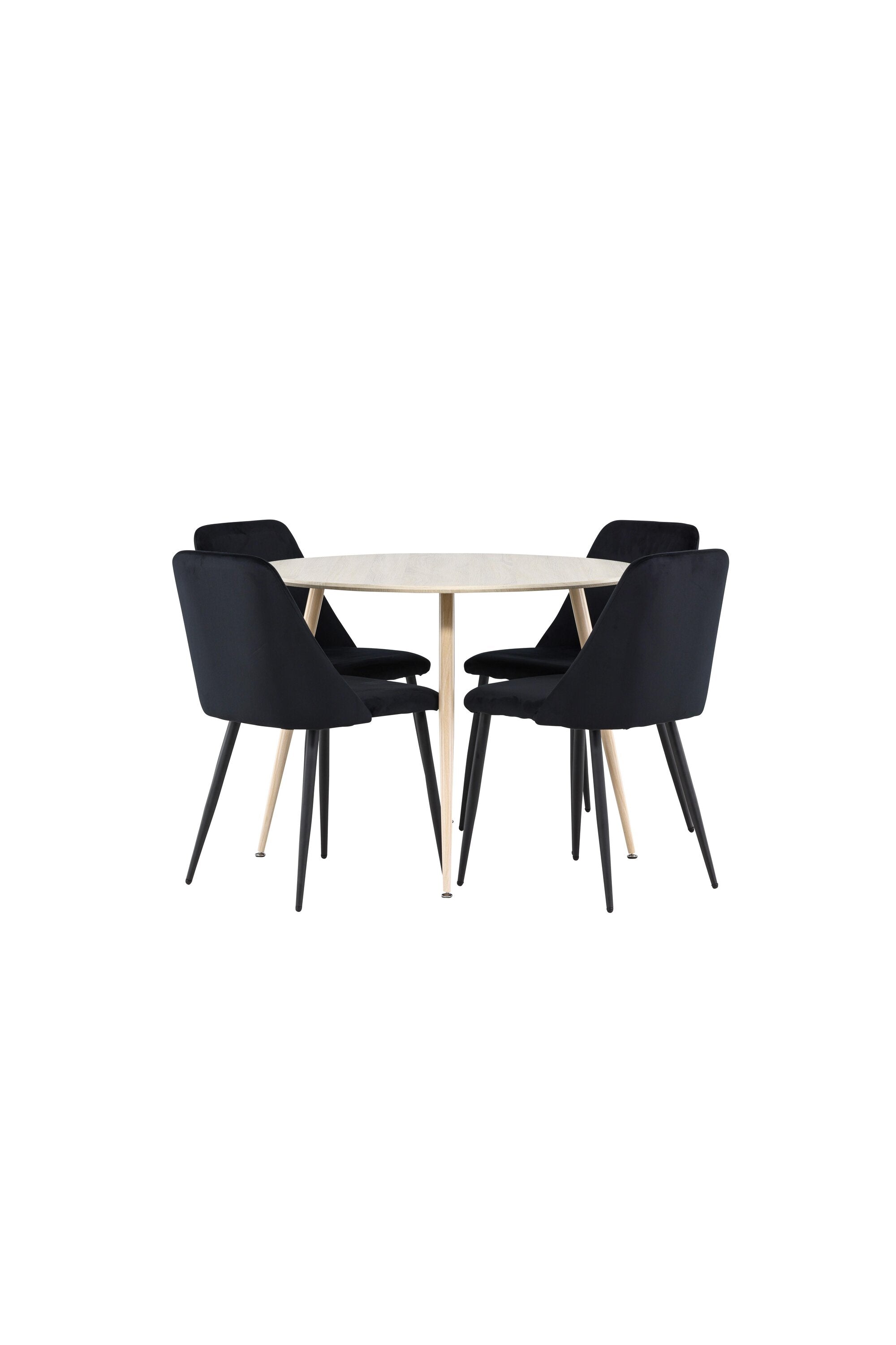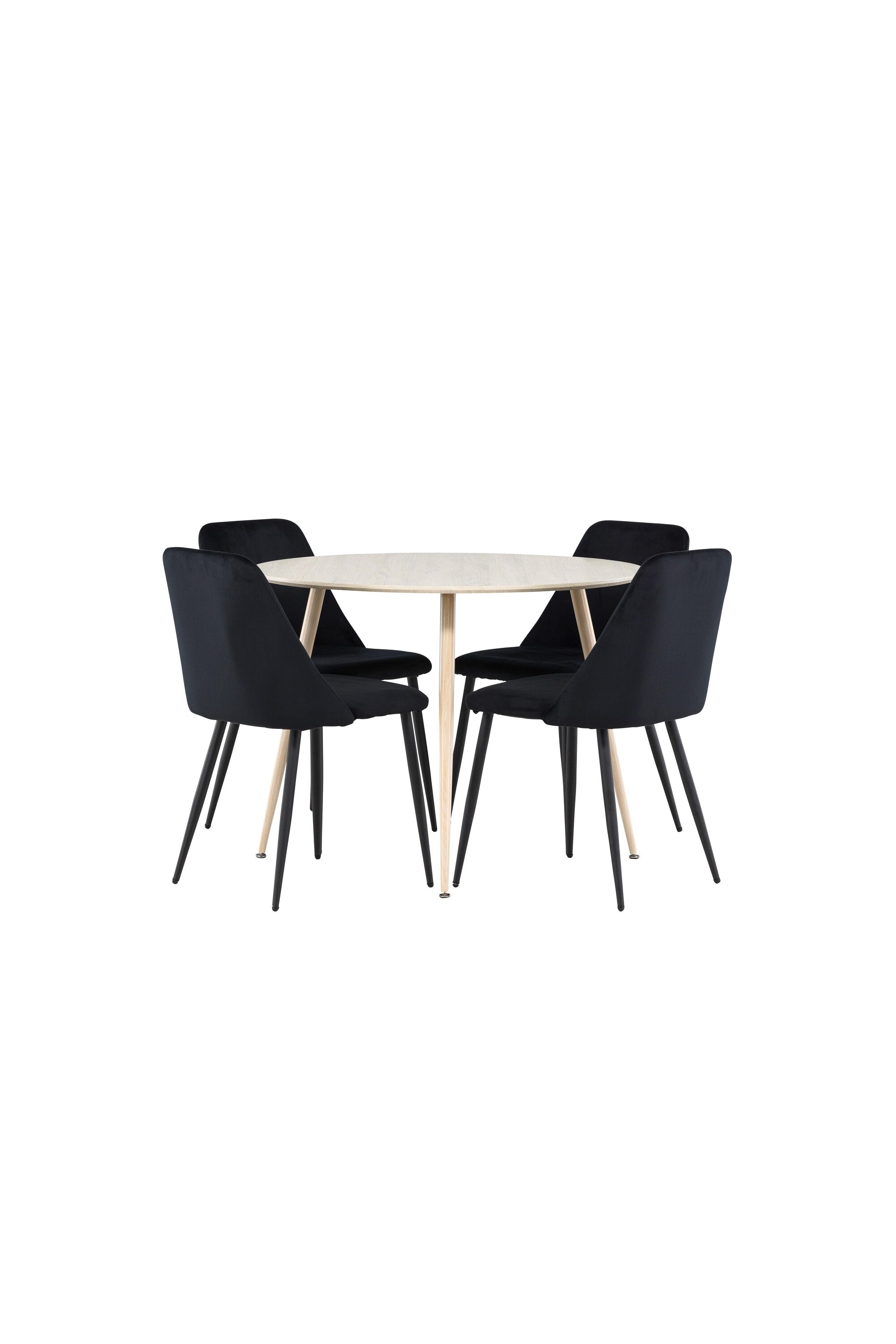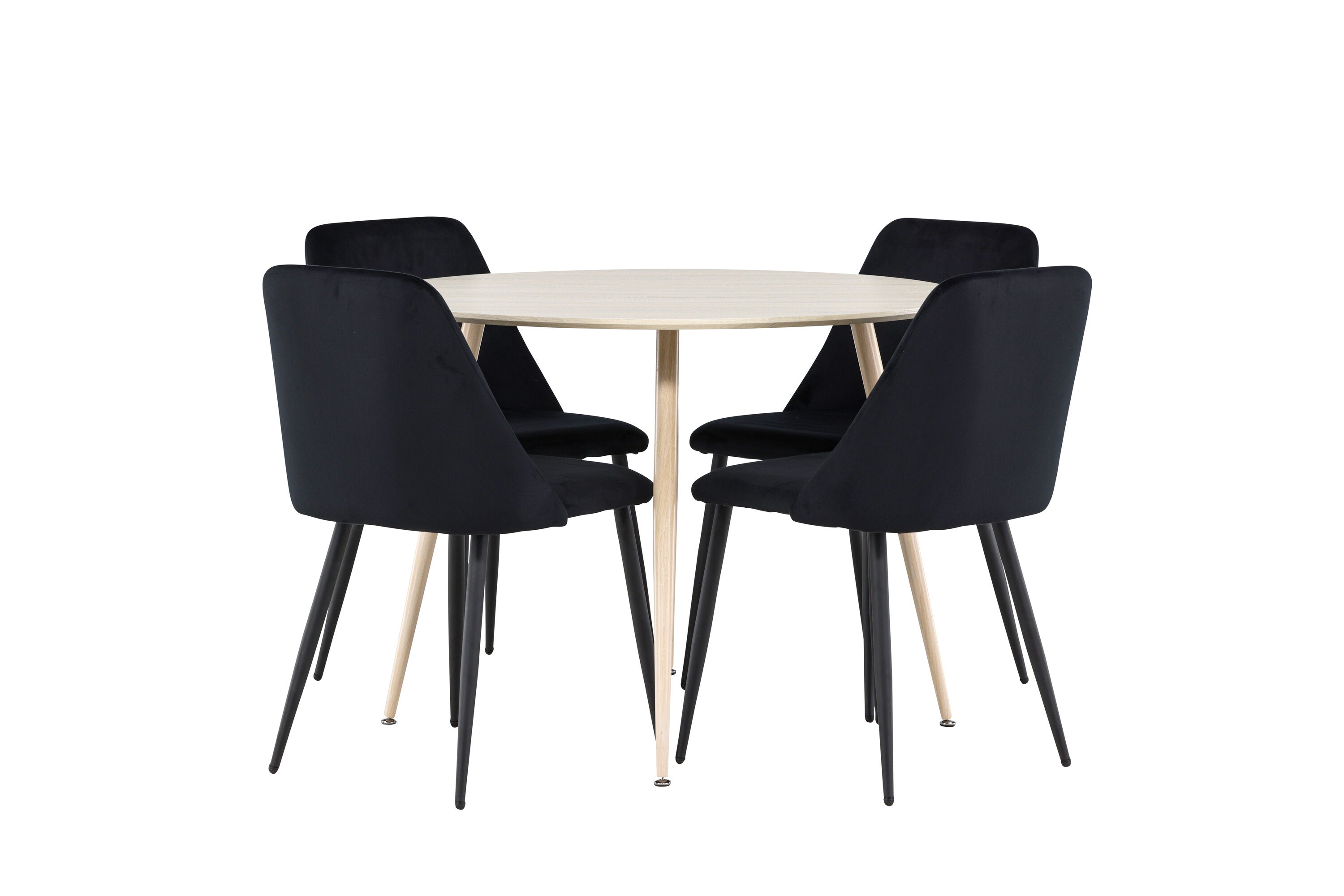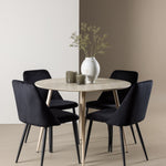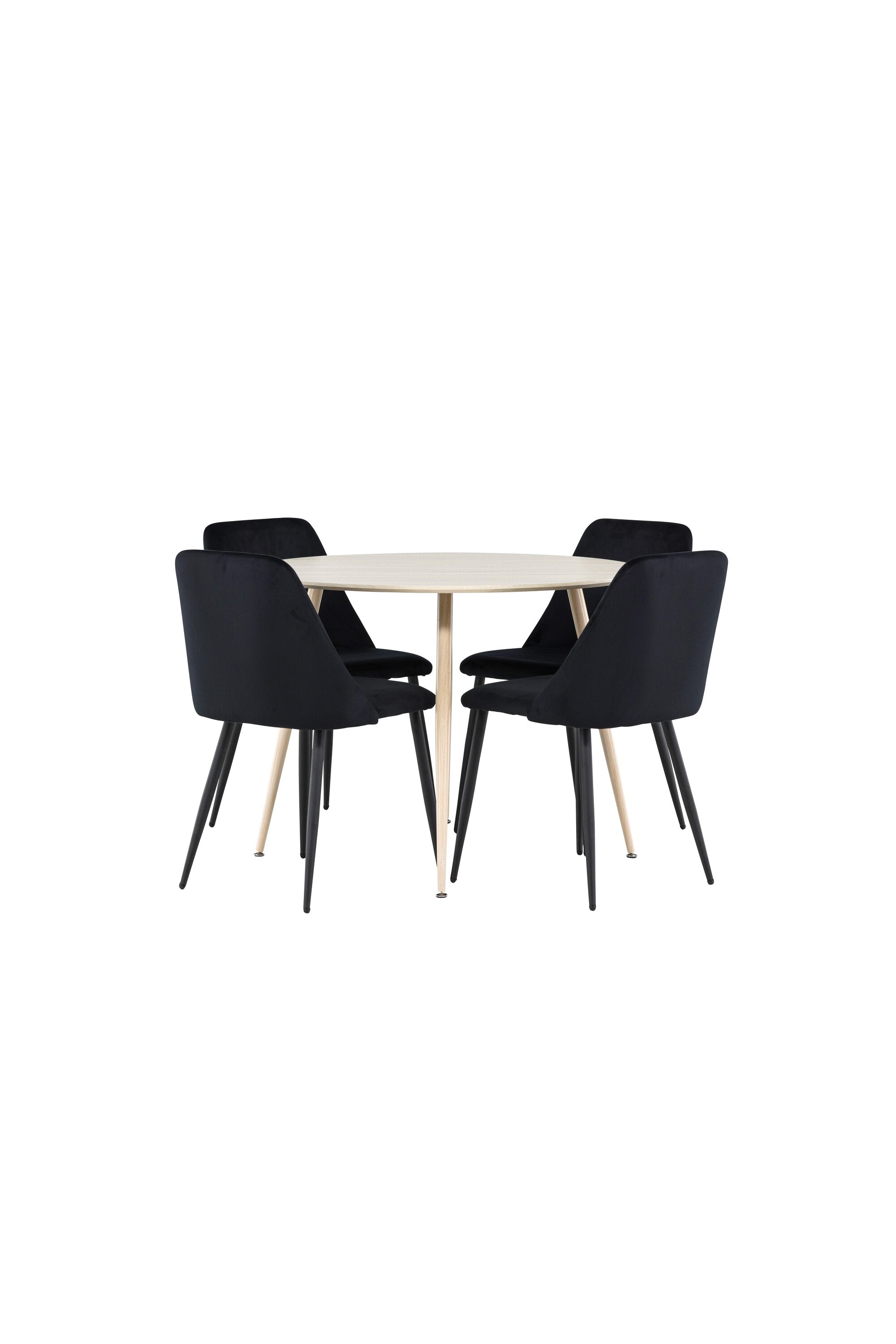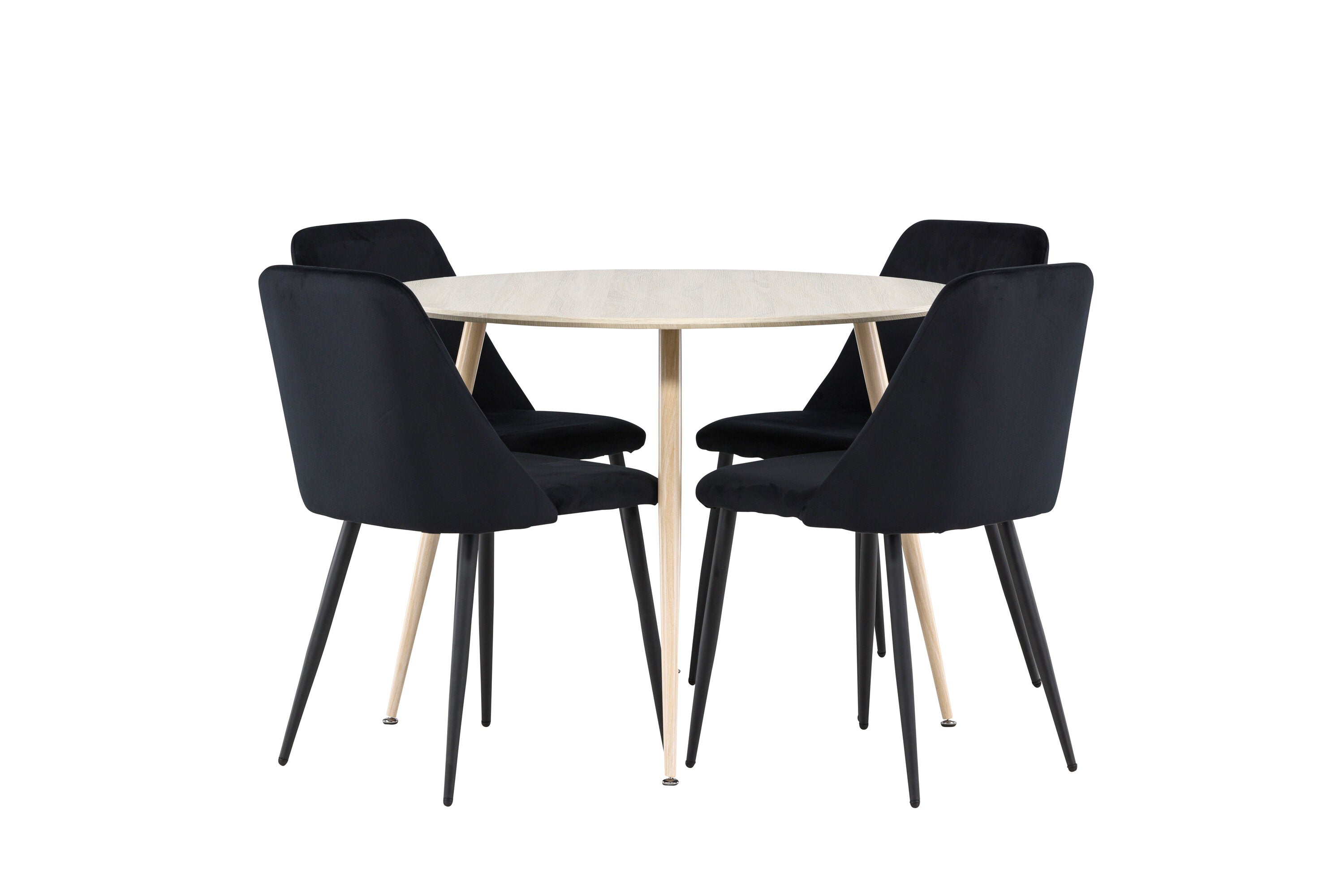 Objevte perfektní jídelní set pro váš domov s jídelním stolem Plaza a jídelními židlemi NIGHT. Jídelní stůl Plaza s velkorysým průměrem 100 cm je vyroben z odolného MDF materiálu a má bíle pigmentovanou barvu, která dodává místnosti hřejivý a příjemný pocit. Jeho moderní design a čisté linie vytvářejí klidnou a harmonickou atmosféru, díky níž je každé jídlo relaxačním zážitkem. Díky kompaktnímu formátu je Plaza ideální pro menší prostory a zároveň nabízí dostatek prostoru pro pohodlné jídlo s rodinou a přáteli. Doplňte svůj jídelní stůl jídelními židlemi NIGHT, které nabízejí pohodlí i styl. Křeslo má plně čalouněný sedák z černé sametové látky a nohy židle v odpovídající černé barvě, které dodávají místnosti luxusní třpyt. Jídelní židle NIGHT přispívají k příjemné a módní atmosféře, díky níž je posezení u lahodného jídla mimořádně příjemné. Sofistikovaný design a pohodlný materiál dělají z NIGHT perfektní volbu jak pro každodenní večeři, tak pro slavnostní příležitosti. Dodejte svému domovu nádech moderní elegance s jídelním stolem Plaza a jídelními židlemi NIGHT – ideální kombinace pro každého, kdo si cení stylu i funkce ve svém dekoru.