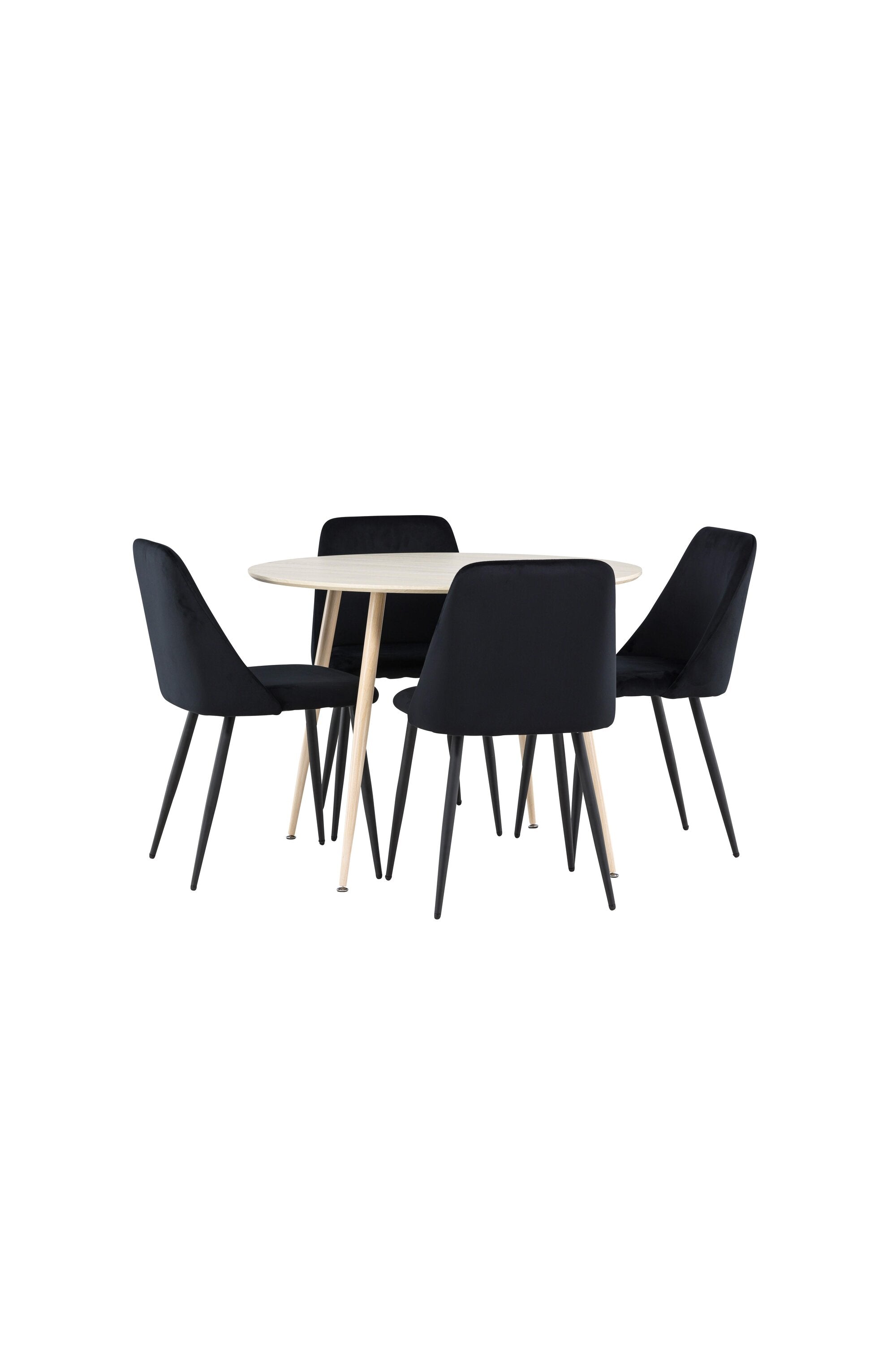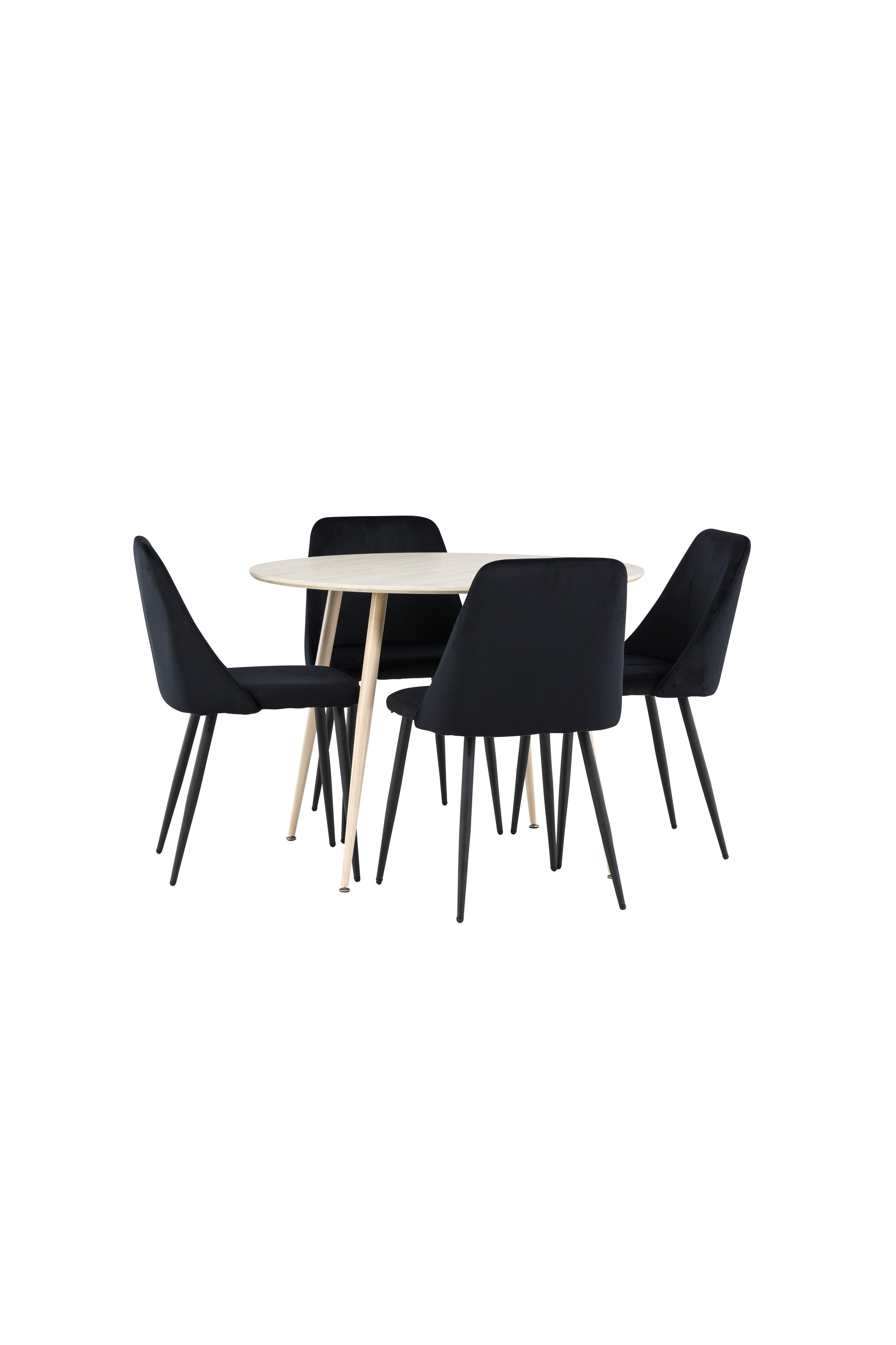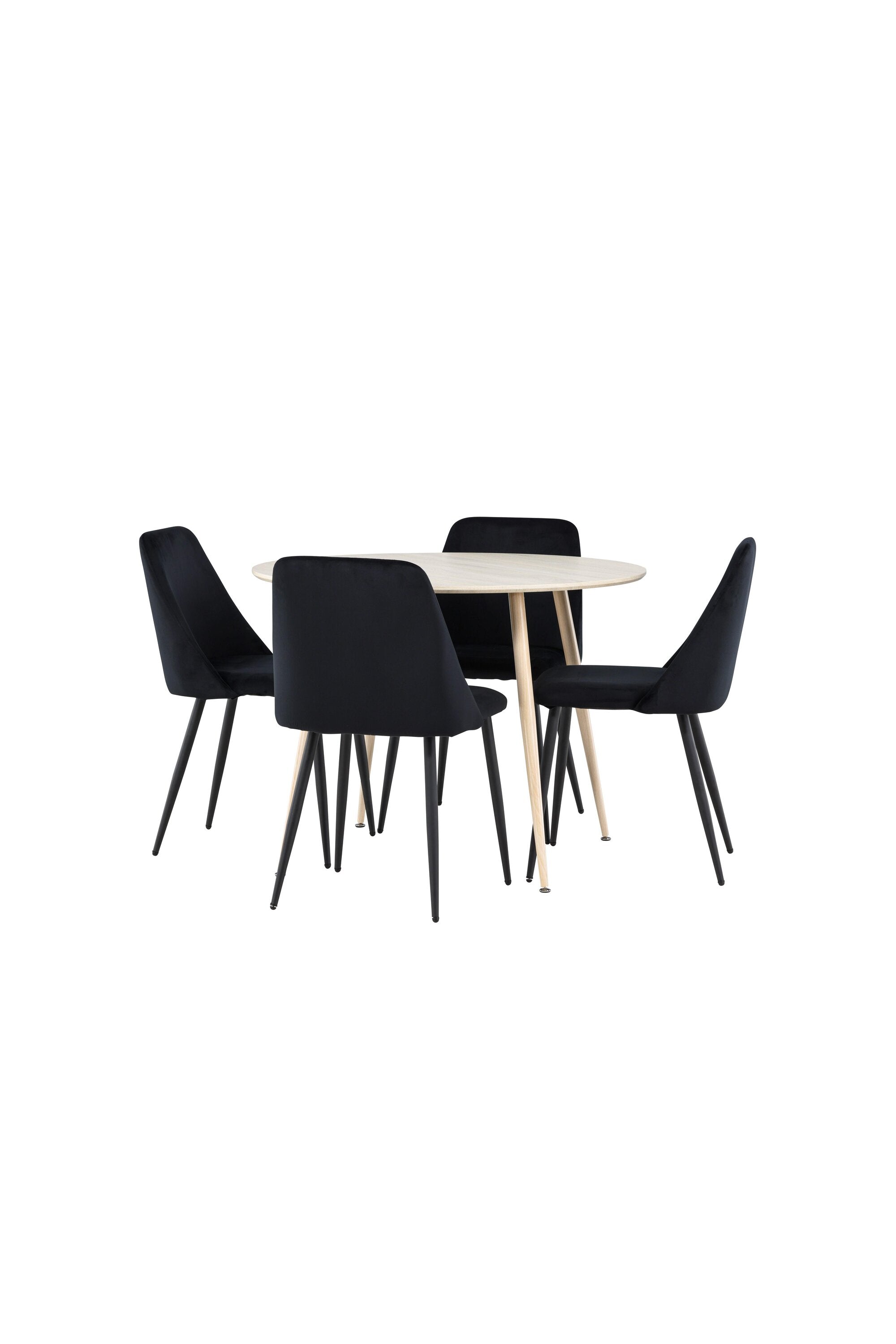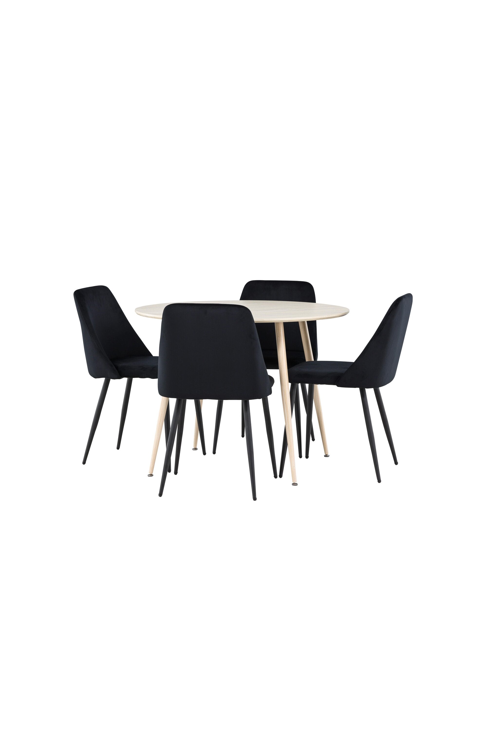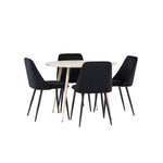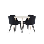 Objevte perfektní jídelní set pro váš domov s jídelním stolem Plaza a jídelními židlemi NIGHT. Jídelní stůl Plaza s velkorysým průměrem 100 cm je vyroben z odolného MDF materiálu a má bíle pigmentovanou barvu, která dodává místnosti hřejivý a příjemný pocit. Jeho moderní design a čisté linie vytvářejí klidnou a harmonickou atmosféru, díky níž je každé jídlo relaxačním zážitkem. Díky kompaktnímu formátu je Plaza ideální pro menší prostory a zároveň nabízí dostatek prostoru pro pohodlné jídlo s rodinou a přáteli. Doplňte svůj jídelní stůl jídelními židlemi NIGHT, které nabízejí pohodlí i styl. Křeslo má plně čalouněný sedák z černé sametové látky a nohy židle v odpovídající černé barvě, které dodávají místnosti luxusní třpyt. Jídelní židle NIGHT přispívají k příjemné a módní atmosféře, díky níž je posezení u lahodného jídla mimořádně příjemné. Sofistikovaný design a pohodlný materiál dělají z NIGHT perfektní volbu jak pro každodenní večeři, tak pro slavnostní příležitosti. Dodejte svému domovu nádech moderní elegance s jídelním stolem Plaza a jídelními židlemi NIGHT – ideální kombinace pro každého, kdo si cení stylu i funkce ve svém dekoru.
