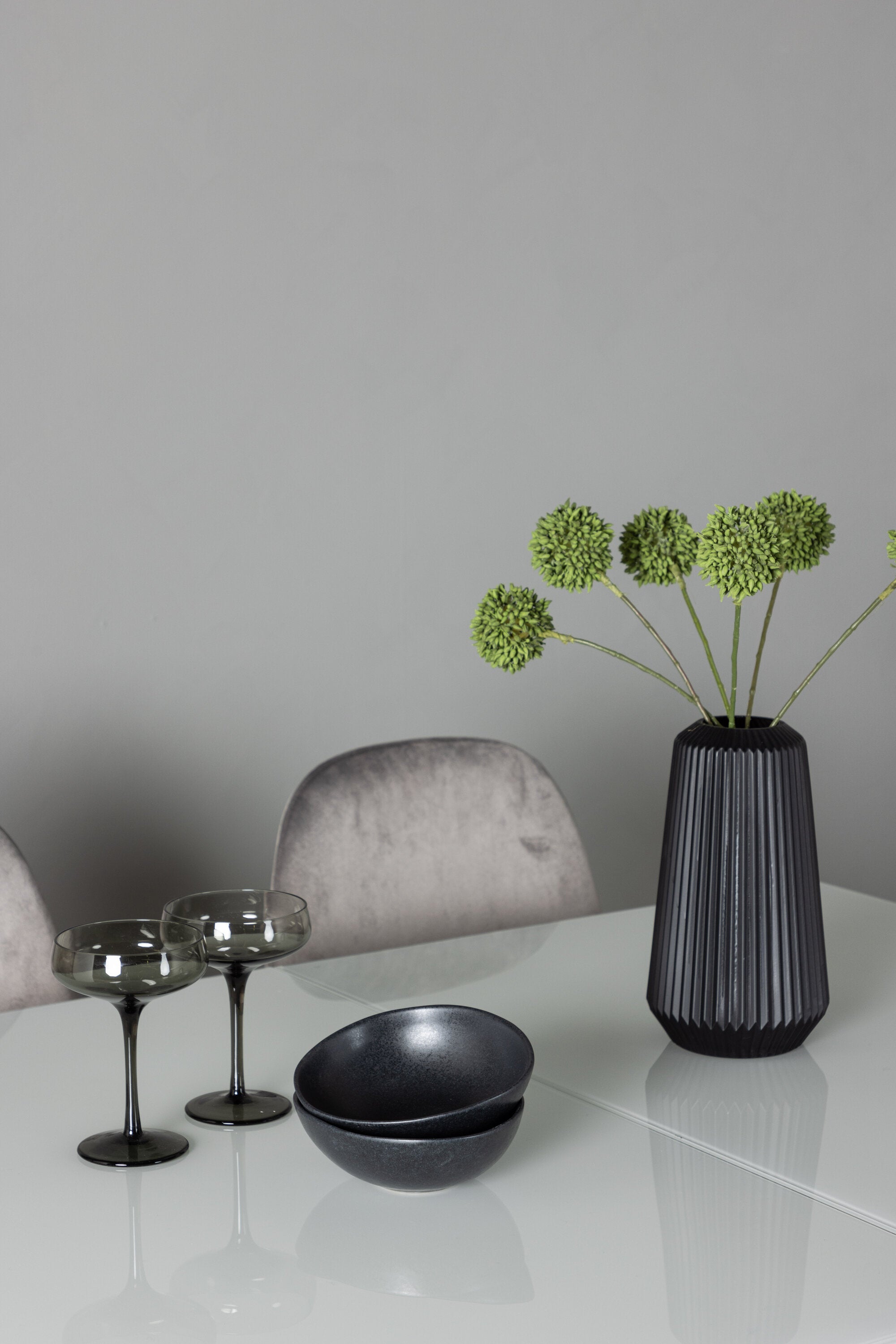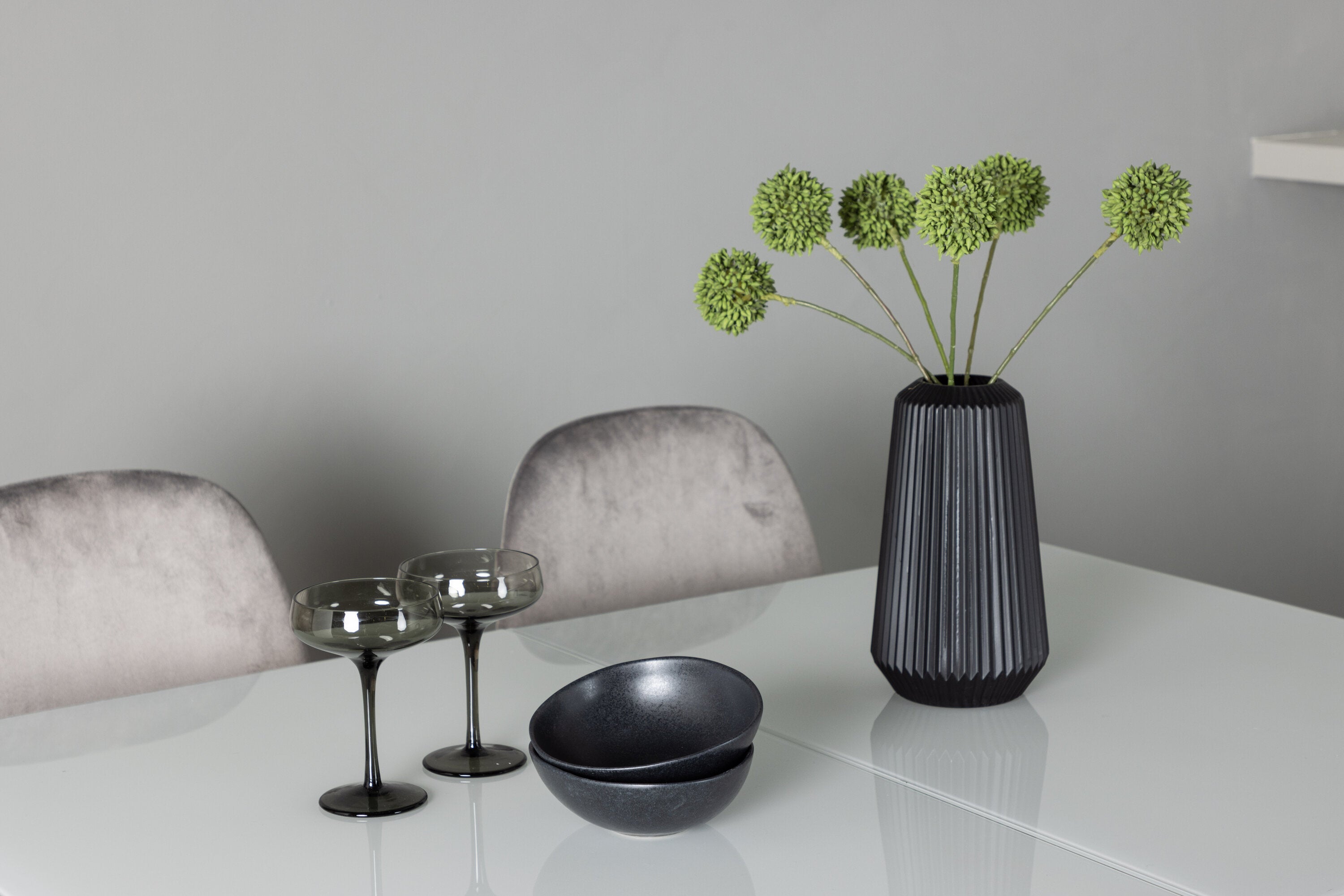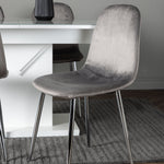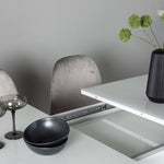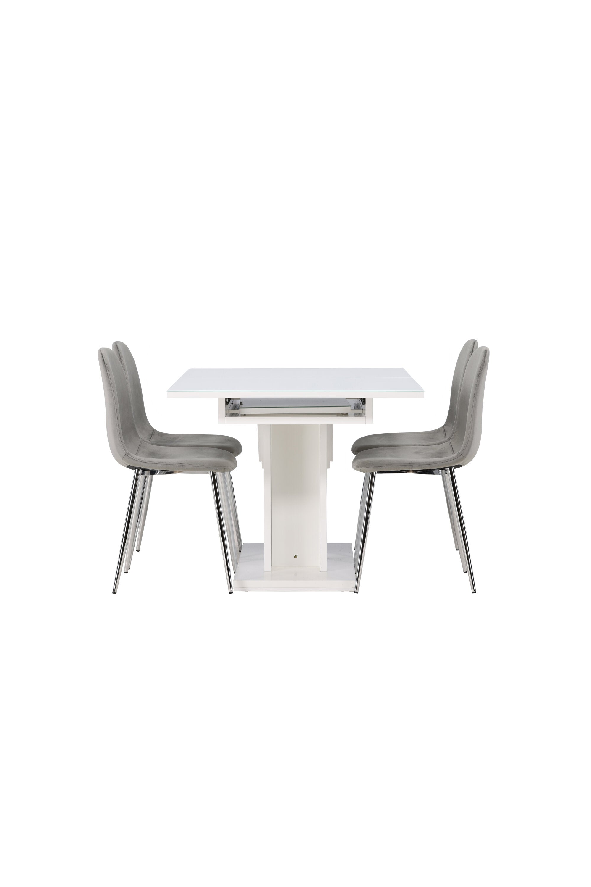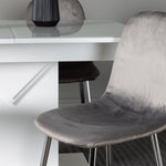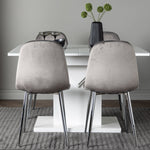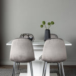 Spolu s bílým jídelním stolem nabízíme naše světle šedé jídelní židle ze série Eva. Tyto židle mají celočalouněný design s mírně zaobleným opěradlem a sedákem z luxusní sametové látky. Krásné světle šedé kovové nohy dodávají jídelní soupravě moderní nádech a udělají z ní okouzlující středobod vašeho domova. Dodejte svému obývacímu pokoji styl, který si zaslouží s tímto jídelním setem!