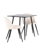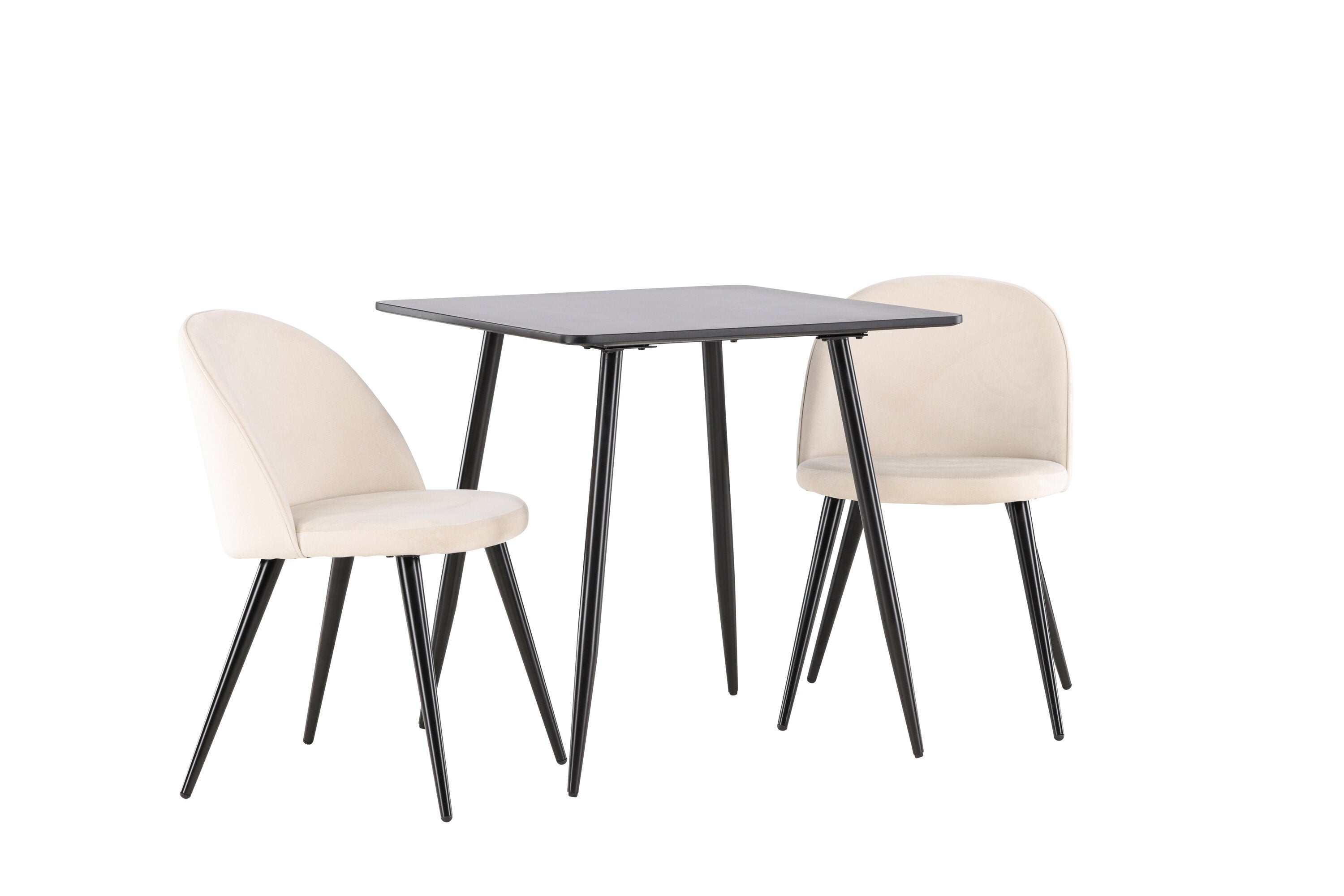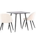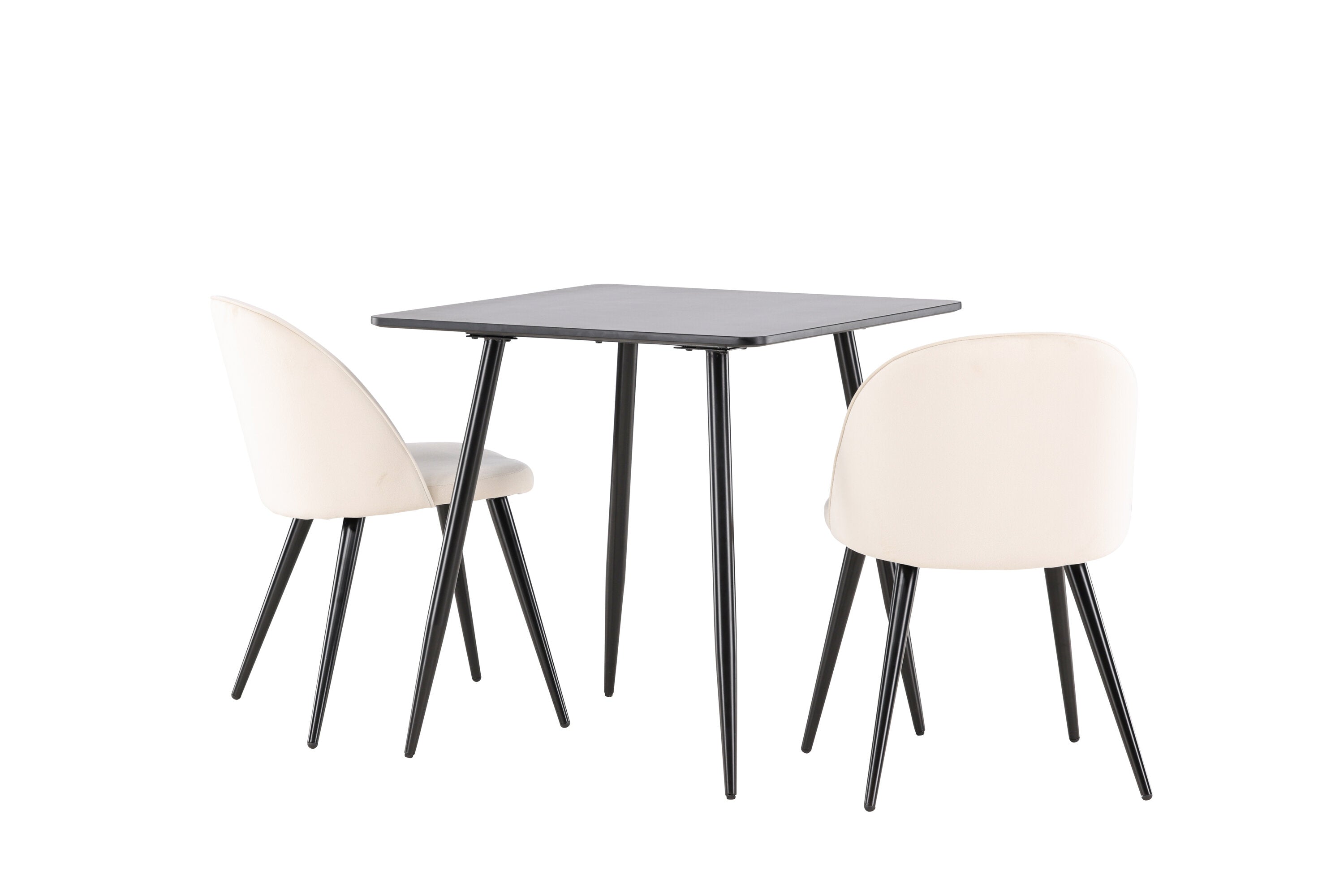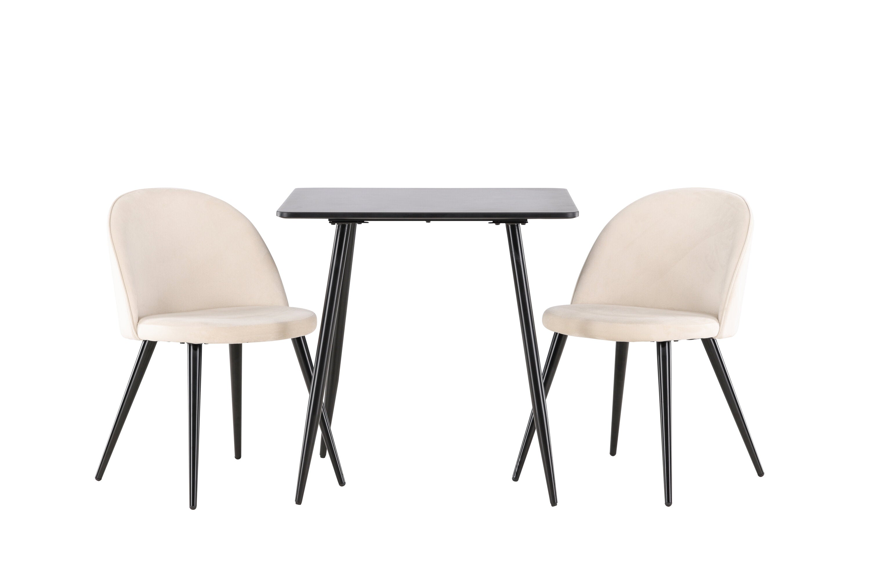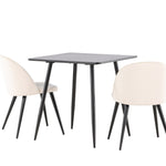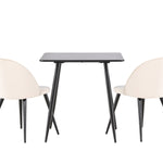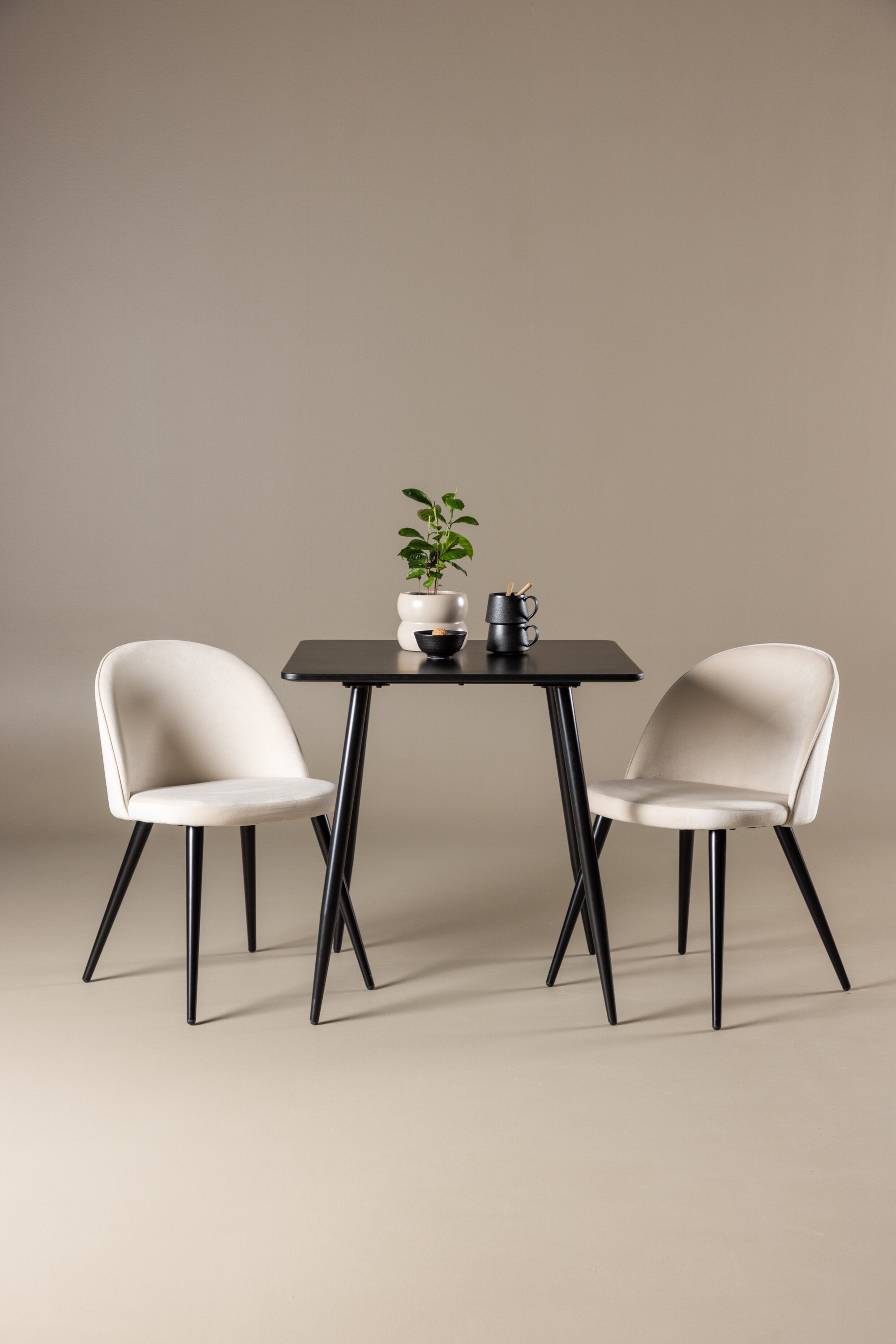 Vytvořte si moderní a příjemný jídelní kout s naší elegantní jídelní sadou, která kombinuje elegantní stůl Polar s luxusními židlemi Velvet. Tato jídelní souprava, která je ideální jak pro malá jídla, tak pro útulné večeře, dodá vaší jídelně nebo kuchyni sofistikovanou a harmonickou atmosféru. Jídelní stůl Polar vyrobený z MDF má elegantní černou barvu, která dodá vašemu domovu moderní a elegantní atmosféru. Stůl s rozměry 75x75 cm nabízí kompaktní, ale prostornou plochu pro jídlo a konverzaci, díky čemuž je ideální pro menší prostory nebo intimní jídelní prostory. Robustní konstrukce stolu zajišťuje dlouhodobé používání a stabilitu. Dvě židle Velvet skvěle doplňují stůl svými elegantními sedáky čalouněnými béžovým sametem. Tyto židle nabízejí pohodlí i styl, díky čemuž jsou ideální pro dlouhá a příjemná jídla. Jejich moderní design s vysokými opěradly a měkkými sedáky dodá vaší jídelně nebo kuchyni sofistikovaný a moderní nádech. Tato jídelní souprava je dokonalou kombinací estetiky a funkčnosti, díky čemuž je vynikající volbou pro ty, kteří hledají elegantní a pohodlný jídelní kout v menším formátu. Vylepšete svůj domov kombinací stolu Polar a židlí Velvet a vytvořte si místo, kde se budou sdílet vzpomínky a radost.