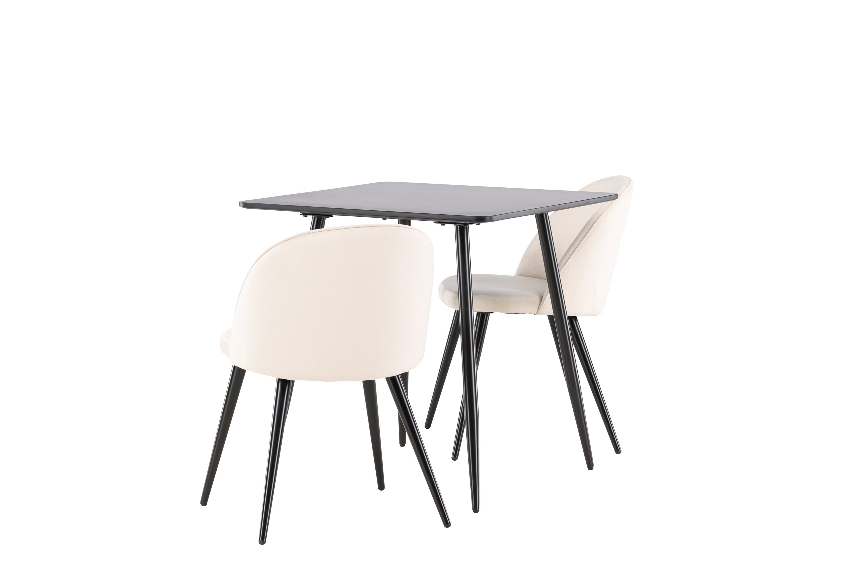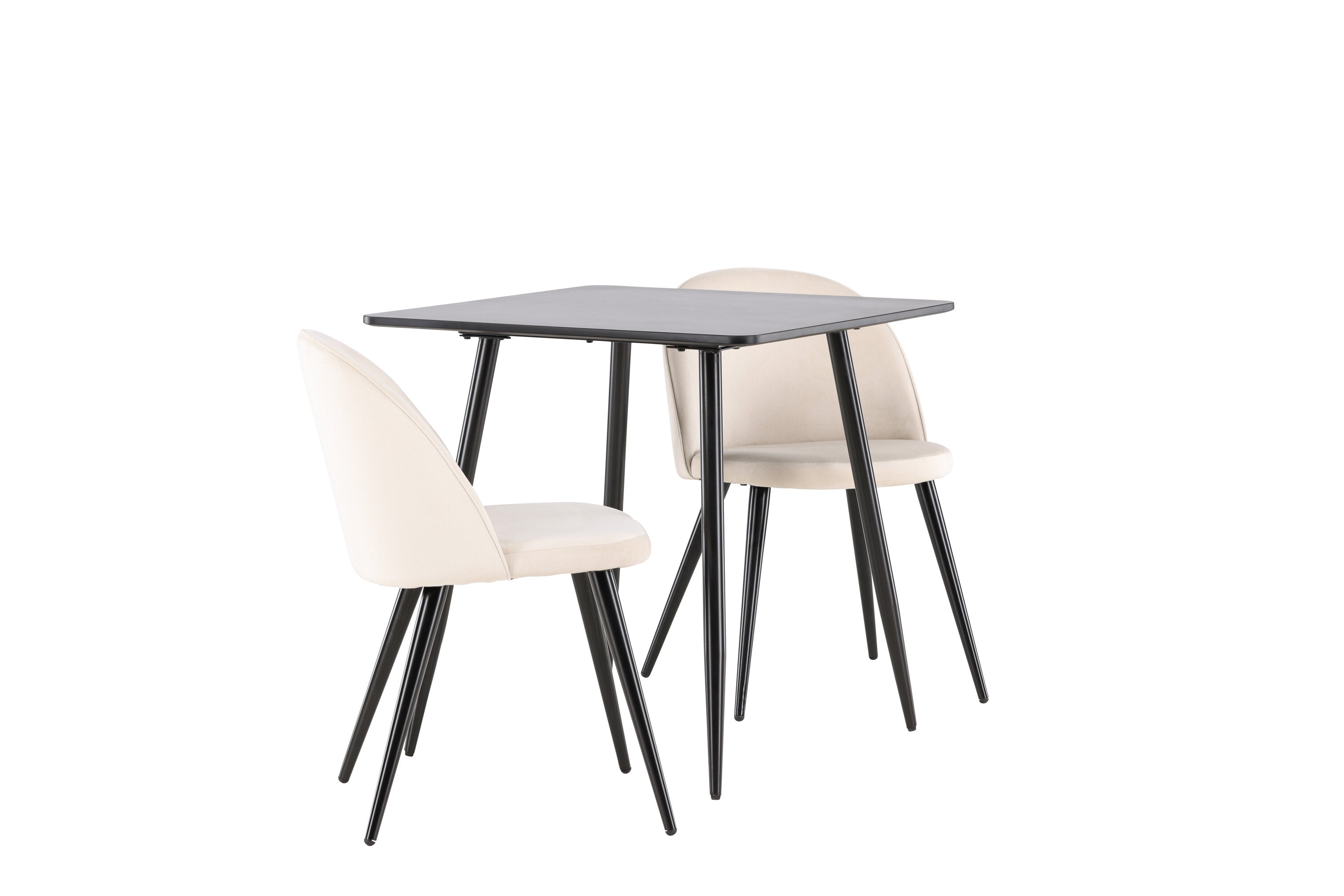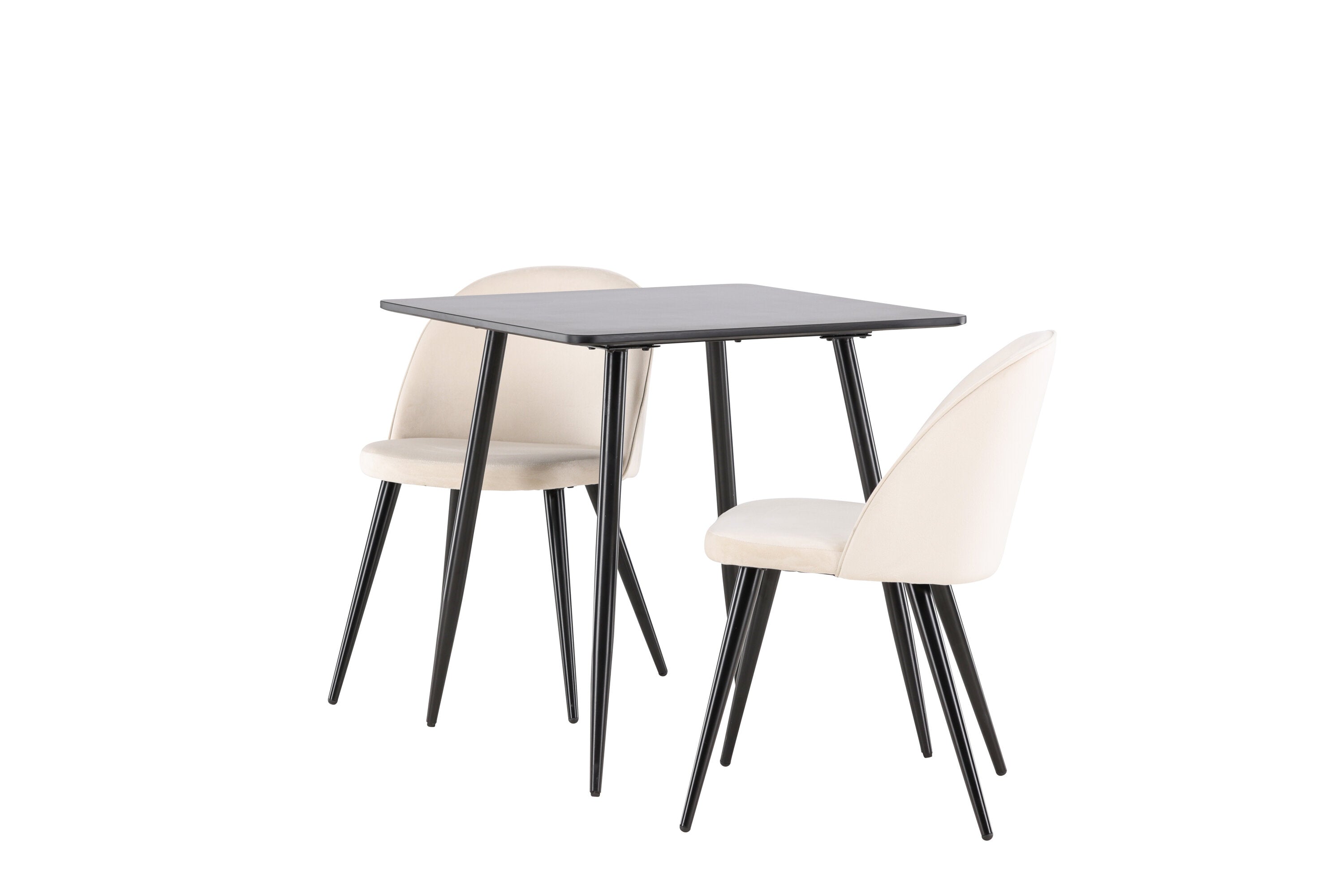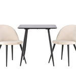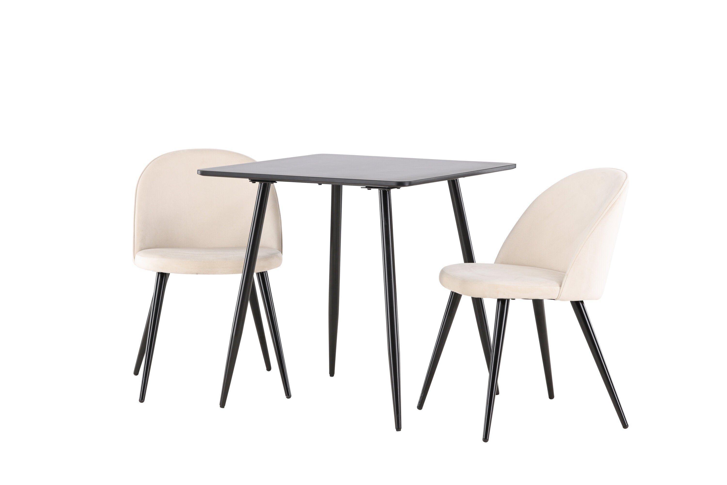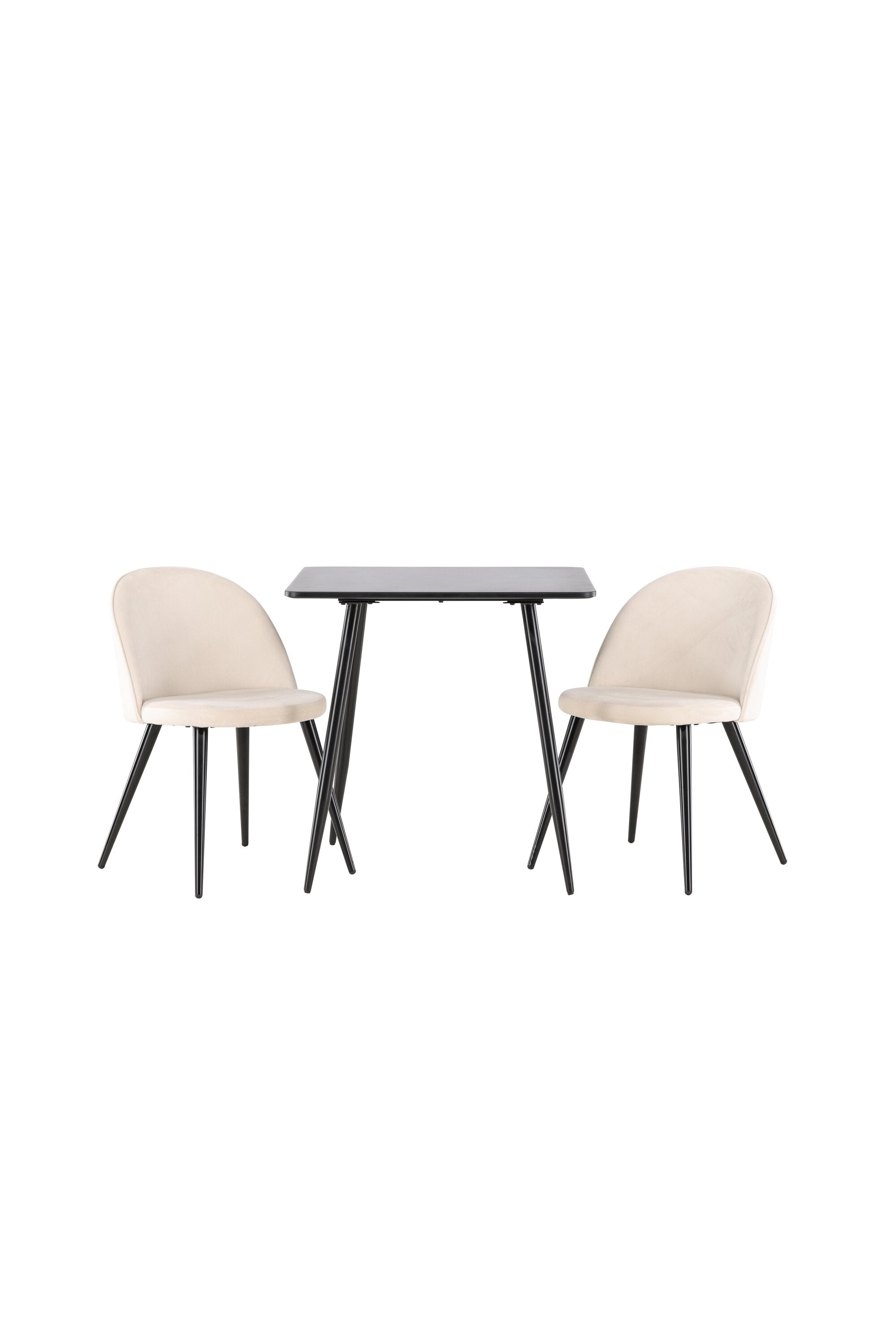 Vytvořte si moderní a příjemný jídelní kout s naší elegantní jídelní sadou, která kombinuje elegantní stůl Polar s luxusními židlemi Velvet. Tato jídelní souprava, která je ideální jak pro malá jídla, tak pro útulné večeře, dodá vaší jídelně nebo kuchyni sofistikovanou a harmonickou atmosféru. Jídelní stůl Polar vyrobený z MDF má elegantní černou barvu, která dodá vašemu domovu moderní a elegantní atmosféru. Stůl s rozměry 75x75 cm nabízí kompaktní, ale prostornou plochu pro jídlo a konverzaci, díky čemuž je ideální pro menší prostory nebo intimní jídelní prostory. Robustní konstrukce stolu zajišťuje dlouhodobé používání a stabilitu. Dvě židle Velvet skvěle doplňují stůl svými elegantními sedáky čalouněnými béžovým sametem. Tyto židle nabízejí pohodlí i styl, díky čemuž jsou ideální pro dlouhá a příjemná jídla. Jejich moderní design s vysokými opěradly a měkkými sedáky dodá vaší jídelně nebo kuchyni sofistikovaný a moderní nádech. Tato jídelní souprava je dokonalou kombinací estetiky a funkčnosti, díky čemuž je vynikající volbou pro ty, kteří hledají elegantní a pohodlný jídelní kout v menším formátu. Vylepšete svůj domov kombinací stolu Polar a židlí Velvet a vytvořte si místo, kde se budou sdílet vzpomínky a radost.