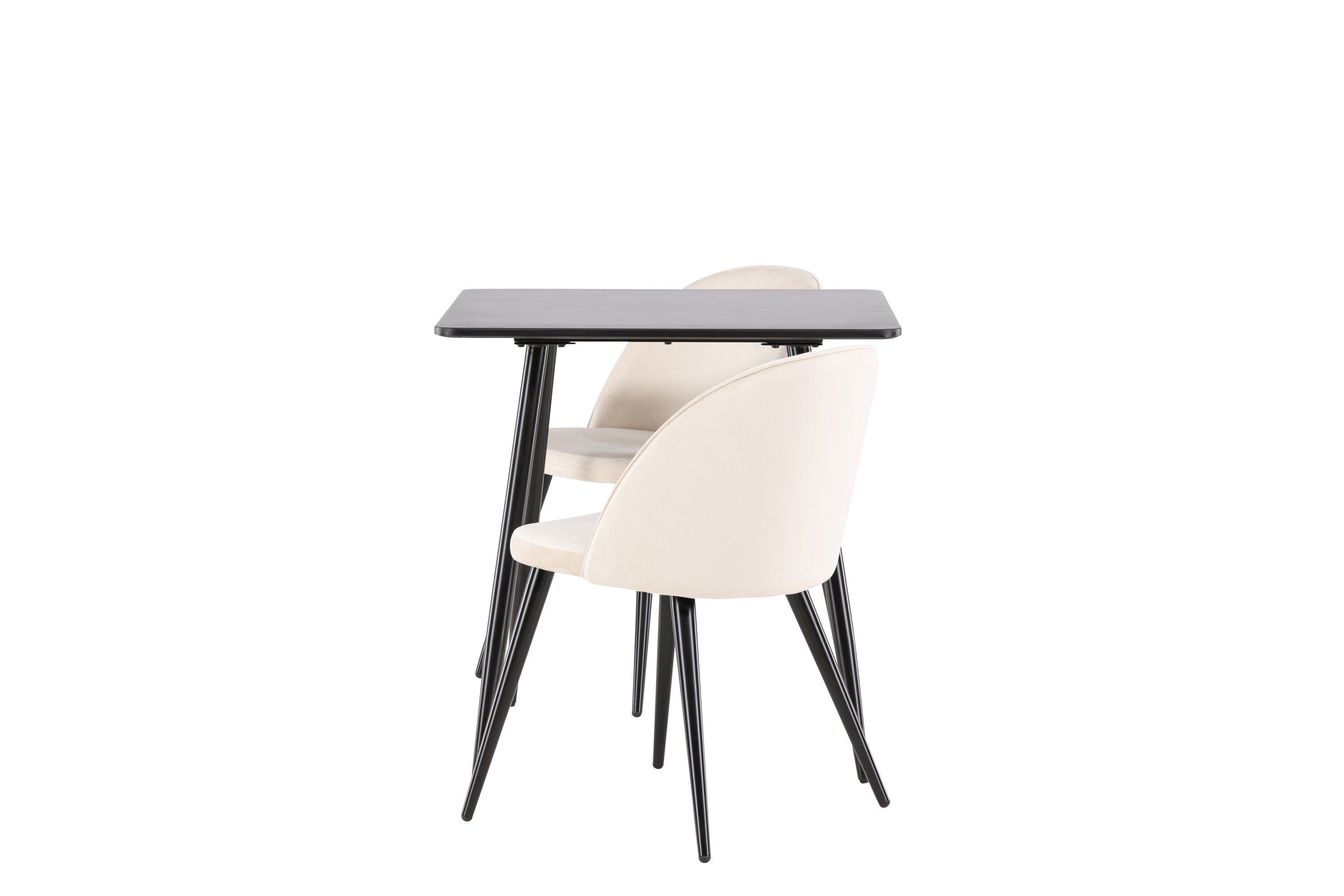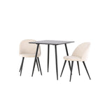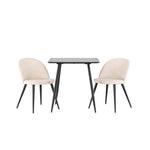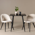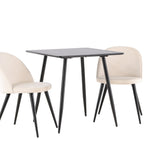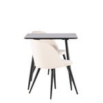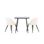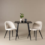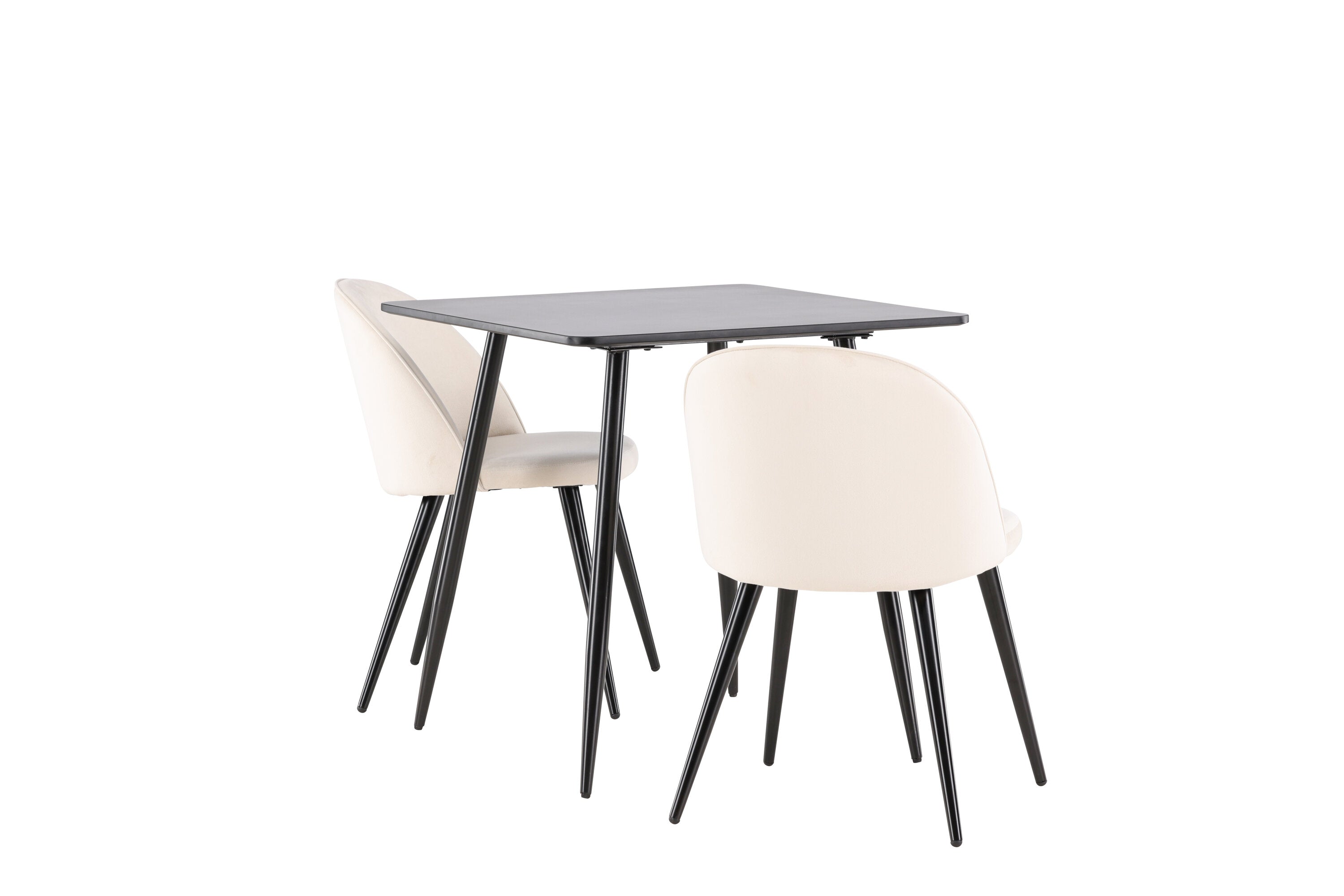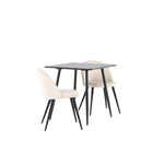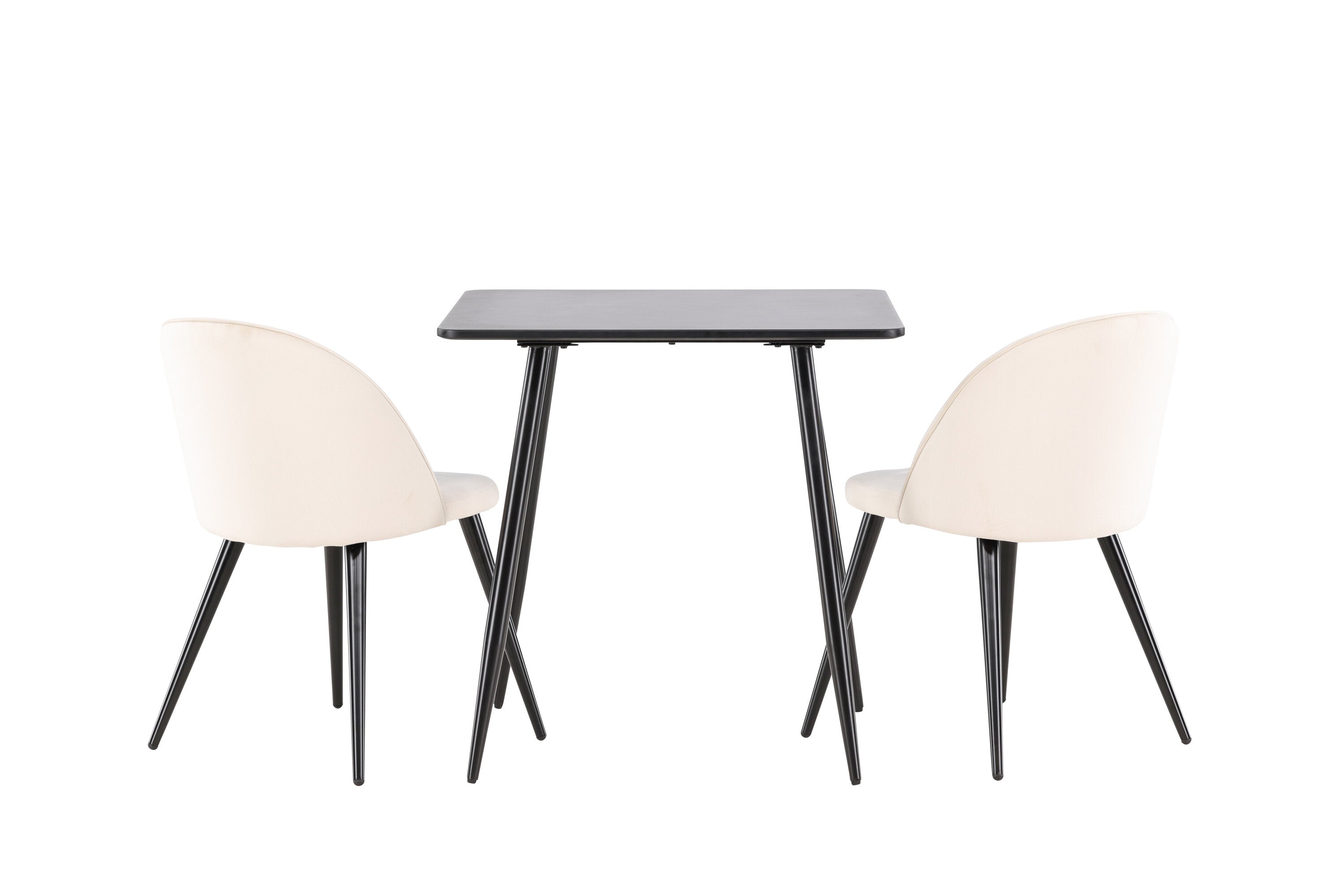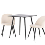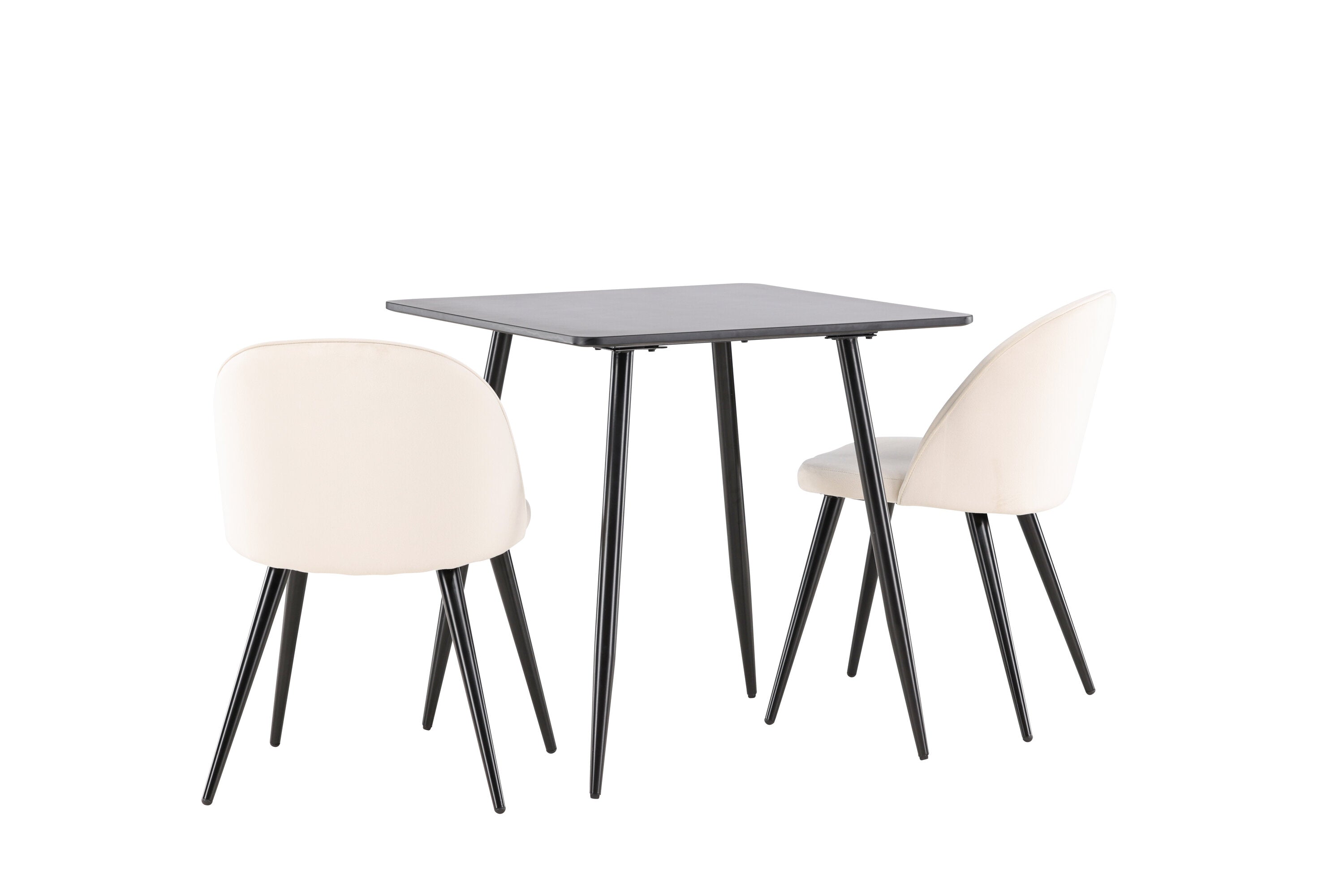 Vytvořte si moderní a příjemný jídelní kout s naší elegantní jídelní sadou, která kombinuje elegantní stůl Polar s luxusními židlemi Velvet. Tato jídelní souprava, která je ideální jak pro malá jídla, tak pro útulné večeře, dodá vaší jídelně nebo kuchyni sofistikovanou a harmonickou atmosféru. Jídelní stůl Polar vyrobený z MDF má elegantní černou barvu, která dodá vašemu domovu moderní a elegantní atmosféru. Stůl s rozměry 75x75 cm nabízí kompaktní, ale prostornou plochu pro jídlo a konverzaci, díky čemuž je ideální pro menší prostory nebo intimní jídelní prostory. Robustní konstrukce stolu zajišťuje dlouhodobé používání a stabilitu. Dvě židle Velvet skvěle doplňují stůl svými elegantními sedáky čalouněnými béžovým sametem. Tyto židle nabízejí pohodlí i styl, díky čemuž jsou ideální pro dlouhá a příjemná jídla. Jejich moderní design s vysokými opěradly a měkkými sedáky dodá vaší jídelně nebo kuchyni sofistikovaný a moderní nádech. Tato jídelní souprava je dokonalou kombinací estetiky a funkčnosti, díky čemuž je vynikající volbou pro ty, kteří hledají elegantní a pohodlný jídelní kout v menším formátu. Vylepšete svůj domov kombinací stolu Polar a židlí Velvet a vytvořte si místo, kde se budou sdílet vzpomínky a radost.