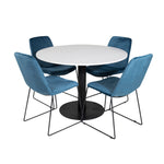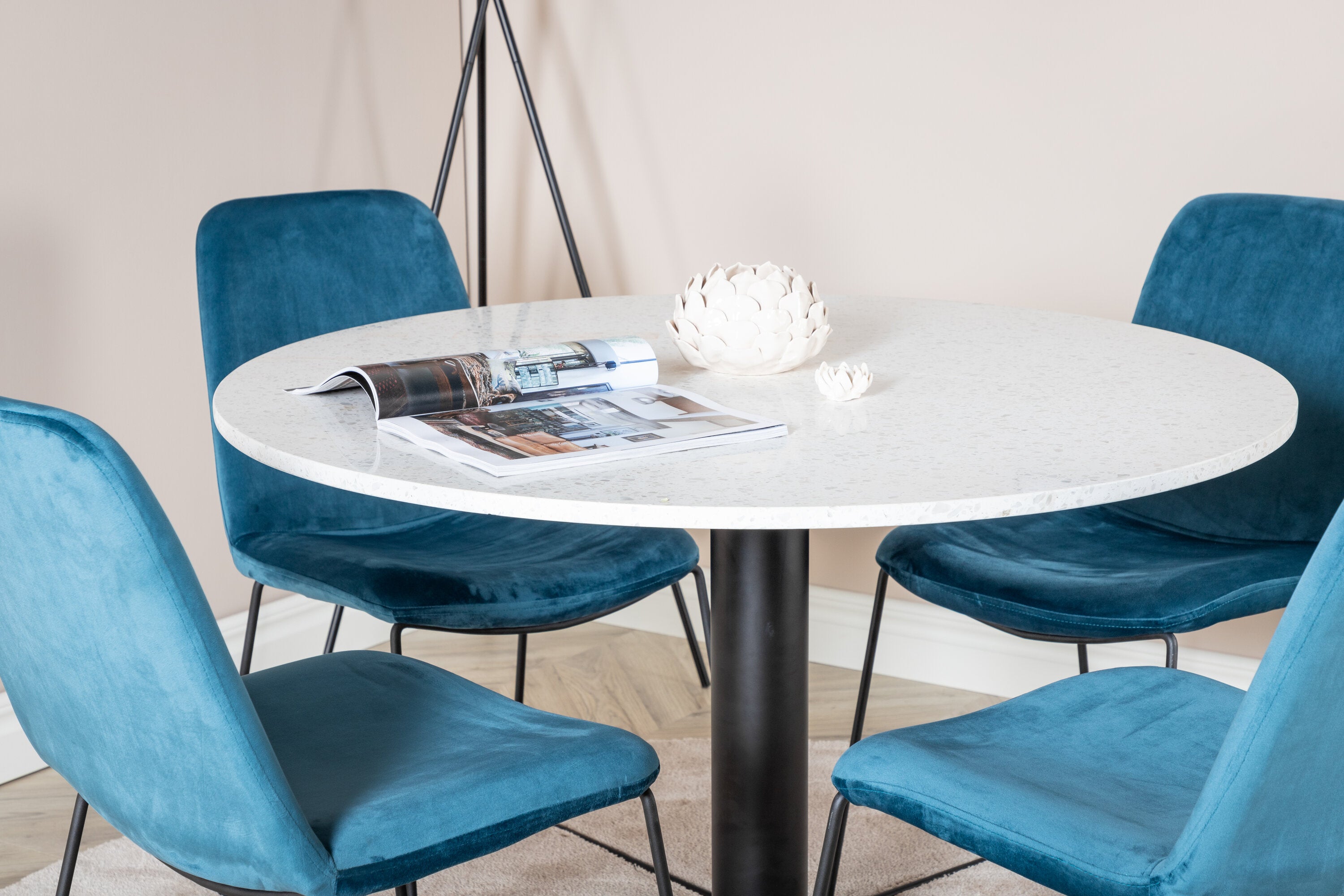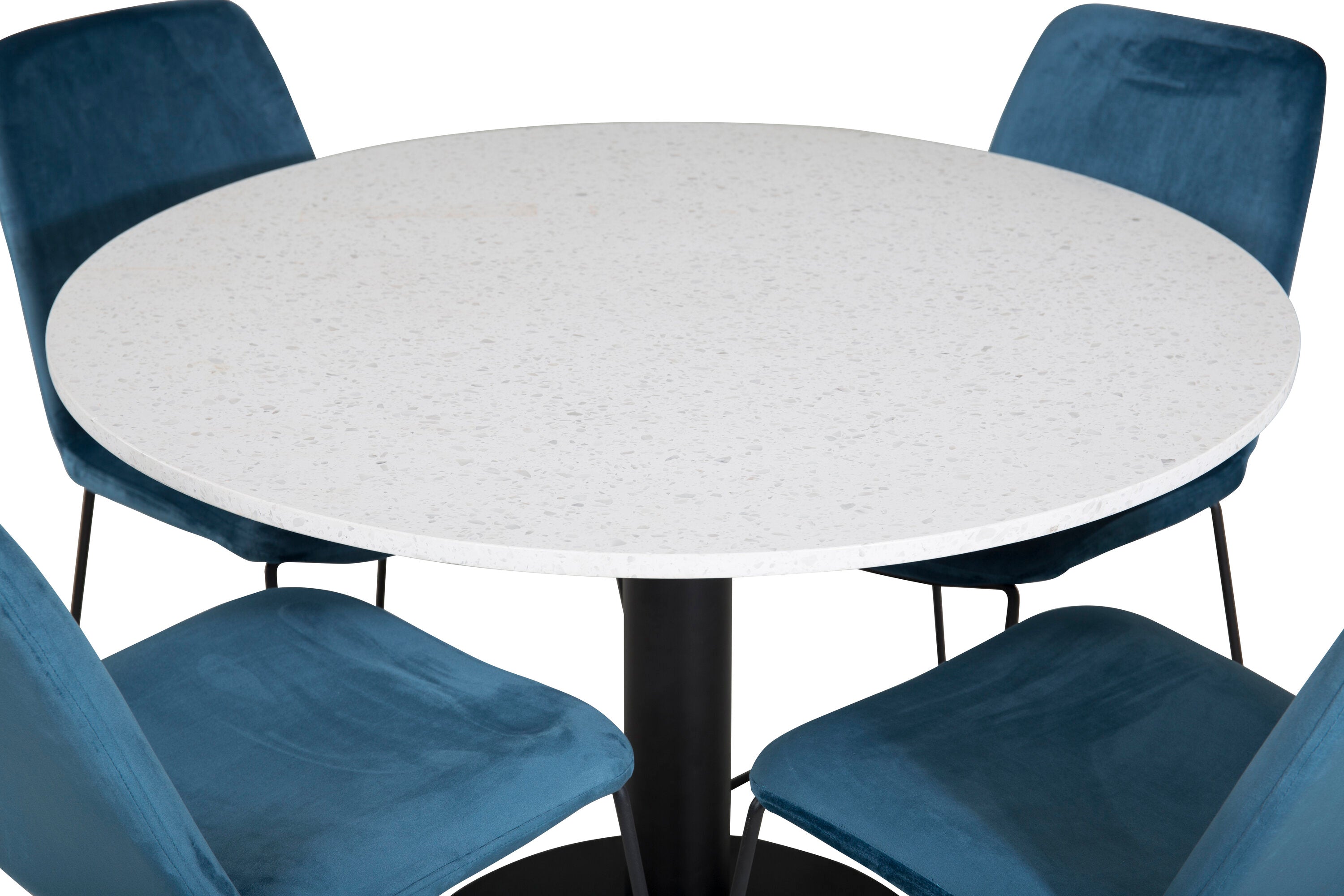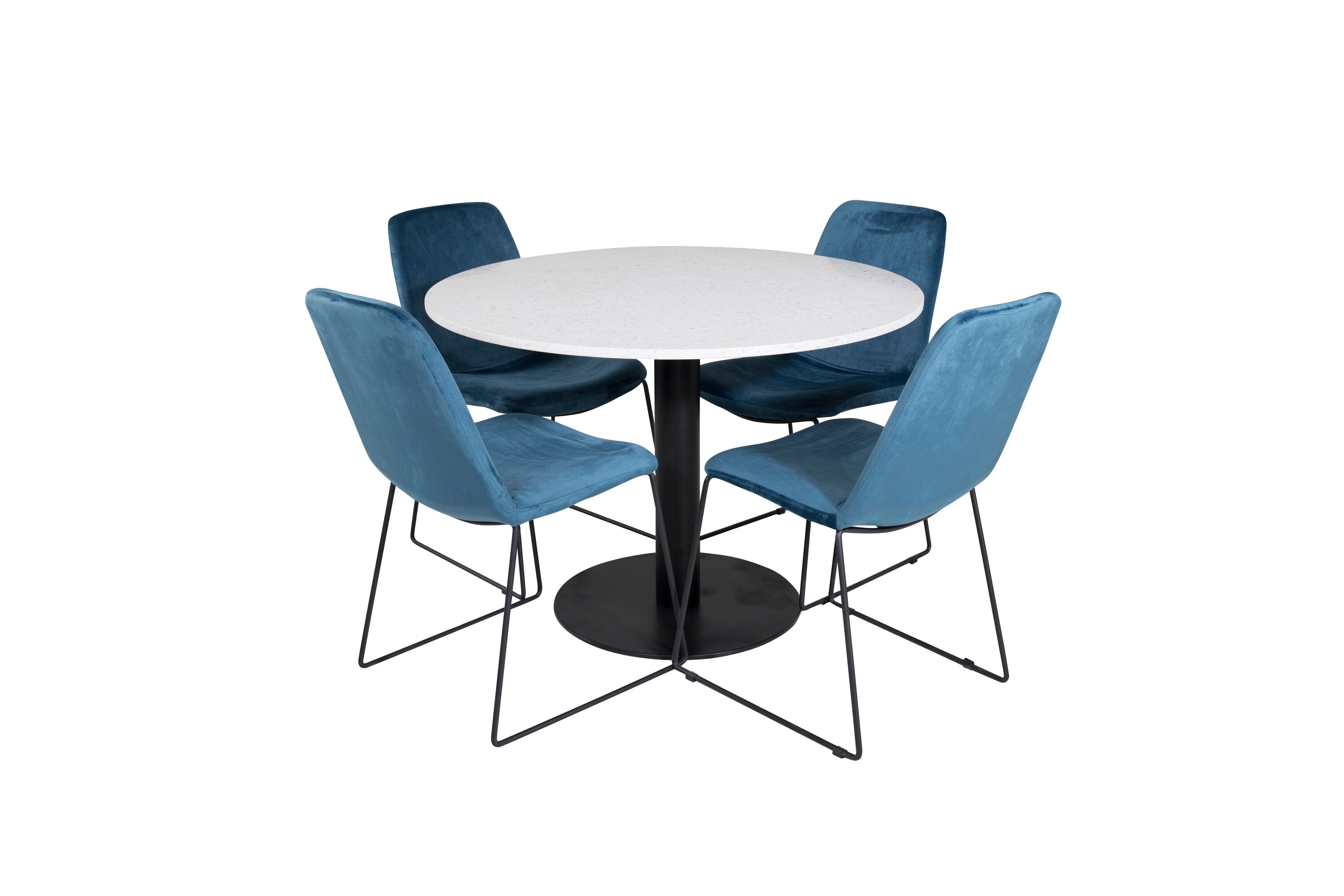Páni! Naše trendy a krásné jídelní židle Muce in Blue velvet jsou zde sladěny s naším kulatým jídelním stolem Razzia. Kombinace je stvořena pro ty, kteří chtějí skupinu potravin, po které touží!
