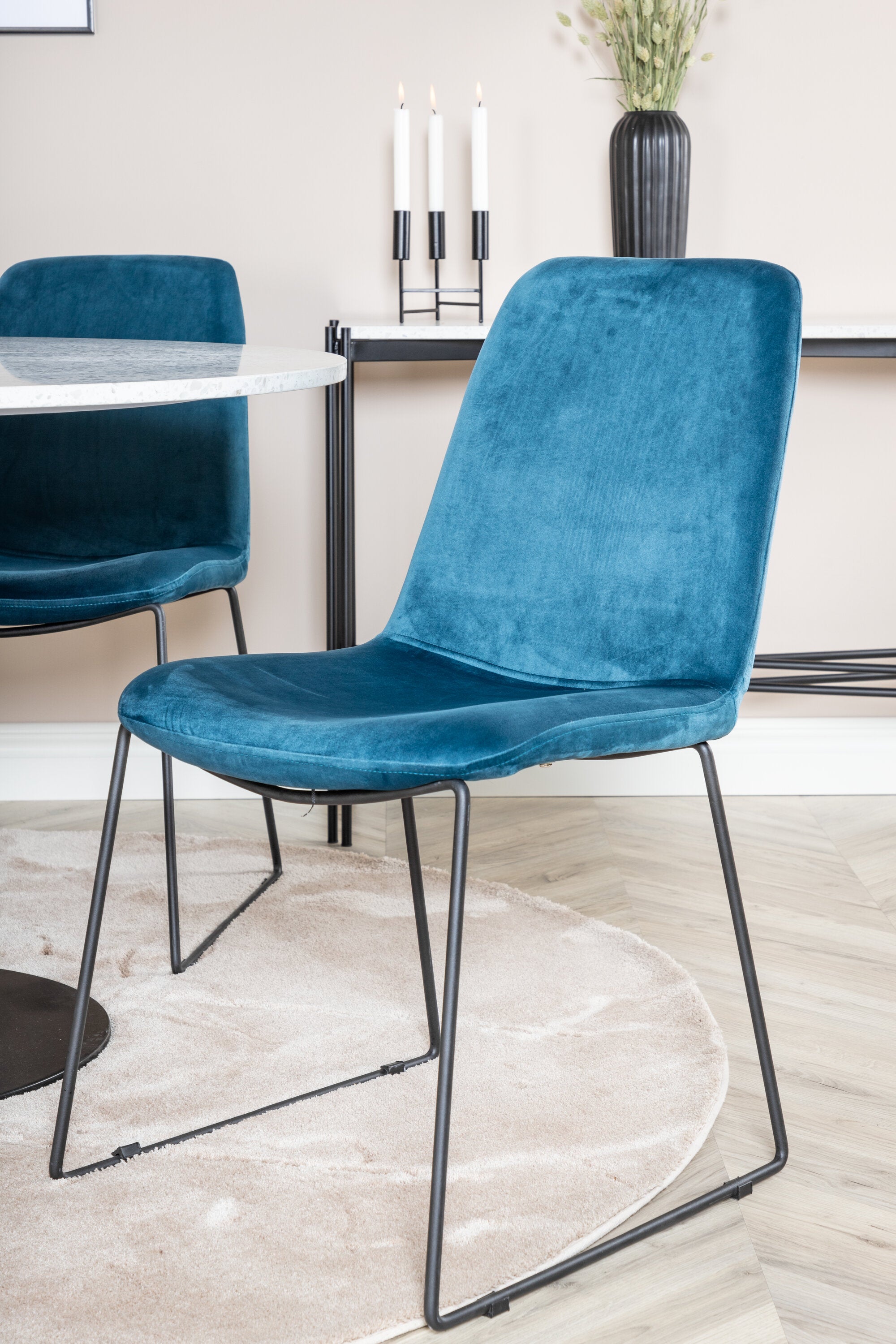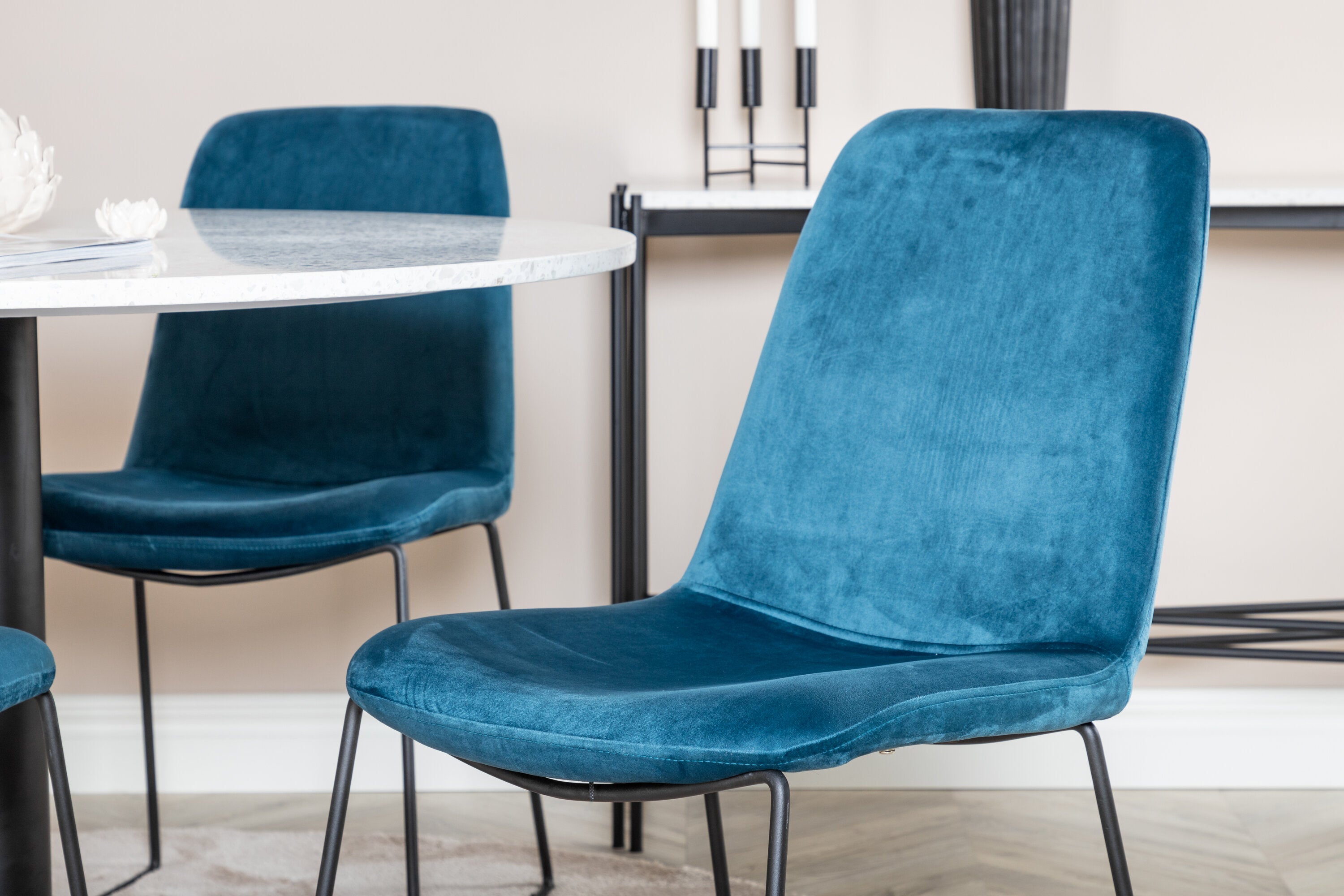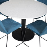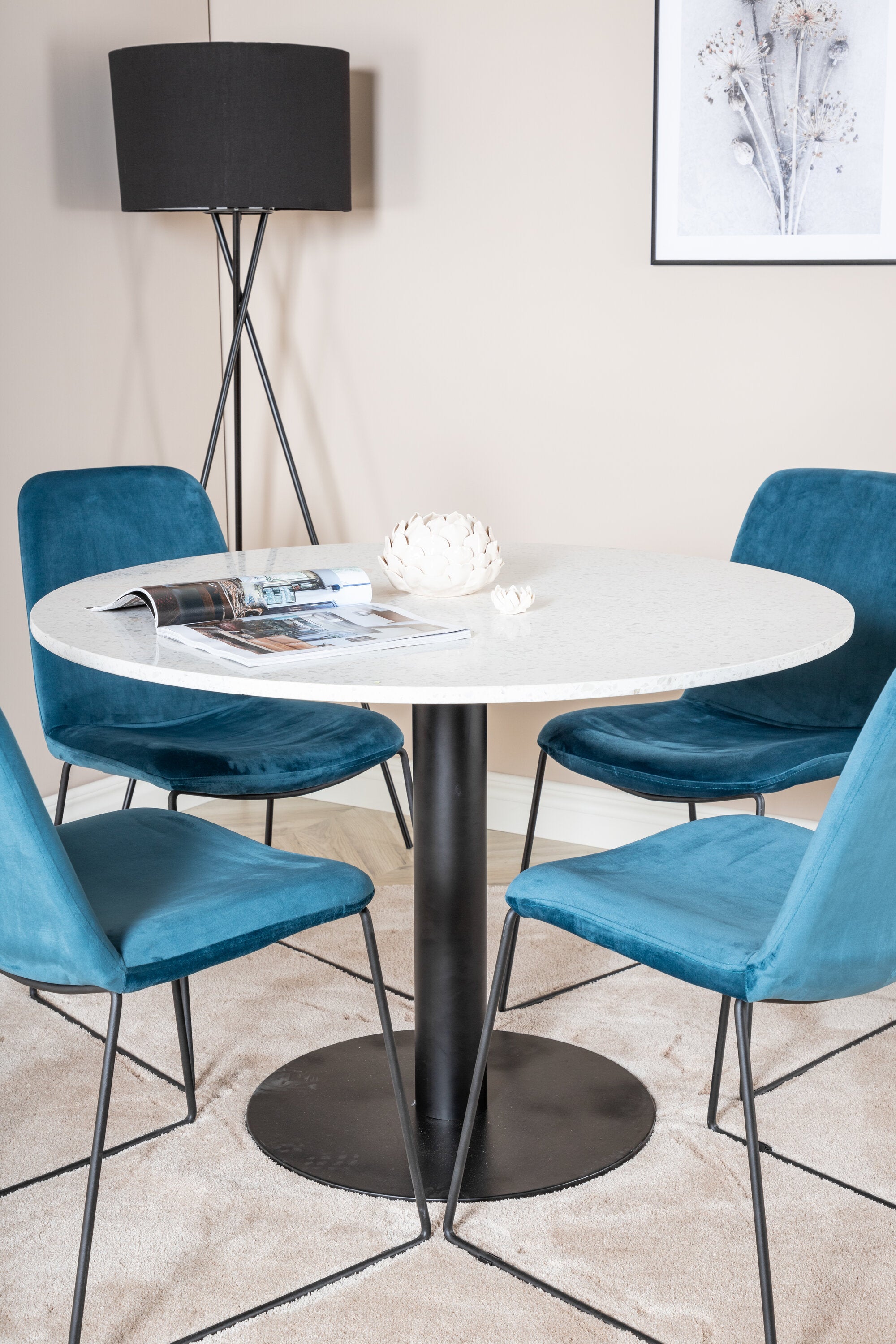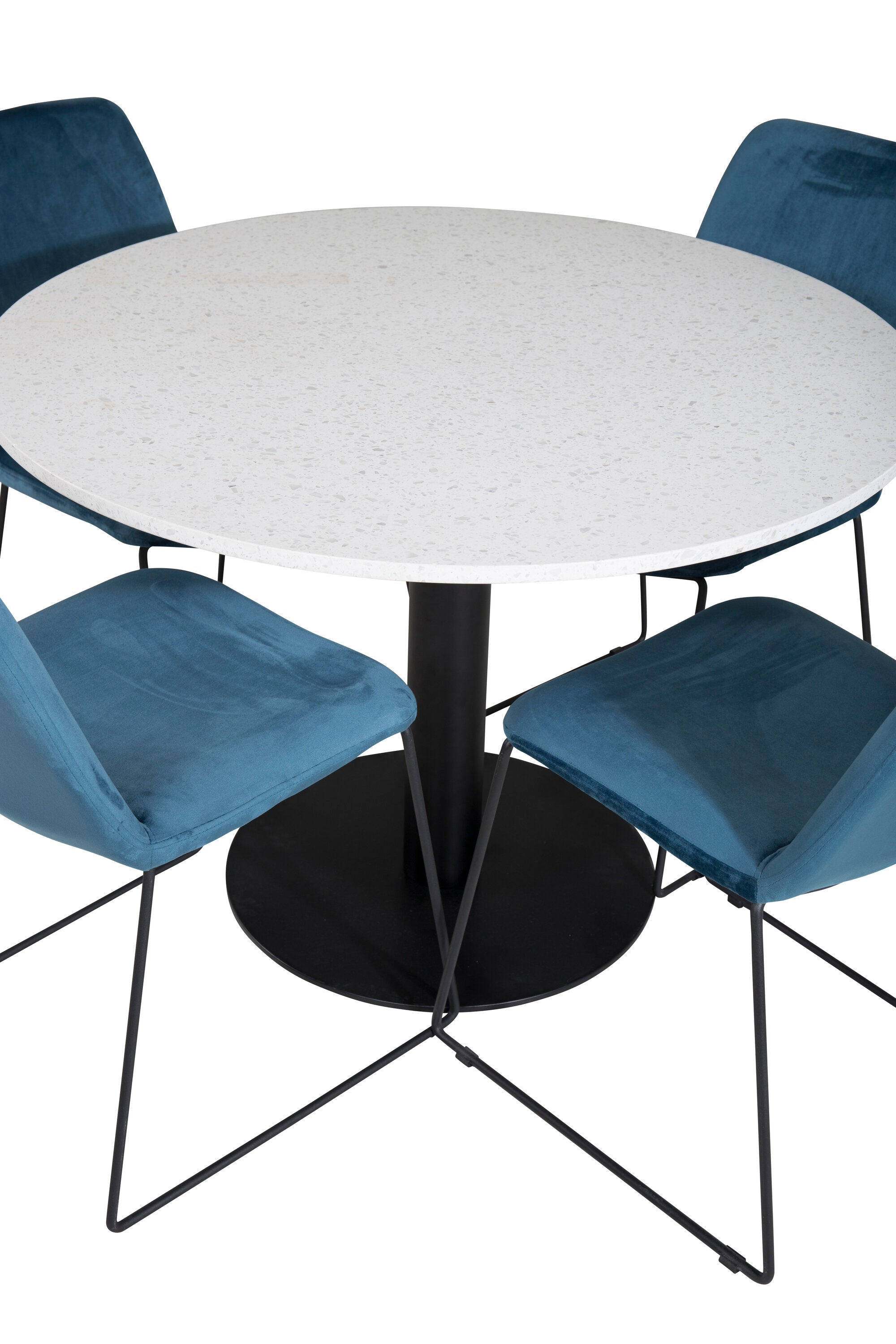 Páni! Naše trendy a krásné jídelní židle Muce in Blue velvet jsou zde sladěny s naším kulatým jídelním stolem Razzia. Kombinace je stvořena pro ty, kteří chtějí skupinu potravin, po které touží!