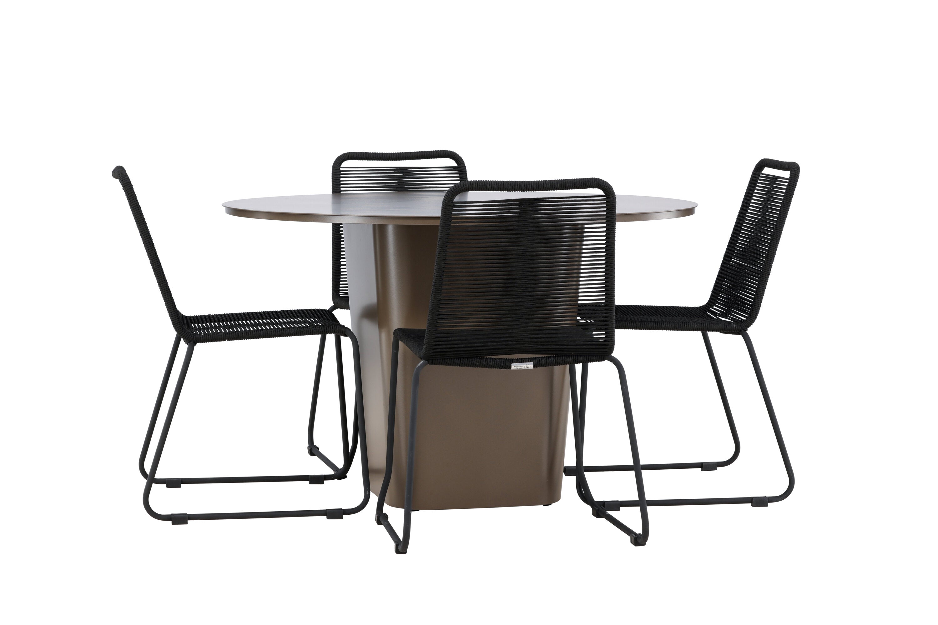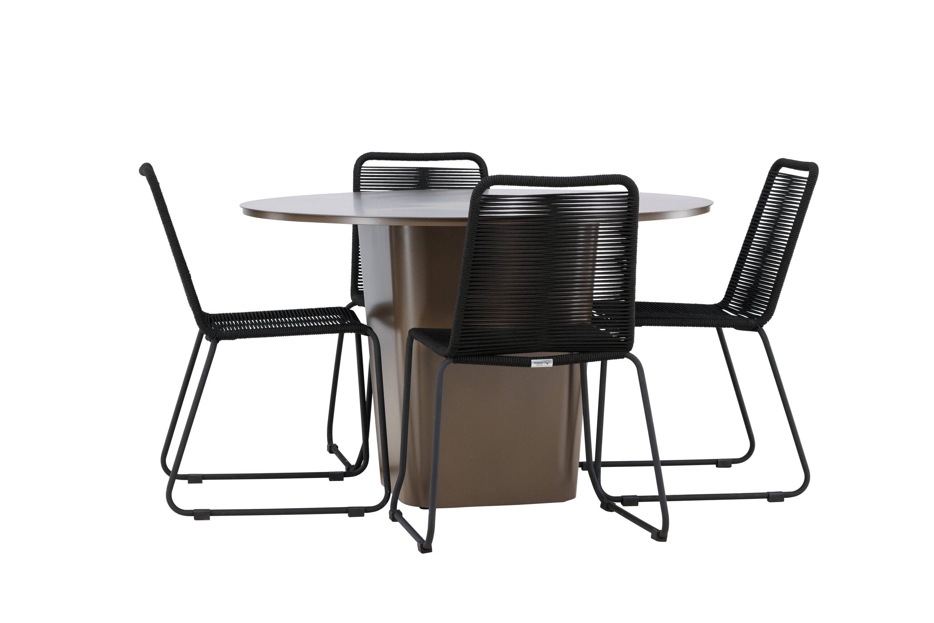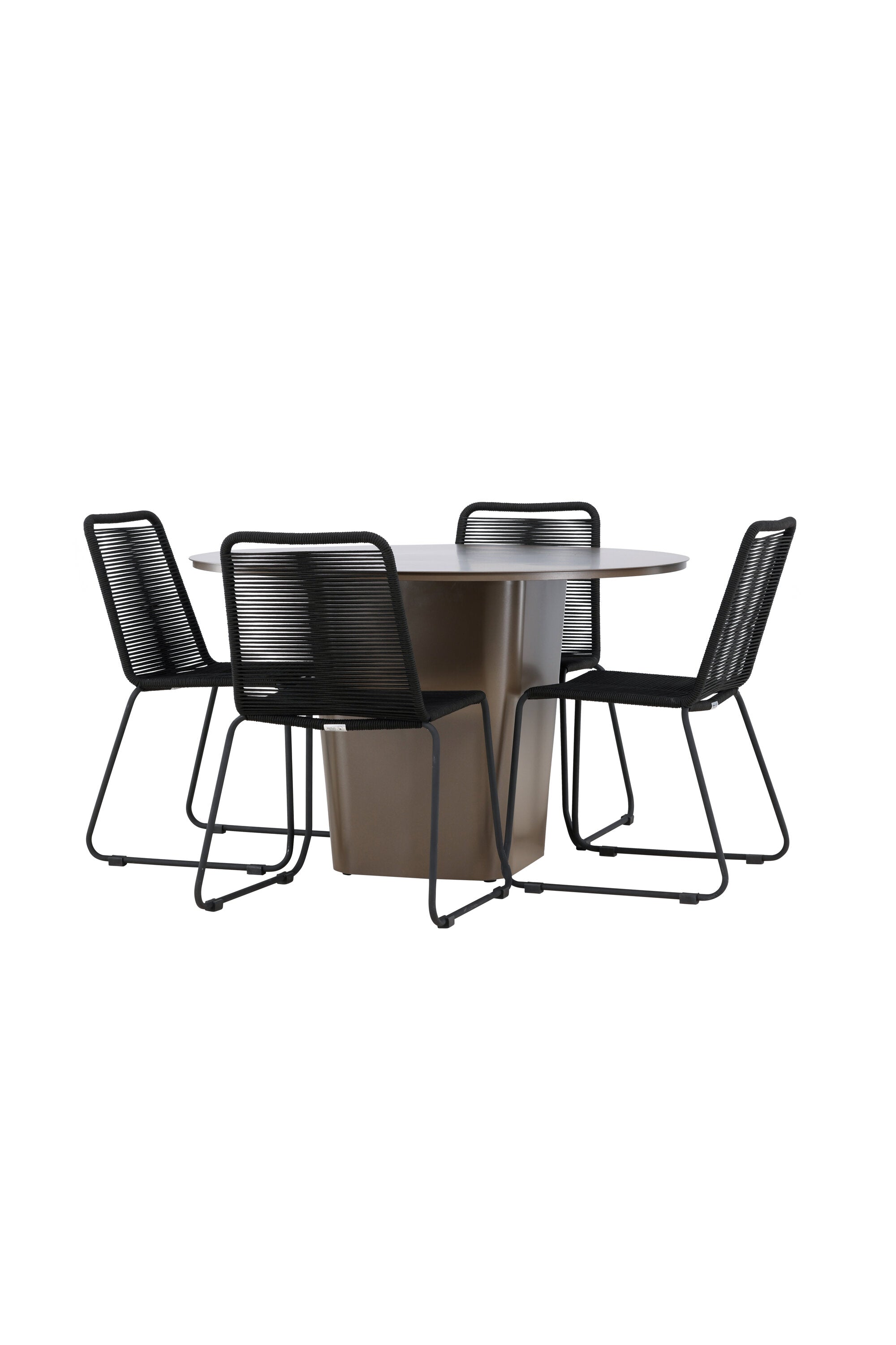 Tato jídelní souprava se čtyřmi židlemi Lindos, které jsou součástí dodávky, nabízí pohodlné a stylové sezení pro malé i velké venkovní akce.