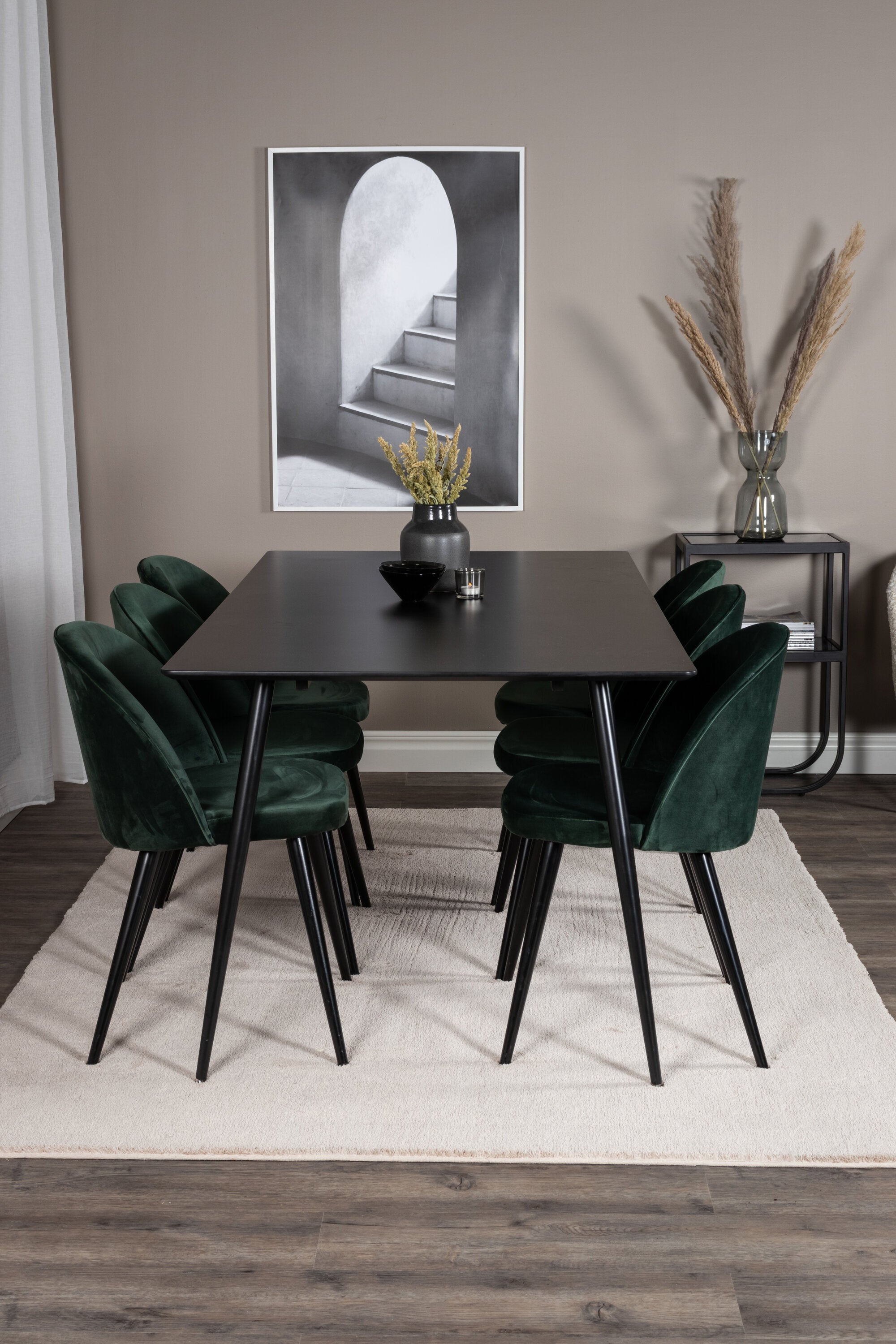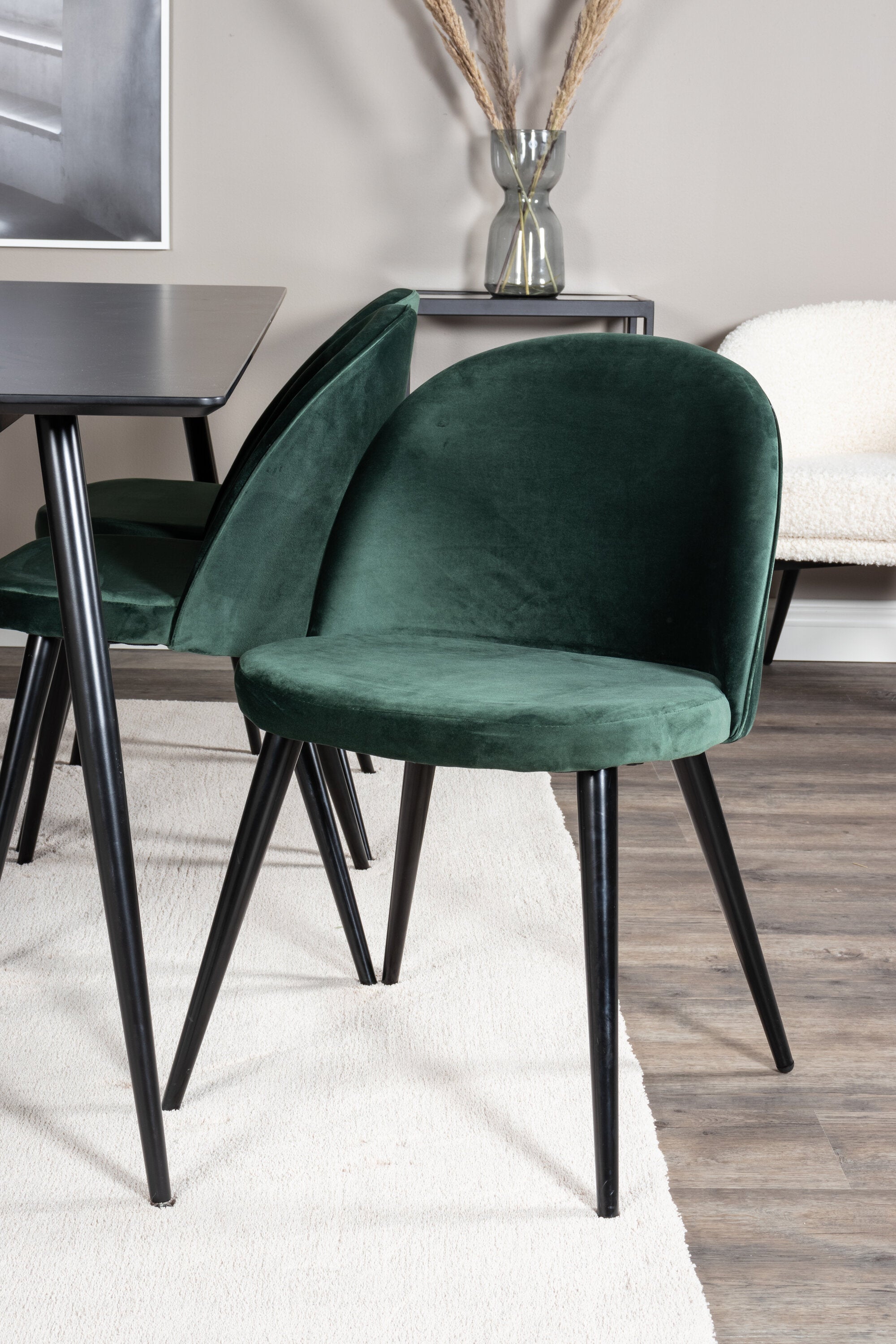 Stříbrný, moderní a úhledný jídelní stůl - zde společně se zelenými jídelními židlemi ze série Velvet. Zde je místo pro mnohé - pozvěte na pěkné rodinné večeře!