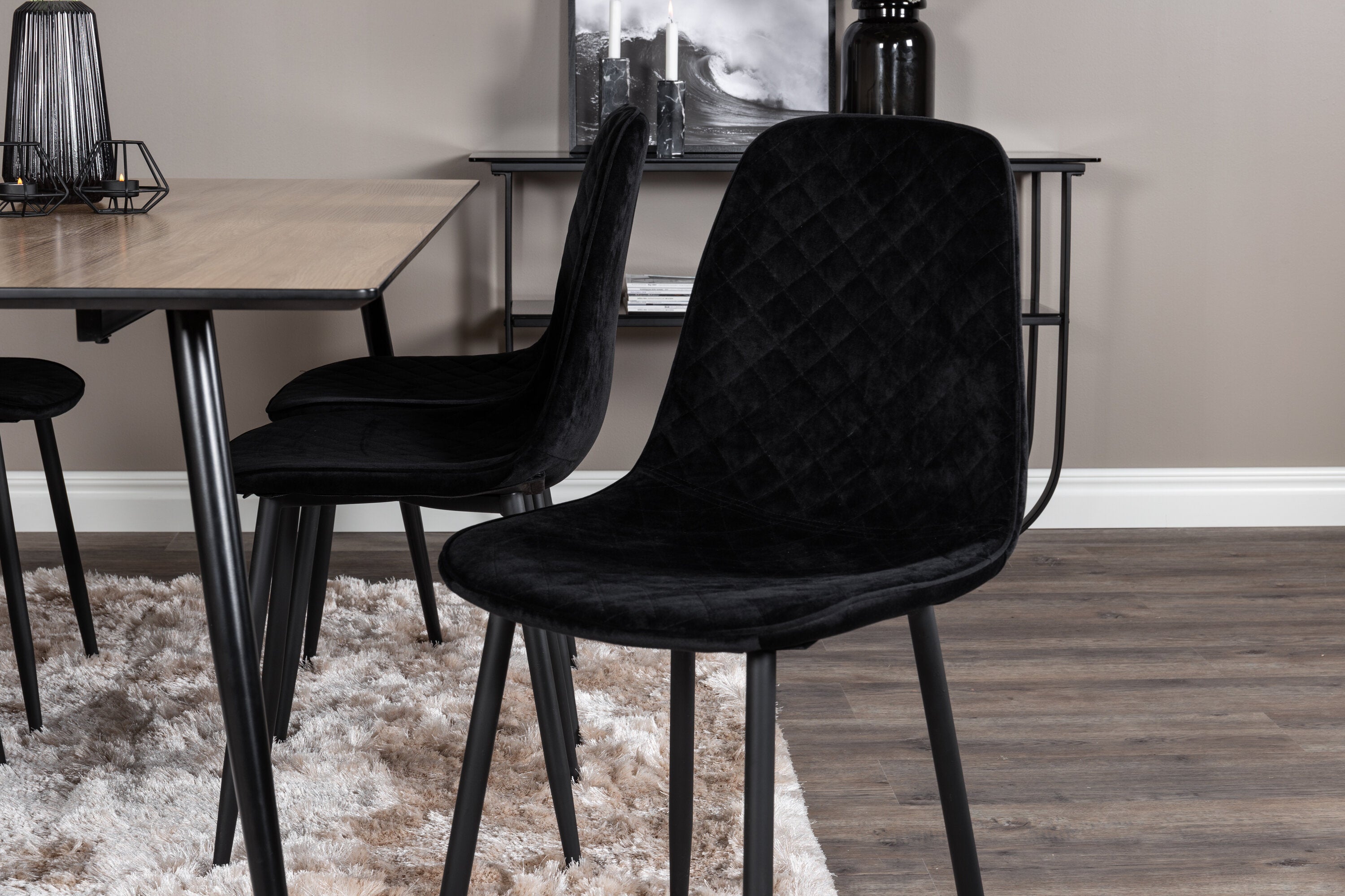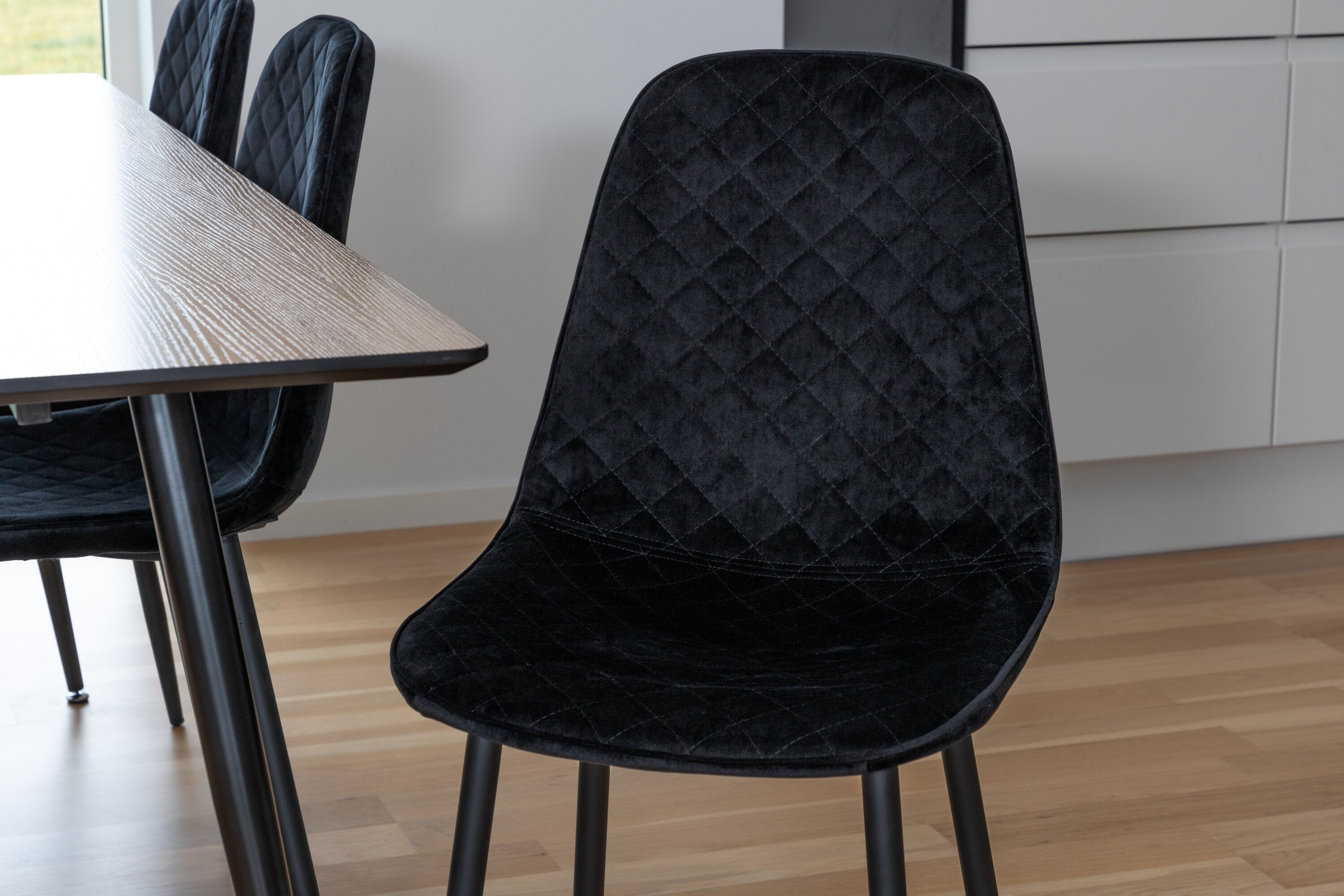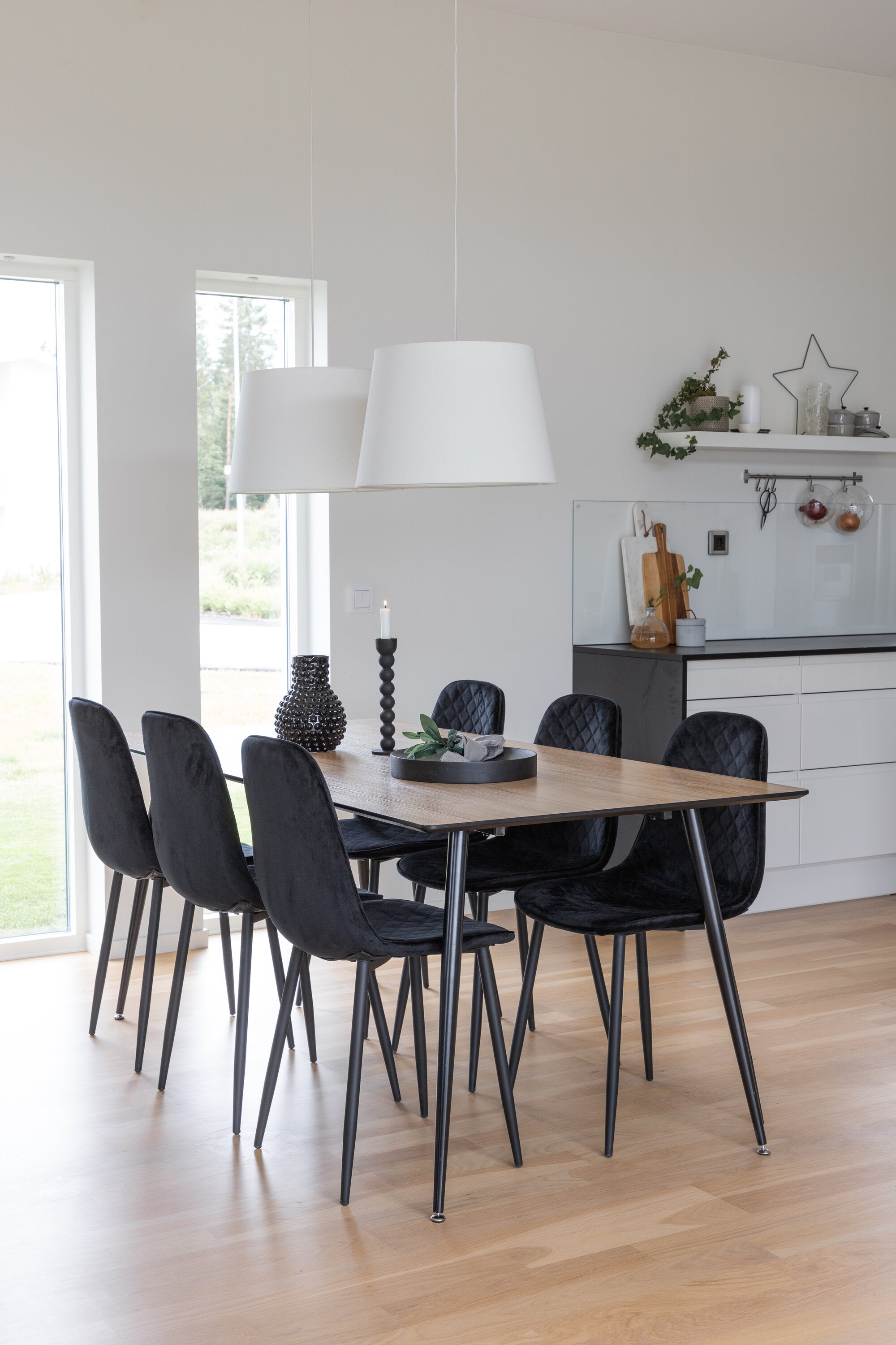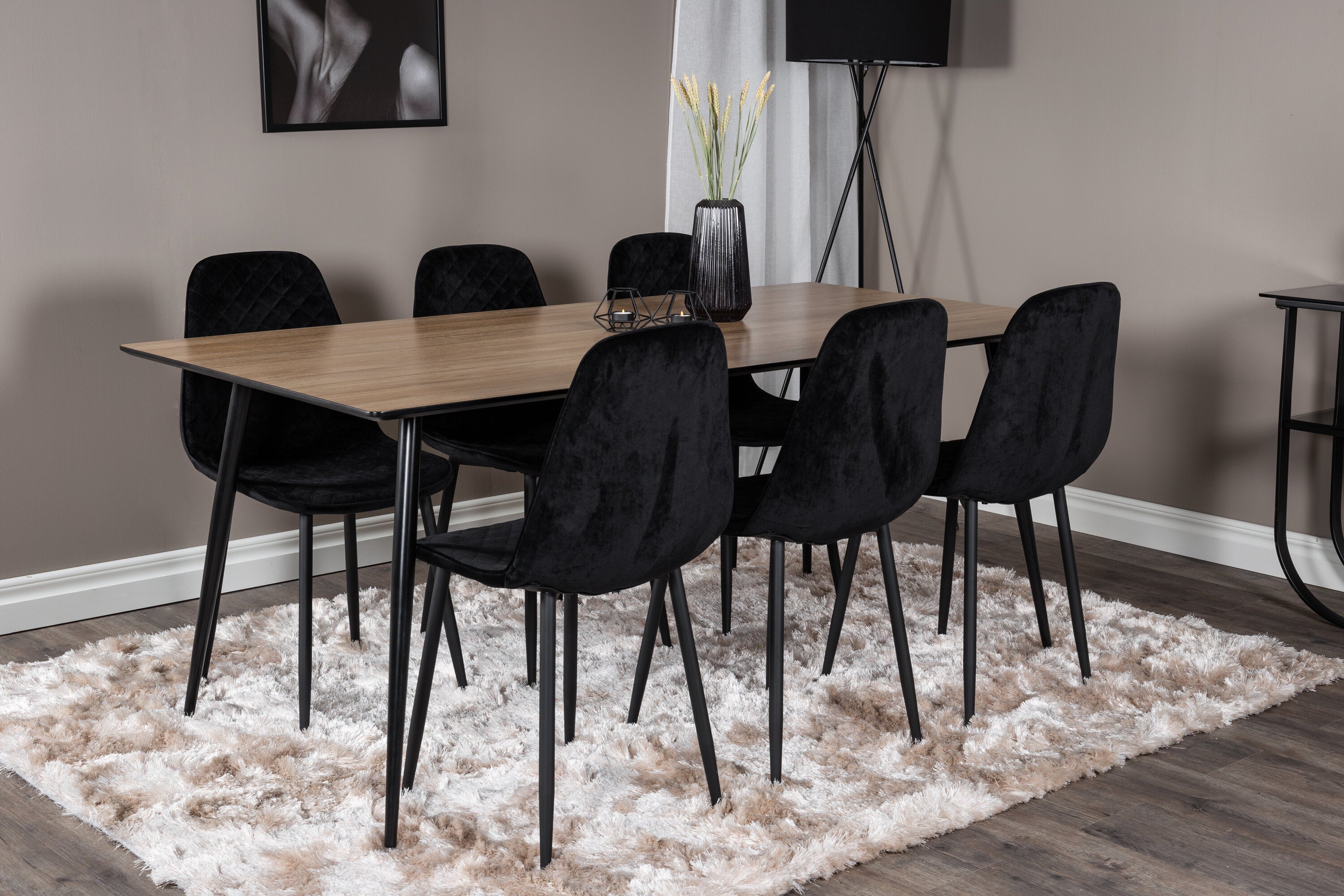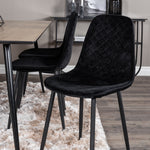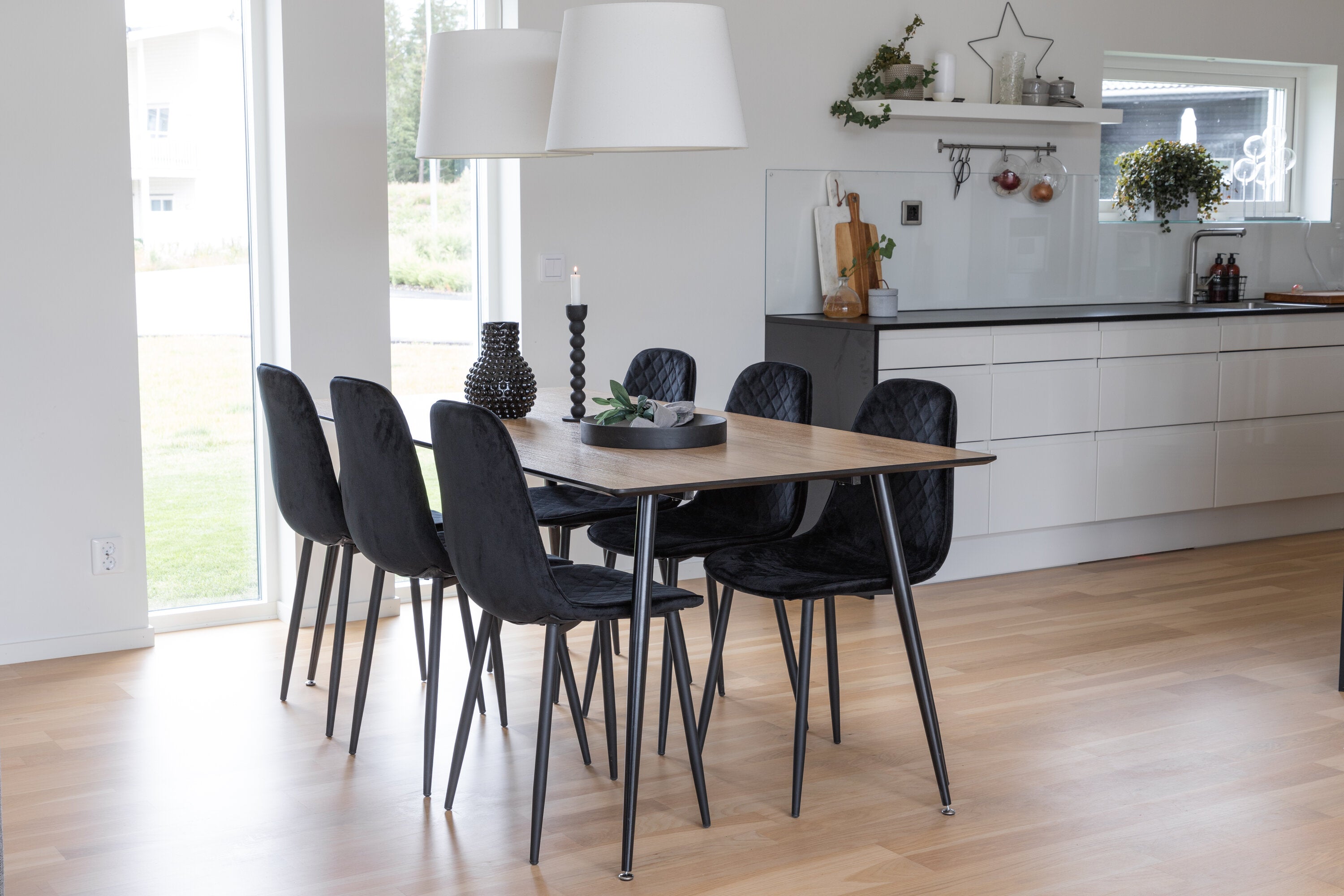 Pompézní černé jídelní židle v sametu ze série Polar spolu s filtry jídelního stolu ve vzhledu dřeva. Pěkné a praktické - každý den i na párty!