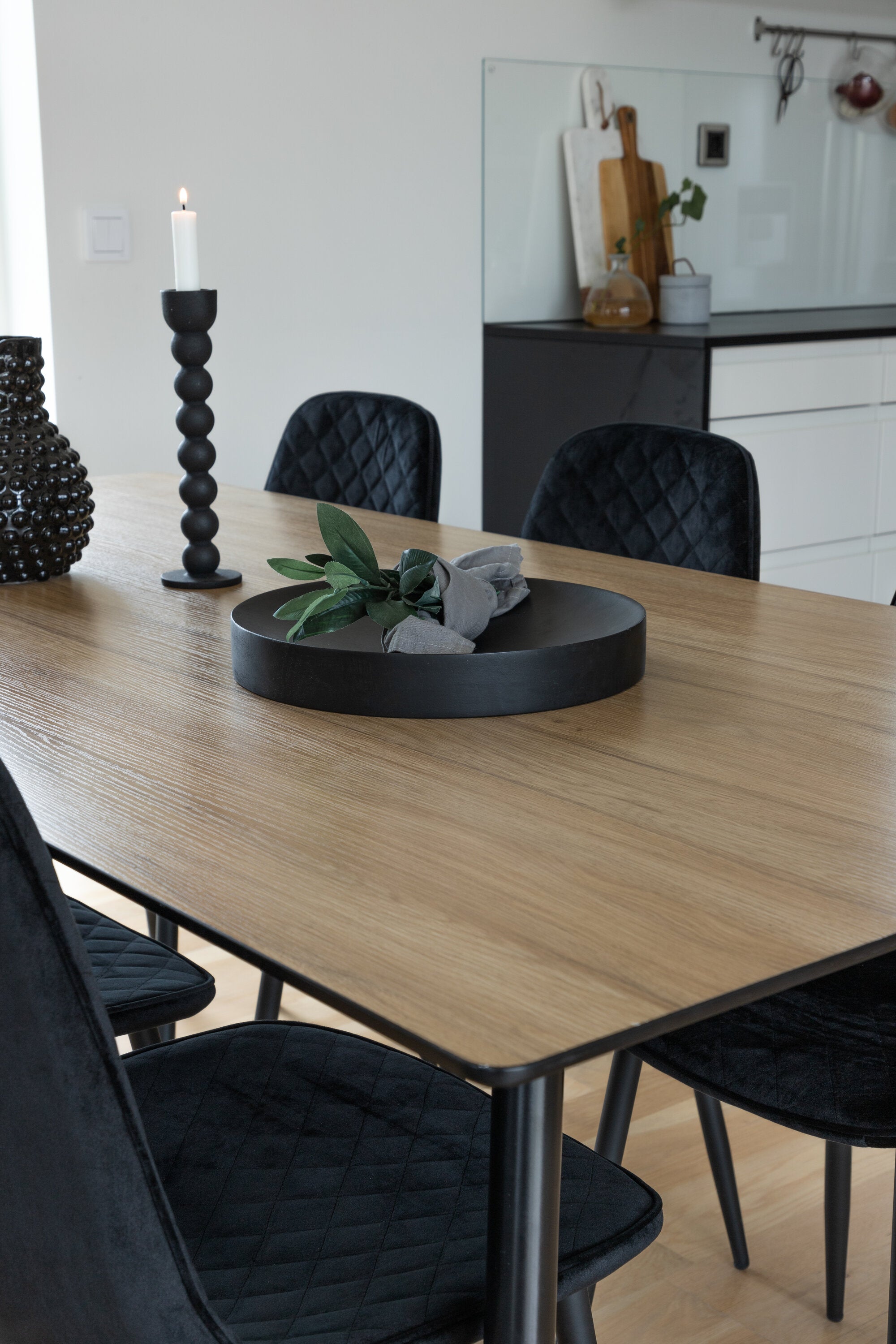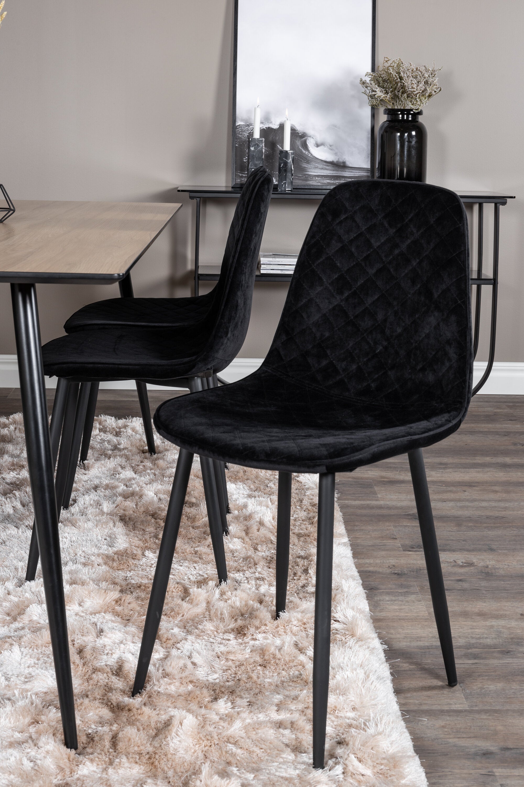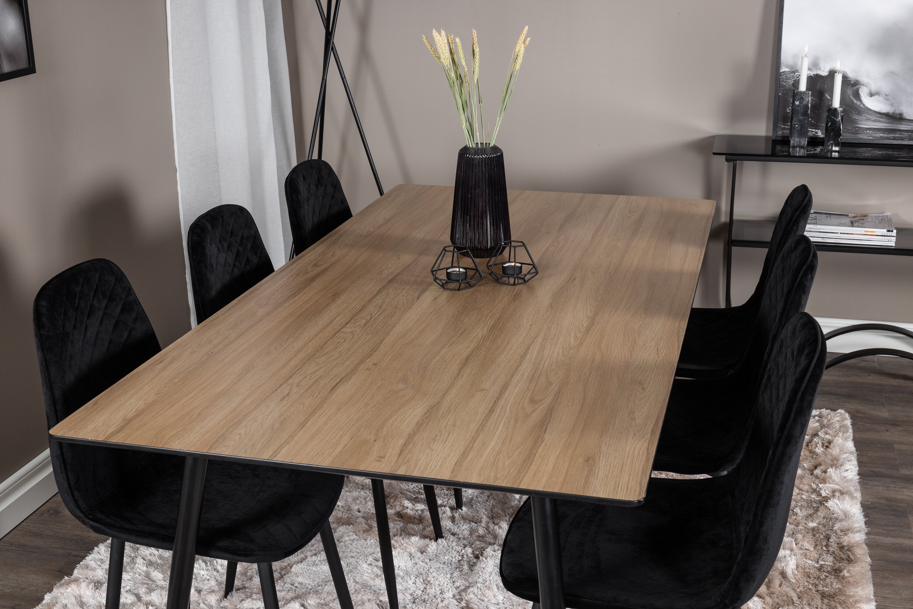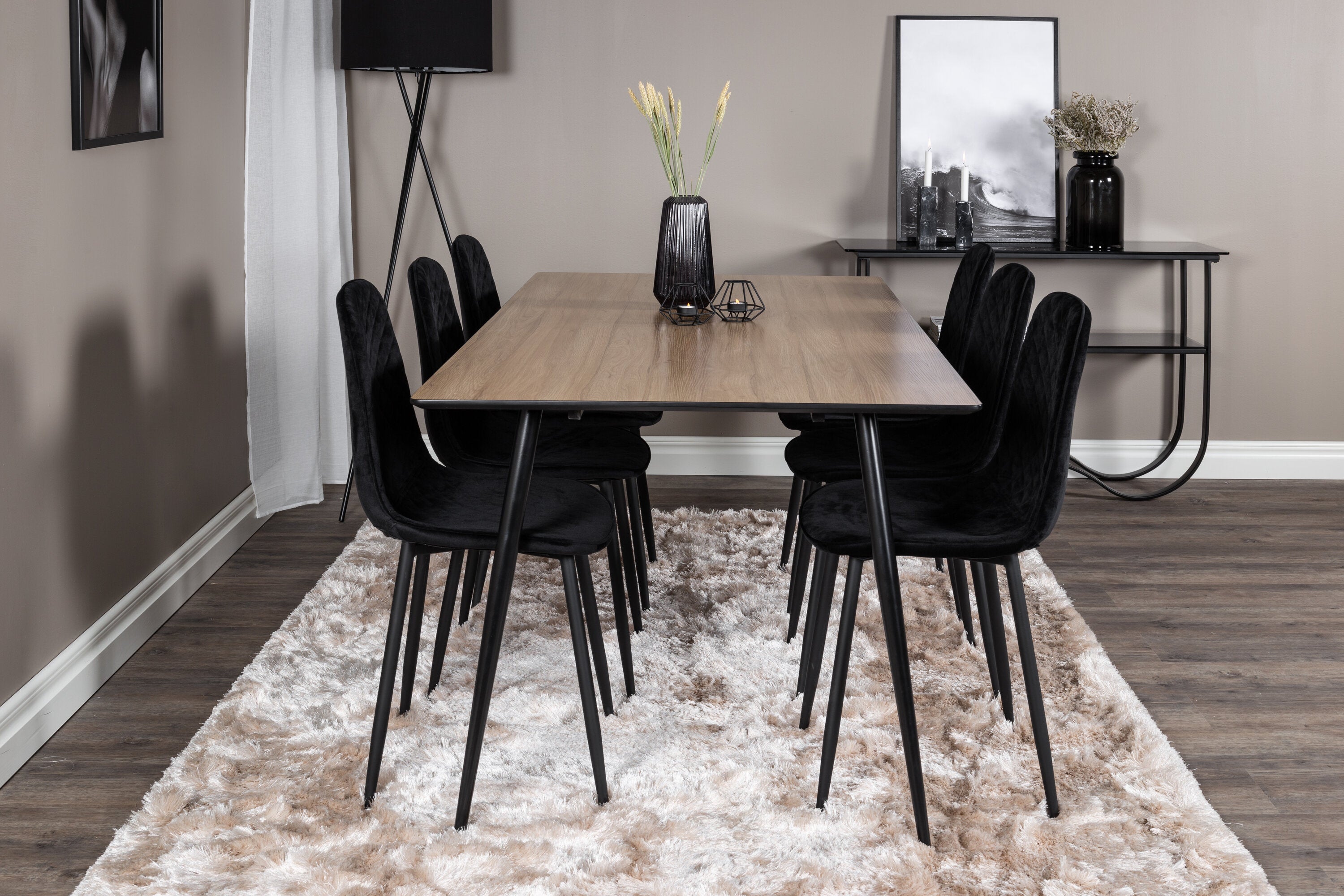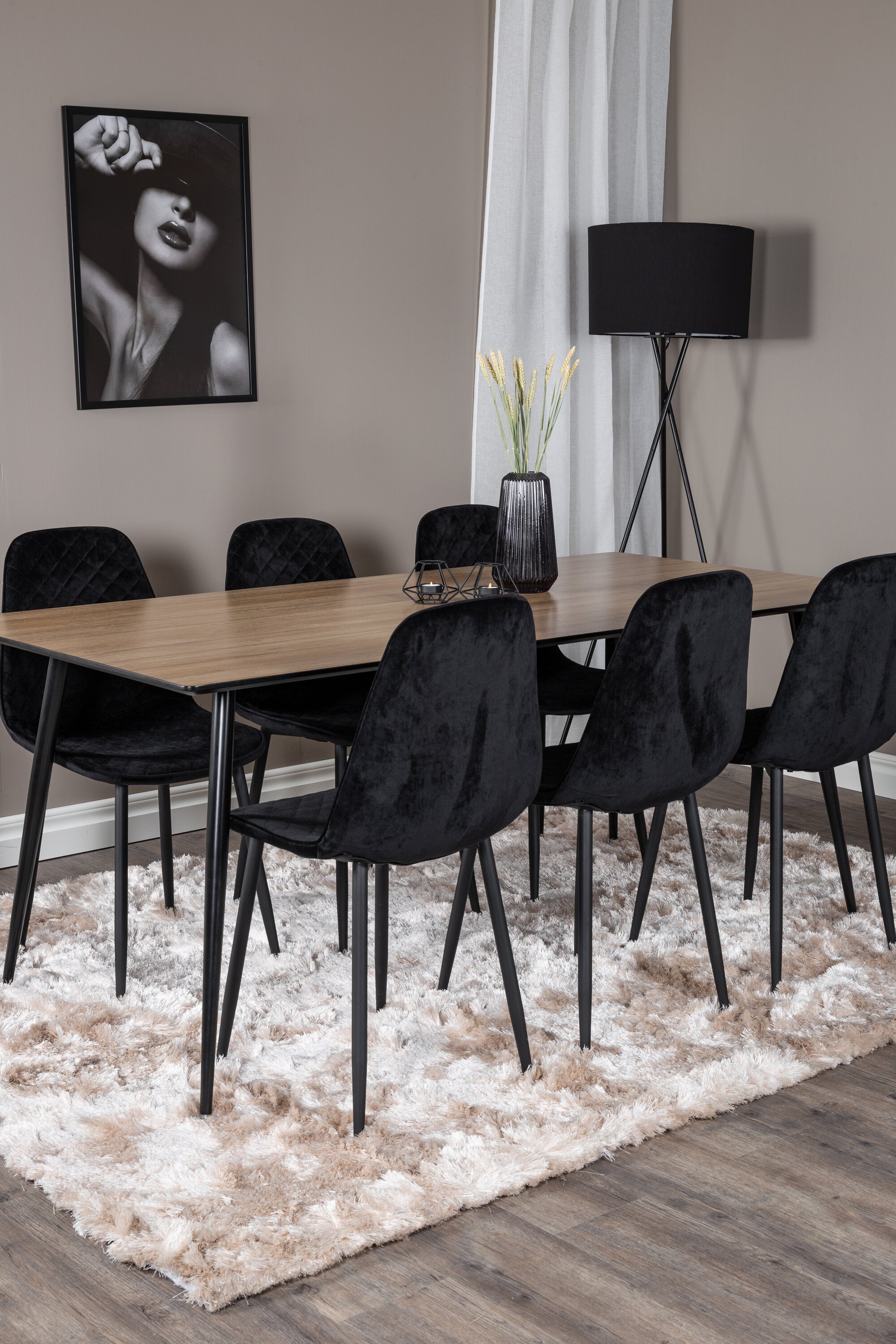 Pompézní černé jídelní židle v sametu ze série Polar spolu s filtry jídelního stolu ve vzhledu dřeva. Pěkné a praktické - každý den i na párty!