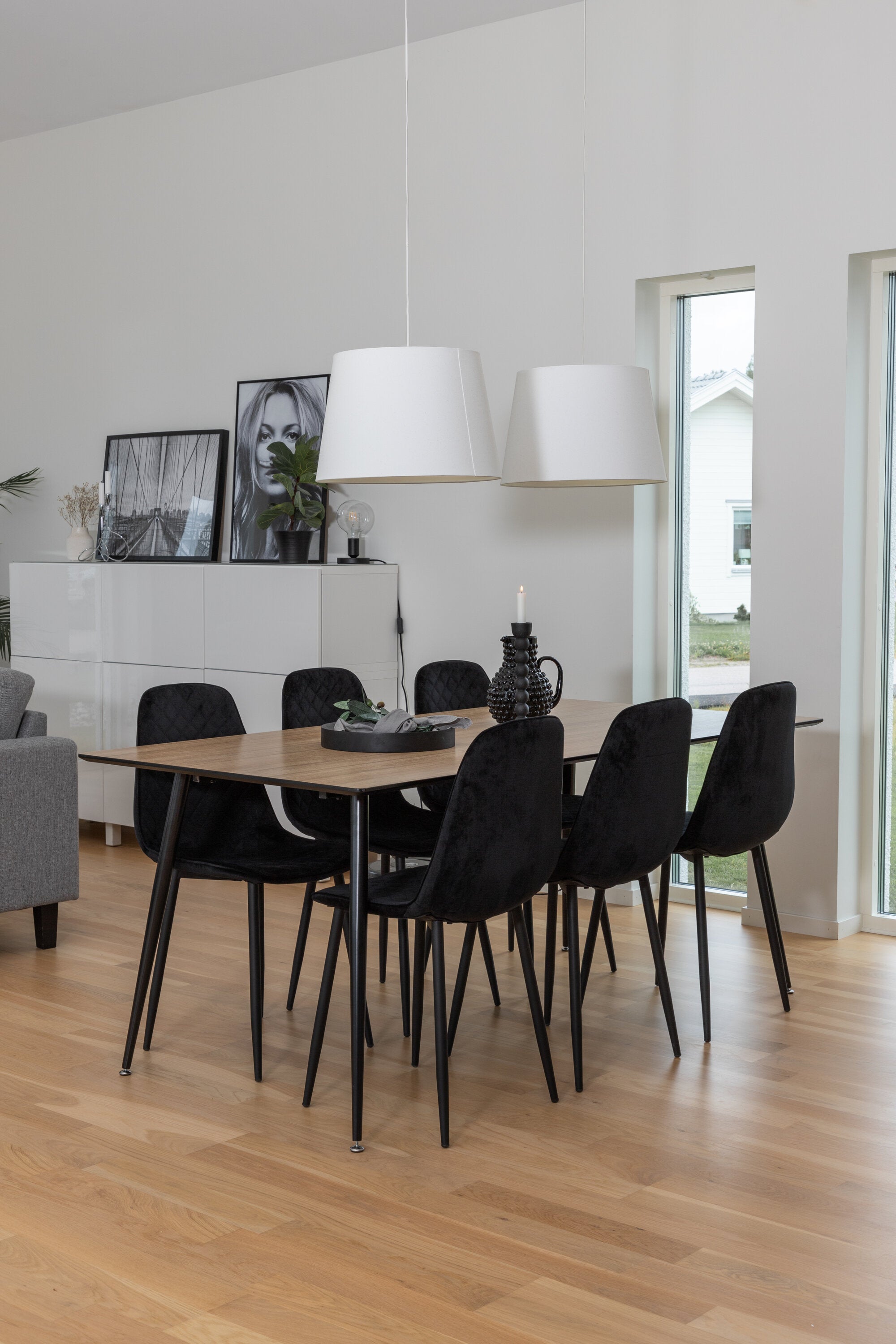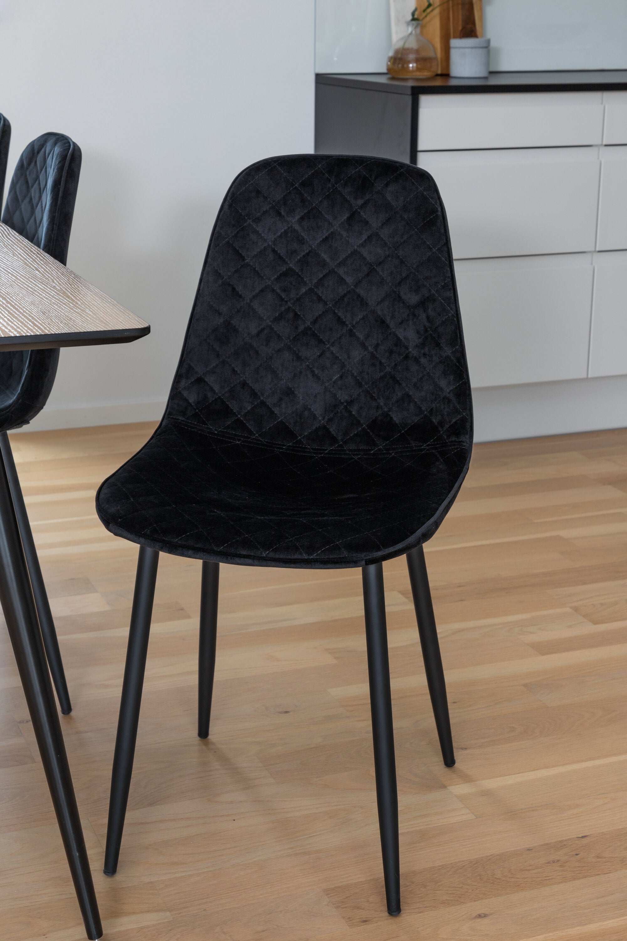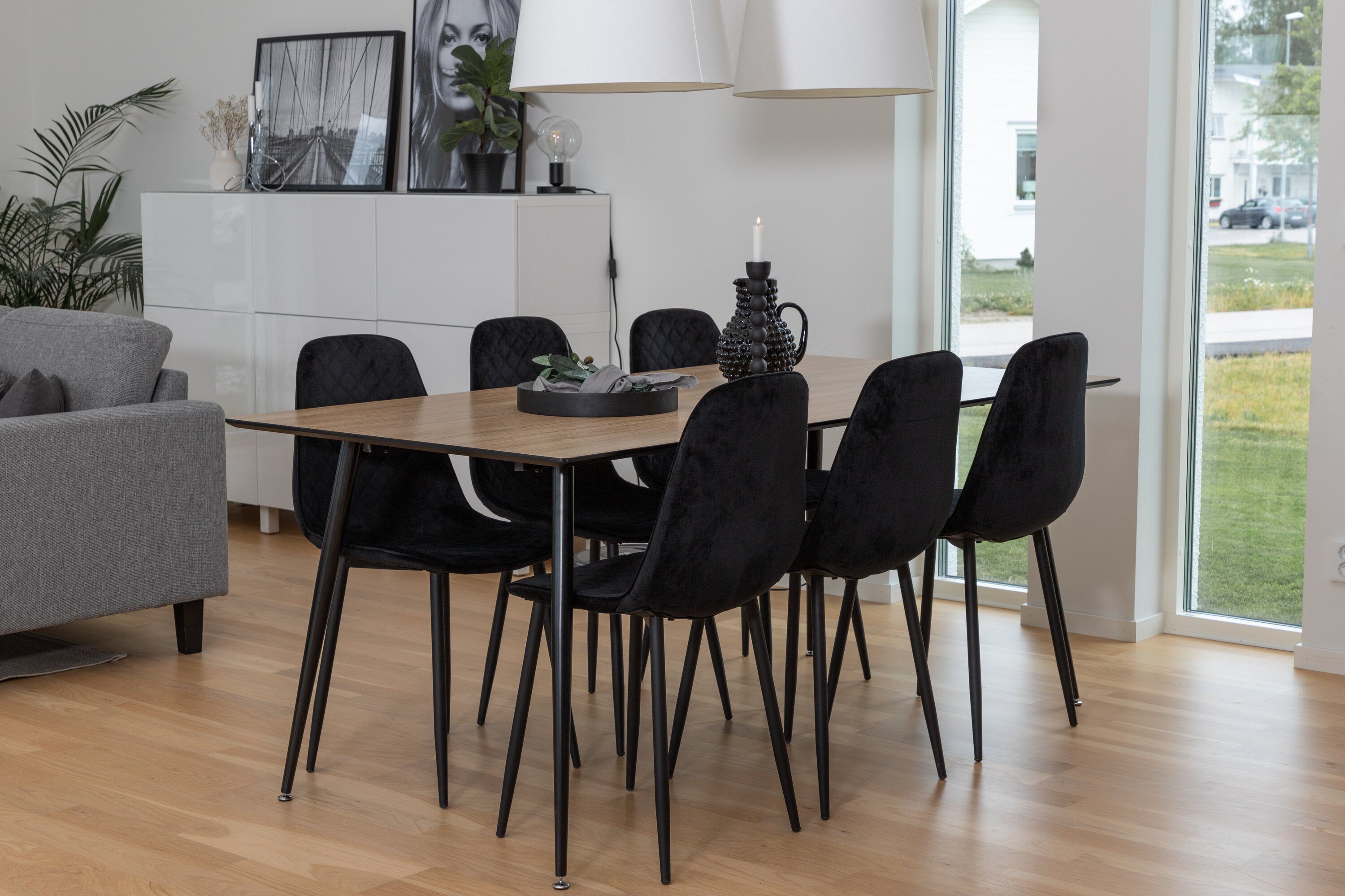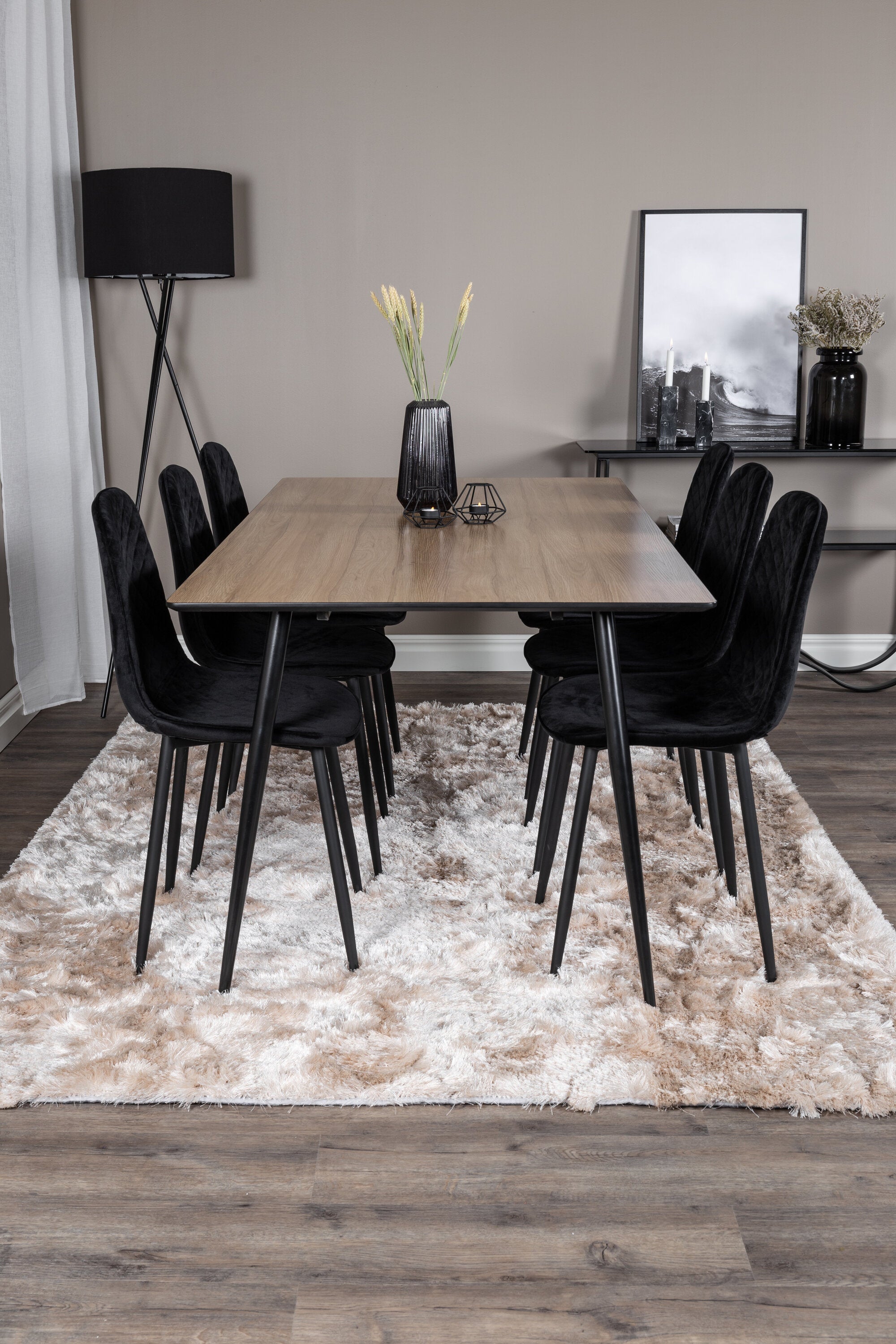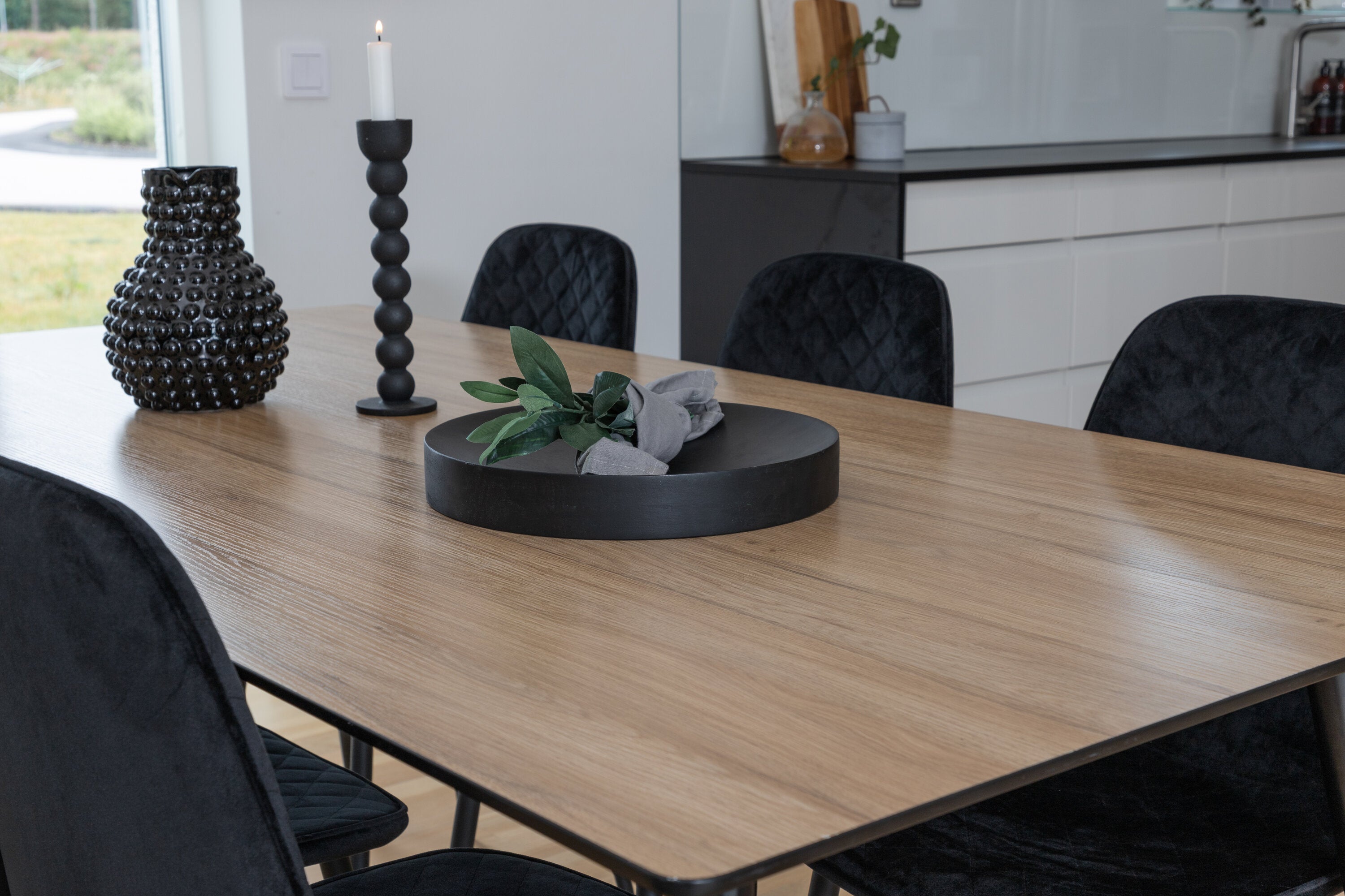 Pompézní černé jídelní židle v sametu ze série Polar spolu s filtry jídelního stolu ve vzhledu dřeva. Pěkné a praktické - každý den i na párty!