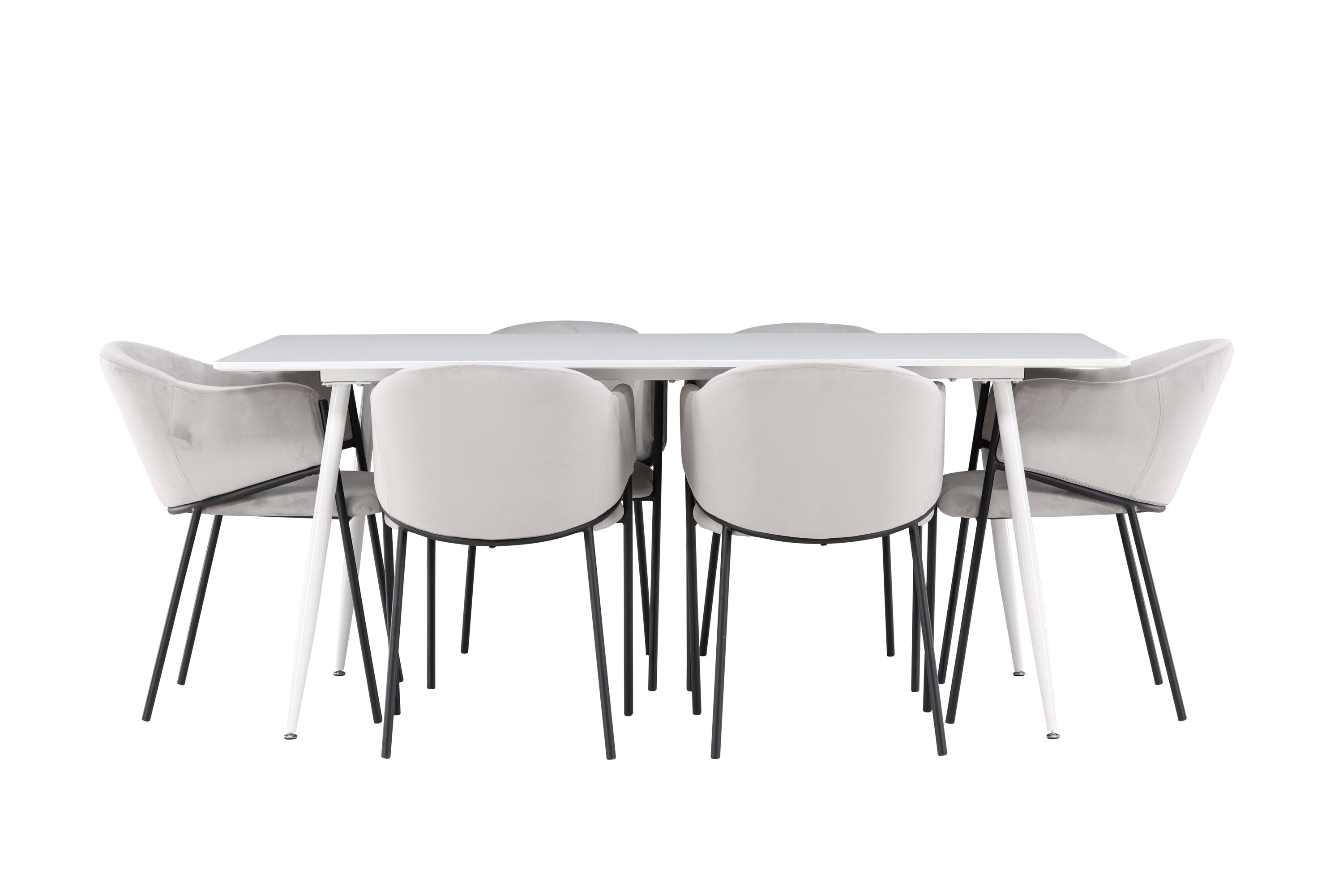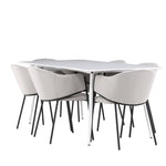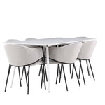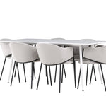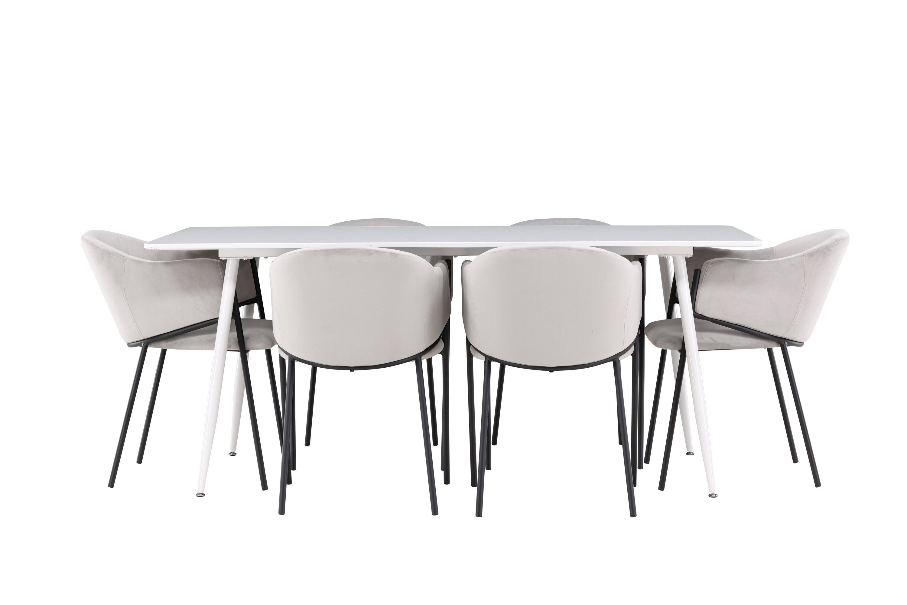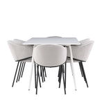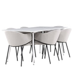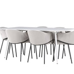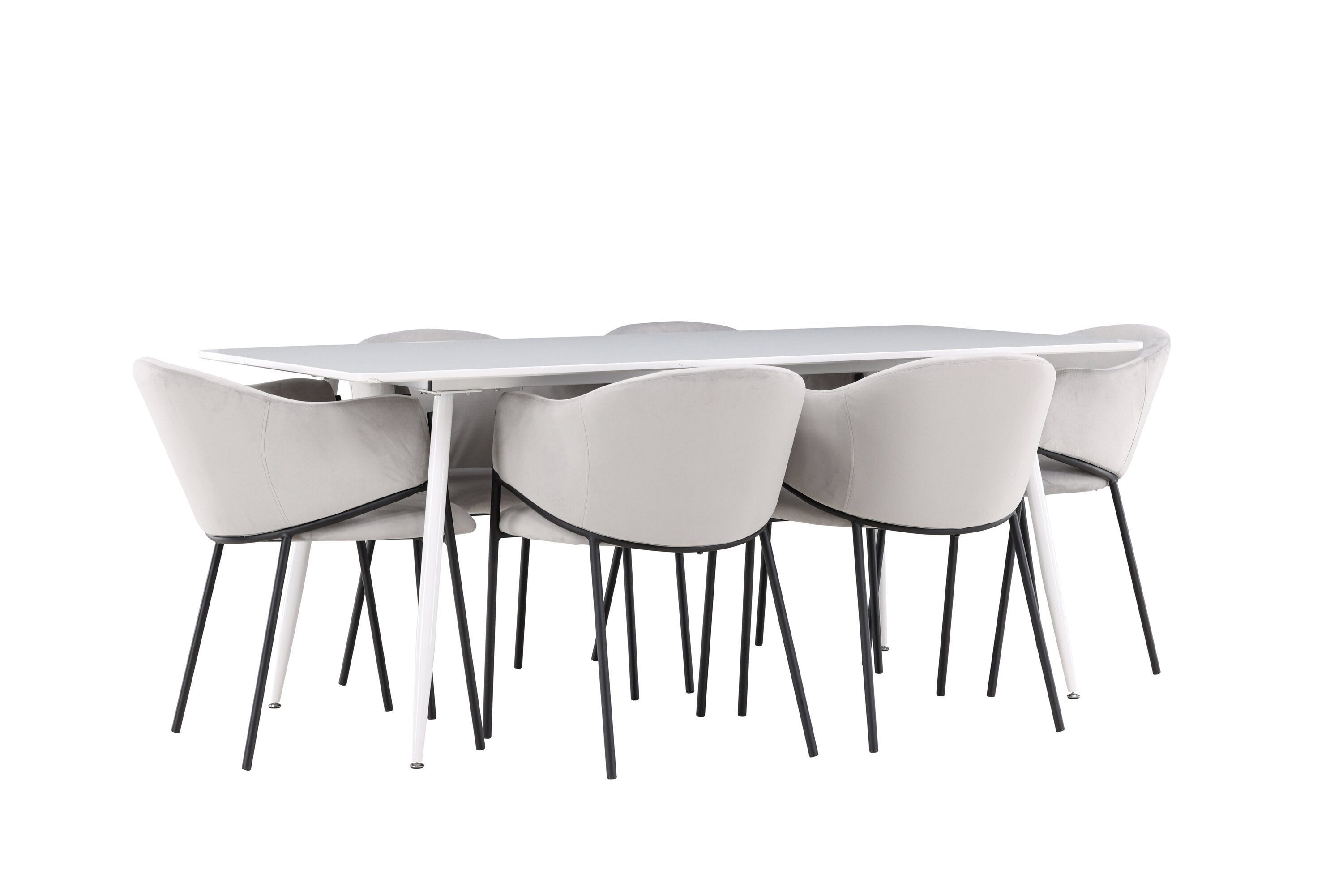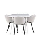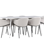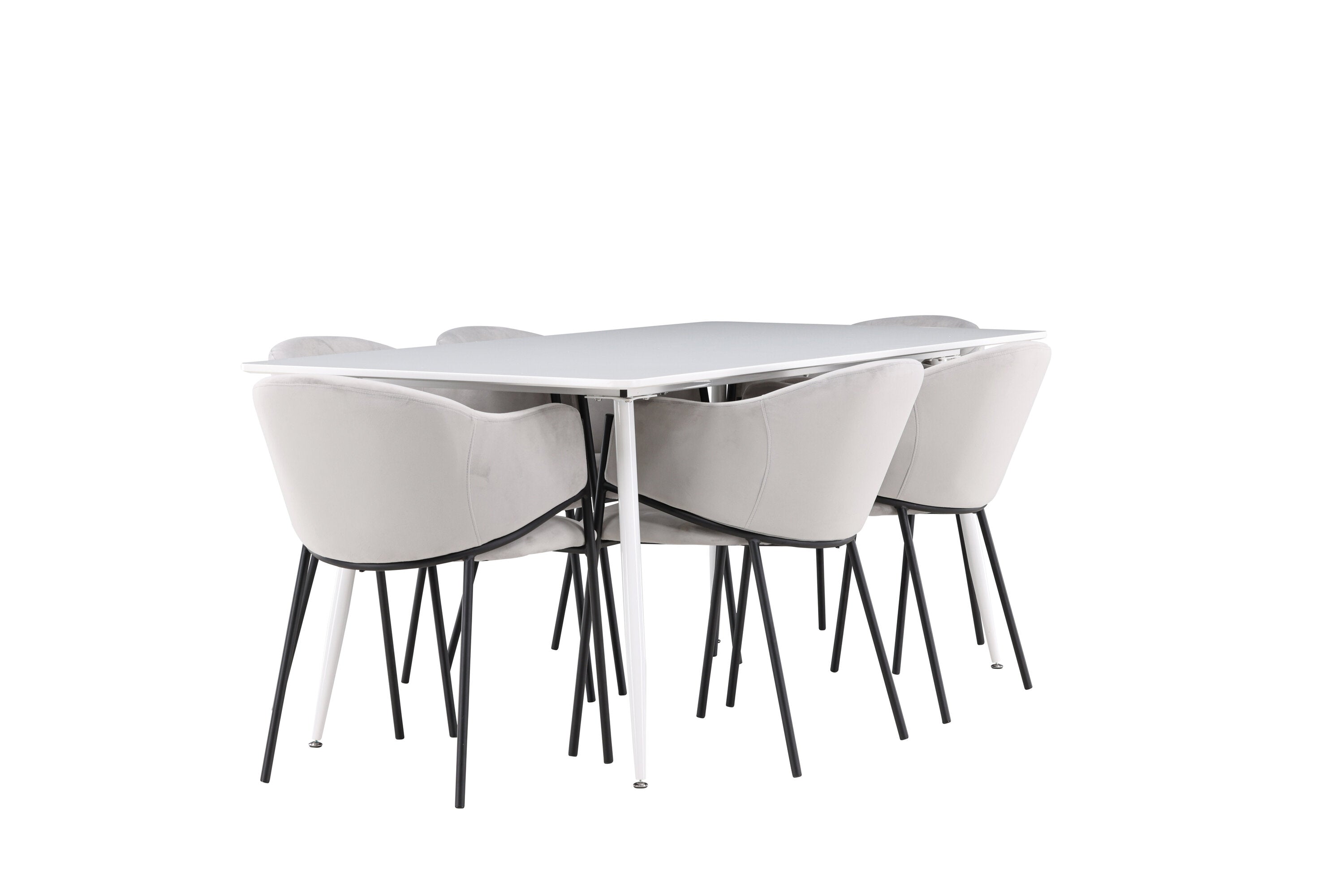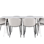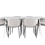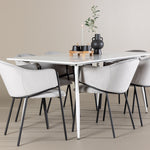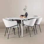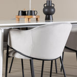 Jídelní židle Evelina má nostalgický výraz, je stylová i pohodlná a tvoří luxusní ústřední bod kolem vašeho jídelního stolu! Židle má celočalouněný sedák se zaobleným opěradlem ze světle šedé sametové látky a ozdobným, minimalistickým rámem z černé oceli. Trendový design zaujme a je dokonale v souladu s nejnovějšími trendy. Pohodlně se usaďte a vychutnejte si jídlo v těchto elegantních jídelních židlích. Objevte jídelní stůl Silar - elegantní a všestranný kus nábytku pro přátele a rodinu. S velkorysými rozměry 180x90 cm nabízí Silar dostatek prostoru pro přivítání vašich blízkých. Bílý stůl dodává místnosti lehký a vzdušný pocit a vytváří příjemnou atmosféru pro jídlo a setkání. Jídelní stůl Silar je nejen praktický, ale i trendy a skvěle se hodí do moderních interiérů. Vytvářejte vzpomínky a sdílejte příjemné chvíle s přáteli a rodinou v této jídelní sadě. Ať už se jedná o každodenní jídlo nebo slavnostní příležitosti, tato jídelní souprava se stane ústředním bodem vašeho domova, kde vzkvétá komunita a radost.