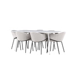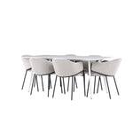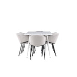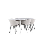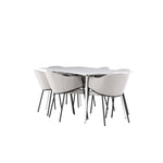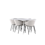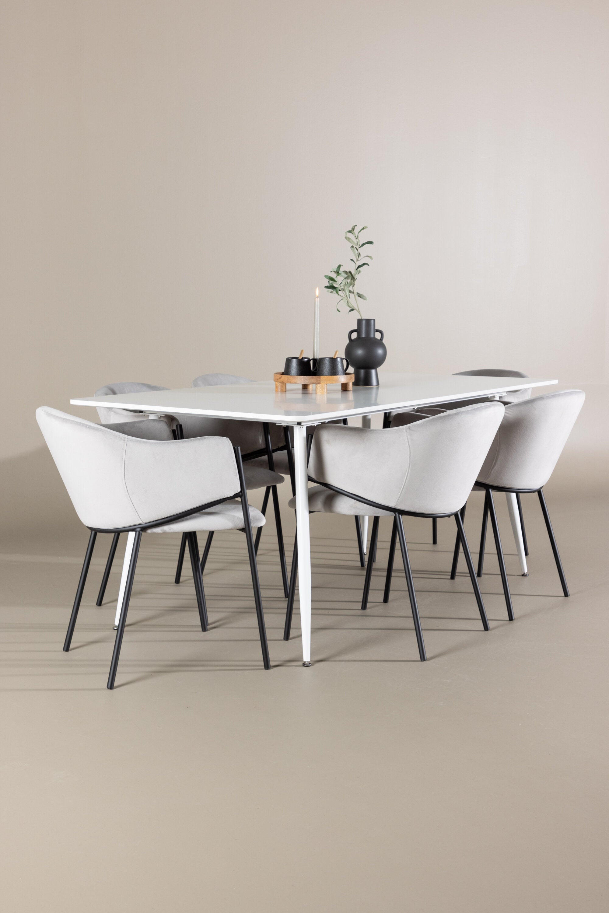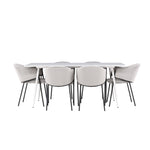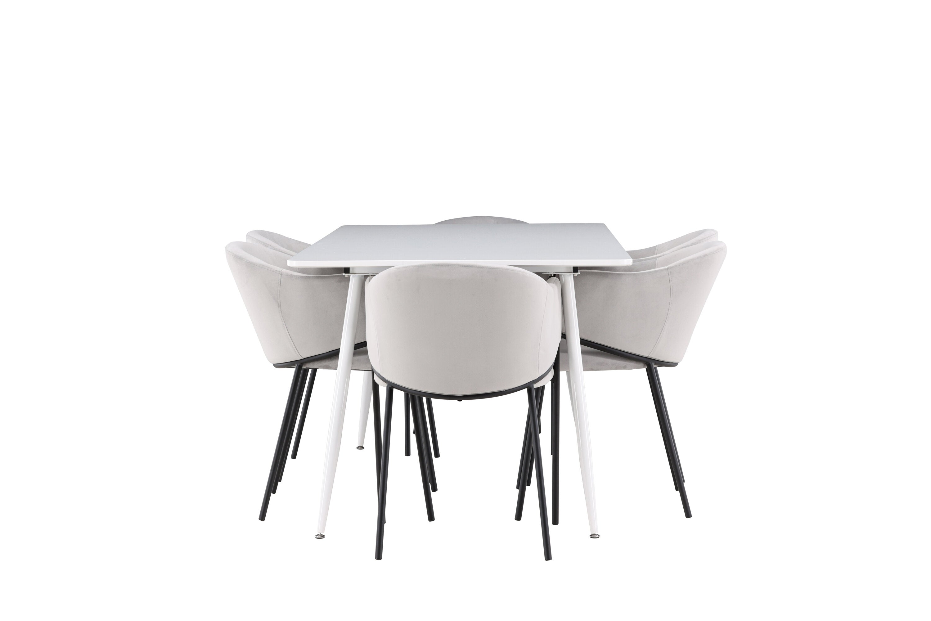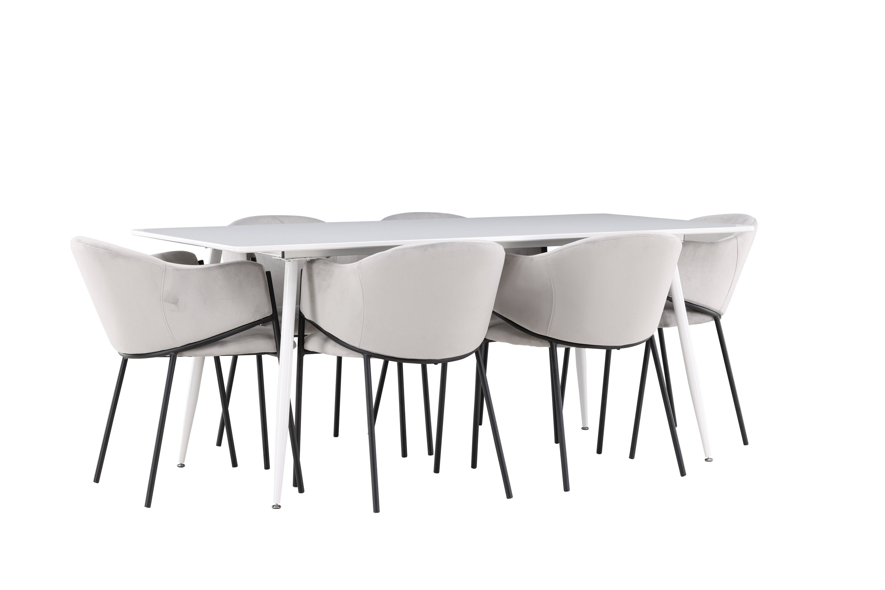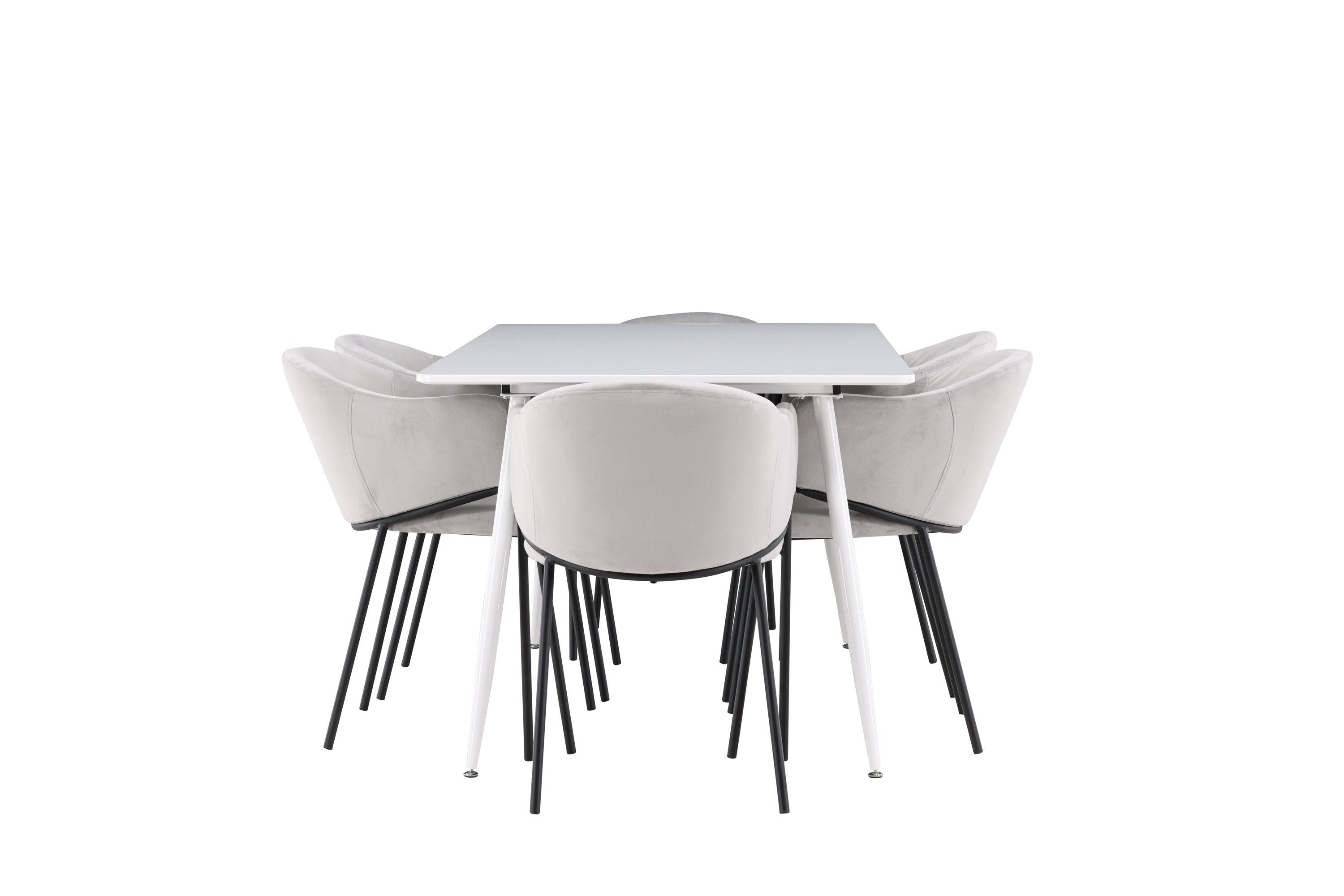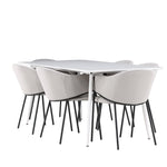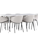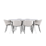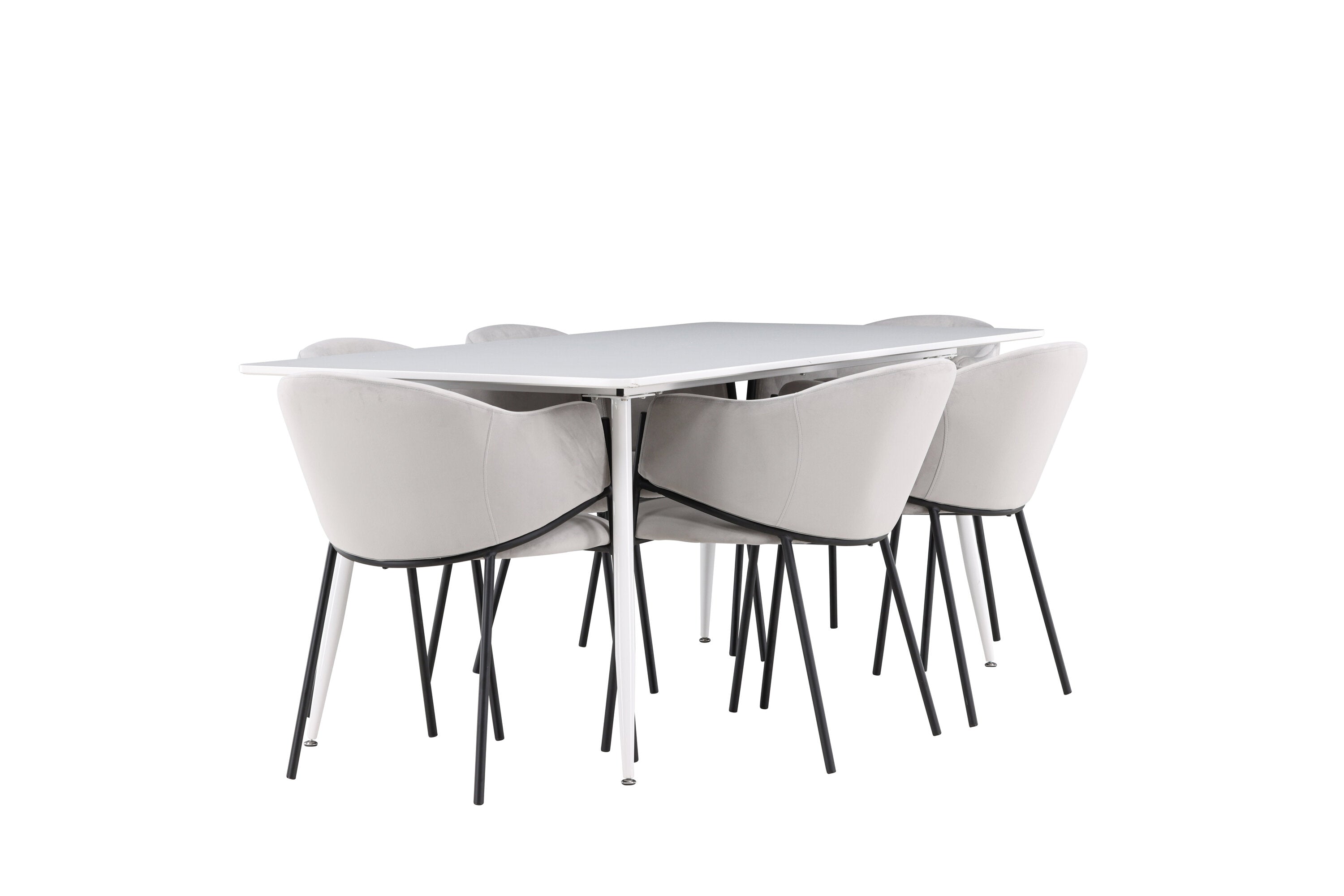 Jídelní židle Evelina má nostalgický výraz, je stylová i pohodlná a tvoří luxusní ústřední bod kolem vašeho jídelního stolu! Židle má celočalouněný sedák se zaobleným opěradlem ze světle šedé sametové látky a ozdobným, minimalistickým rámem z černé oceli. Trendový design zaujme a je dokonale v souladu s nejnovějšími trendy. Pohodlně se usaďte a vychutnejte si jídlo v těchto elegantních jídelních židlích. Objevte jídelní stůl Silar - elegantní a všestranný kus nábytku pro přátele a rodinu. S velkorysými rozměry 180x90 cm nabízí Silar dostatek prostoru pro přivítání vašich blízkých. Bílý stůl dodává místnosti lehký a vzdušný pocit a vytváří příjemnou atmosféru pro jídlo a setkání. Jídelní stůl Silar je nejen praktický, ale i trendy a skvěle se hodí do moderních interiérů. Vytvářejte vzpomínky a sdílejte příjemné chvíle s přáteli a rodinou v této jídelní sadě. Ať už se jedná o každodenní jídlo nebo slavnostní příležitosti, tato jídelní souprava se stane ústředním bodem vašeho domova, kde vzkvétá komunita a radost.