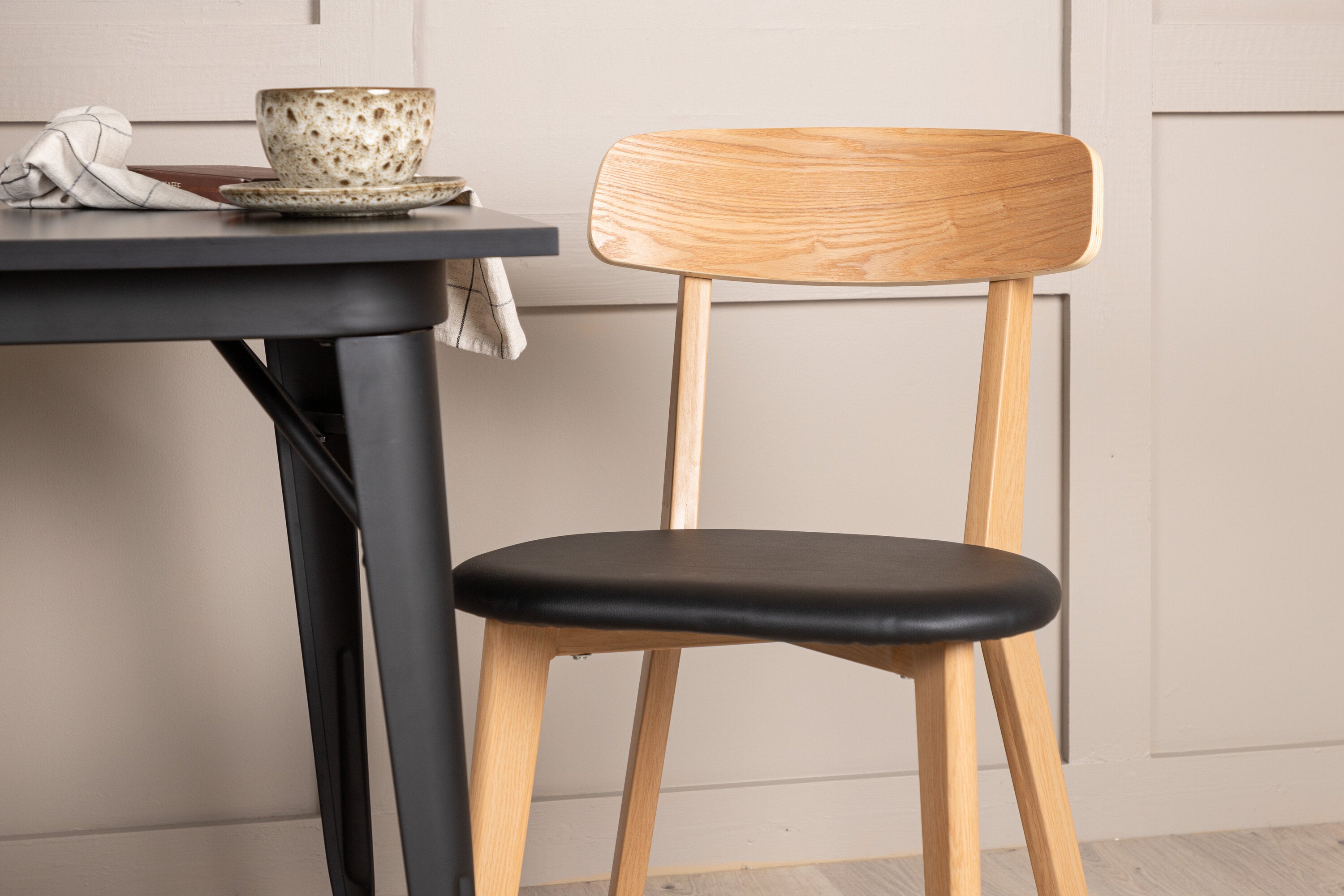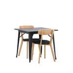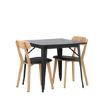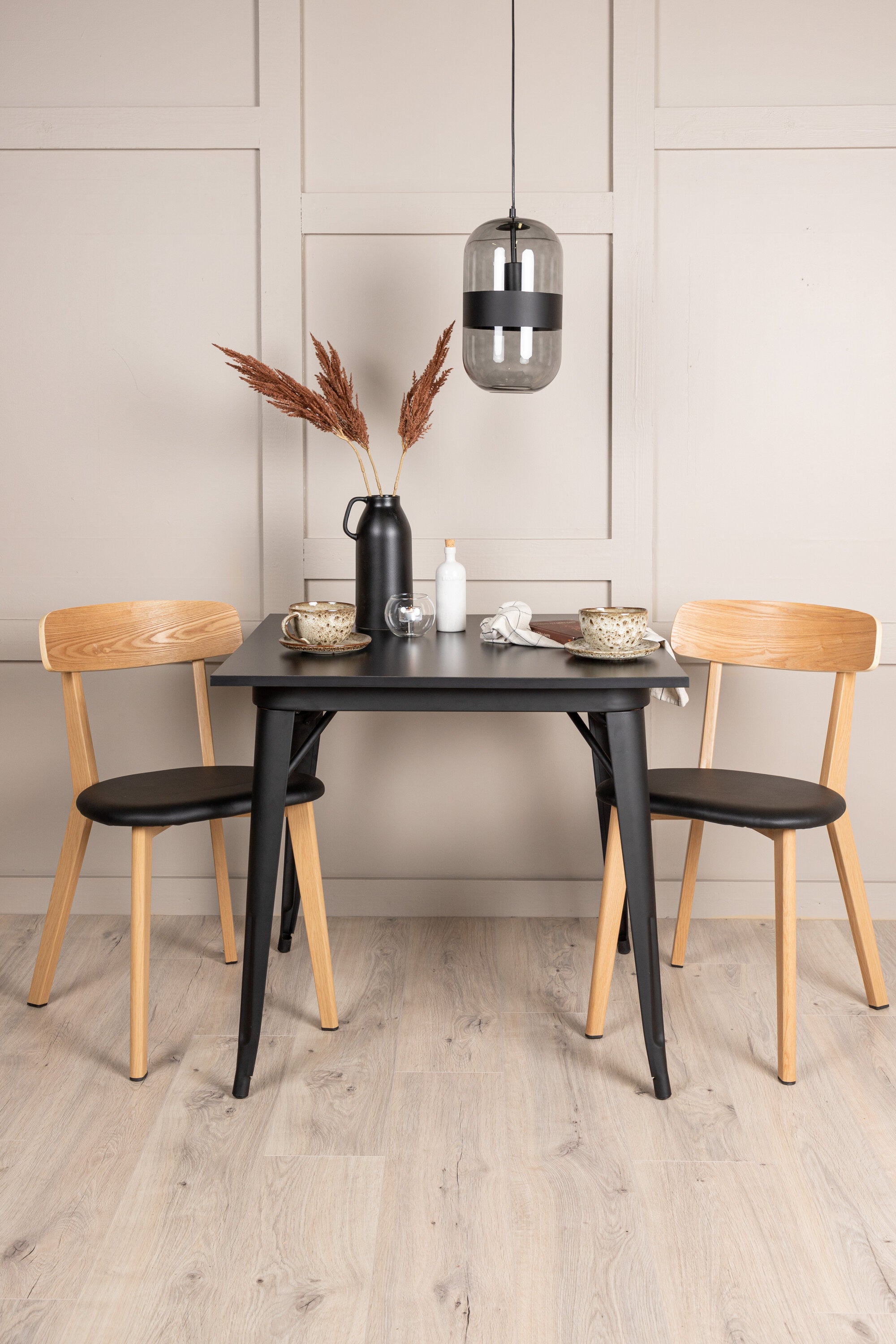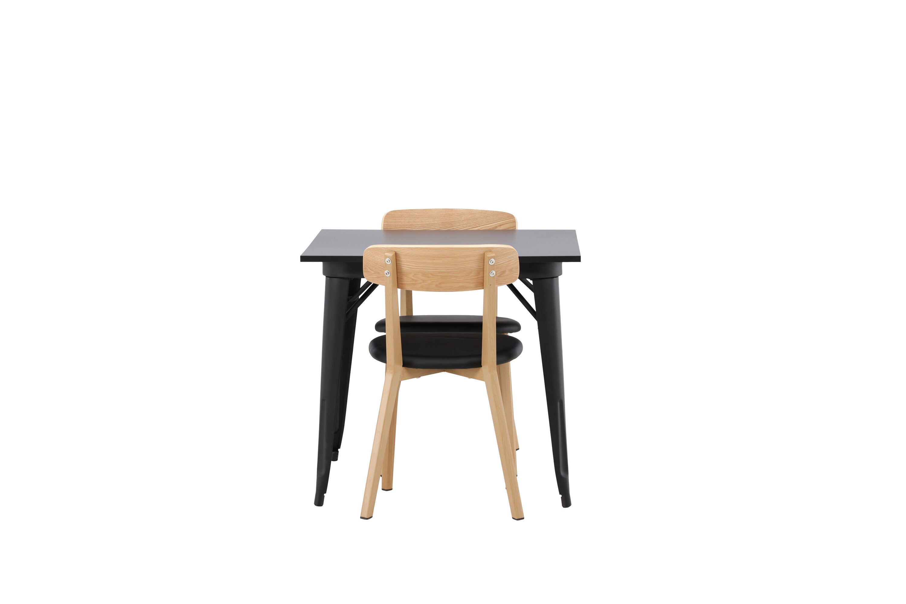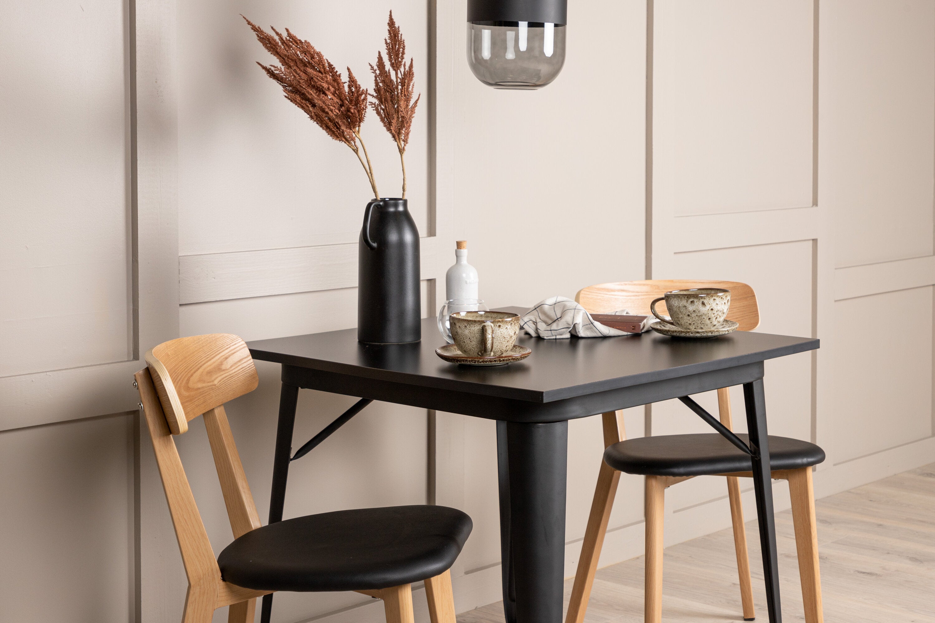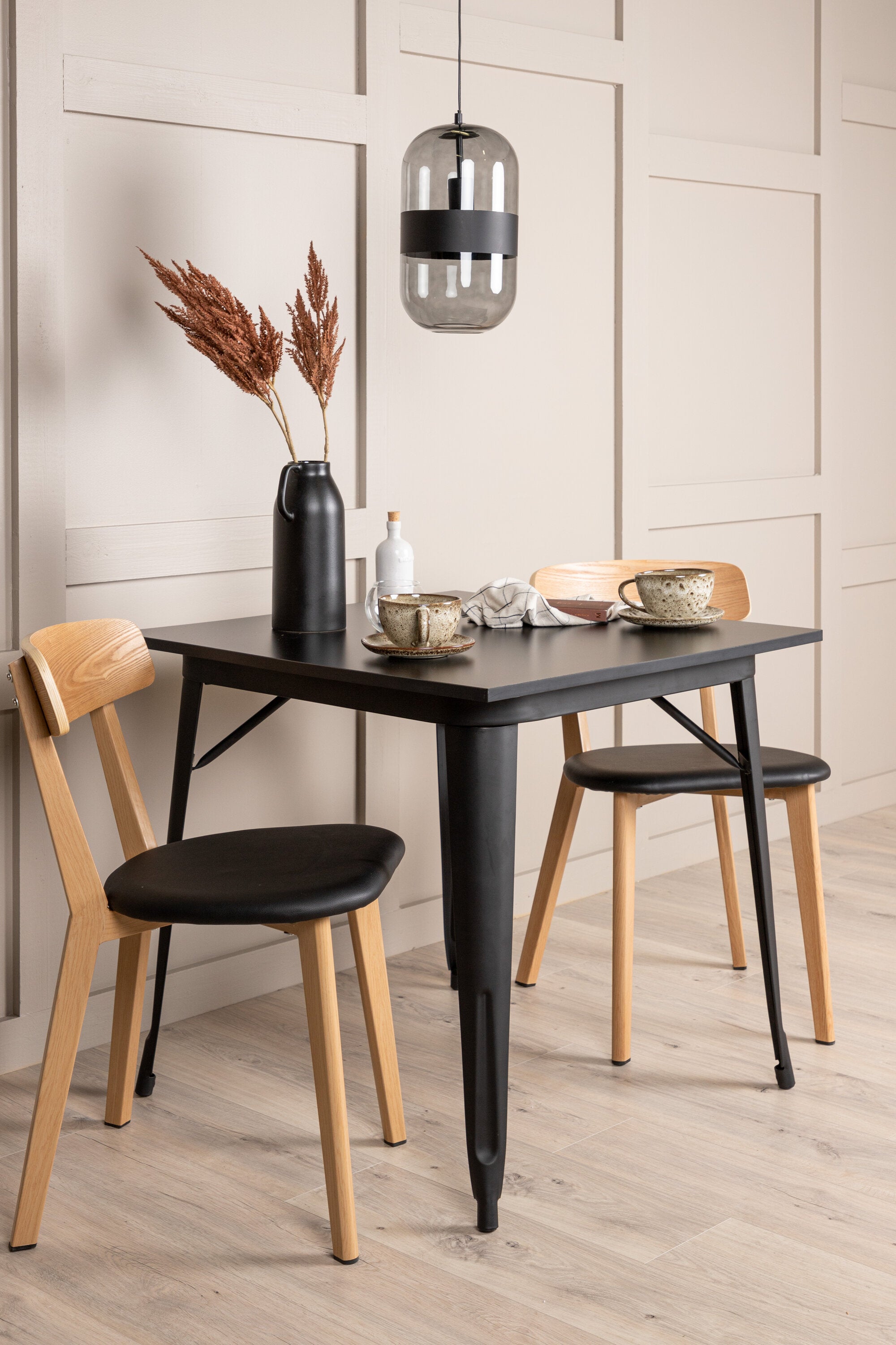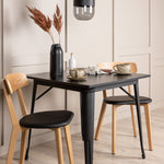 Zařiďte svůj domov chytře a stylově! Tento jídelní stůl ze série Tempe má klasický hranatý design a nadčasovou černou barvu. Deska stolu je z černé MDF a nohy stolu z černého kovu. Zde v dokonalé kombinaci s našimi vkusnými jídelními židlemi ze série Sanjos. Židle patří do kolekce Venture Home a má krásný design v barvách černá a přírodní dřevo. Měkké sedadlo je čalouněno pěnou pro větší pohodlí a má PU-kůži v černé barvě. Záda a nohy jsou ze světlého dřeva a působí dojmem klasického designu. Pohodlně se usaďte!