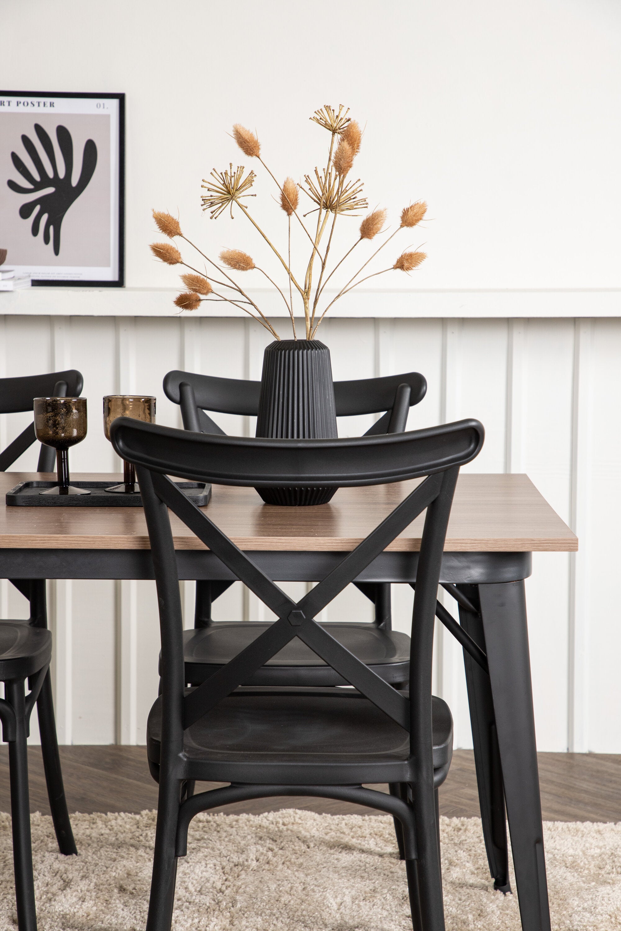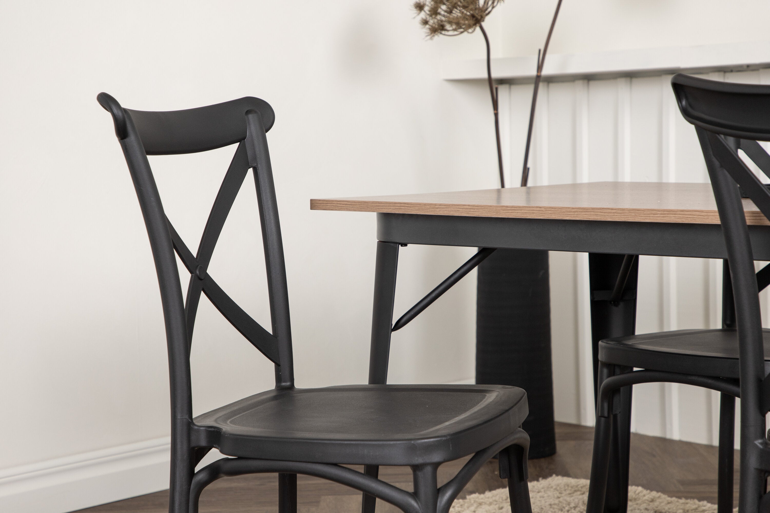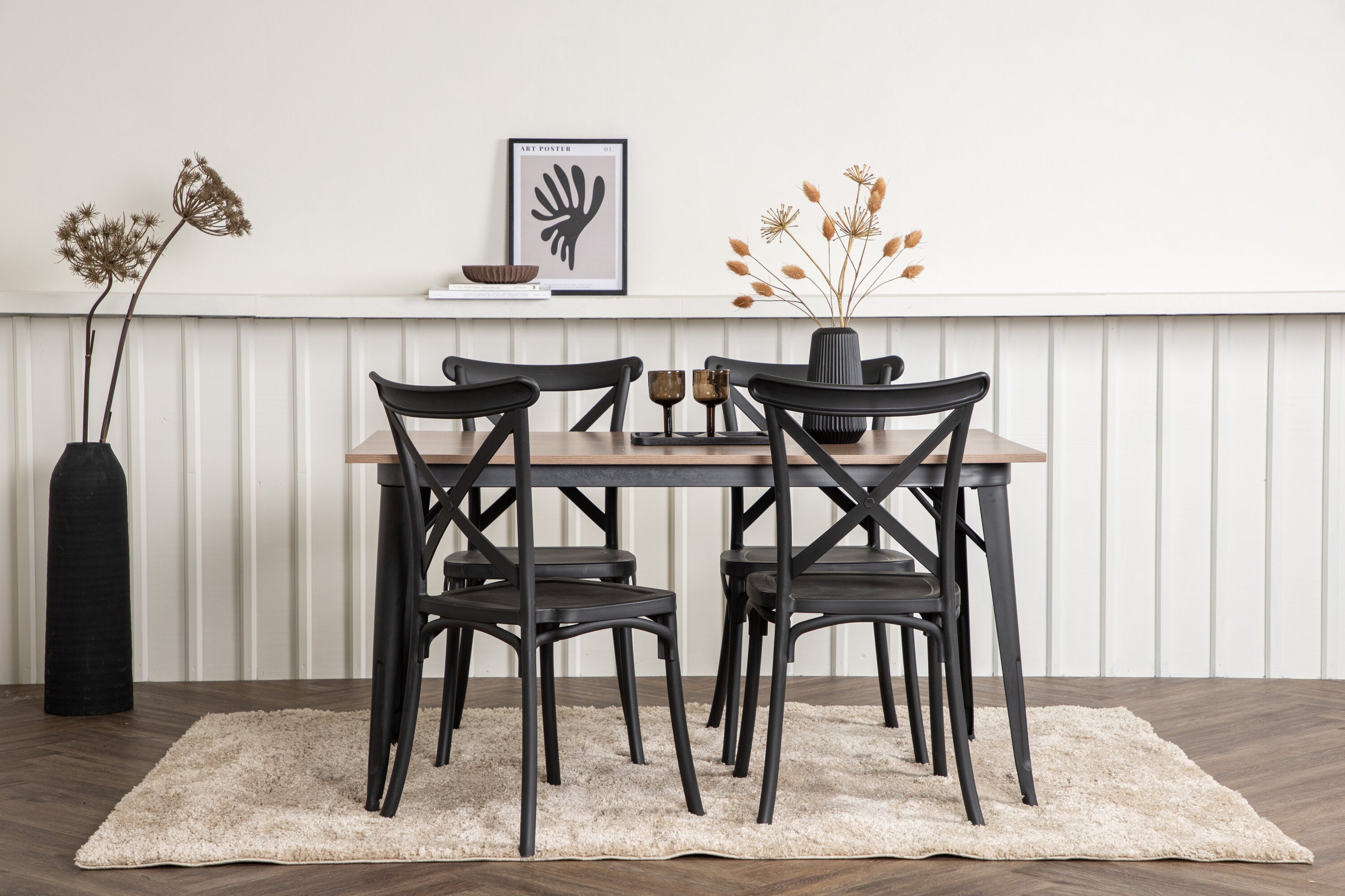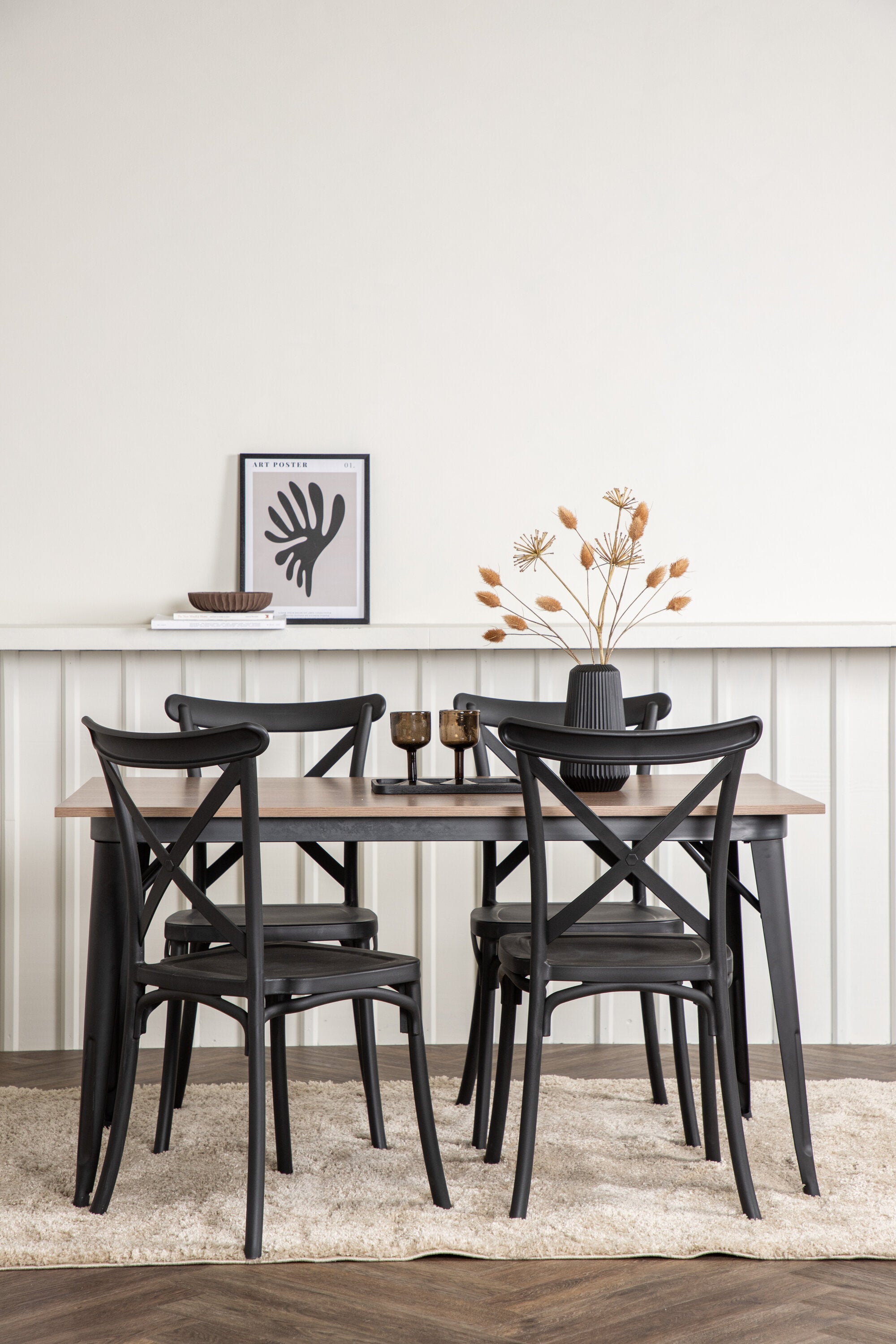 Jídelní skupina, která kombinuje klasický design a moderní formy! Jídelní stůl ze série Tempe patří do kolekce Venture Home a má poutavý, skandinávský design. Vyrobeno ze čtvercové desky stolu z černé MDF a nohou stolu z černého kovu. Zde společně s jídelními židlemi ze série Crosett. Židle mají nostalgický design s překříženým opěradlem a rovnými liniemi, důsledně vyrobeny z černého plastu. Zde získáte stylovou jídelní skupinu, kterou si vybavíte svůj domov!