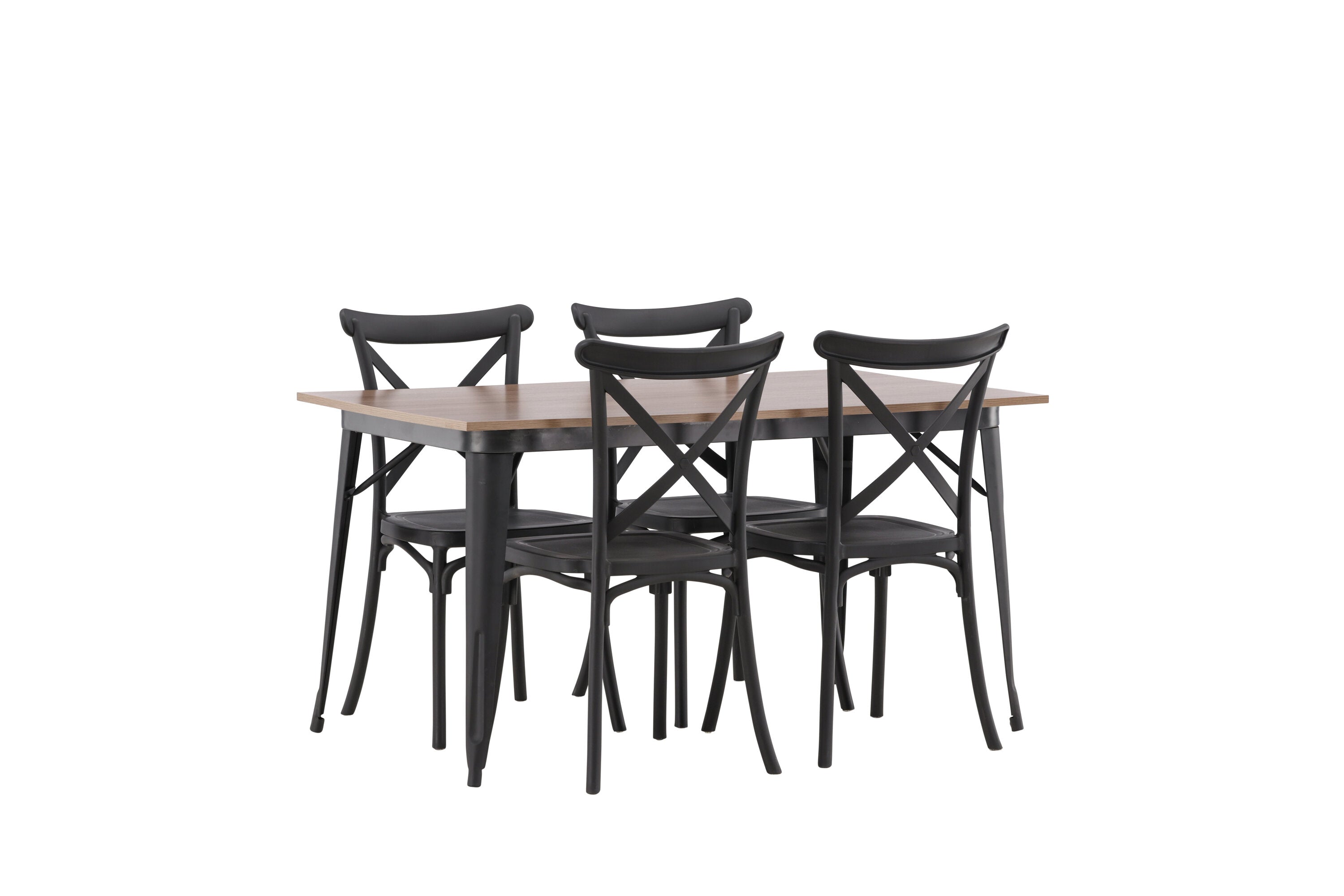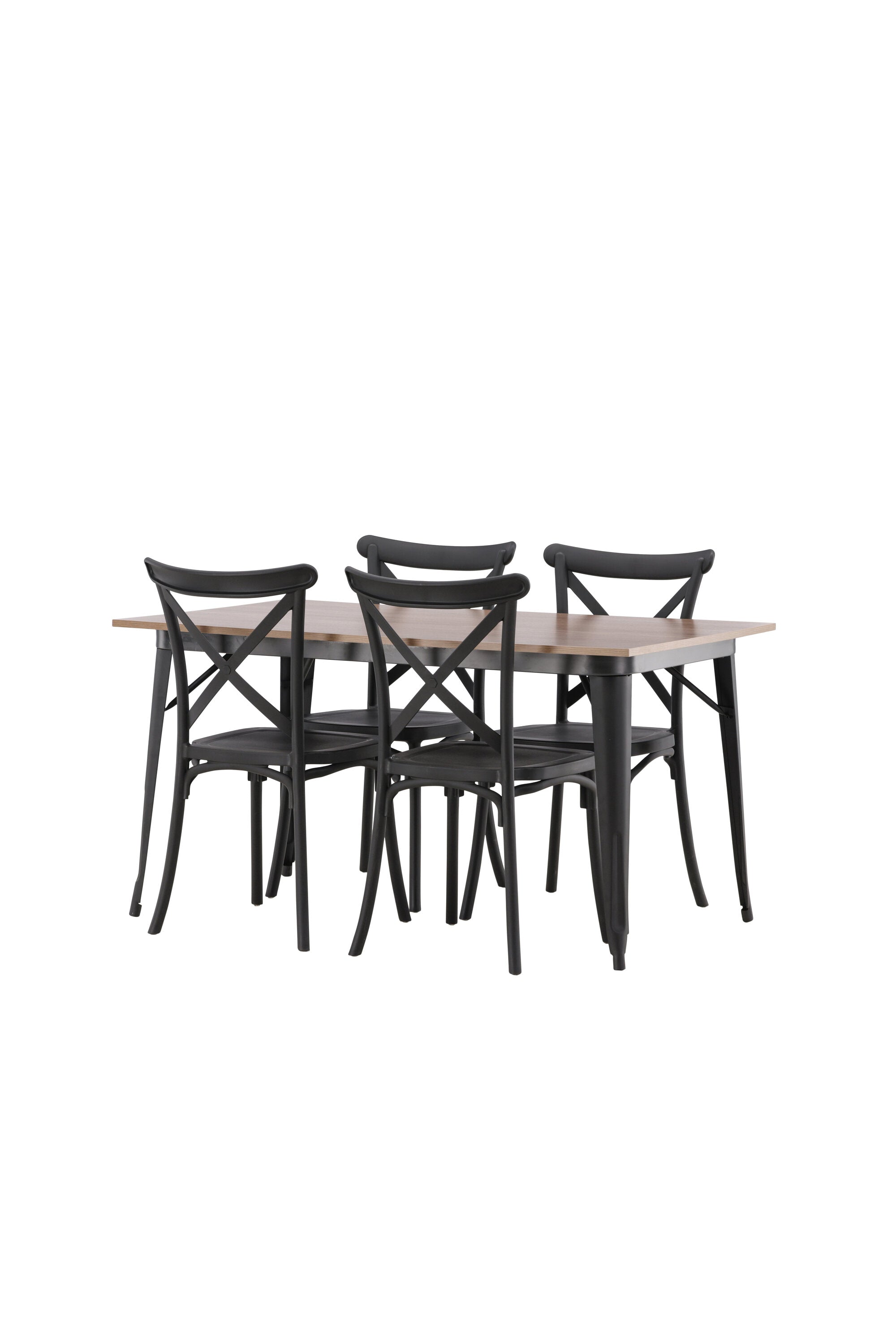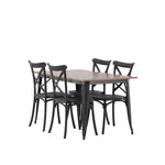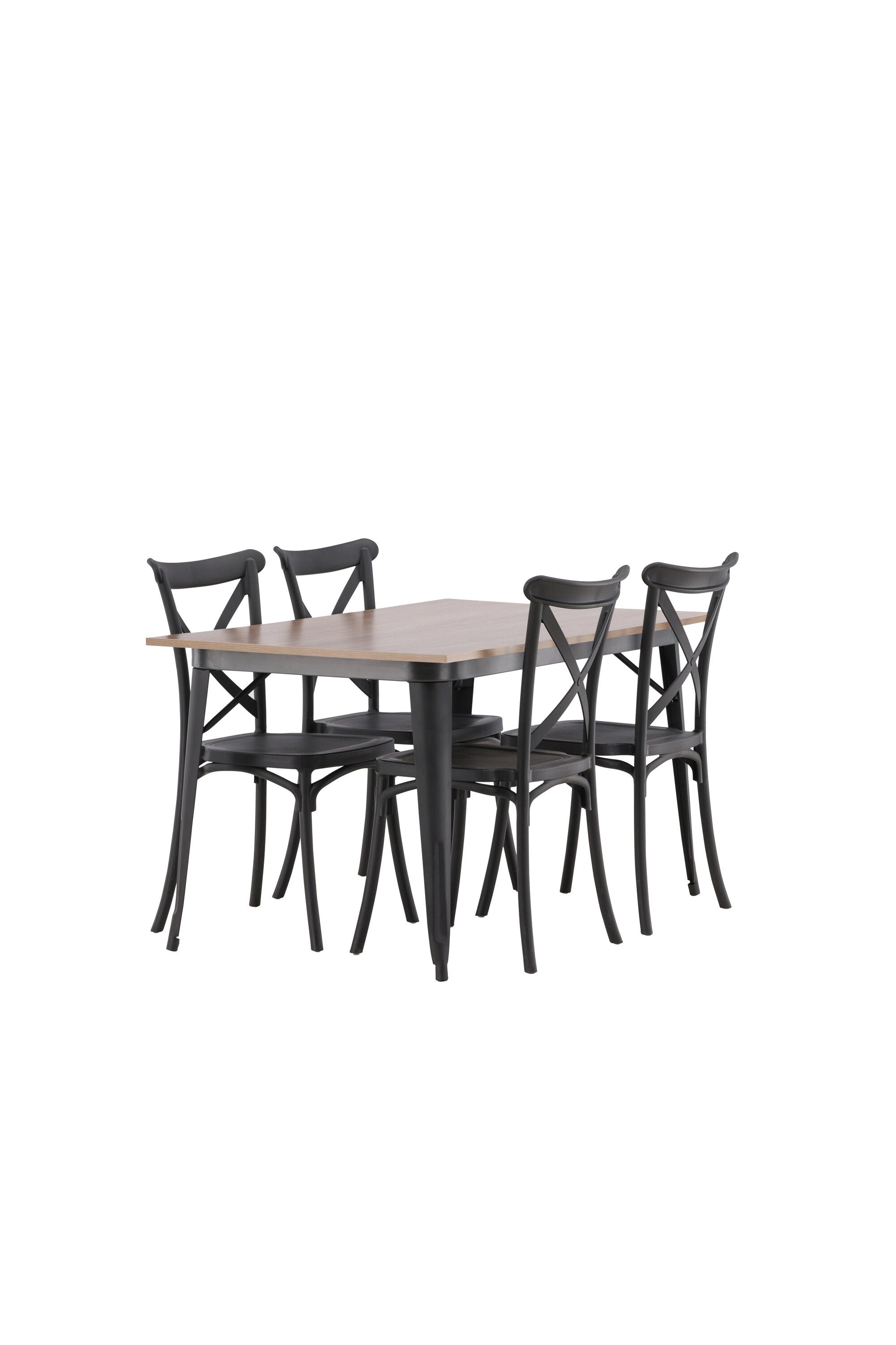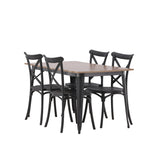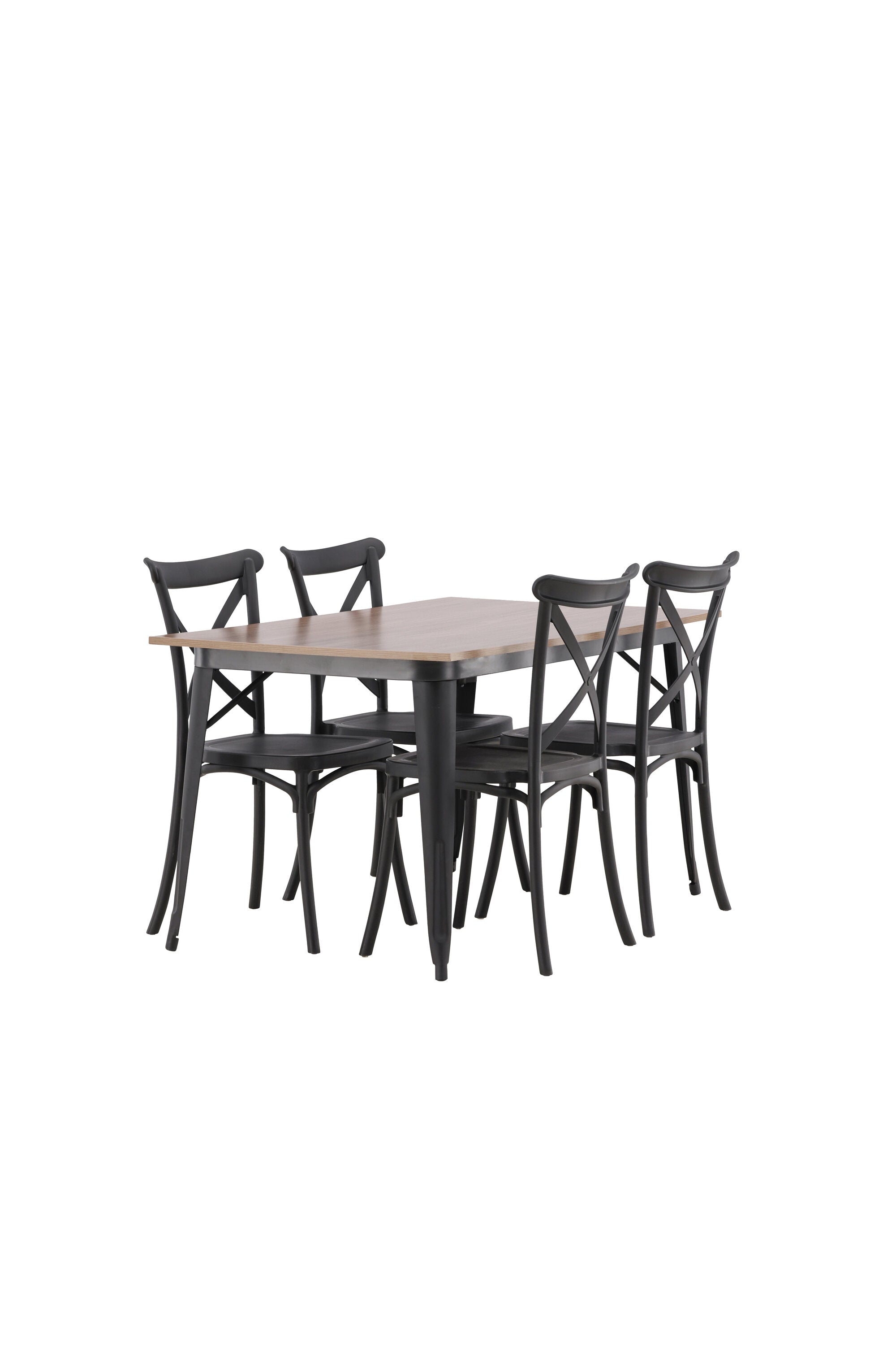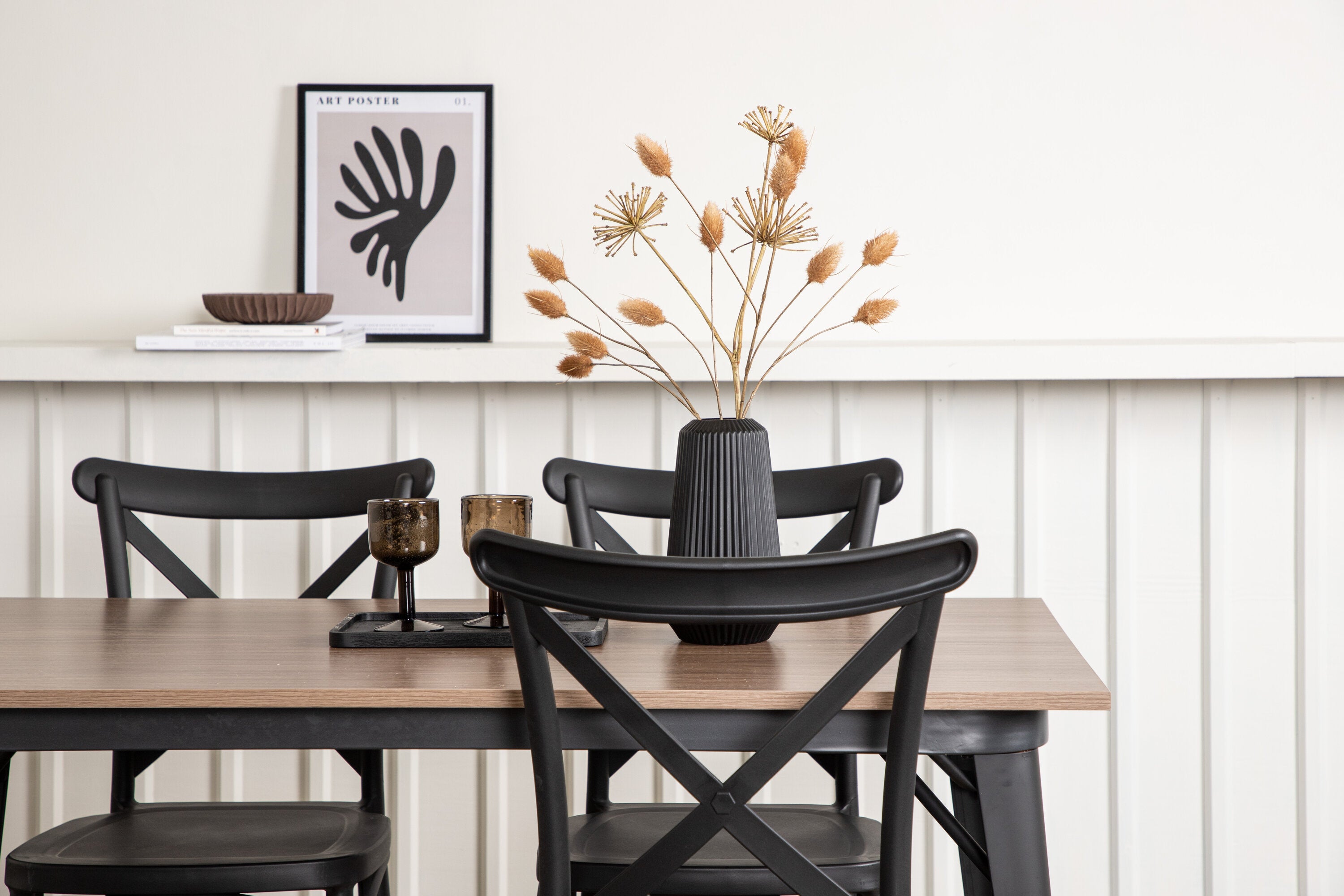 Jídelní skupina, která kombinuje klasický design a moderní formy! Jídelní stůl ze série Tempe patří do kolekce Venture Home a má poutavý, skandinávský design. Vyrobeno ze čtvercové desky stolu z černé MDF a nohou stolu z černého kovu. Zde společně s jídelními židlemi ze série Crosett. Židle mají nostalgický design s překříženým opěradlem a rovnými liniemi, důsledně vyrobeny z černého plastu. Zde získáte stylovou jídelní skupinu, kterou si vybavíte svůj domov!