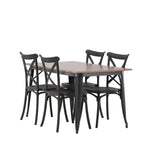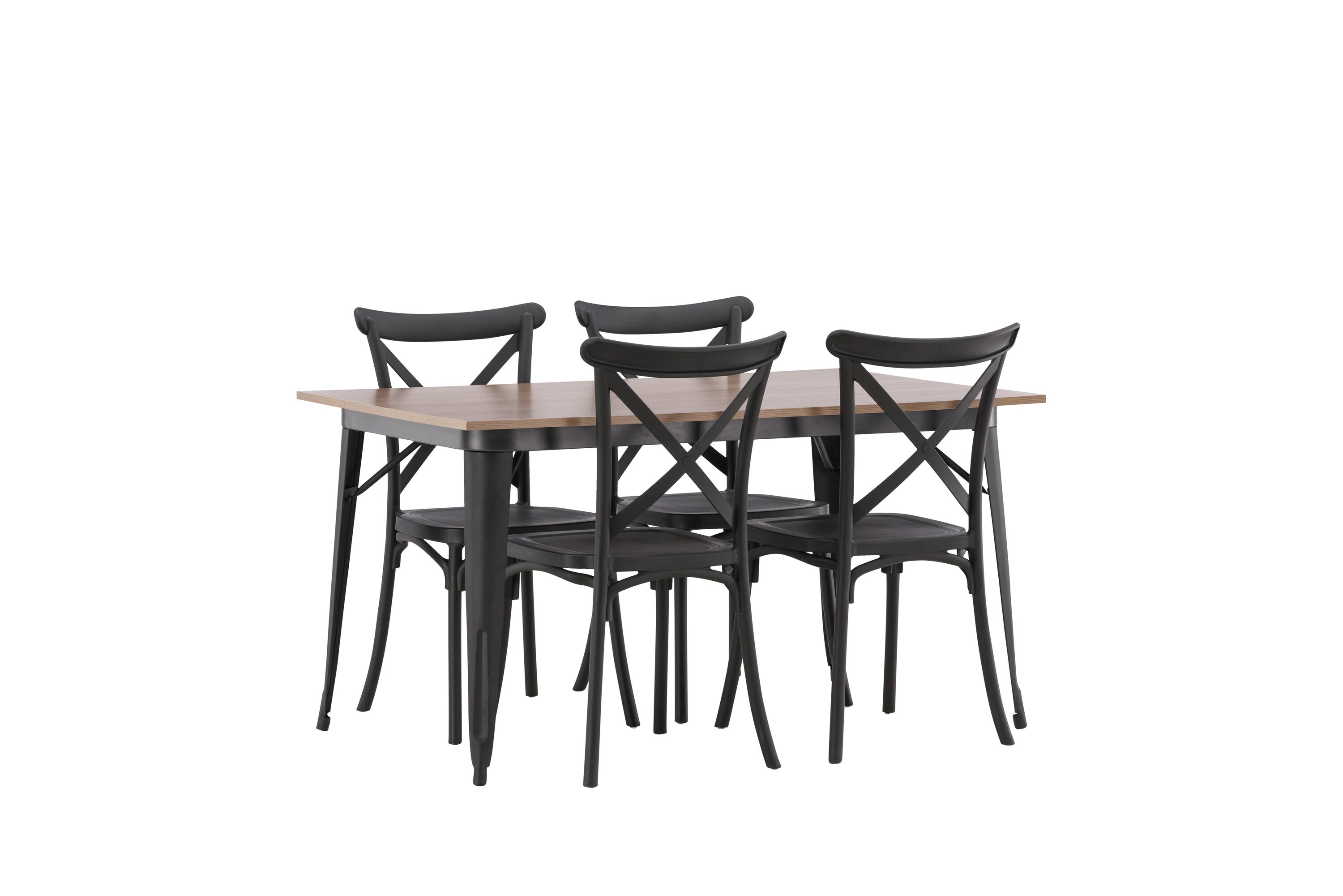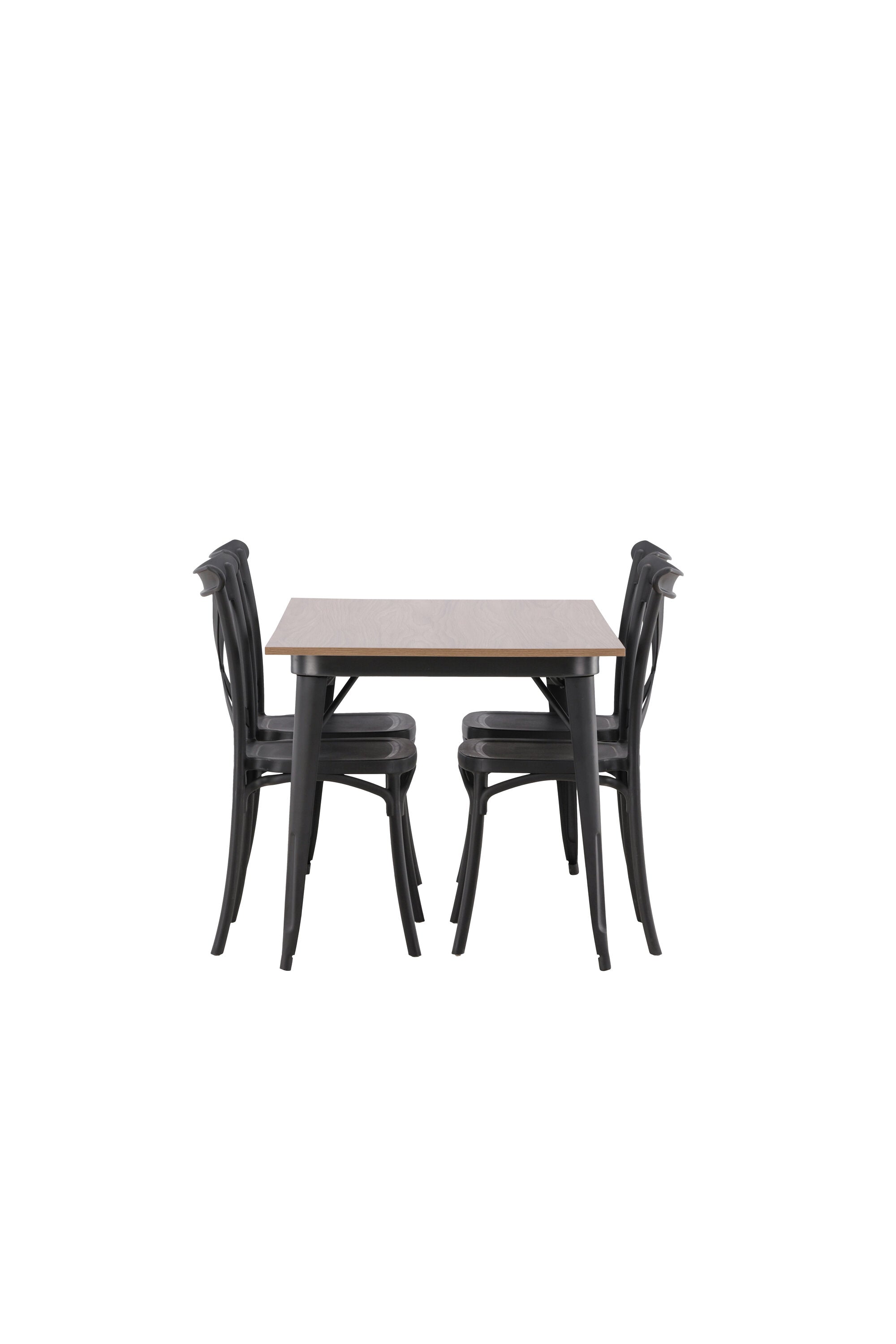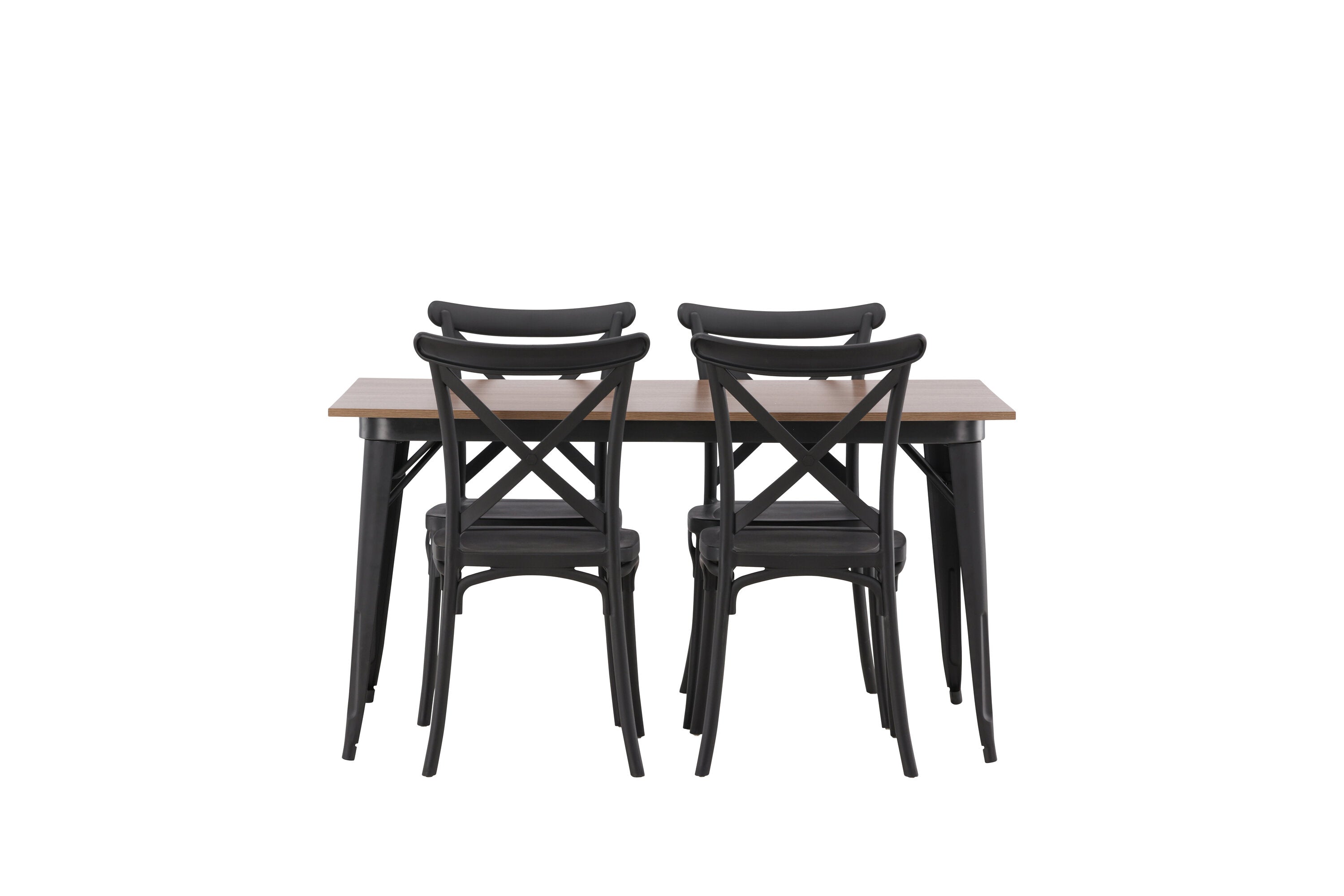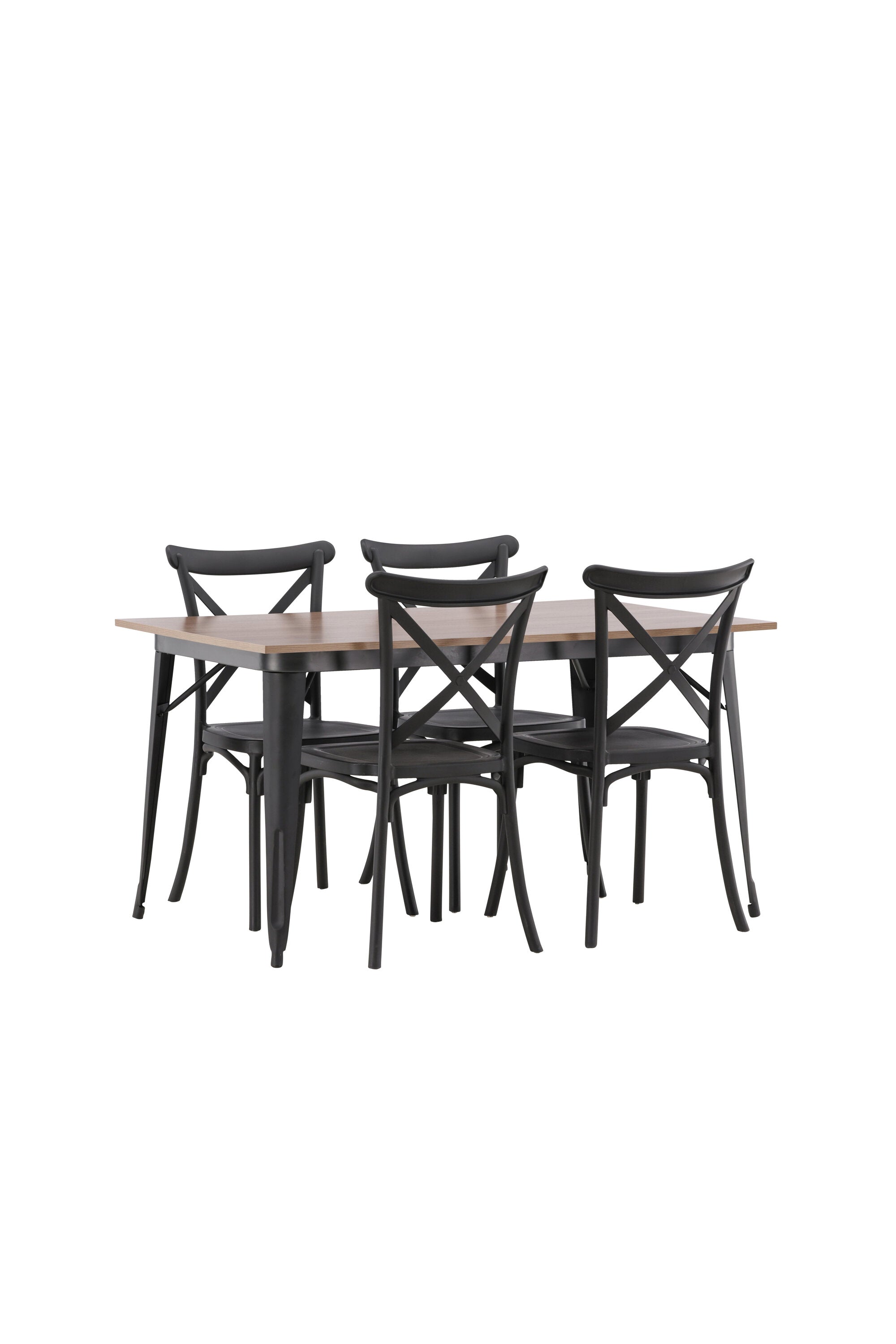 Jídelní skupina, která kombinuje klasický design a moderní formy! Jídelní stůl ze série Tempe patří do kolekce Venture Home a má poutavý, skandinávský design. Vyrobeno ze čtvercové desky stolu z černé MDF a nohou stolu z černého kovu. Zde společně s jídelními židlemi ze série Crosett. Židle mají nostalgický design s překříženým opěradlem a rovnými liniemi, důsledně vyrobeny z černého plastu. Zde získáte stylovou jídelní skupinu, kterou si vybavíte svůj domov!