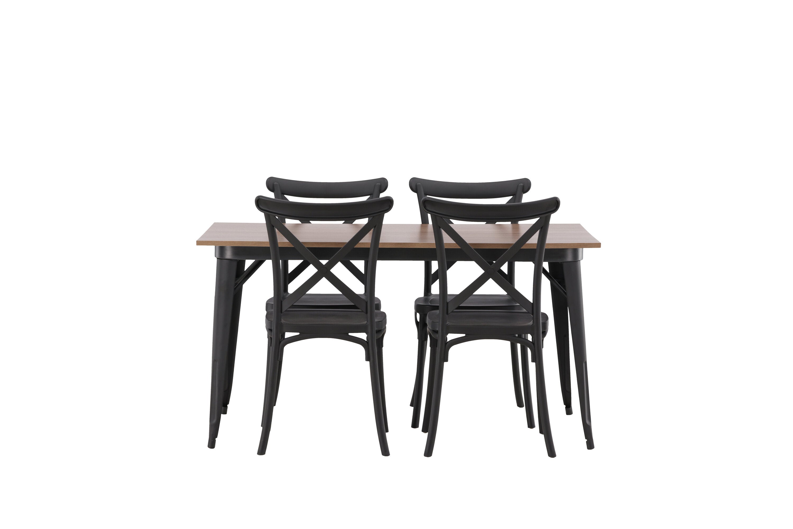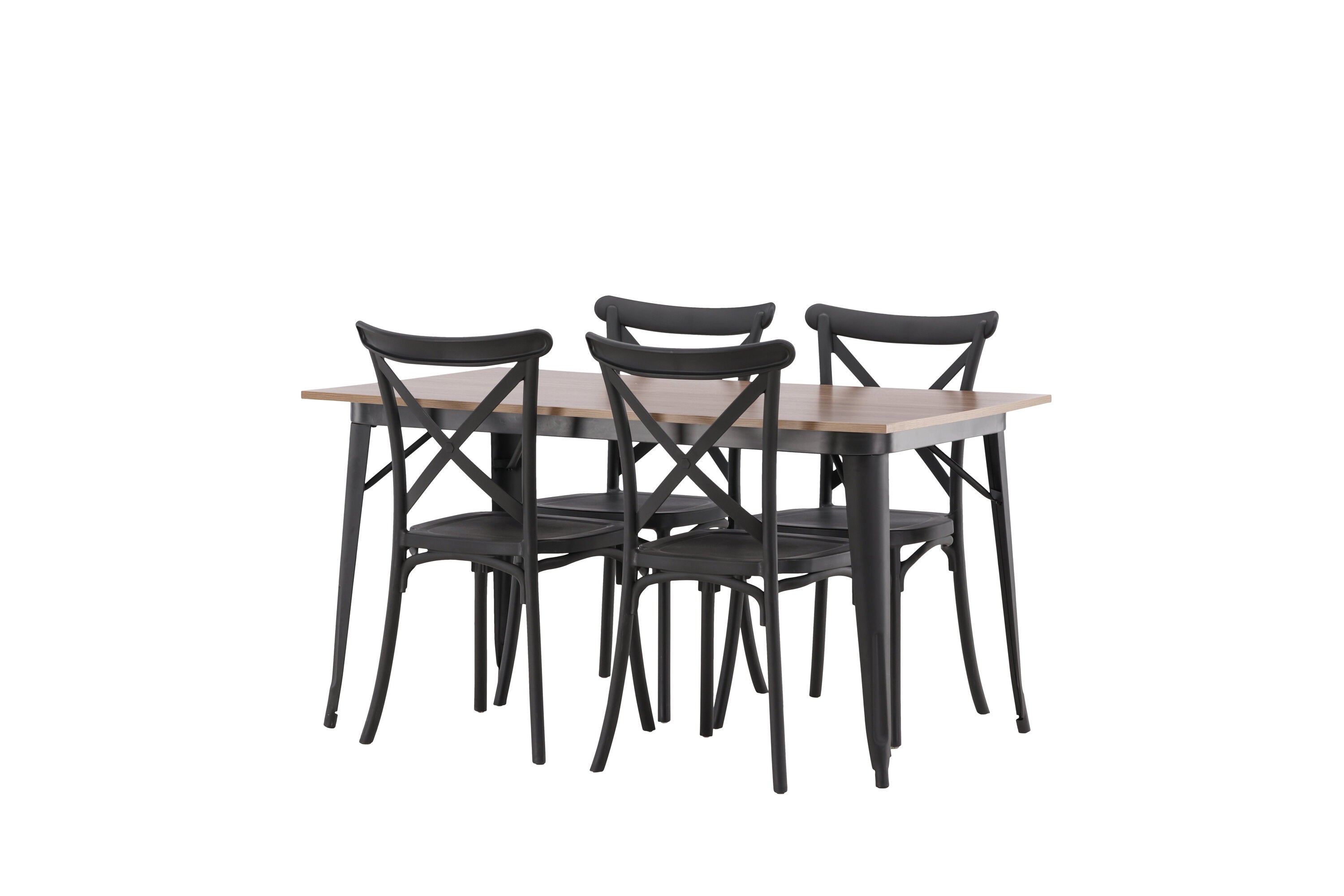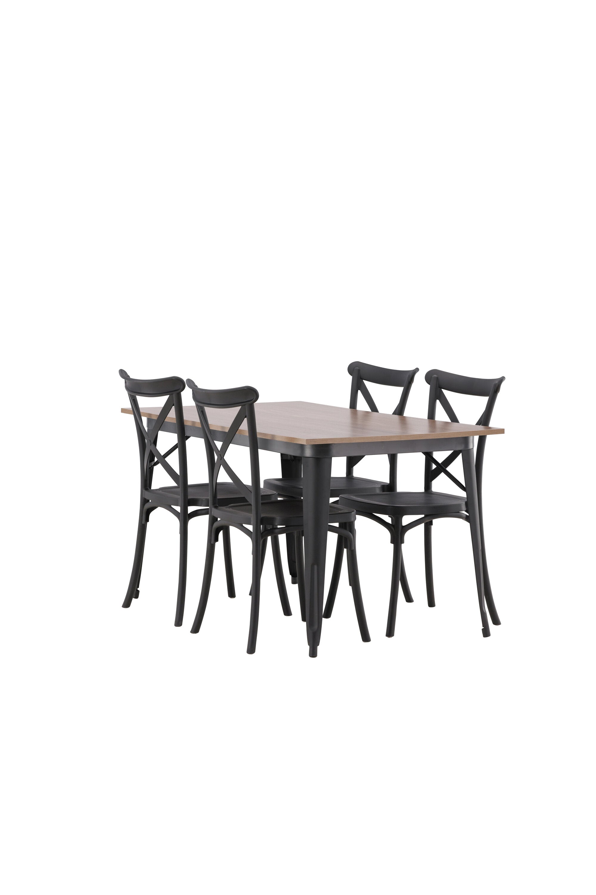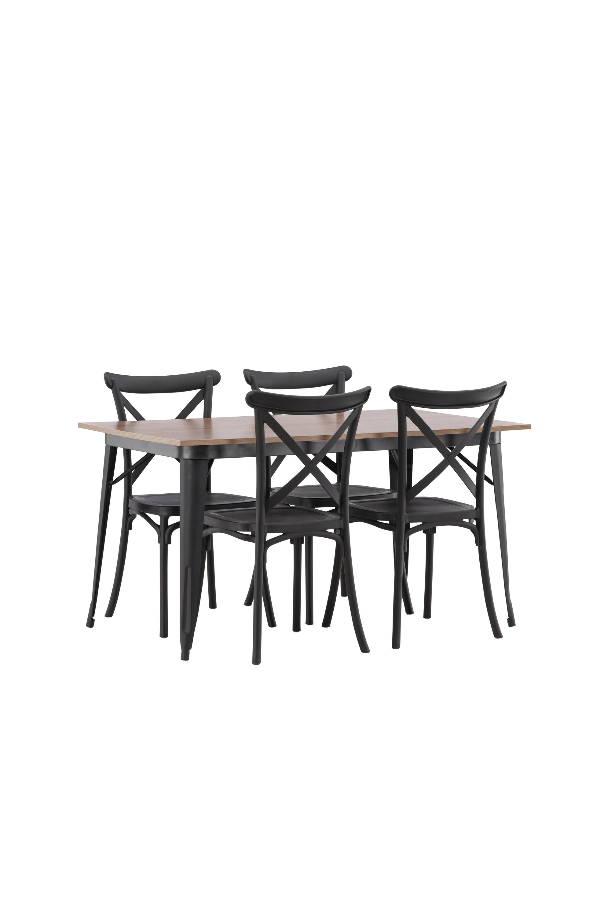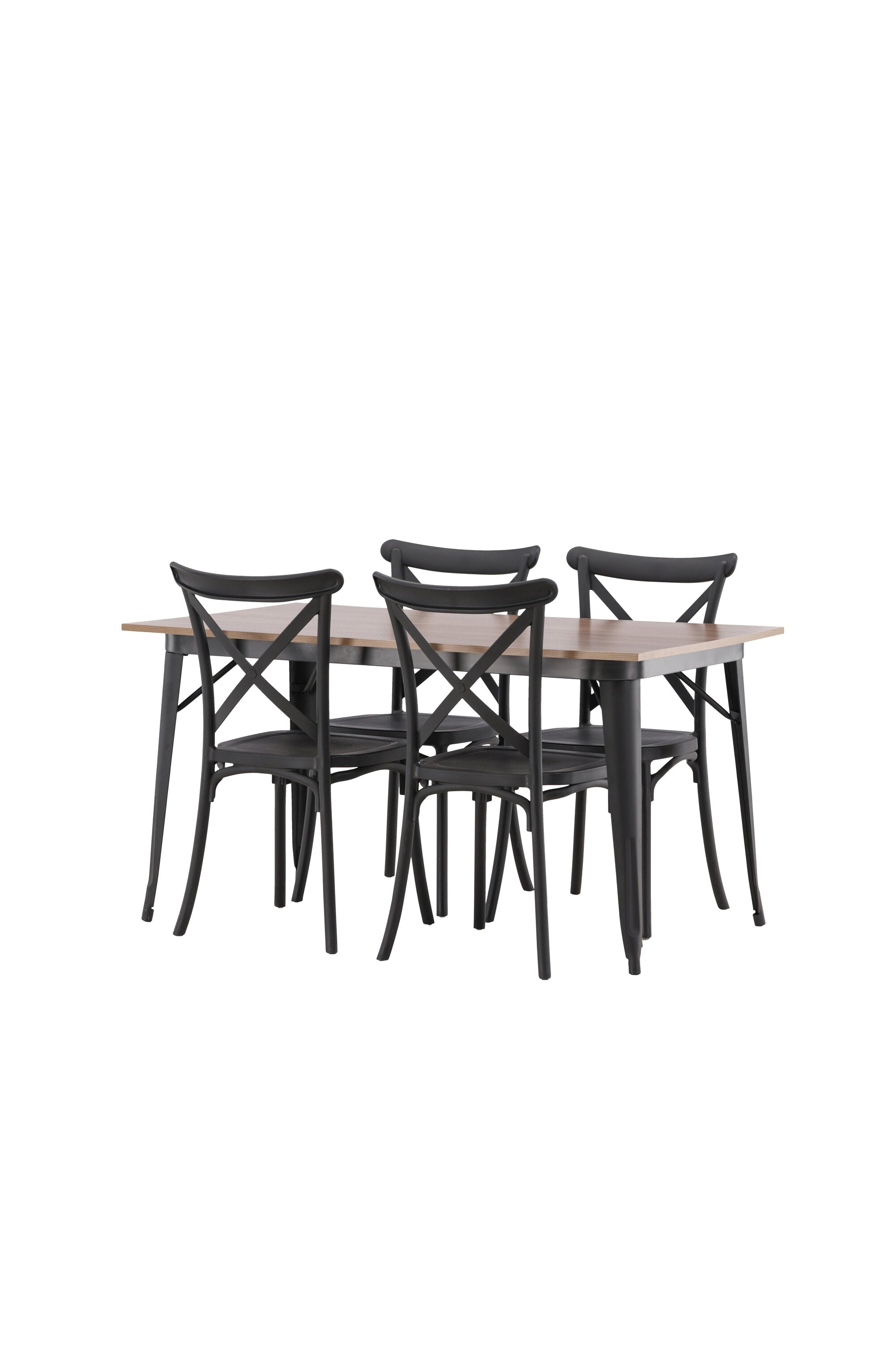 Jídelní skupina, která kombinuje klasický design a moderní formy! Jídelní stůl ze série Tempe patří do kolekce Venture Home a má poutavý, skandinávský design. Vyrobeno ze čtvercové desky stolu z černé MDF a nohou stolu z černého kovu. Zde společně s jídelními židlemi ze série Crosett. Židle mají nostalgický design s překříženým opěradlem a rovnými liniemi, důsledně vyrobeny z černého plastu. Zde získáte stylovou jídelní skupinu, kterou si vybavíte svůj domov!