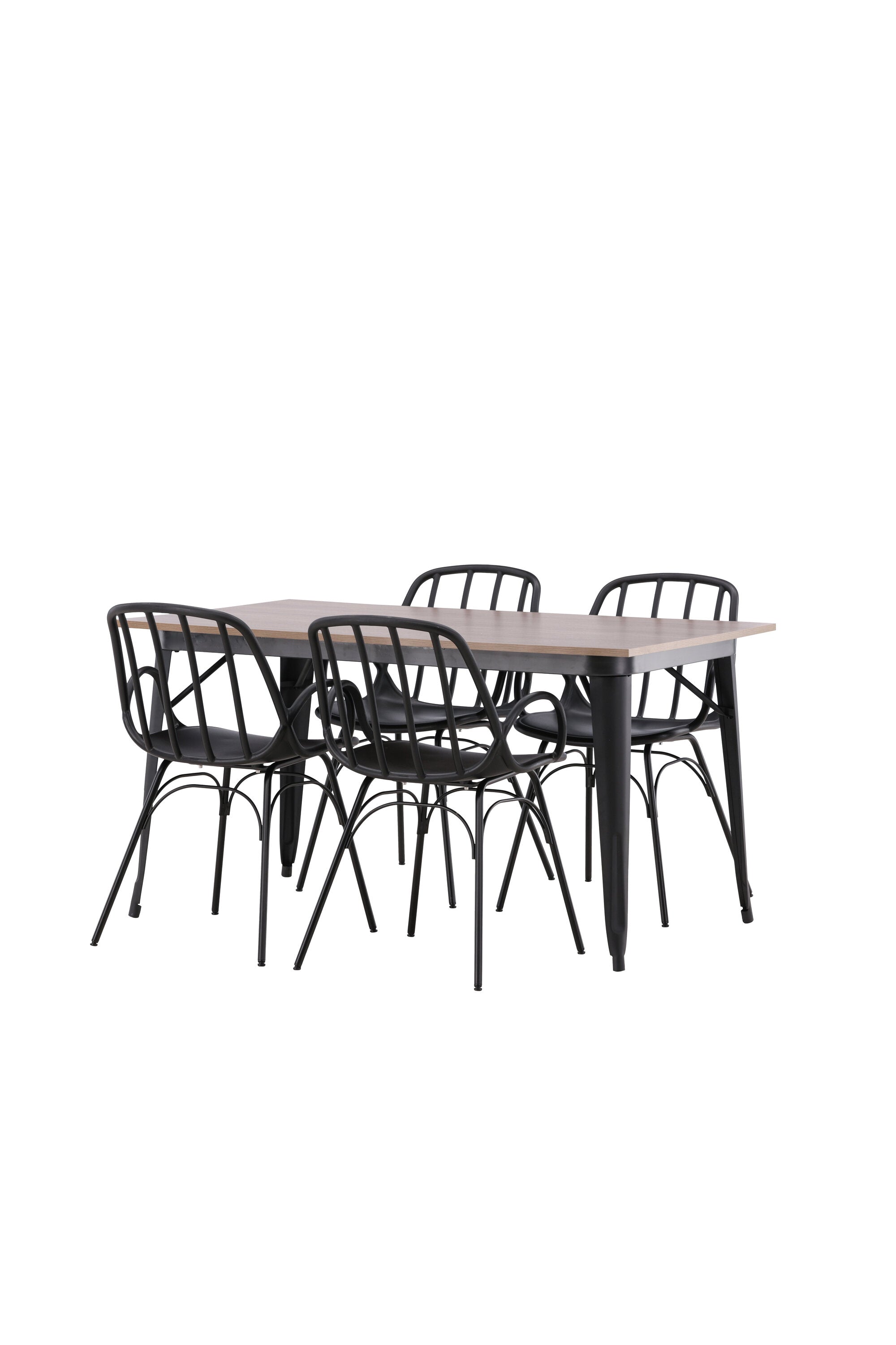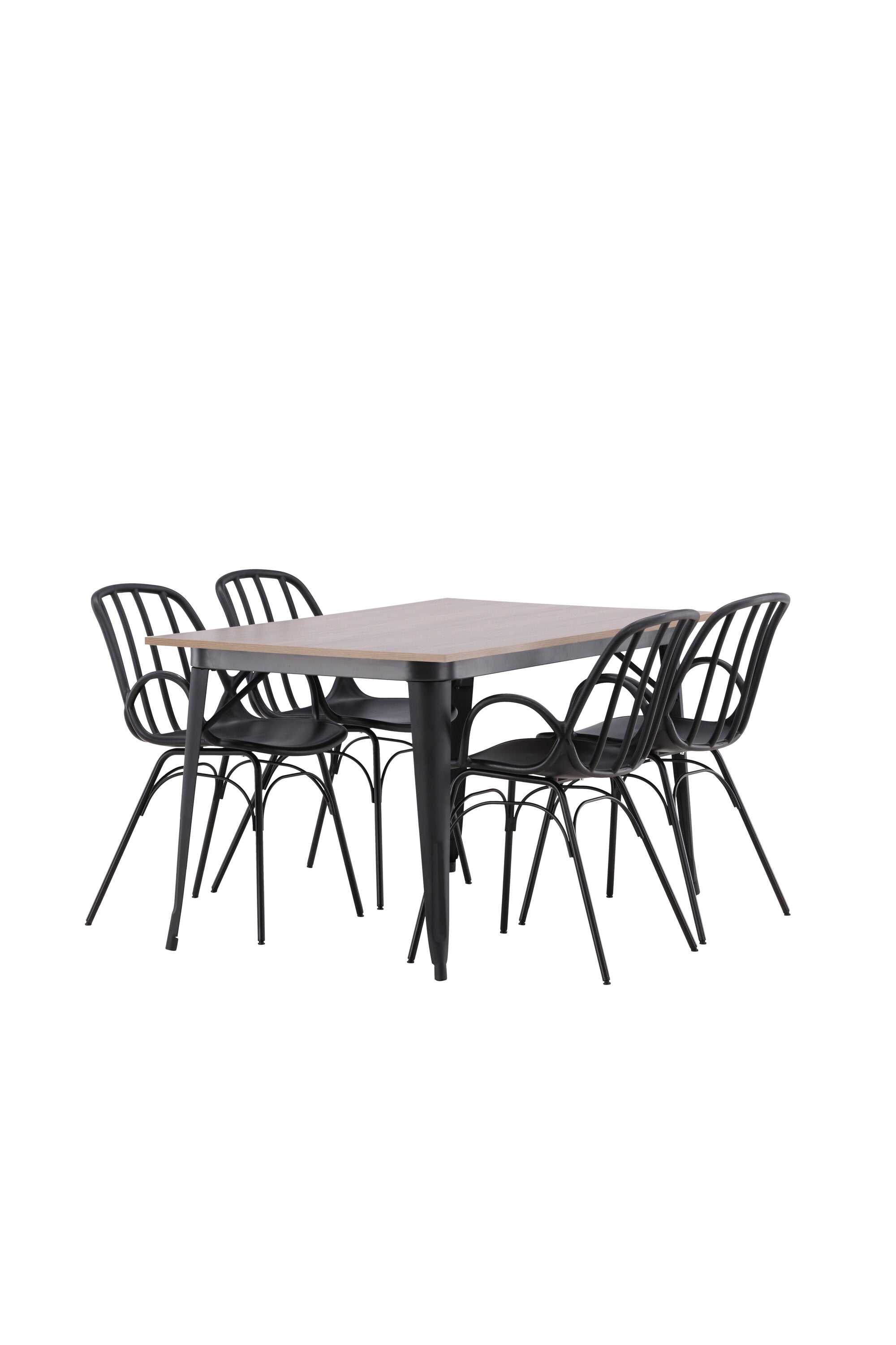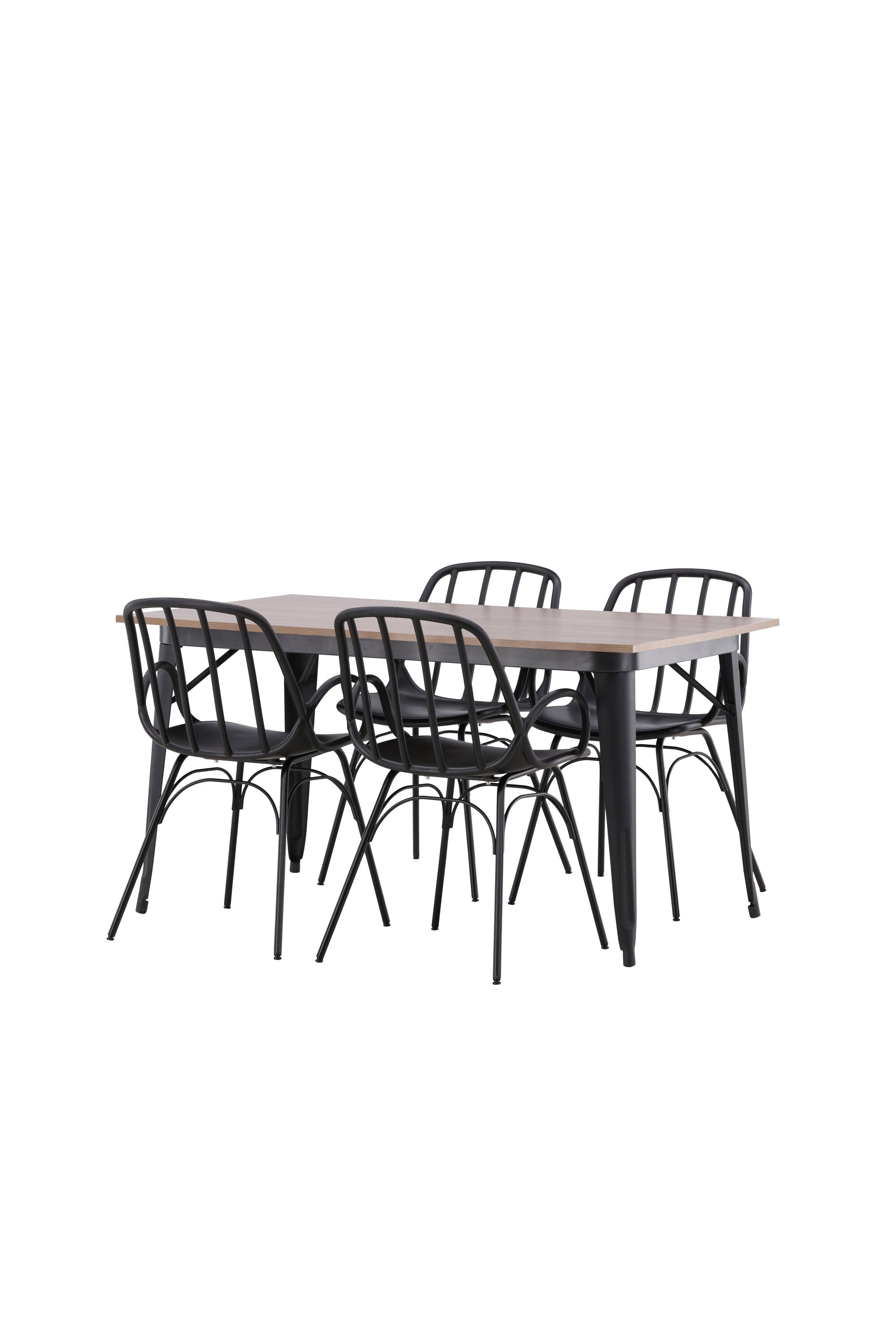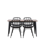 Jídelní skupina, která vyzařuje modernost a severský design! Jídelní stůl ze série Tempe je odolný vůči trendům a zároveň odolný. Vyrobeno z obdélníkové desky stolu z hnědé MDF a nohou stolu z černého kovu. Zde společně s našimi oblíbenými jídelními židlemi ze série Dyrön. Židle je stylová i praktická, vyrobena z černého plastu a oceli. Sedák má integrované područky a žebrovaný design v mírně zaoblené zadní části. Vybavte srdce domova přívětivě a vytvořte příjemnou atmosféru!