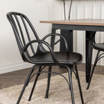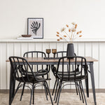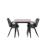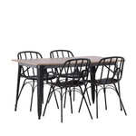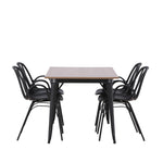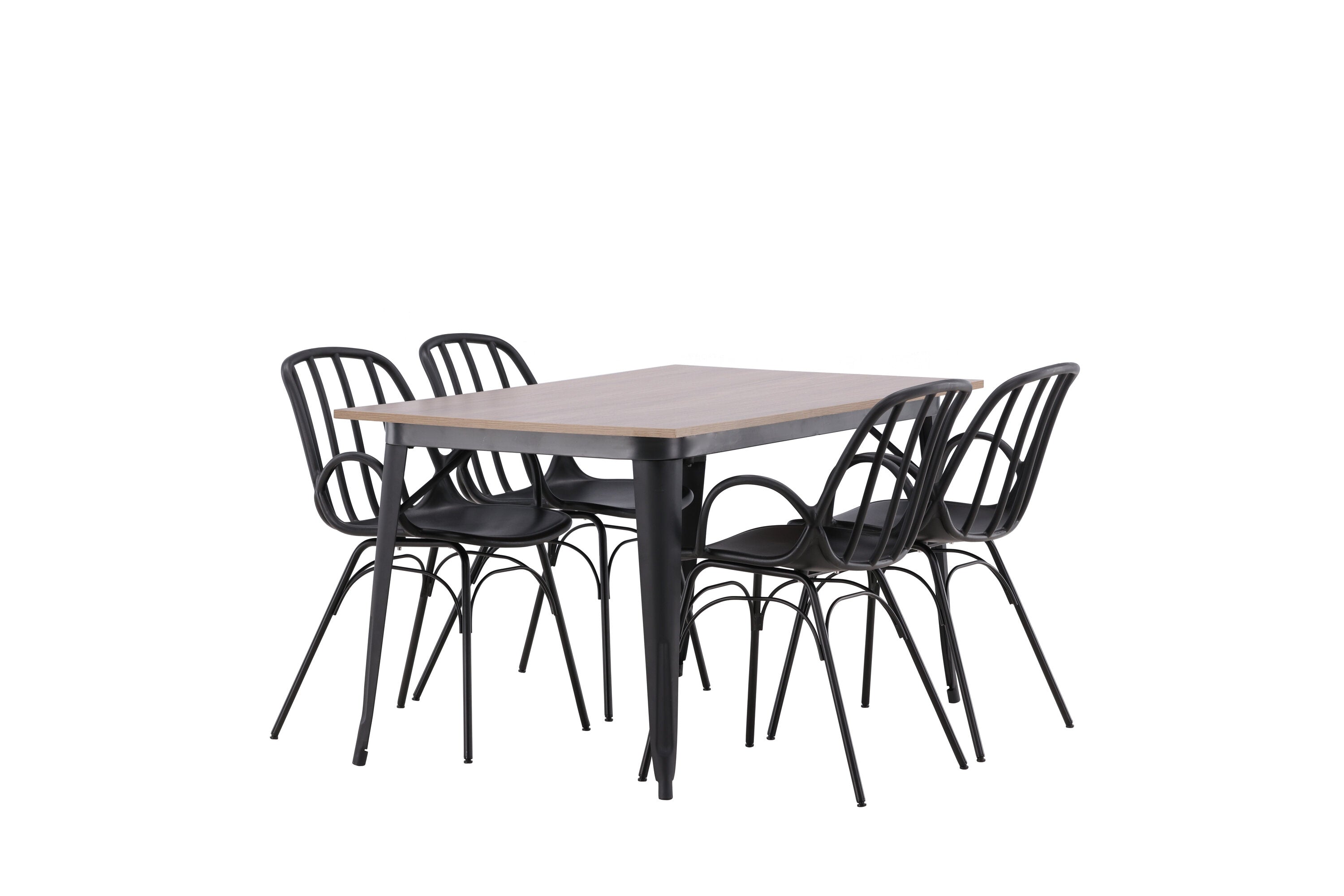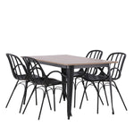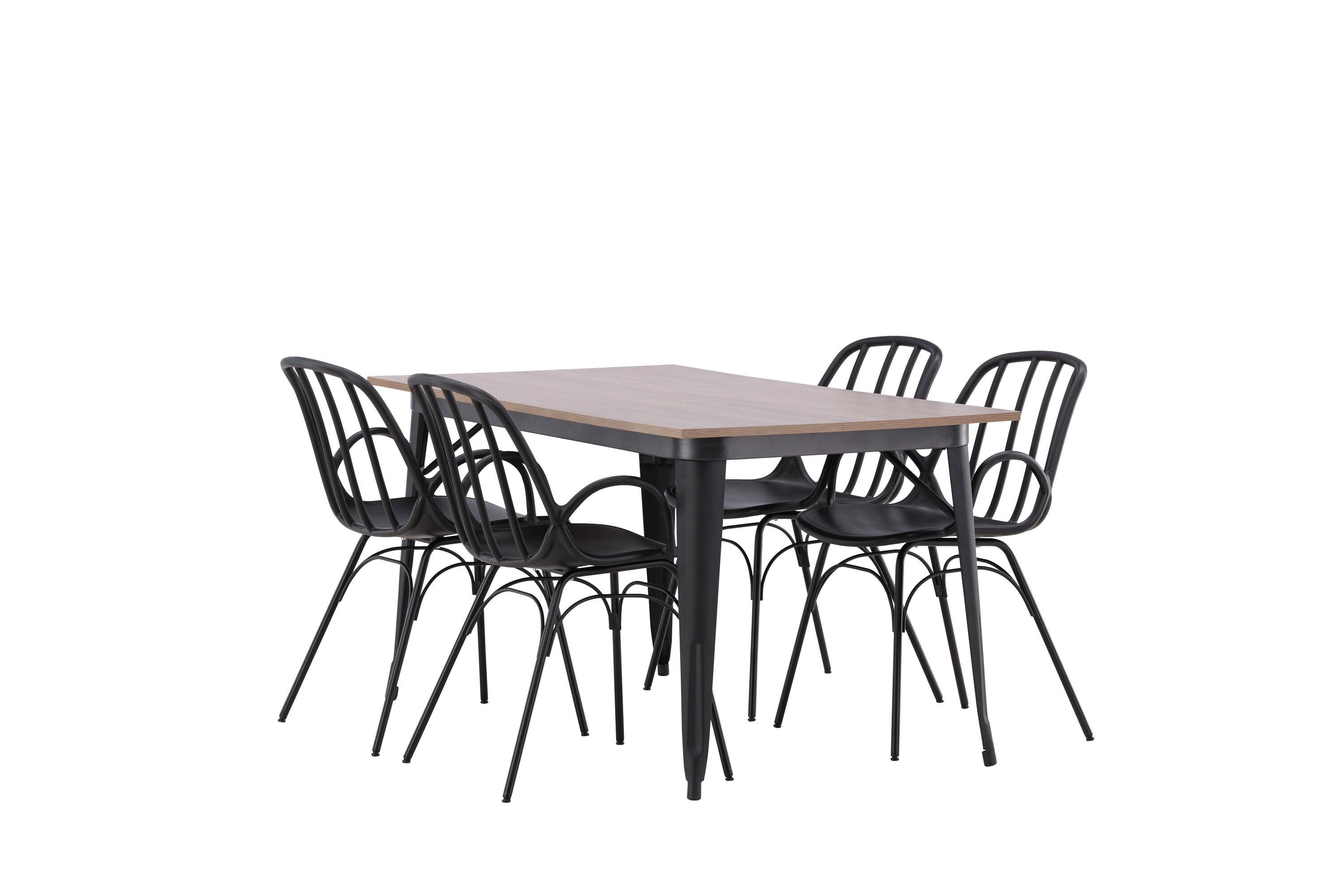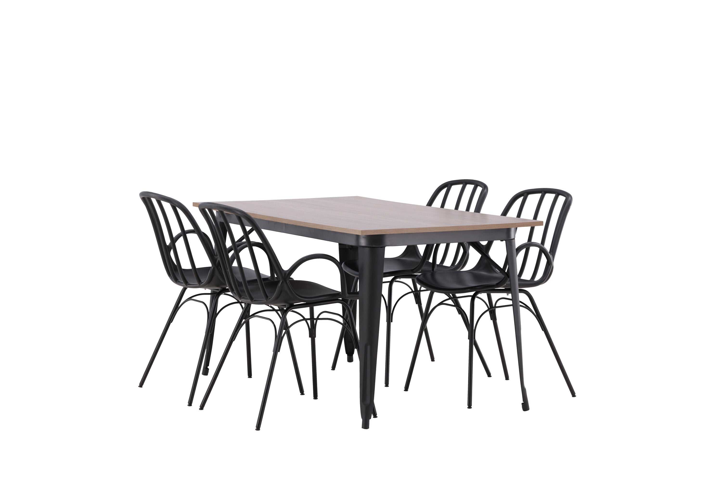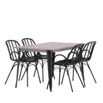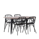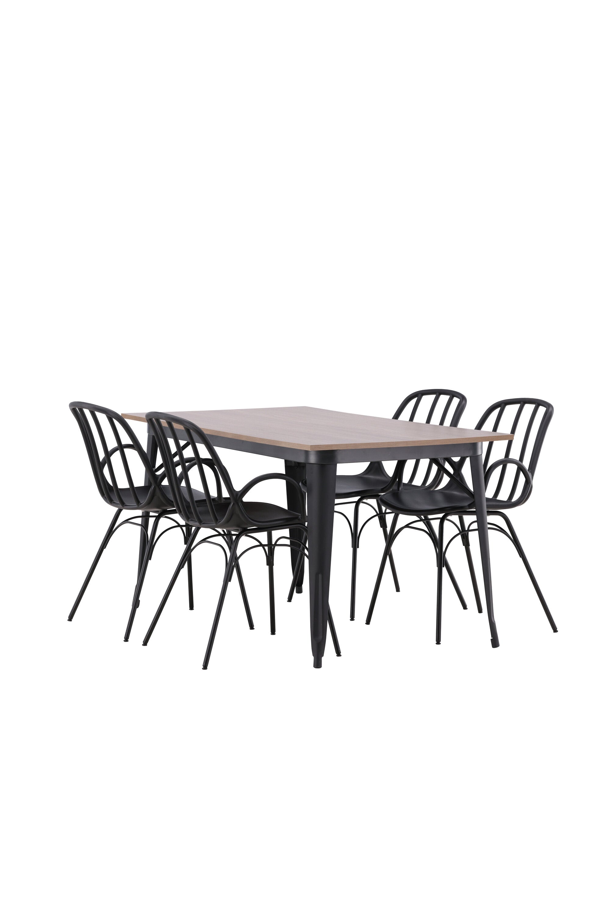 Jídelní skupina, která vyzařuje modernost a severský design! Jídelní stůl ze série Tempe je odolný vůči trendům a zároveň odolný. Vyrobeno z obdélníkové desky stolu z hnědé MDF a nohou stolu z černého kovu. Zde společně s našimi oblíbenými jídelními židlemi ze série Dyrön. Židle je stylová i praktická, vyrobena z černého plastu a oceli. Sedák má integrované područky a žebrovaný design v mírně zaoblené zadní části. Vybavte srdce domova přívětivě a vytvořte příjemnou atmosféru!