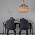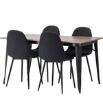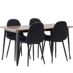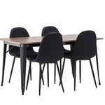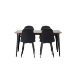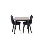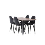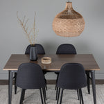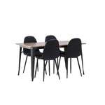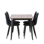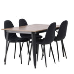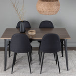 Stylová jídelní skupina v severských podobách! Jídelní stůl ze série Tempe má stylový, skandinávský design. Vyrobeno ze čtvercové desky stolu z MDF v barvě ořechu a nohou stolu z černého kovu. Zde je stůl kombinován s černými jídelními židlemi ze série Polar. Židle má zaoblený design s klasickým designem - stejně praktická jako nadčasová. Opěradlo a sedák jsou čalouněny černou polyesterovou tkaninou a nohy černým práškovým kovem. Jednoduše, úžasná kombinace! Rozměry stolu: 140x80cm.