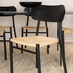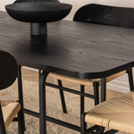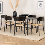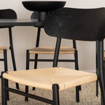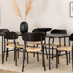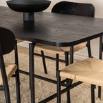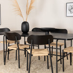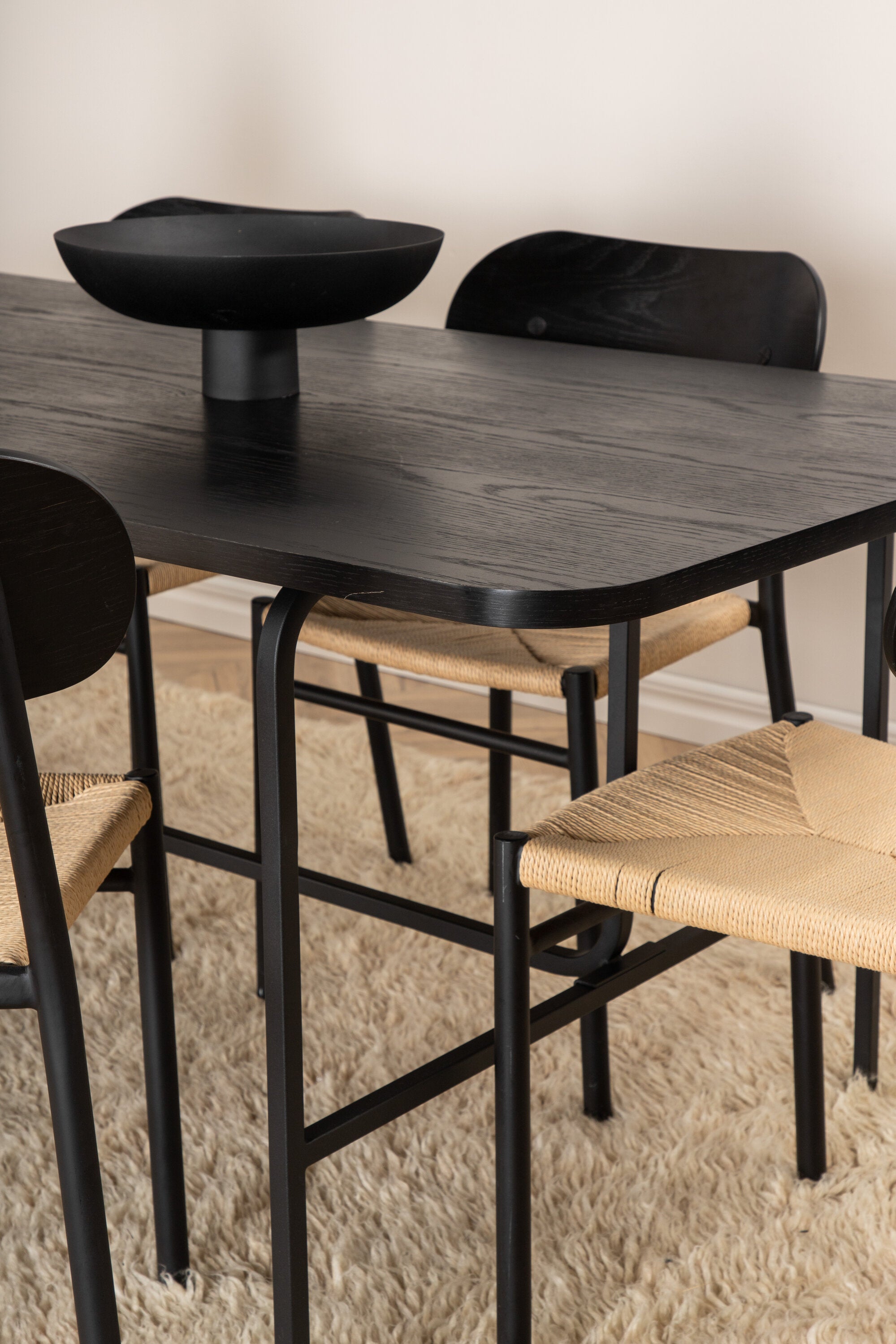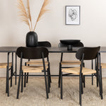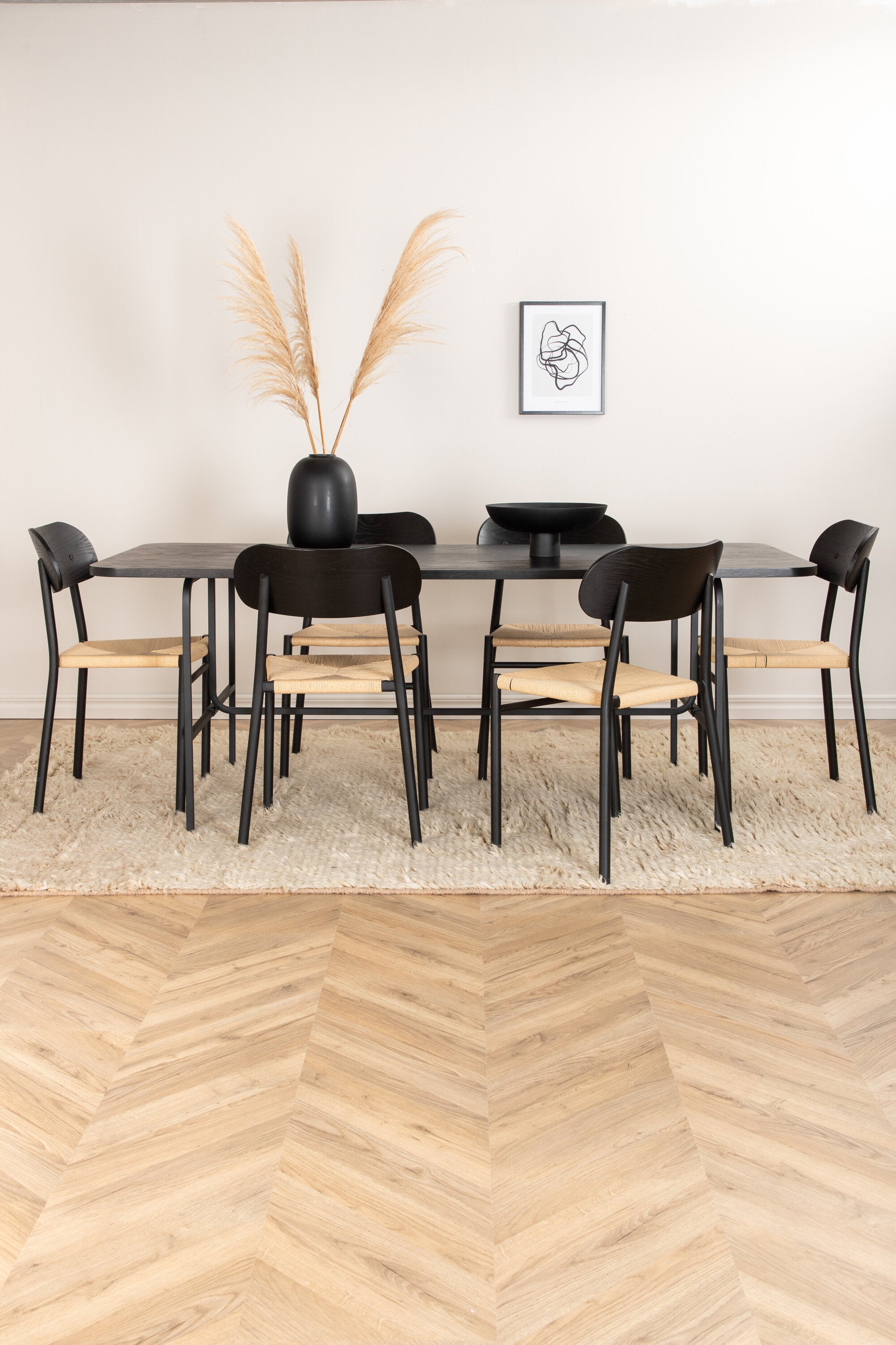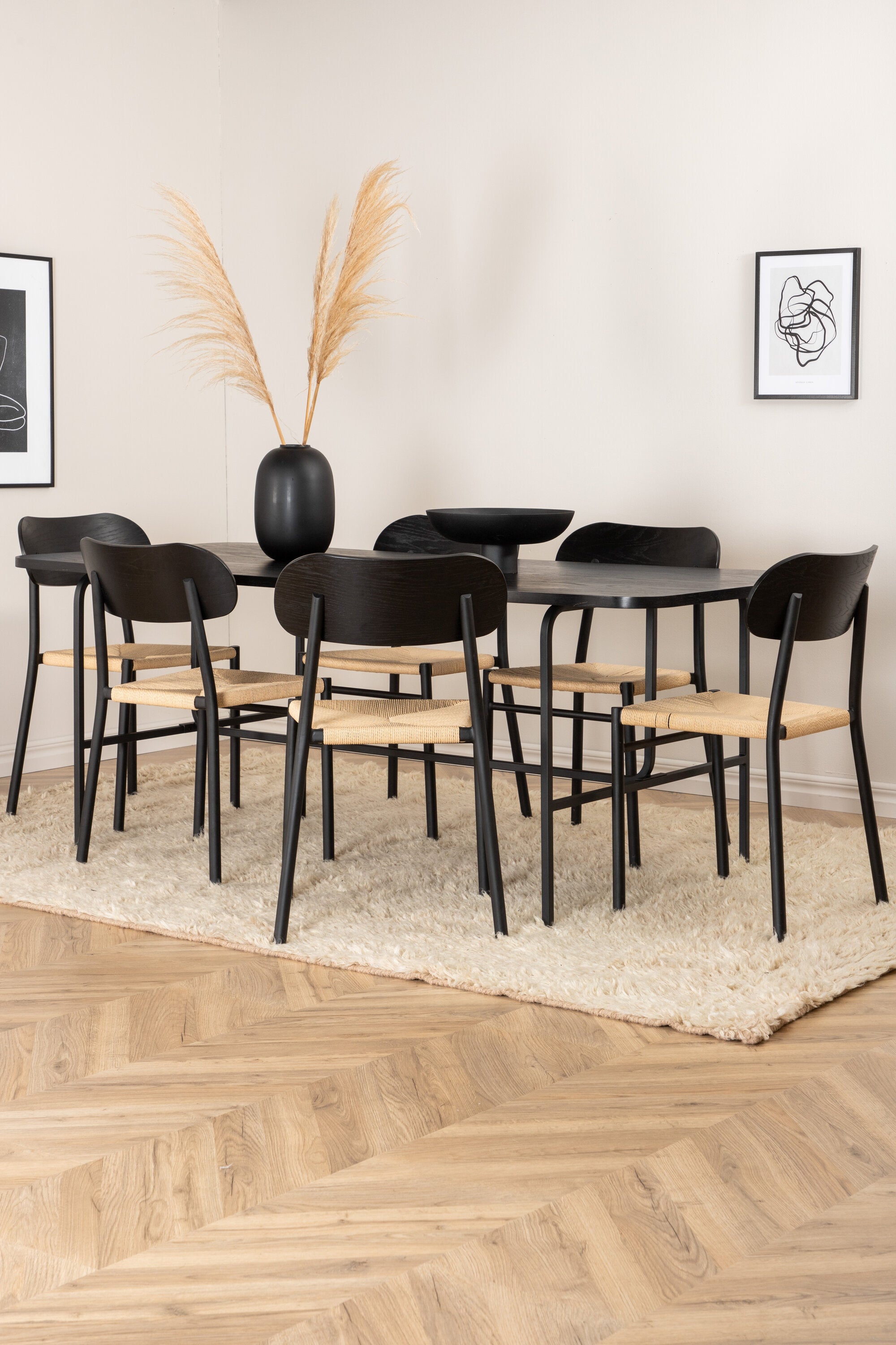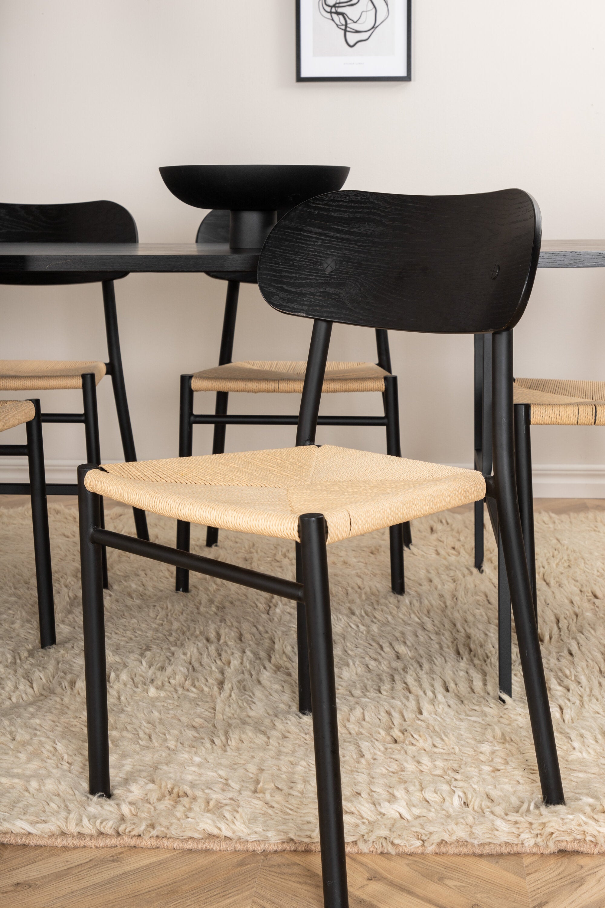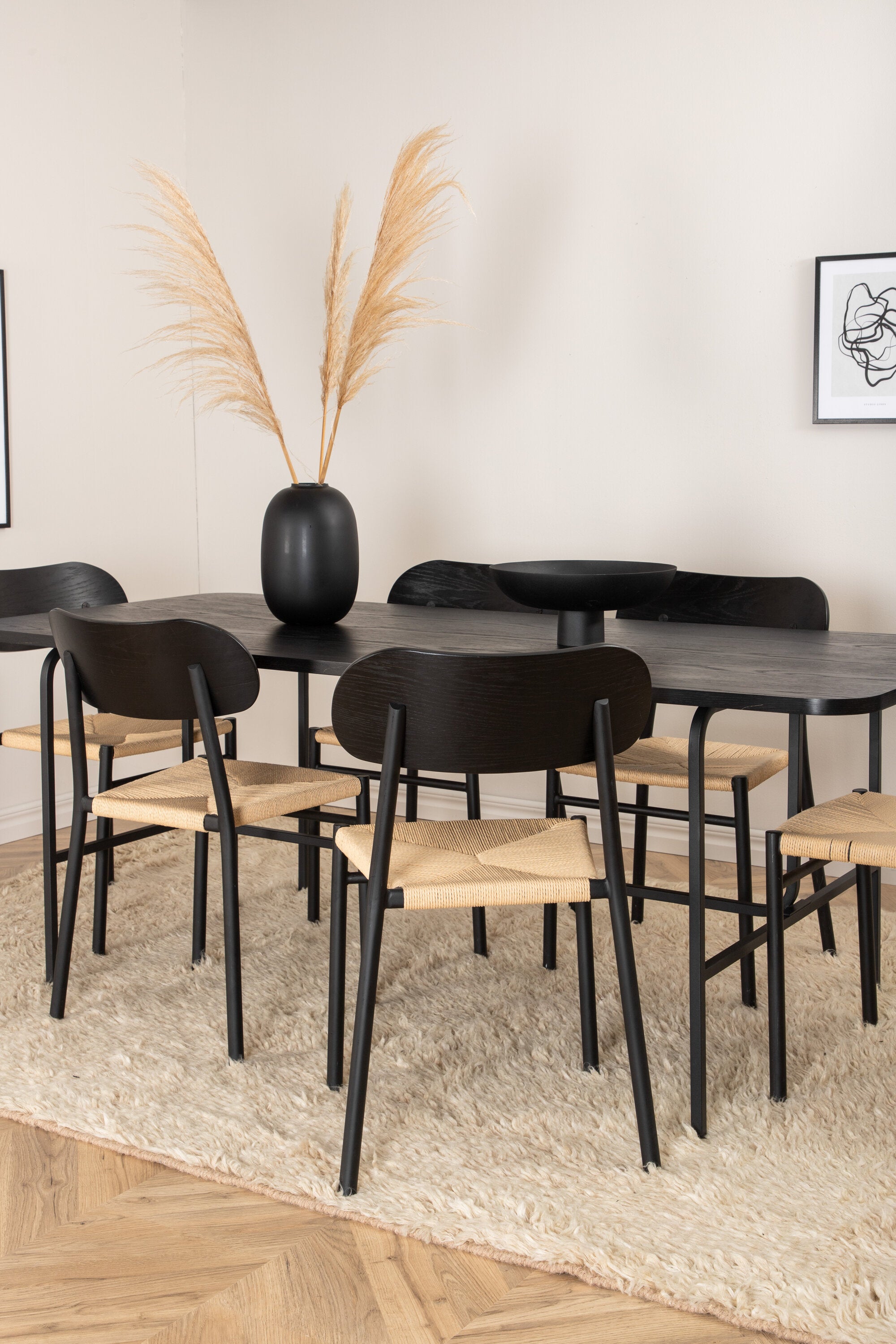 Lahodná skupina jídel v moderním designu! Zde se náš oblíbený jídelní stůl kombinuje s lahodnými jídelními židlemi ze série Polly. Stůl má horní desku v černé MDF s dýhou a černé nohy stolu z kovu - klasický obdélníkový jídelní stůl s lehce zaoblenými rohy. Rozměry stolu: Délka: 200 cm, Šířka: 90 cm, Výška: 74 cm. Dodatečně vyrábíme 6 jídelních židlí Polly s nohami židle z černého kovu a sedákem z přírodního lana. Rozměry židle: výška: 88 cm, výška sedáku: 47 cm, šířka: 42 cm, hloubka: 55 cm. Nechte srdce domova charakterizovat vaši novou, poutavou skupinu potravin.