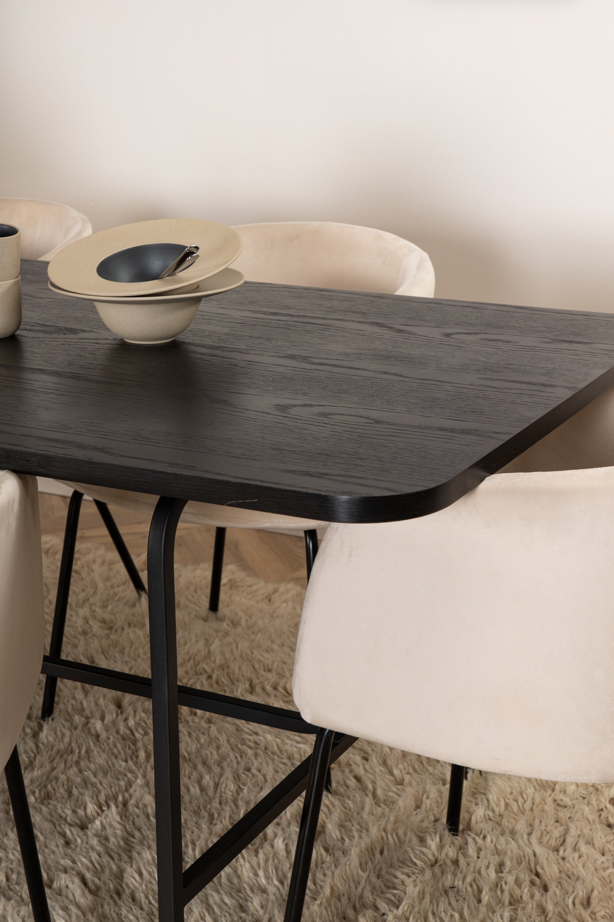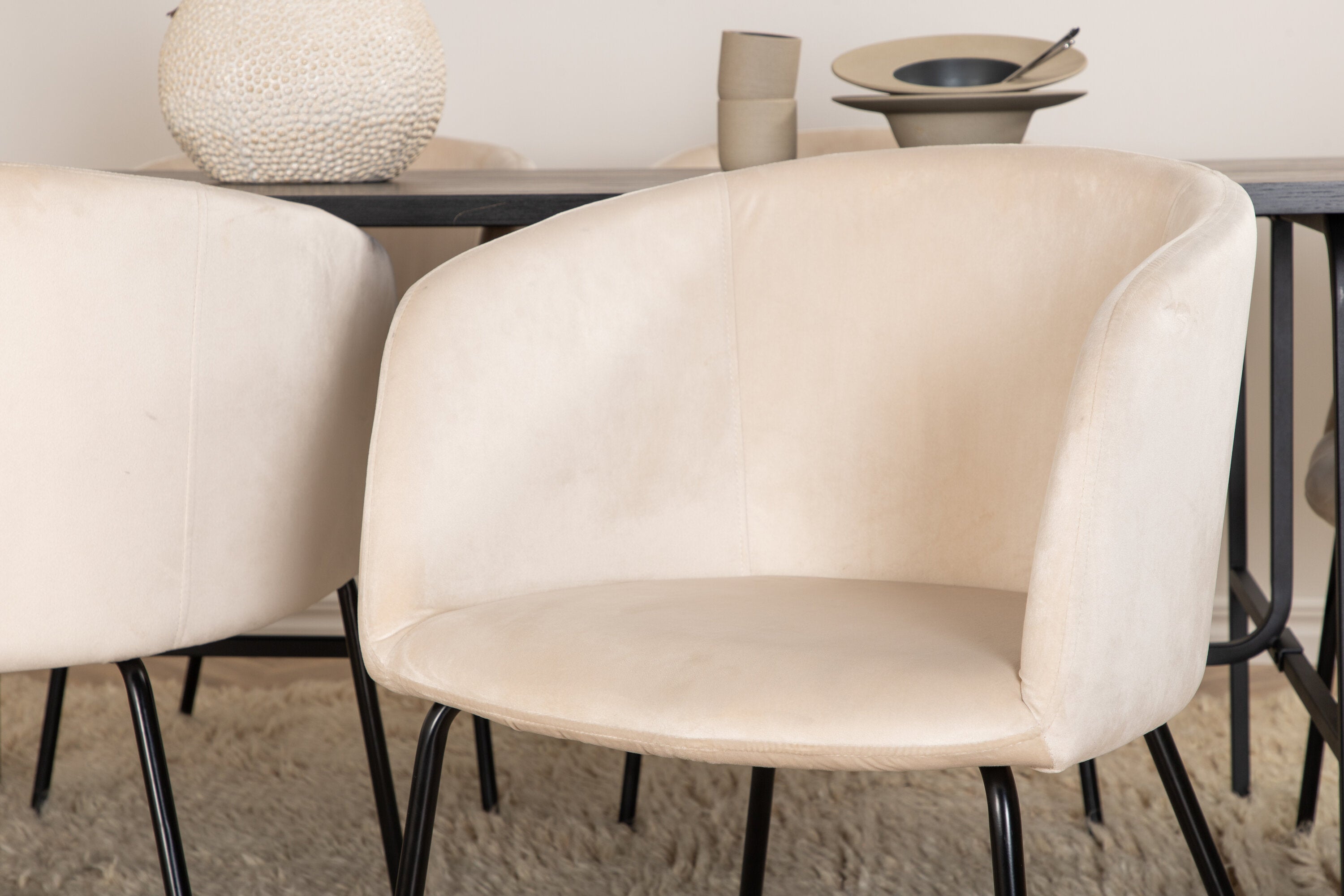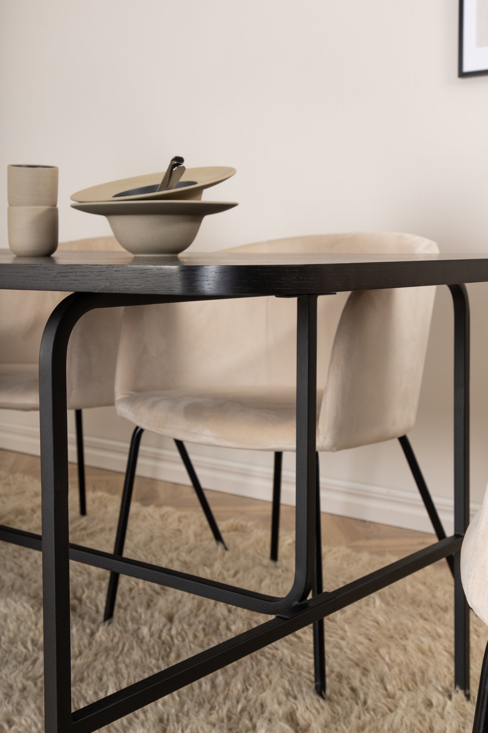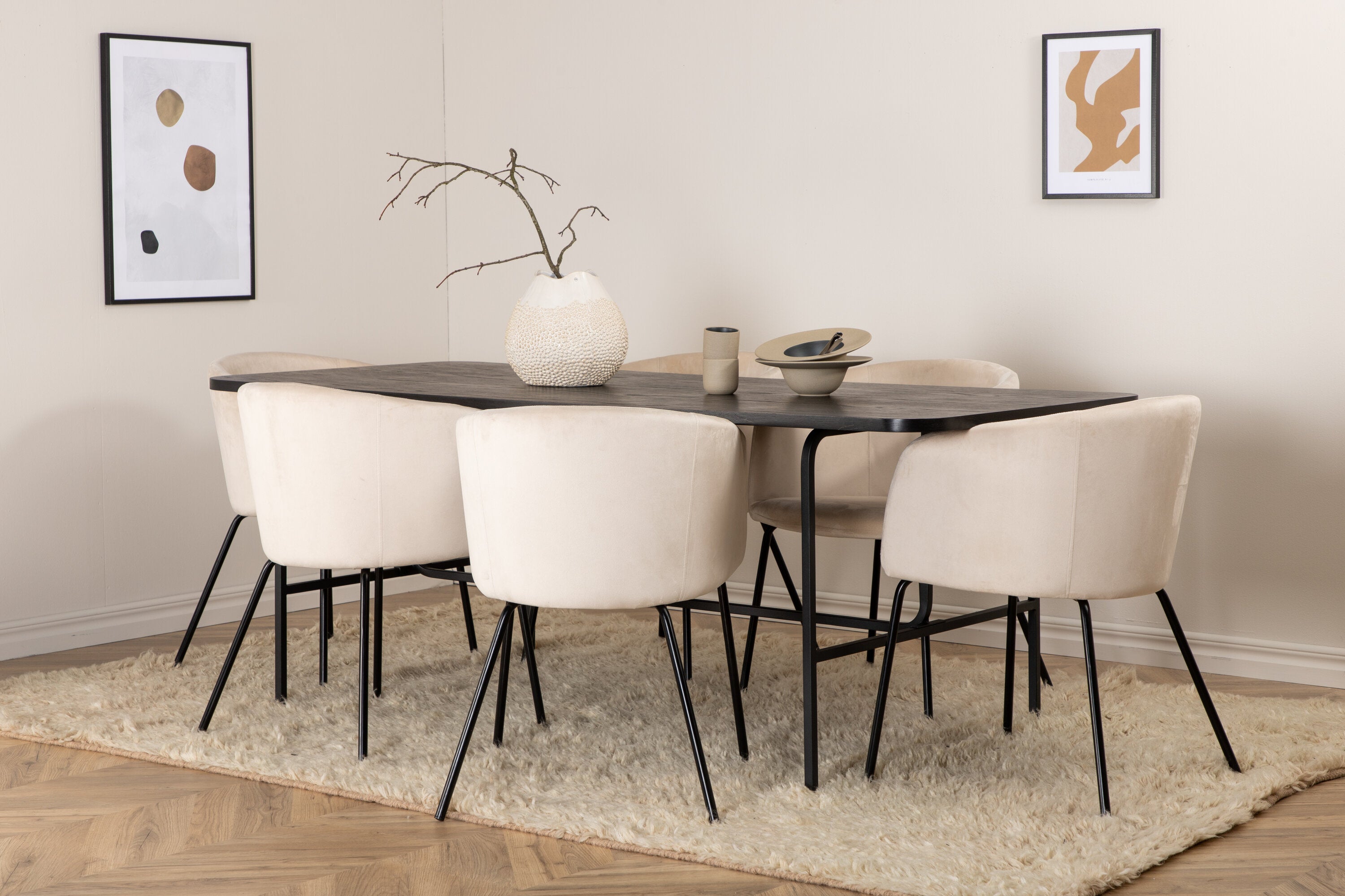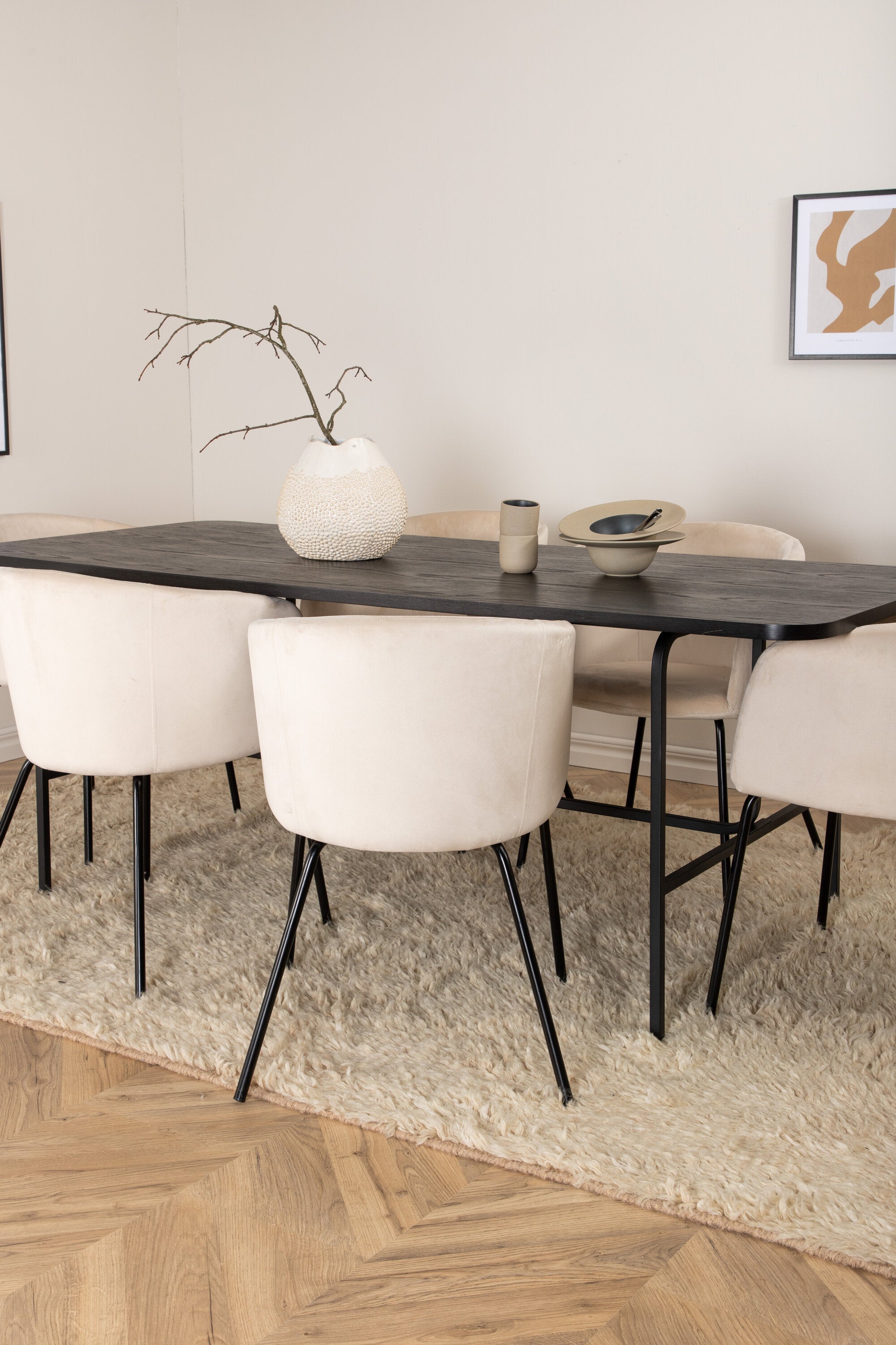 Náš oblíbený jídelní stůl Uno je stejně stylový jako nadčasový! Stůl je obdélníkového tvaru s lehce zaoblenými rohy, horní deskou z černé MDF s dýhou a stylovým podřezáním v černém kovu. Rozměry stolu: Délka: 200 cm, Šířka: 90 cm, Výška: 74 cm. Zde v dokonalé kombinaci se 6 jídelními židlemi Berit v béžové sametové látce a stylovými úzkými nohami židle z černého železa. Rozměry židle: výška: 78 cm, výška sedáku: 49 cm, šířka: 55 cm, hloubka: 55 cm. Skupina potravin zaměřená na pohodlí a eleganci!