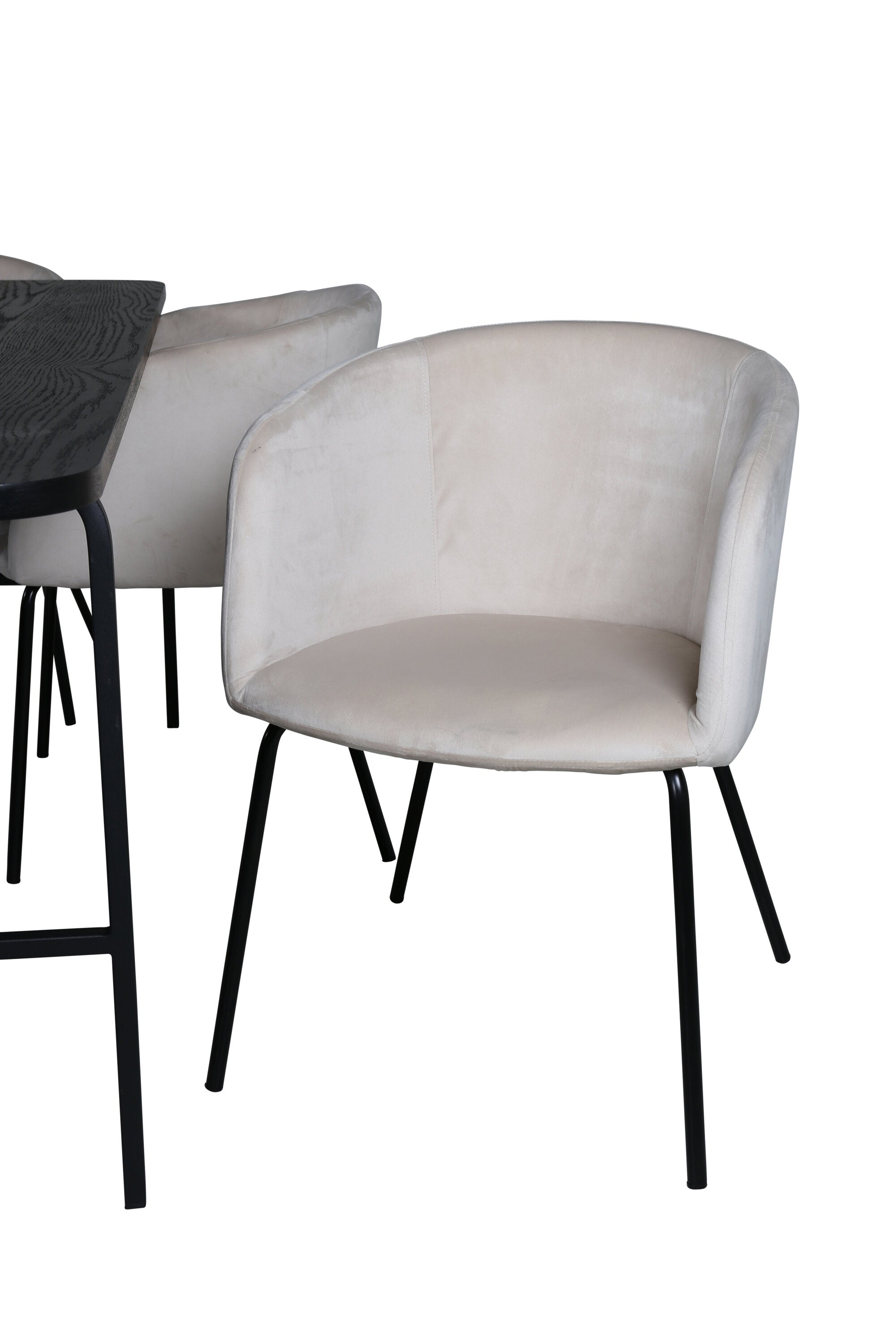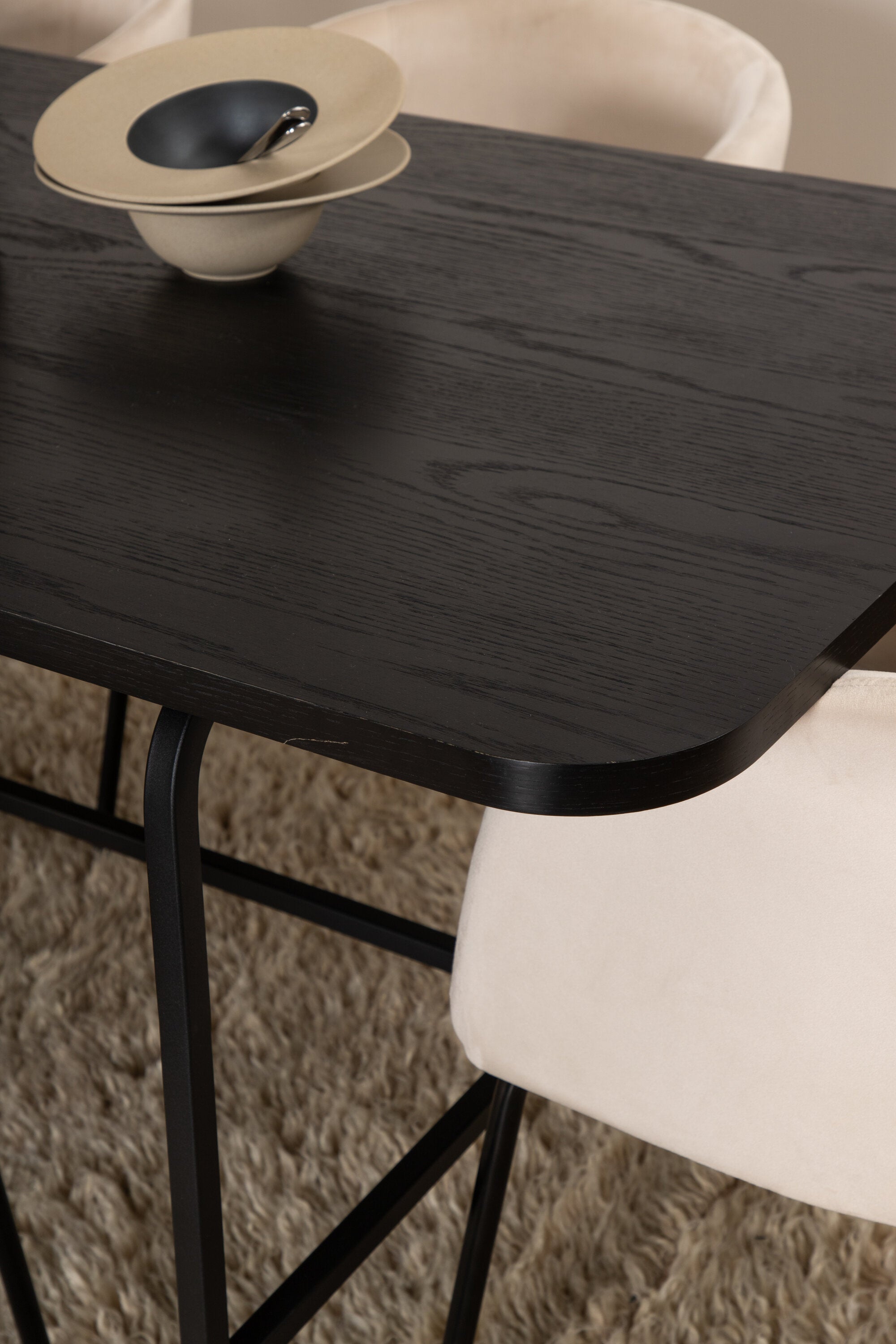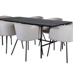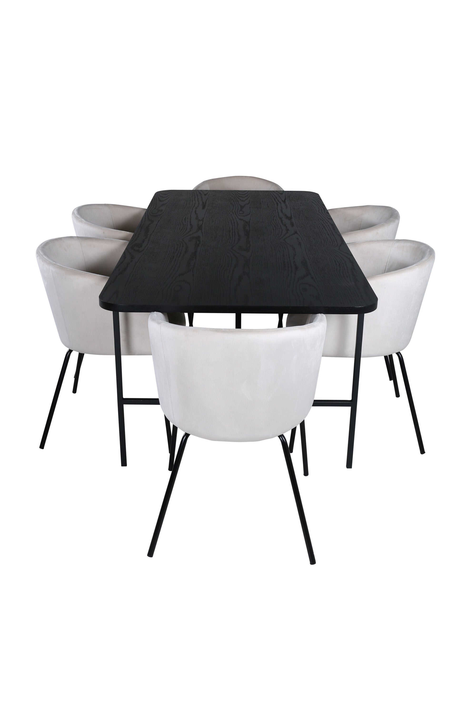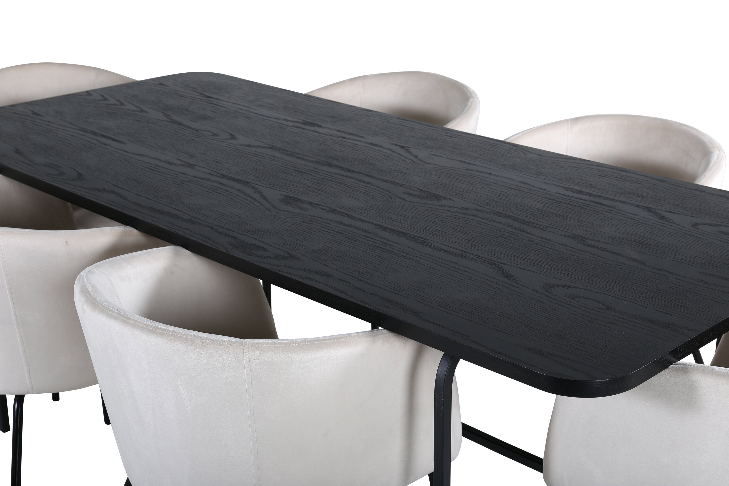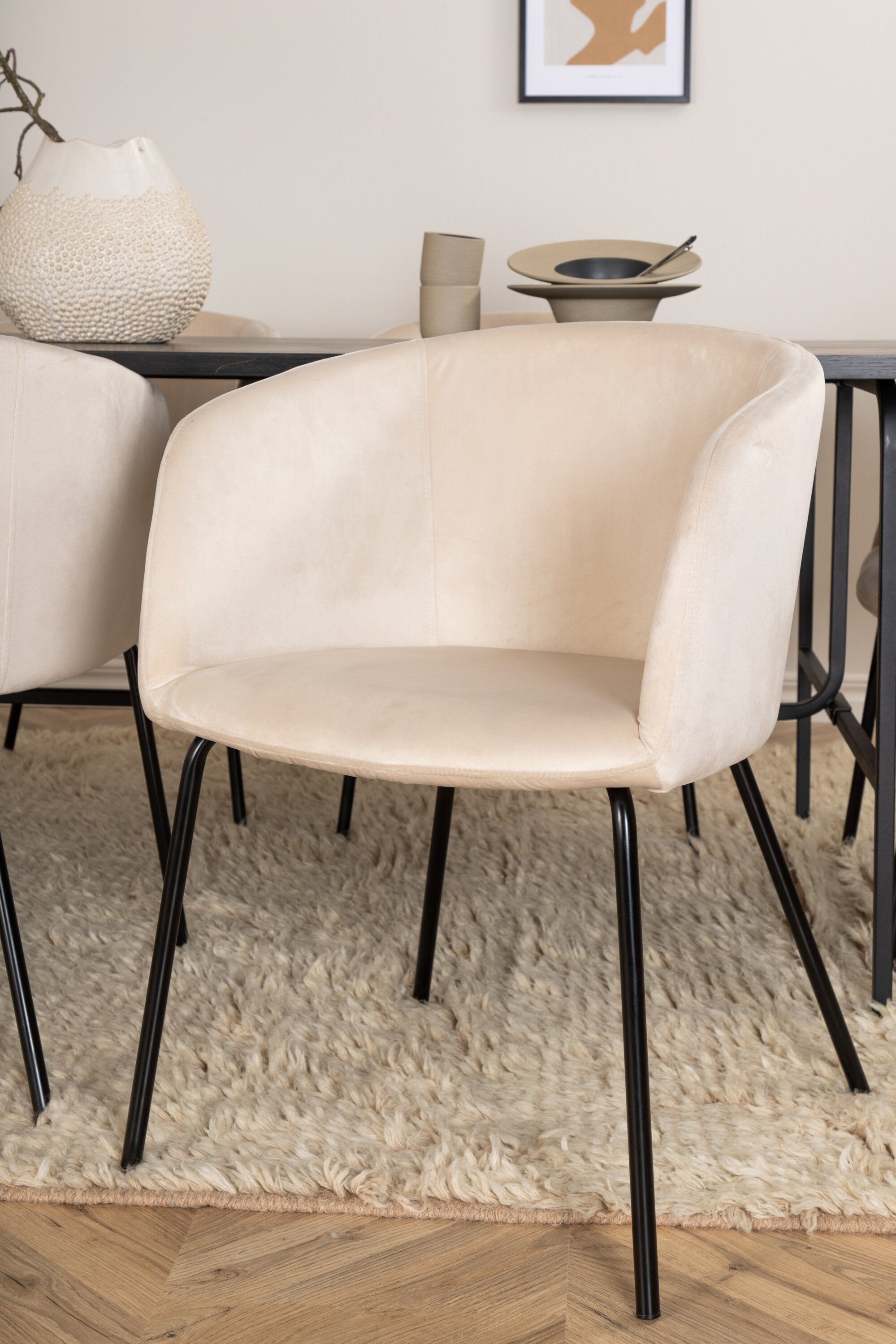 Náš oblíbený jídelní stůl Uno je stejně stylový jako nadčasový! Stůl je obdélníkového tvaru s lehce zaoblenými rohy, horní deskou z černé MDF s dýhou a stylovým podřezáním v černém kovu. Rozměry stolu: Délka: 200 cm, Šířka: 90 cm, Výška: 74 cm. Zde v dokonalé kombinaci se 6 jídelními židlemi Berit v béžové sametové látce a stylovými úzkými nohami židle z černého železa. Rozměry židle: výška: 78 cm, výška sedáku: 49 cm, šířka: 55 cm, hloubka: 55 cm. Skupina potravin zaměřená na pohodlí a eleganci!