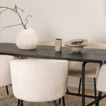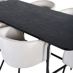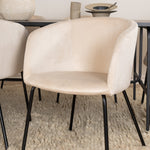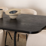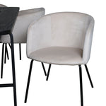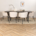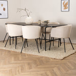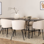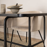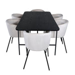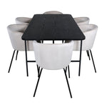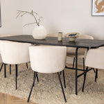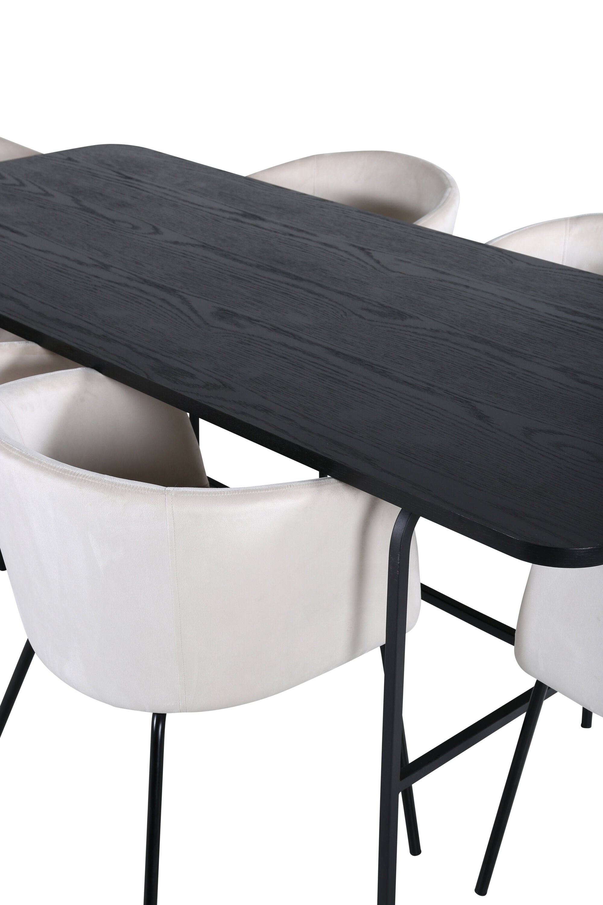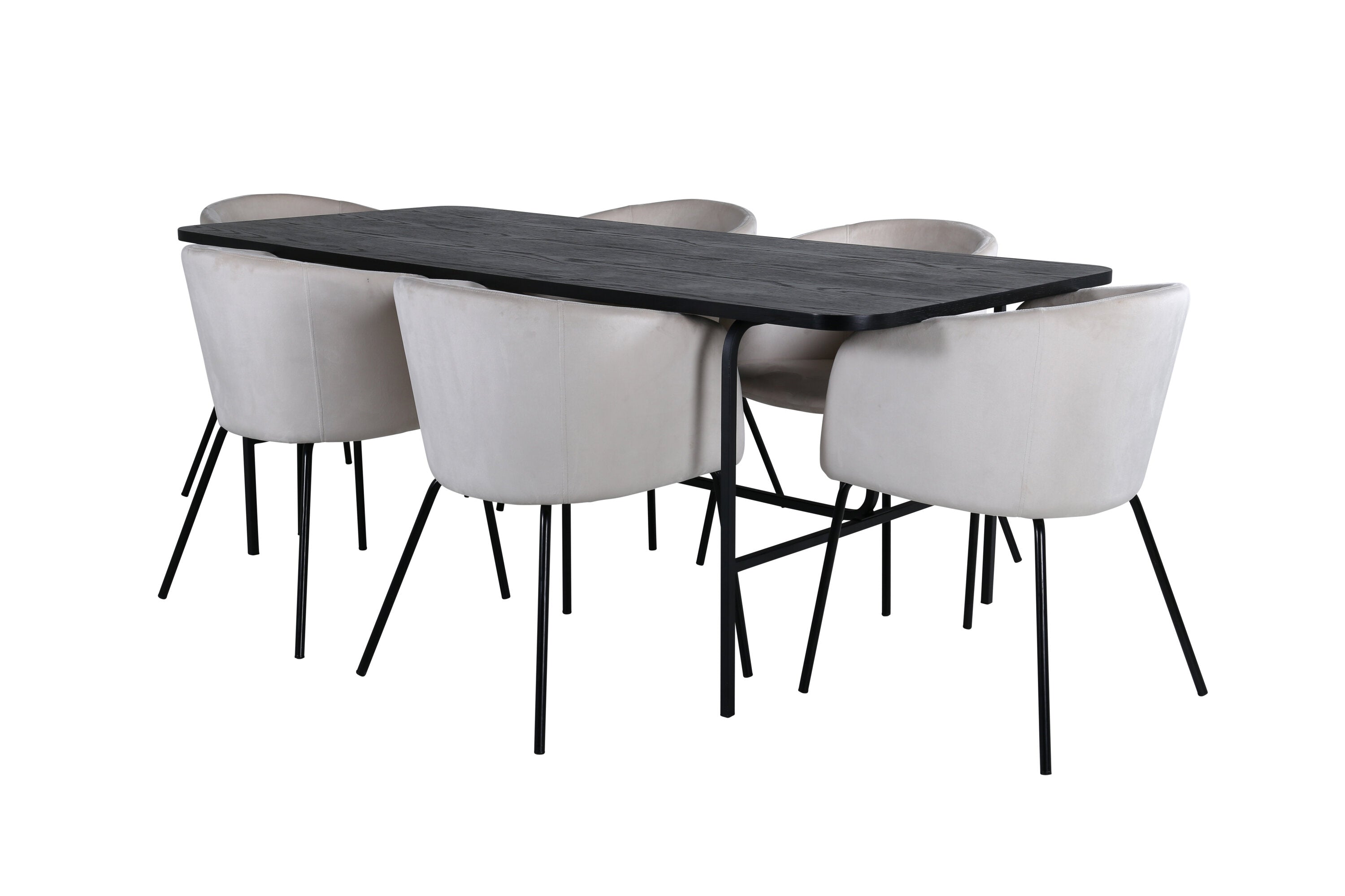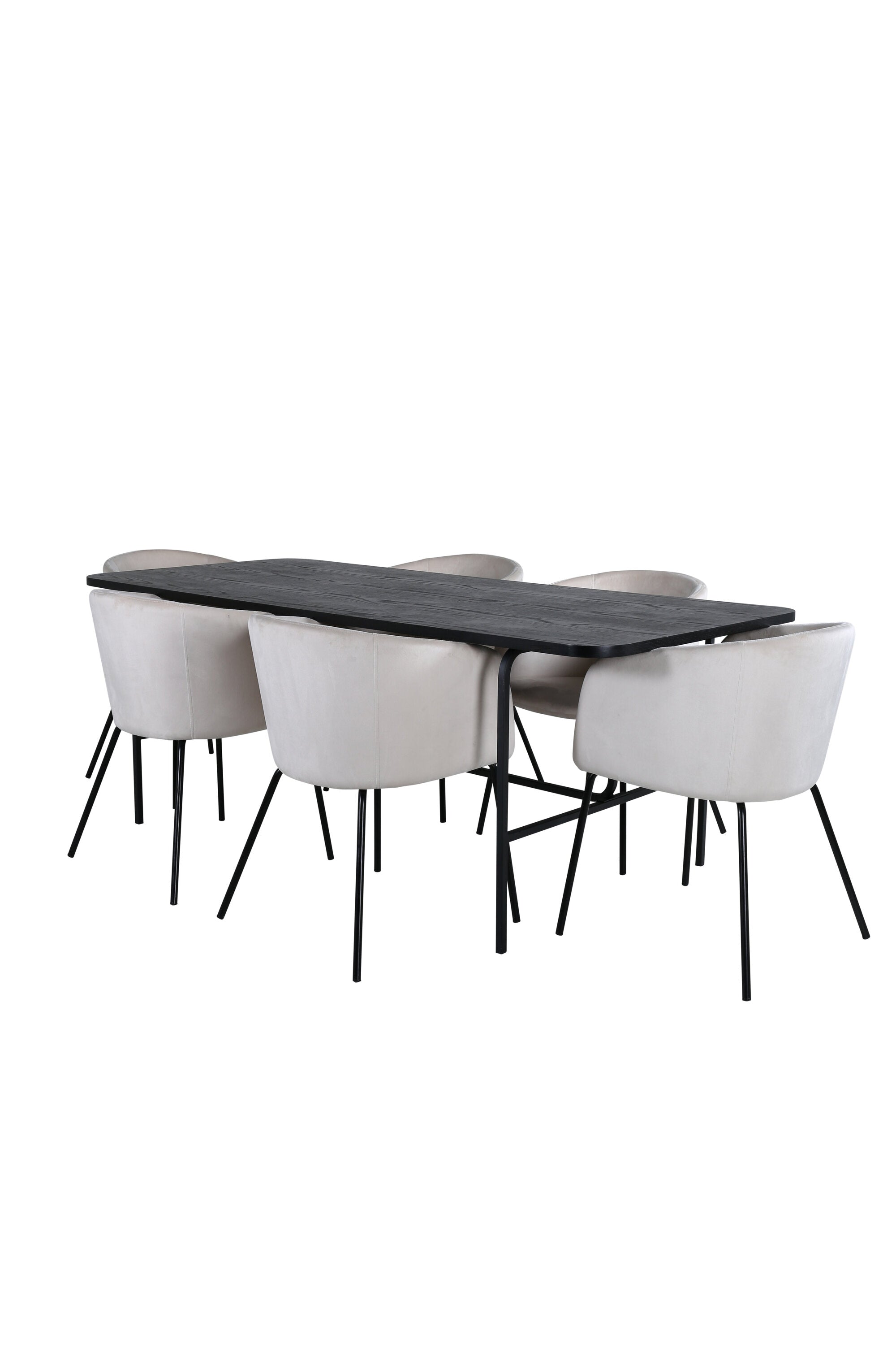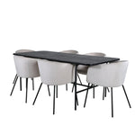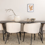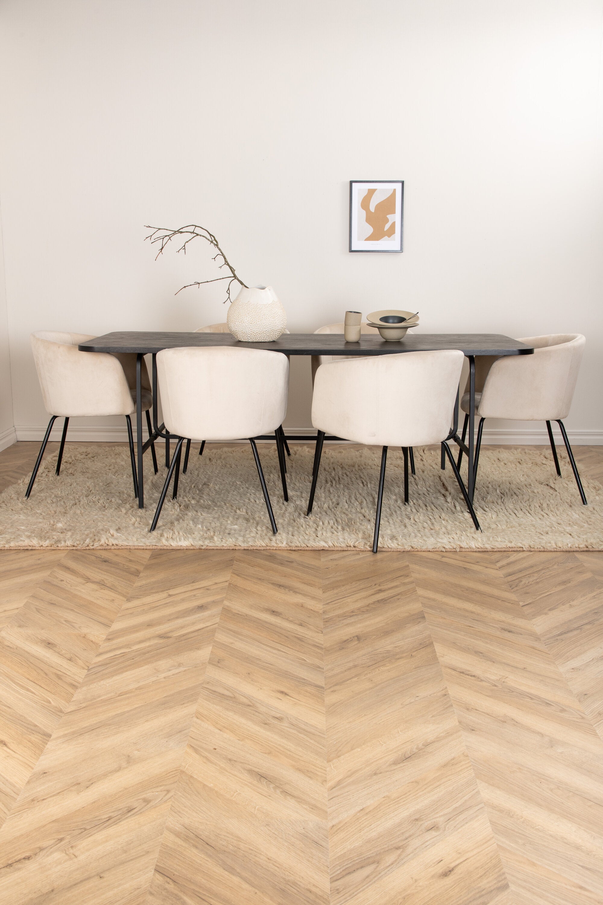 Náš oblíbený jídelní stůl Uno je stejně stylový jako nadčasový! Stůl je obdélníkového tvaru s lehce zaoblenými rohy, horní deskou z černé MDF s dýhou a stylovým podřezáním v černém kovu. Rozměry stolu: Délka: 200 cm, Šířka: 90 cm, Výška: 74 cm. Zde v dokonalé kombinaci se 6 jídelními židlemi Berit v béžové sametové látce a stylovými úzkými nohami židle z černého železa. Rozměry židle: výška: 78 cm, výška sedáku: 49 cm, šířka: 55 cm, hloubka: 55 cm. Skupina potravin zaměřená na pohodlí a eleganci!