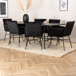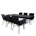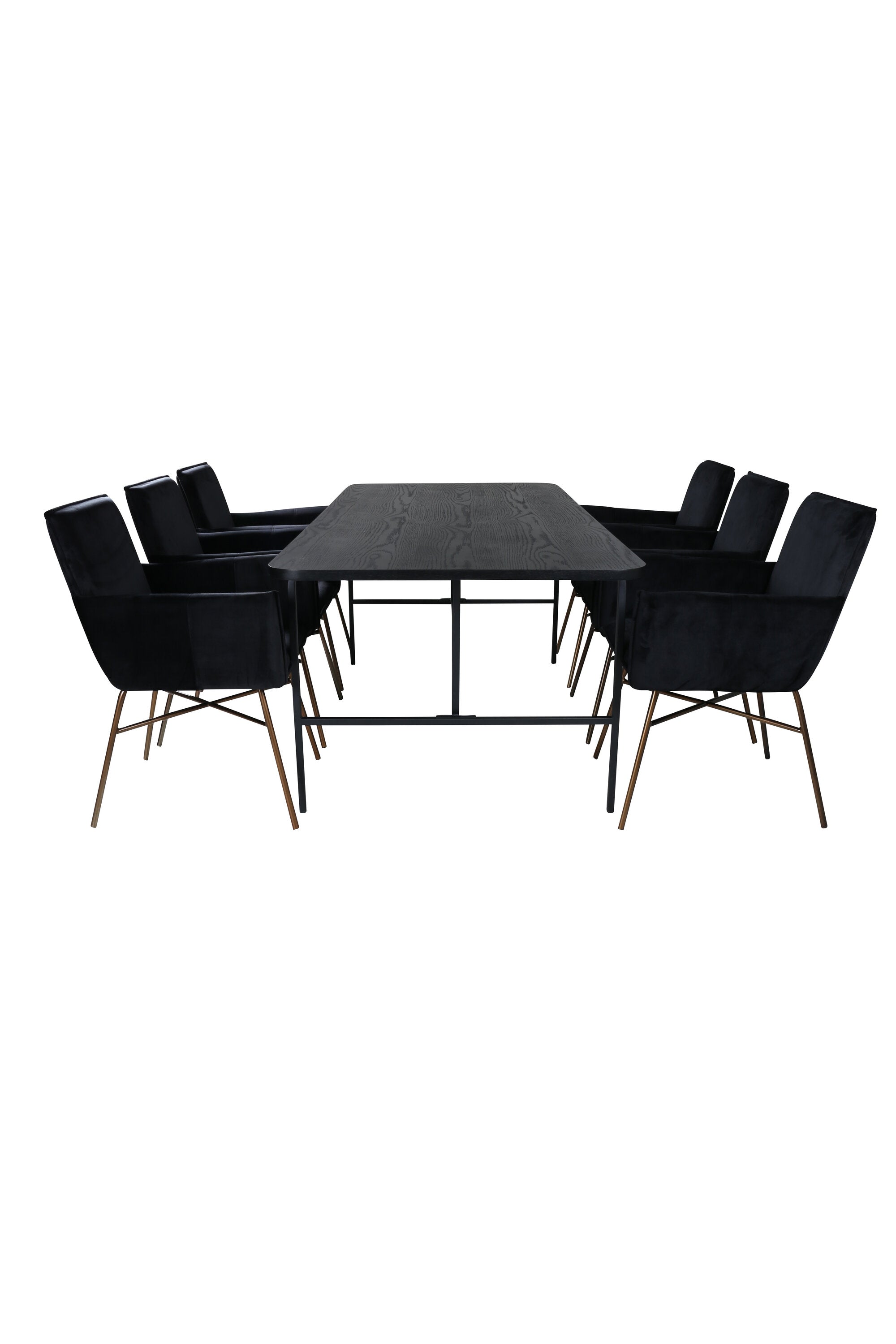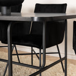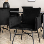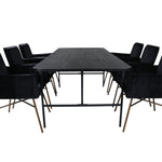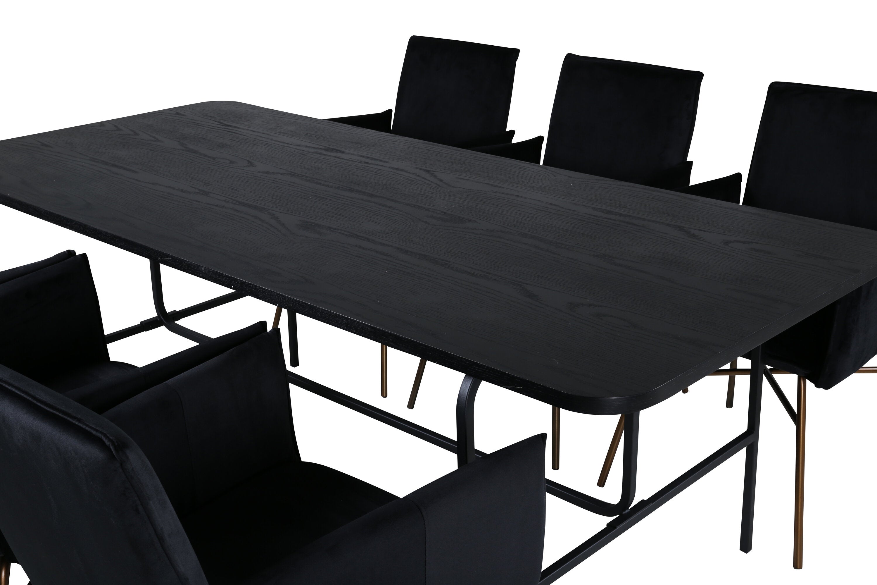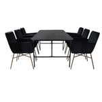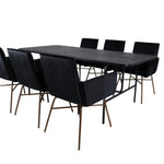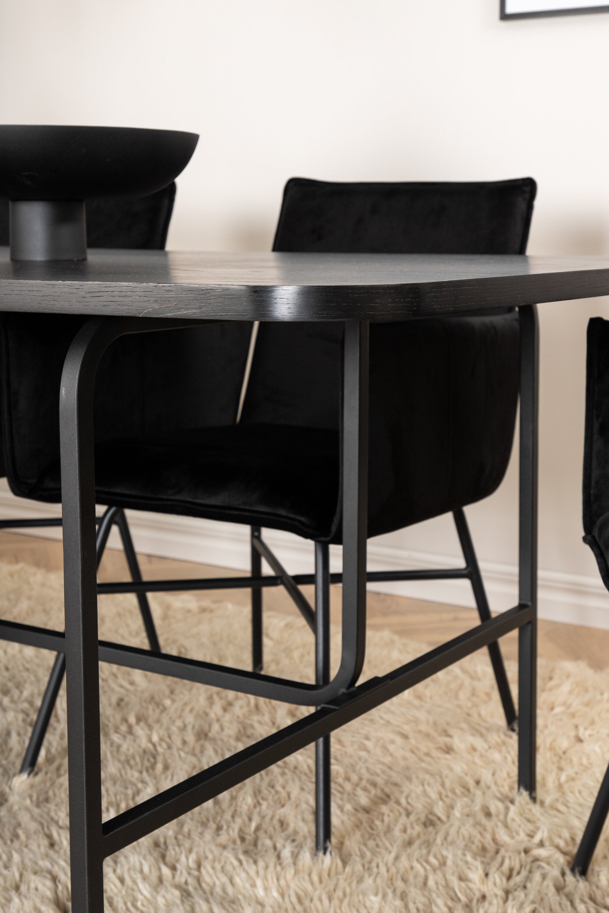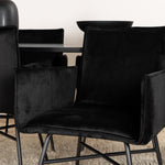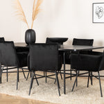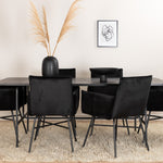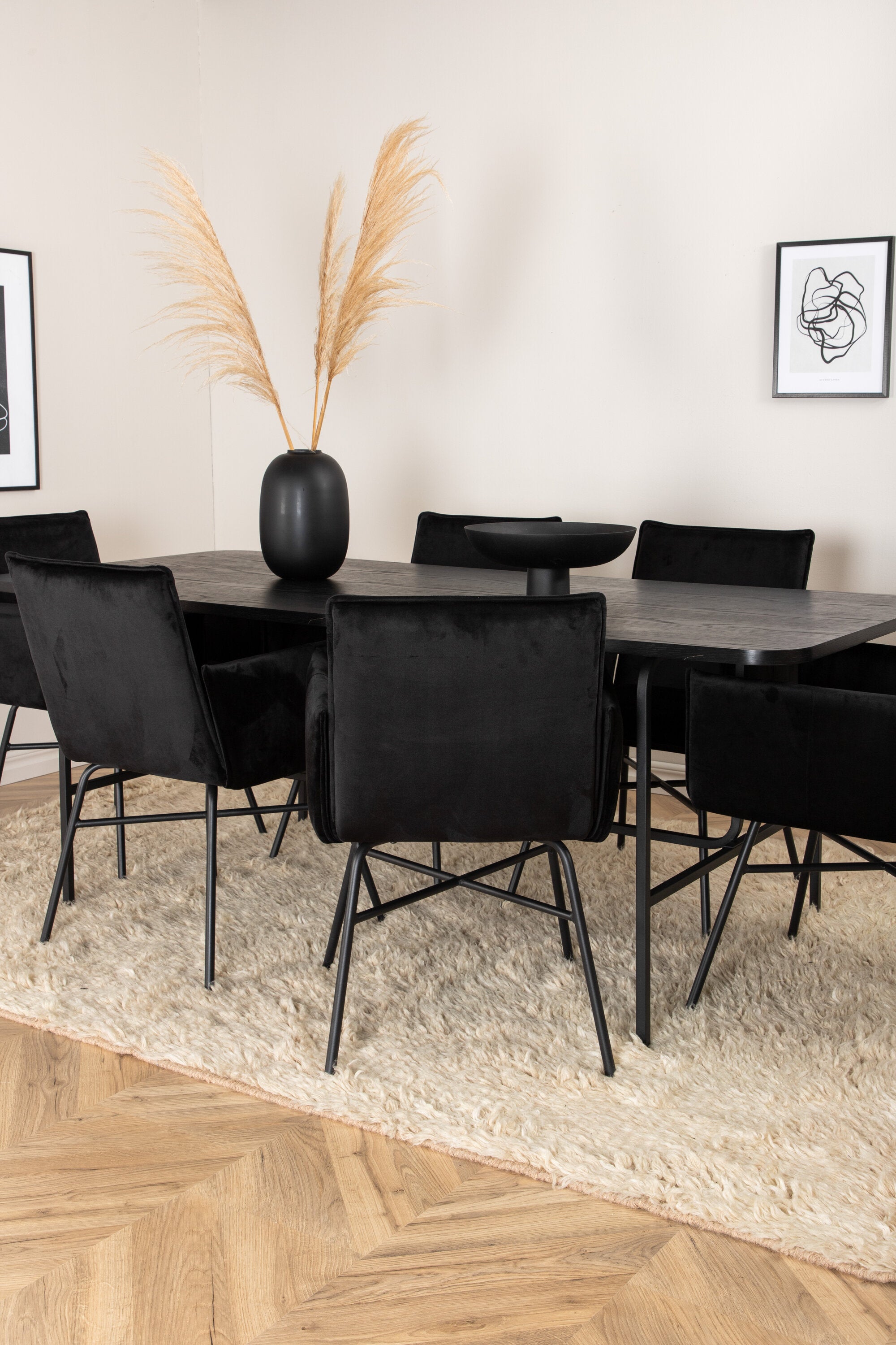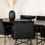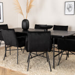 Konzistentní skupina černých potravin se zaměřením na pohodlí a eleganci! Jídelní stůl Uno má obdélníkový design s lehce zaoblenými rohy, horní deskou z černé MDF s dýhou a stylovým podvozkem v černém kovu. Rozměry stolu: Délka: 200 cm, Šířka: 90 cm, Výška: 74 cm. Zde v kombinaci se 6 jídelními židlemi Petra v černé sametové látce a nohami židle ze železa. Rozměry židle: Výška: 87 cm, výška sedáku: 48 cm, šířka: 57 cm, hloubka: 60 cm. Vysoký komfort křesel vybízí ke společnému dlouhému příjemnému stolování.