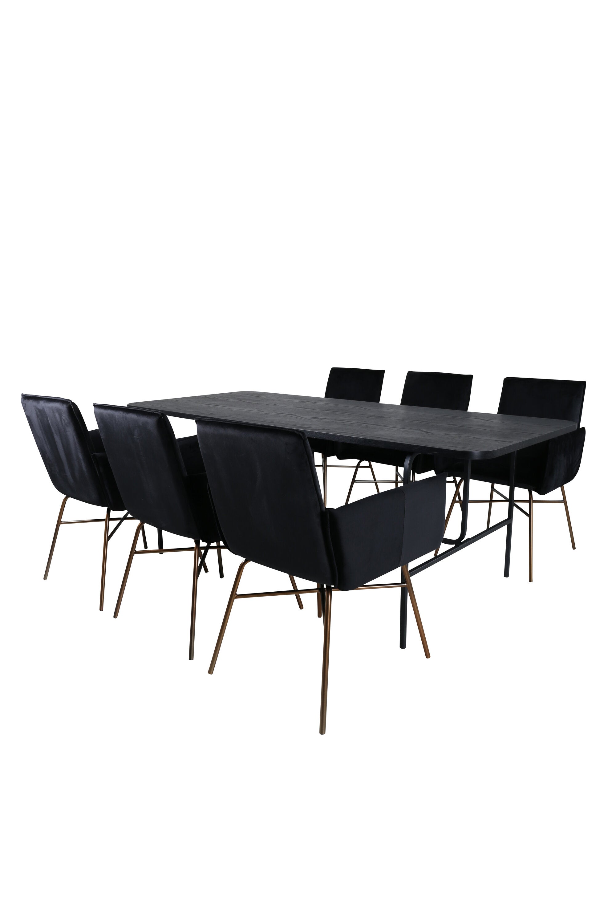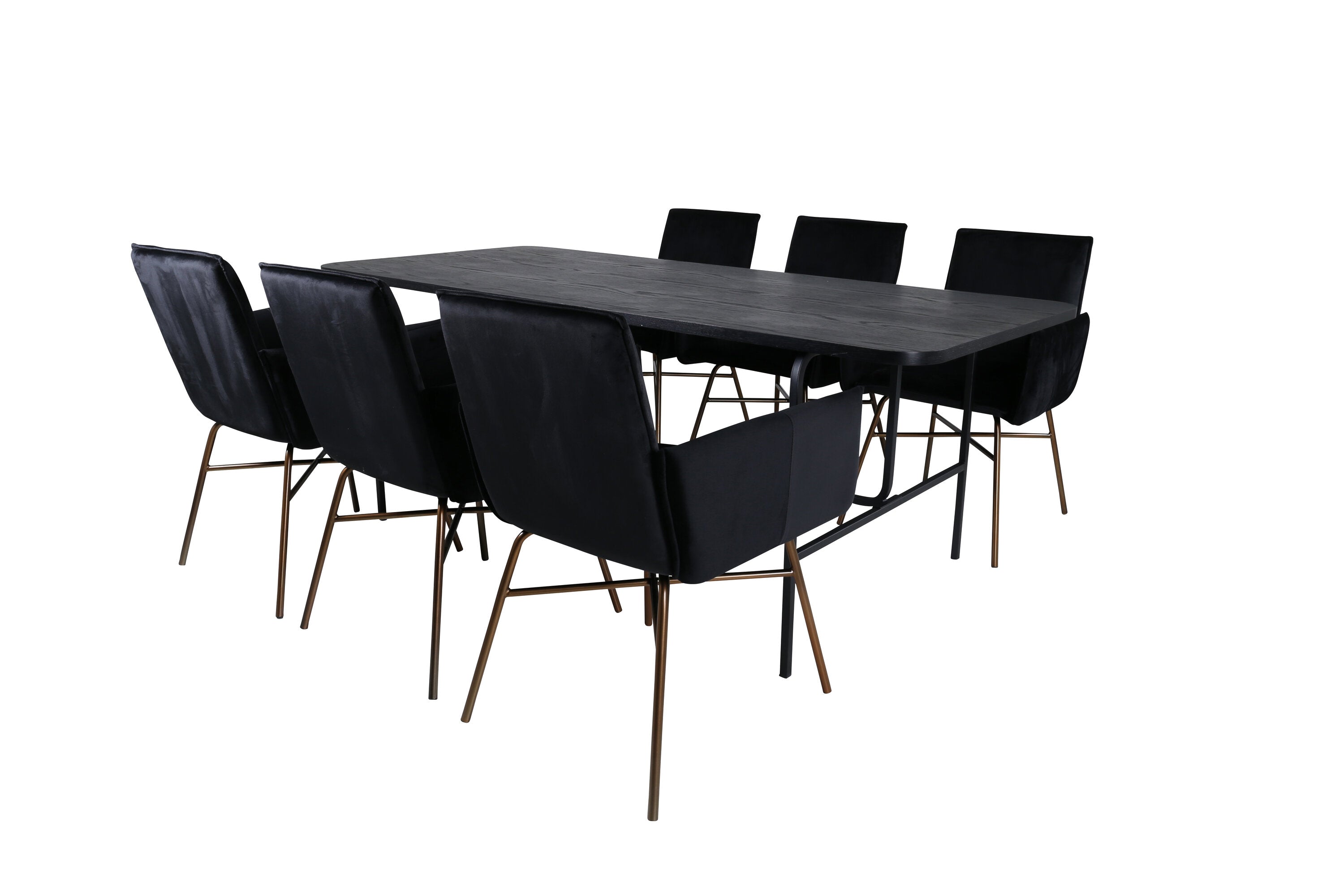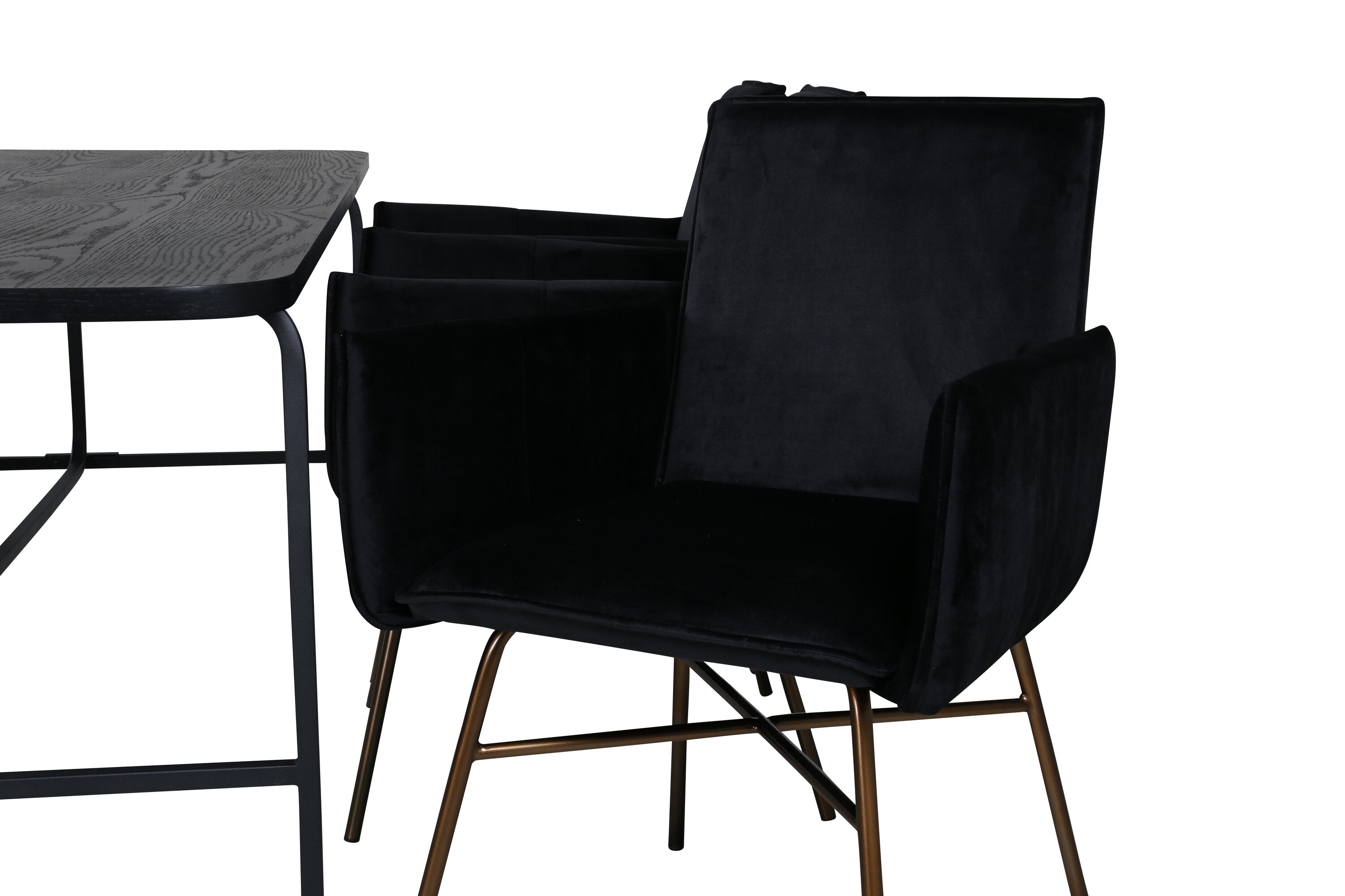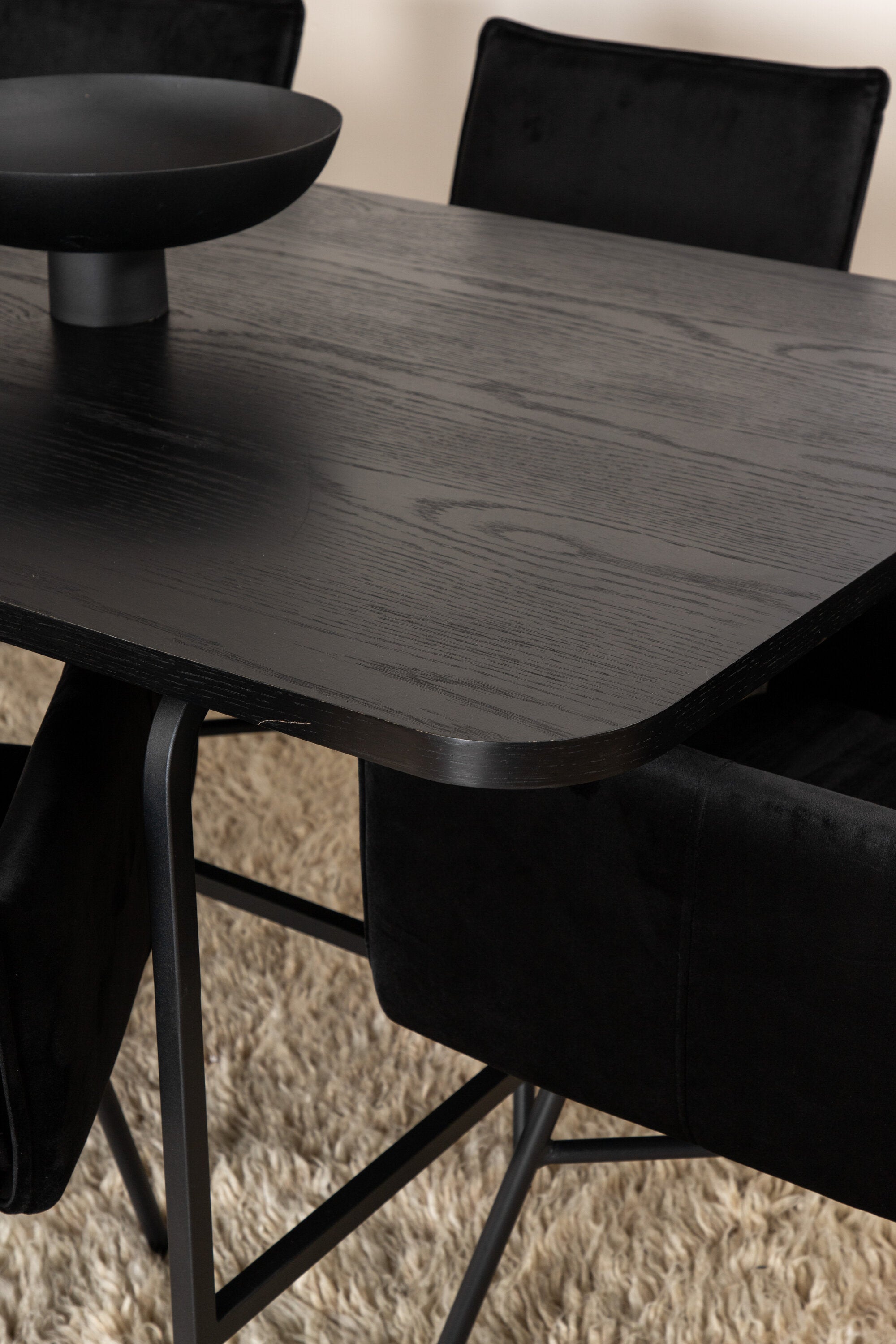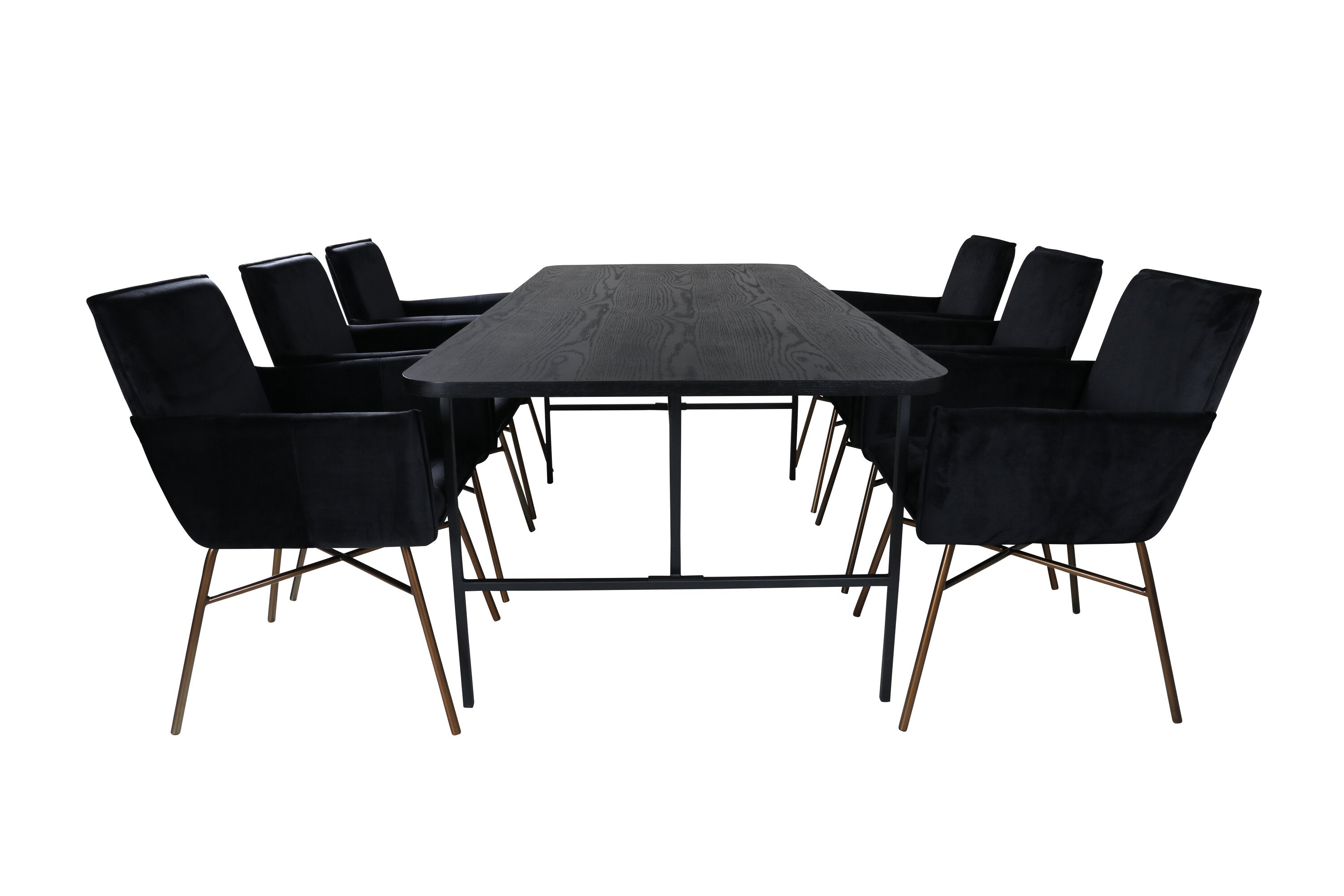 Konzistentní skupina černých potravin se zaměřením na pohodlí a eleganci! Jídelní stůl Uno má obdélníkový design s lehce zaoblenými rohy, horní deskou z černé MDF s dýhou a stylovým podvozkem v černém kovu. Rozměry stolu: Délka: 200 cm, Šířka: 90 cm, Výška: 74 cm. Zde v kombinaci se 6 jídelními židlemi Petra v černé sametové látce a nohami židle ze železa. Rozměry židle: Výška: 87 cm, výška sedáku: 48 cm, šířka: 57 cm, hloubka: 60 cm. Vysoký komfort křesel vybízí ke společnému dlouhému příjemnému stolování.
