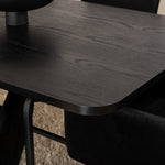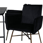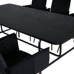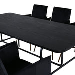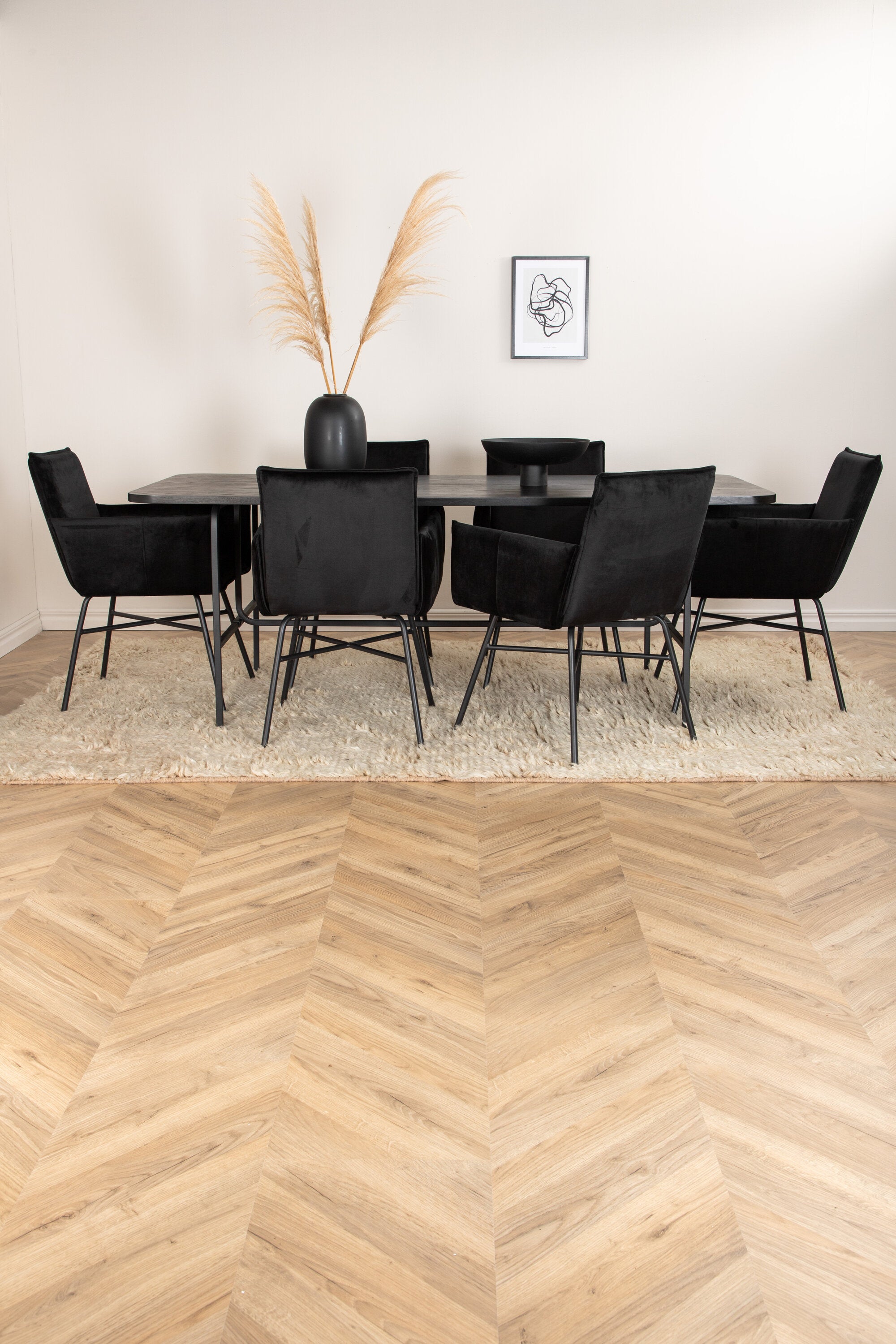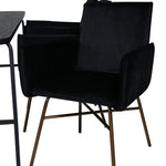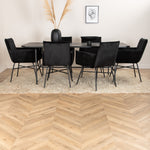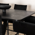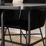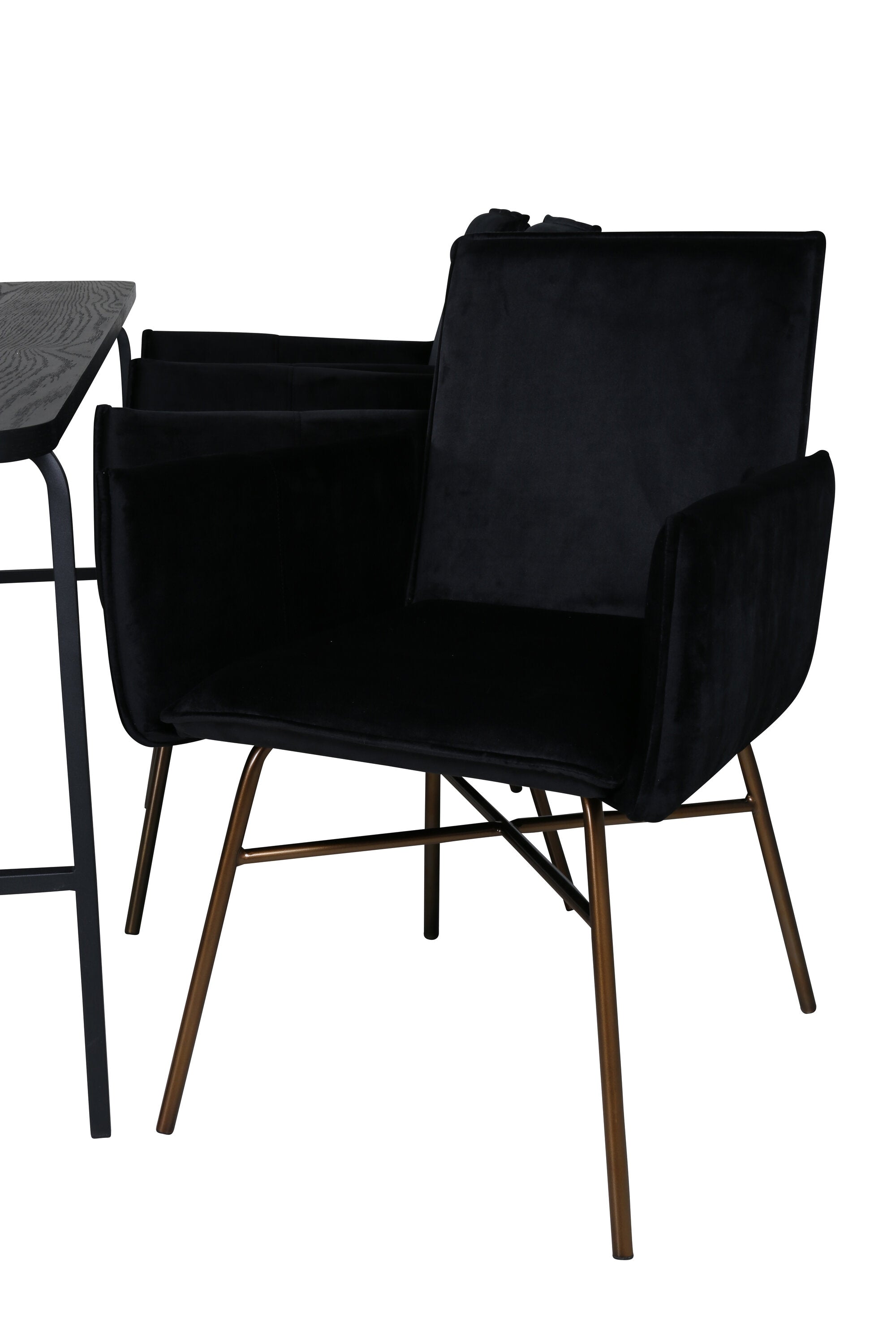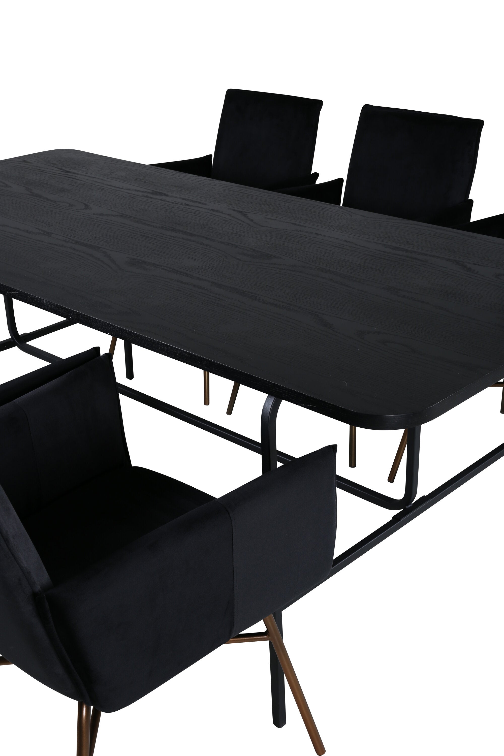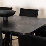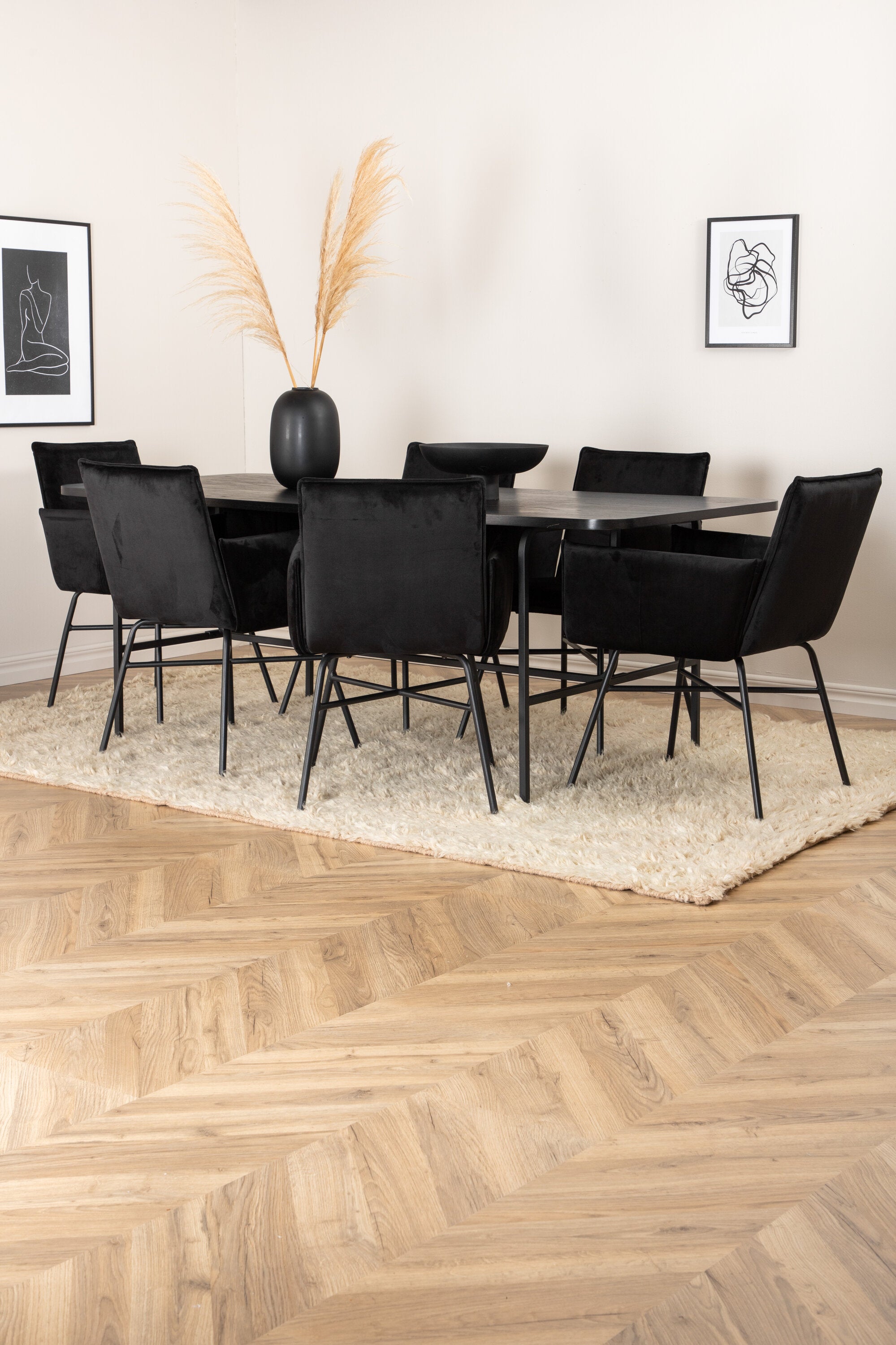 Konzistentní skupina černých potravin se zaměřením na pohodlí a eleganci! Jídelní stůl Uno má obdélníkový design s lehce zaoblenými rohy, horní deskou z černé MDF s dýhou a stylovým podvozkem v černém kovu. Rozměry stolu: Délka: 200 cm, Šířka: 90 cm, Výška: 74 cm. Zde v kombinaci se 6 jídelními židlemi Petra v černé sametové látce a nohami židle ze železa. Rozměry židle: Výška: 87 cm, výška sedáku: 48 cm, šířka: 57 cm, hloubka: 60 cm. Vysoký komfort křesel vybízí ke společnému dlouhému příjemnému stolování.