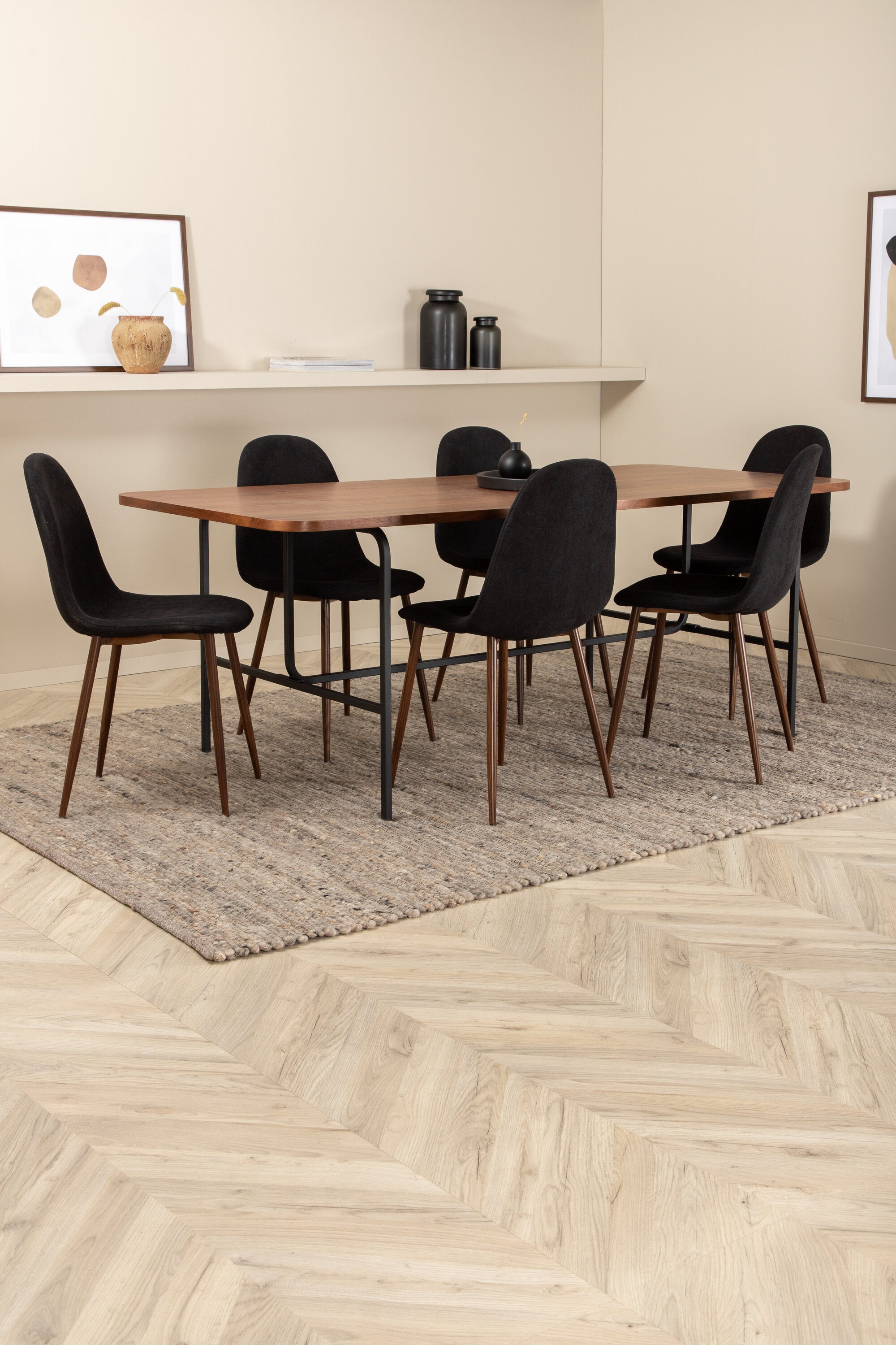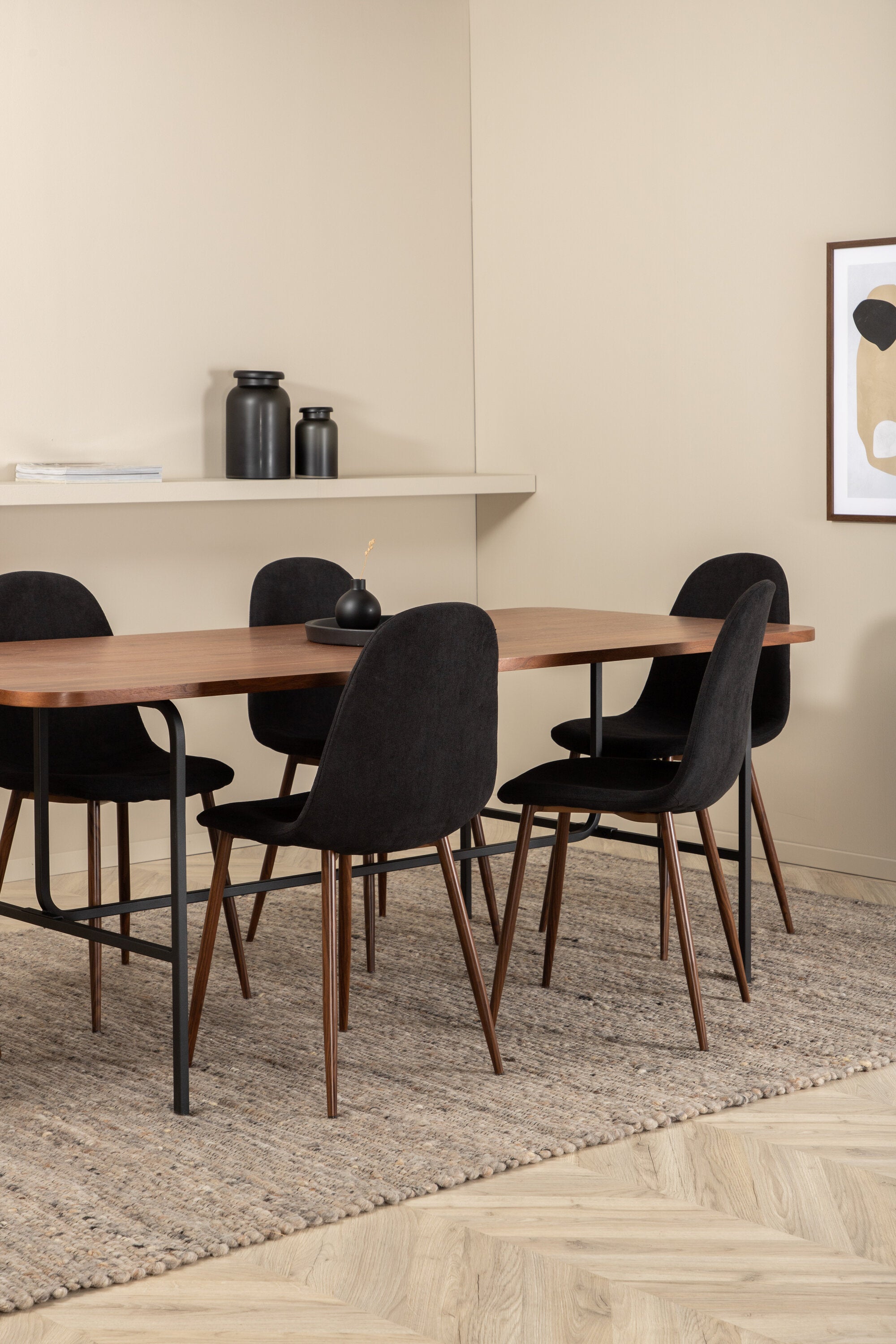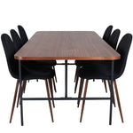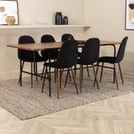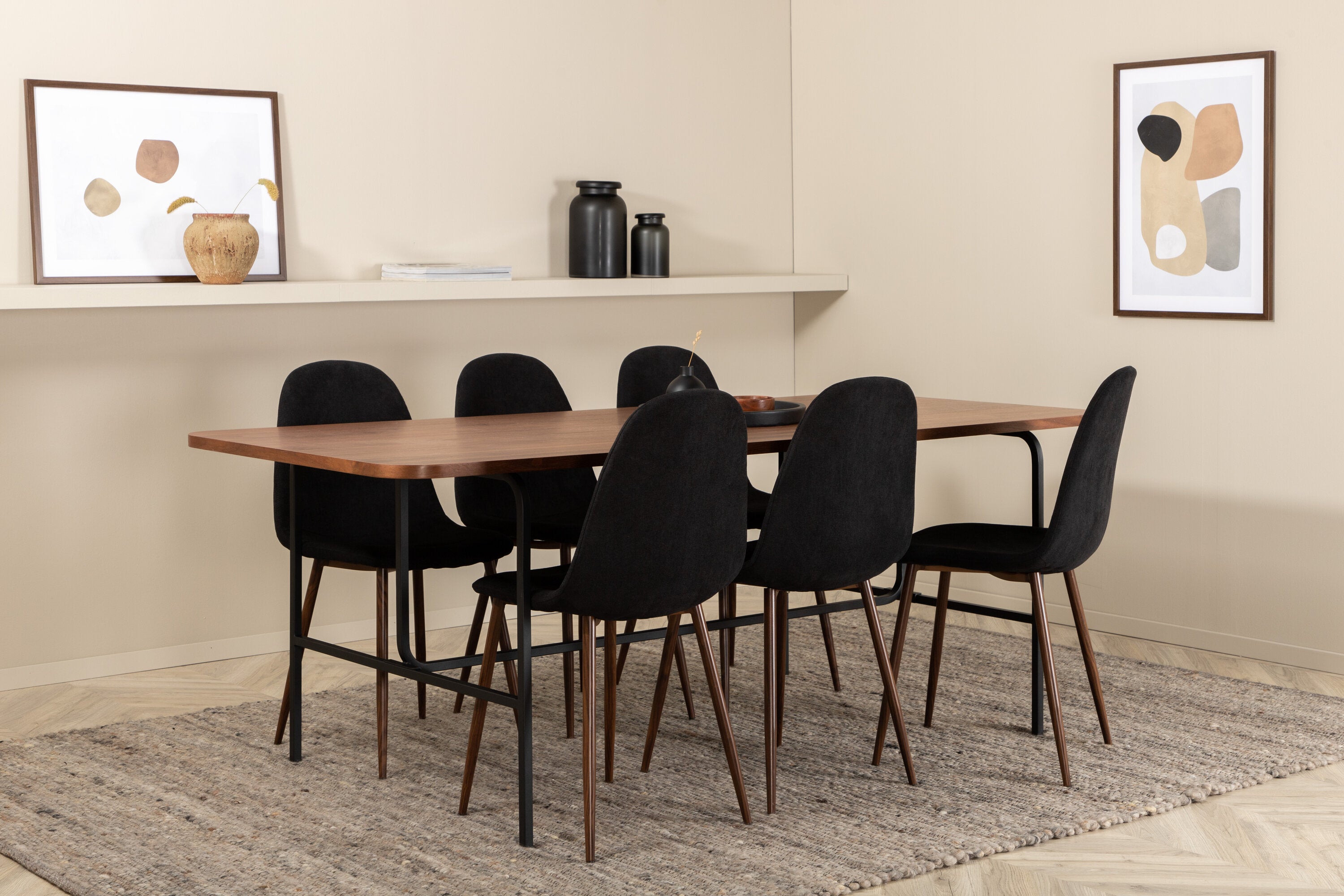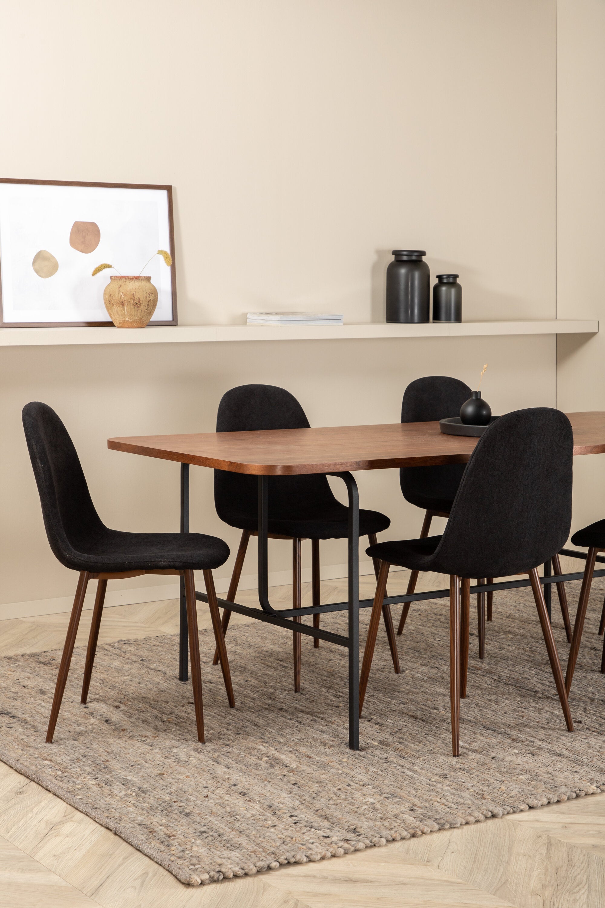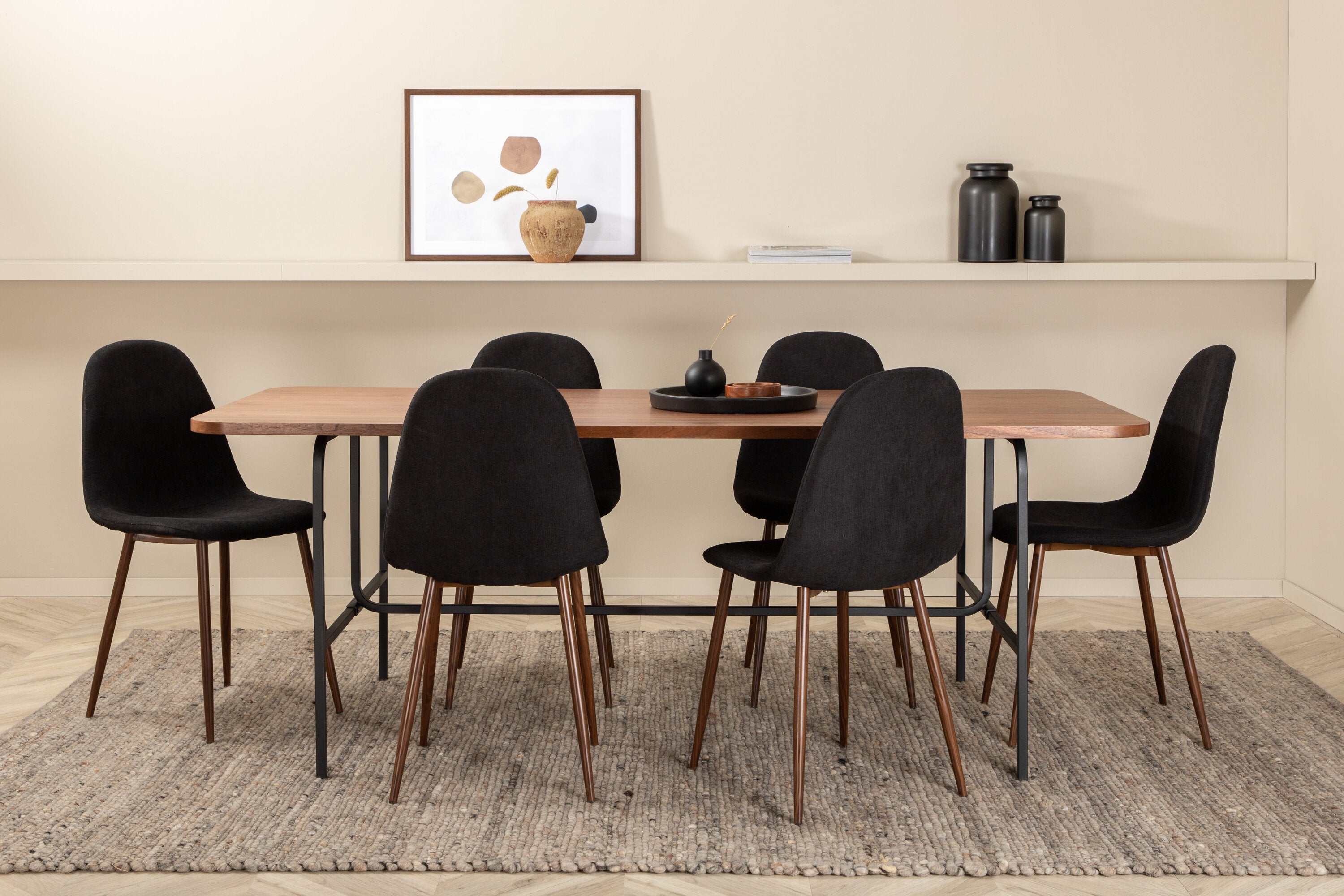 Zvyšte úroveň designu interiéru v obývacím pokoji pomocí lahodné sladěné skupiny jídel v moderních barvách! Jídelní stůl Uno má obdélníkový design s lehce zaoblenými rohy, horní deskou z MDF v barvě ořechu s dýhou a stylovým podvozkem v černém kovu. Rozměry stolu: Délka: 200 cm, Šířka: 90 cm, Výška: 74 cm. Zde spolu se 6 jídelními židlemi Polar v klasickém designu. Nohy židle jsou z kovu v barvě ořechu a sedák z černé polyesterové tkaniny. Rozměry židle: Výška: 87 cm, výška sedáku: 45,5 cm, šířka: 44 cm, hloubka: 53 cm. Nákup předem sestavené skupiny potravin je jak trendově bezpečný, tak praktický!