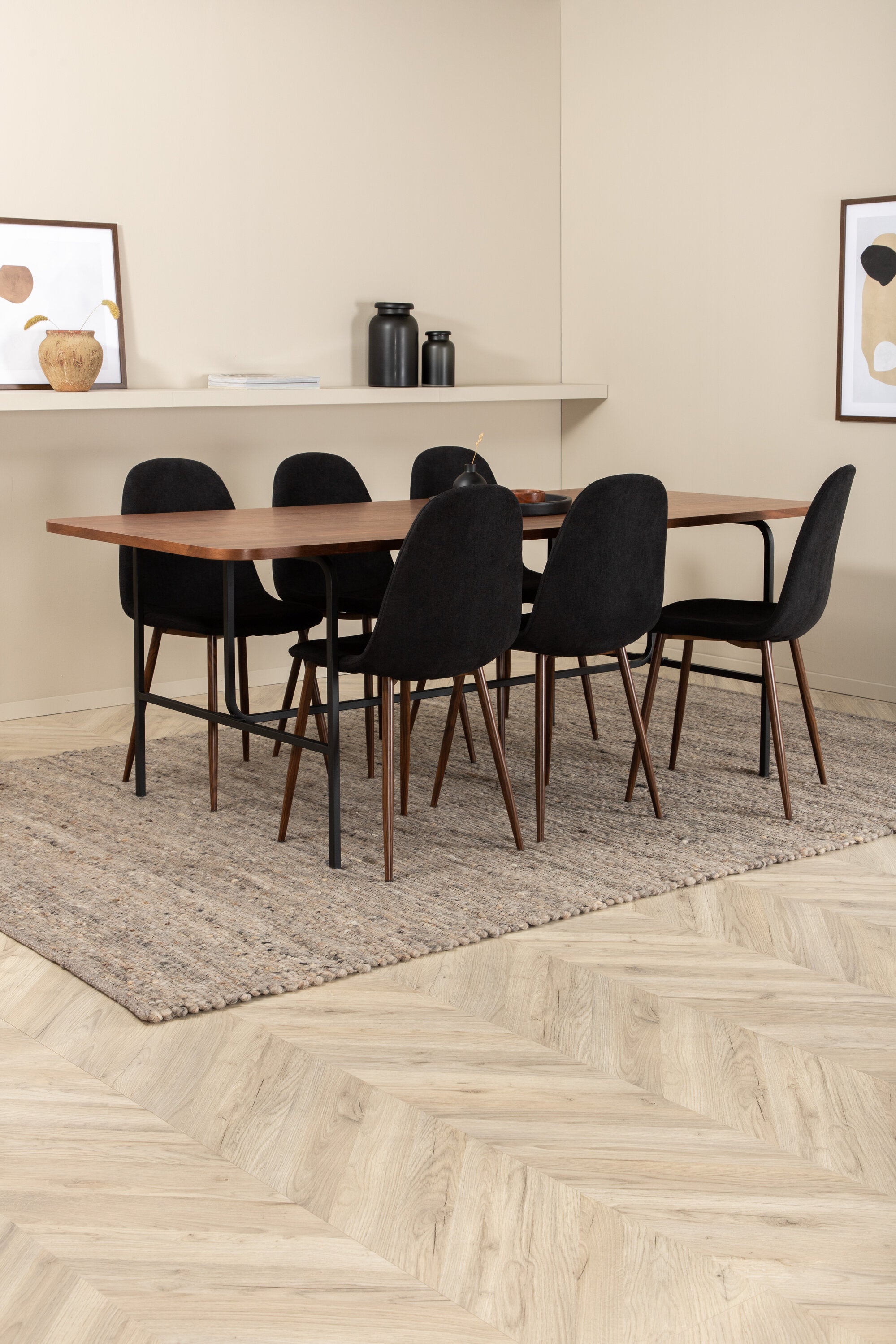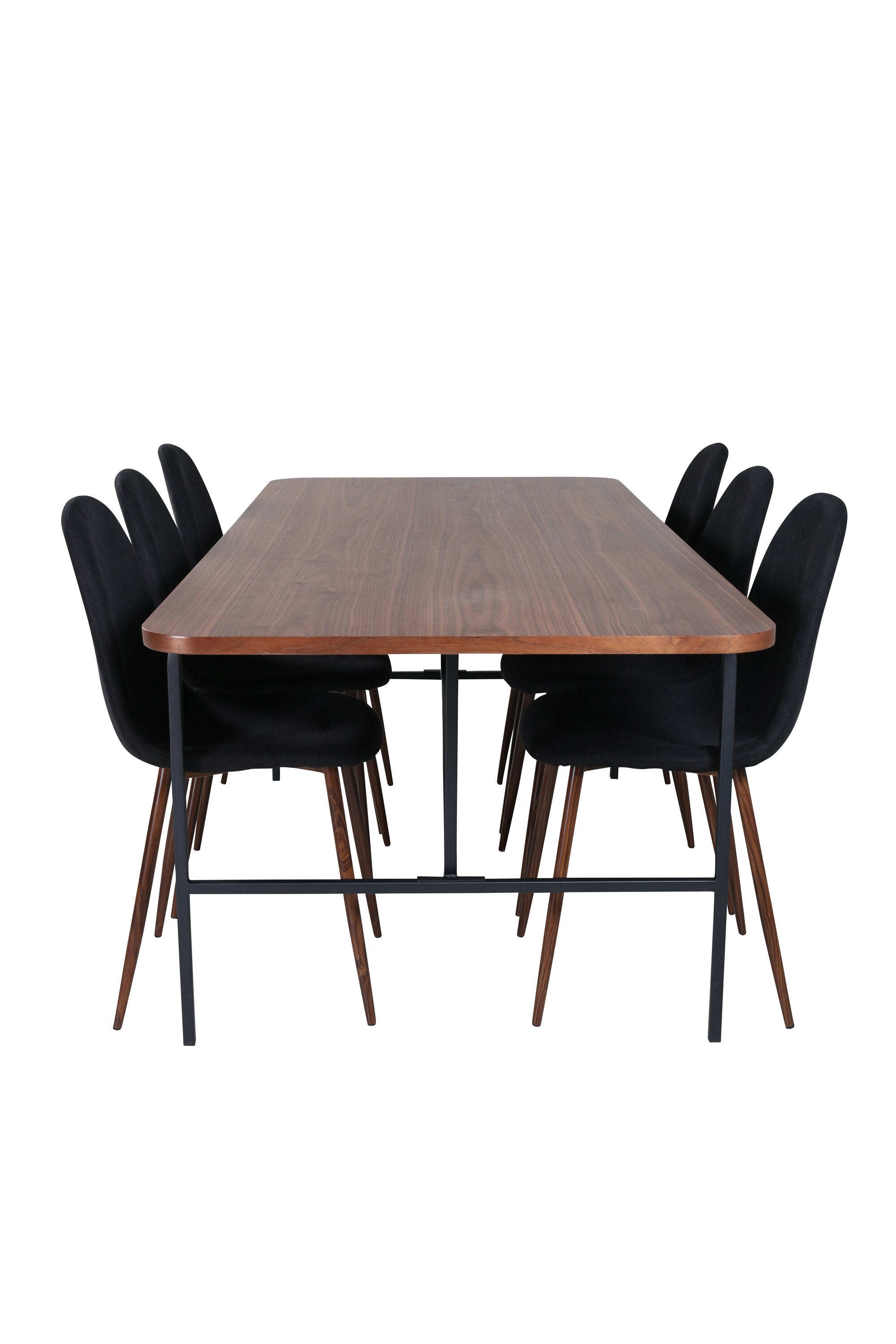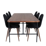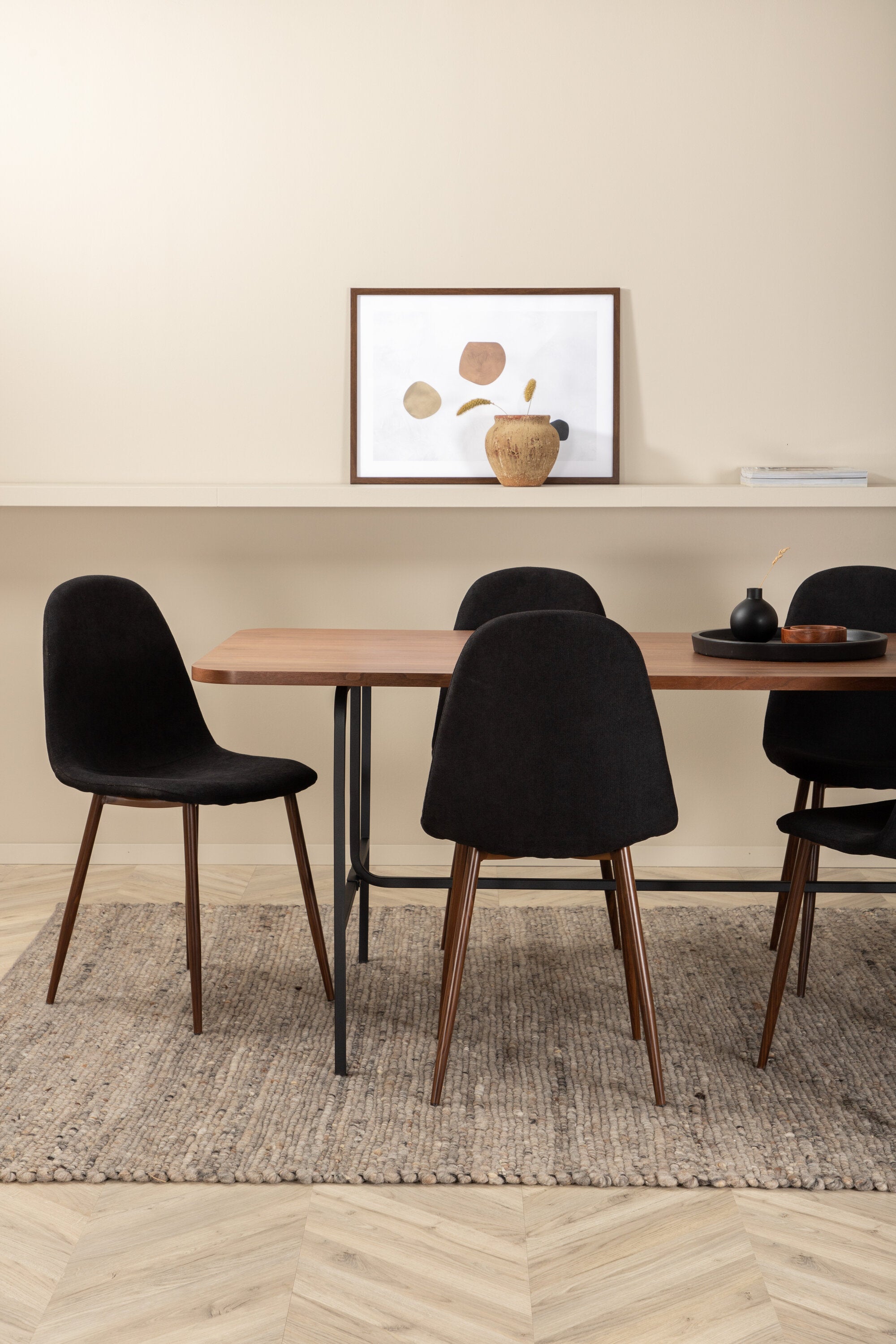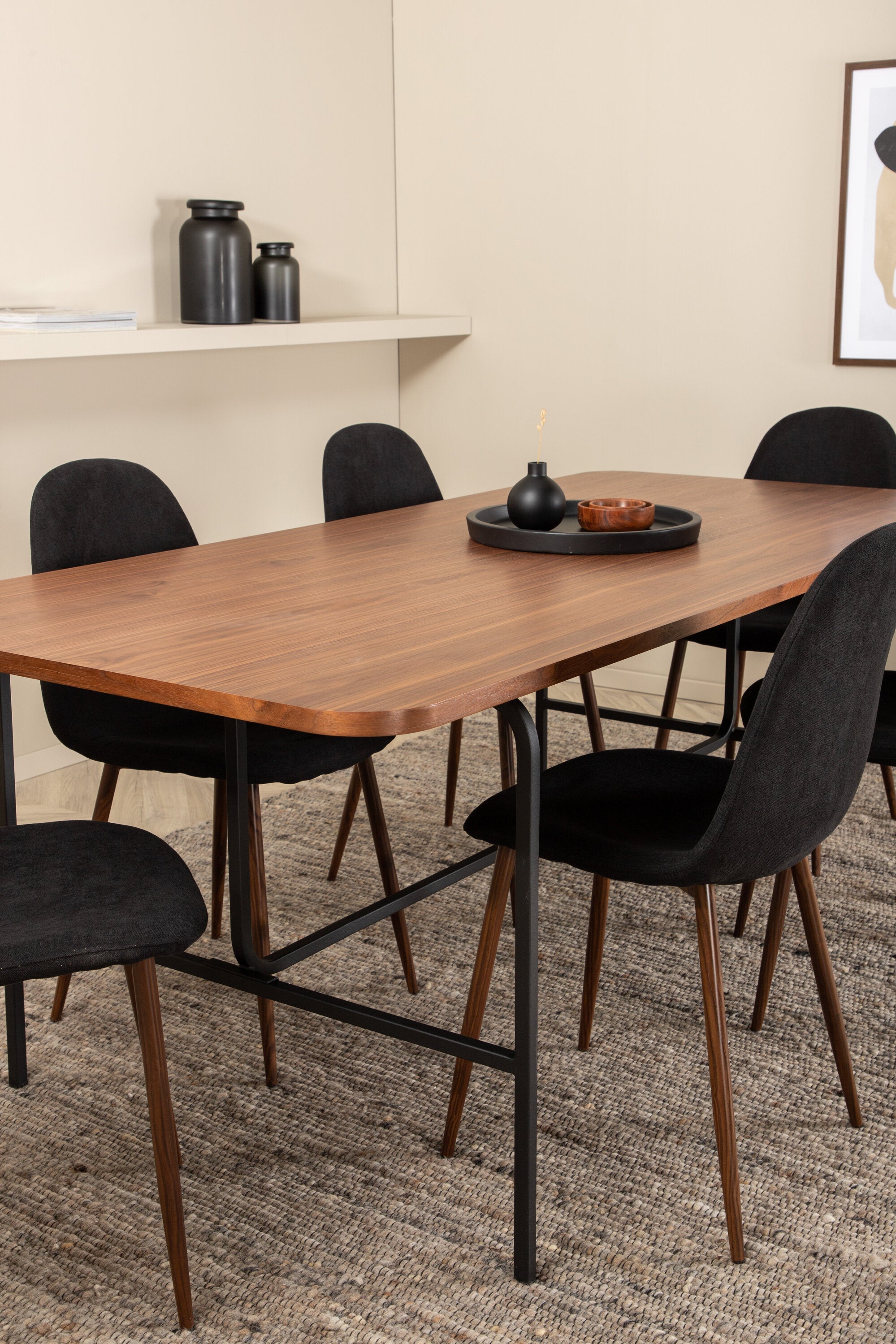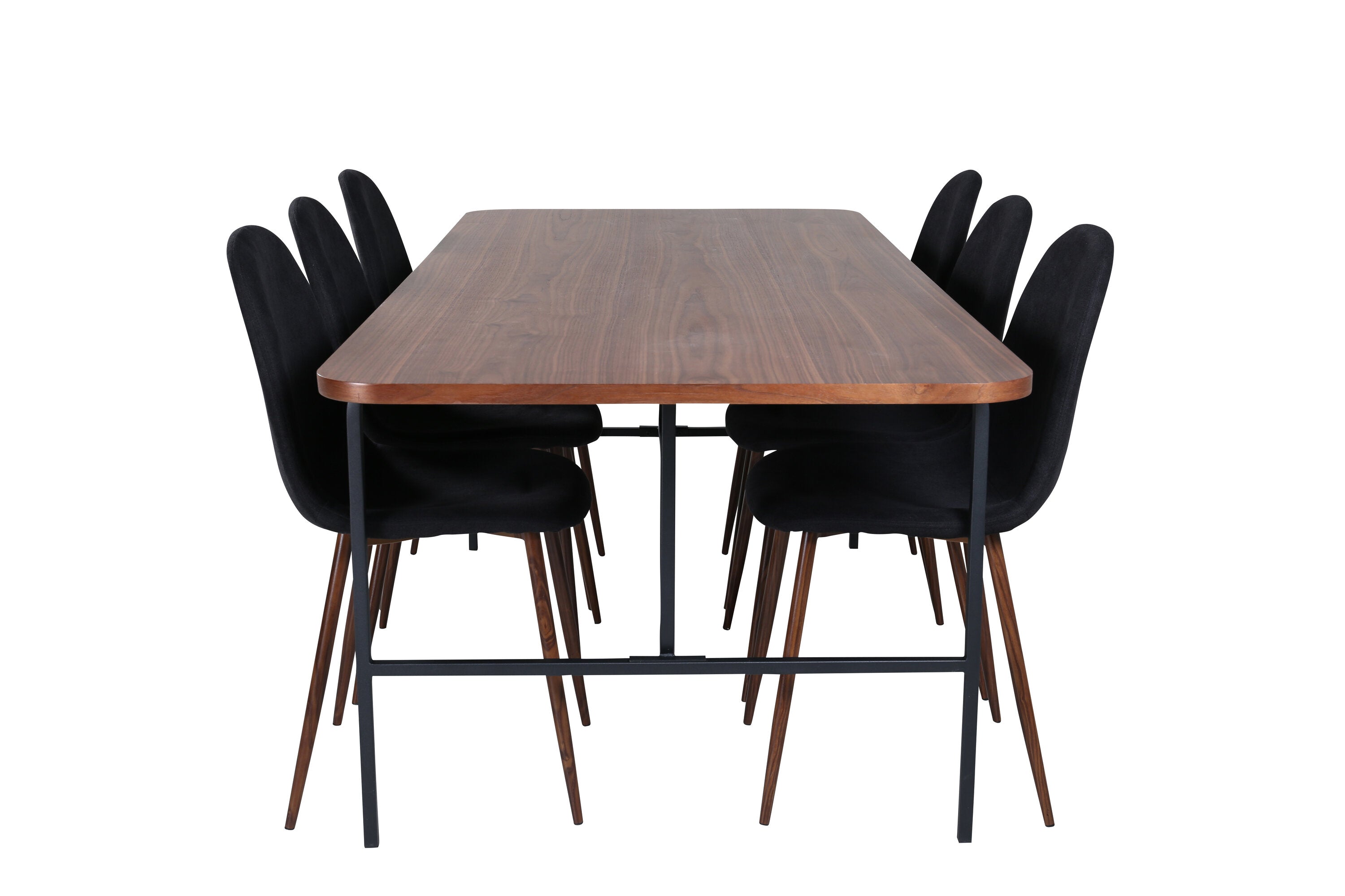 Zvyšte úroveň designu interiéru v obývacím pokoji pomocí lahodné sladěné skupiny jídel v moderních barvách! Jídelní stůl Uno má obdélníkový design s lehce zaoblenými rohy, horní deskou z MDF v barvě ořechu s dýhou a stylovým podvozkem v černém kovu. Rozměry stolu: Délka: 200 cm, Šířka: 90 cm, Výška: 74 cm. Zde spolu se 6 jídelními židlemi Polar v klasickém designu. Nohy židle jsou z kovu v barvě ořechu a sedák z černé polyesterové tkaniny. Rozměry židle: Výška: 87 cm, výška sedáku: 45,5 cm, šířka: 44 cm, hloubka: 53 cm. Nákup předem sestavené skupiny potravin je jak trendově bezpečný, tak praktický!