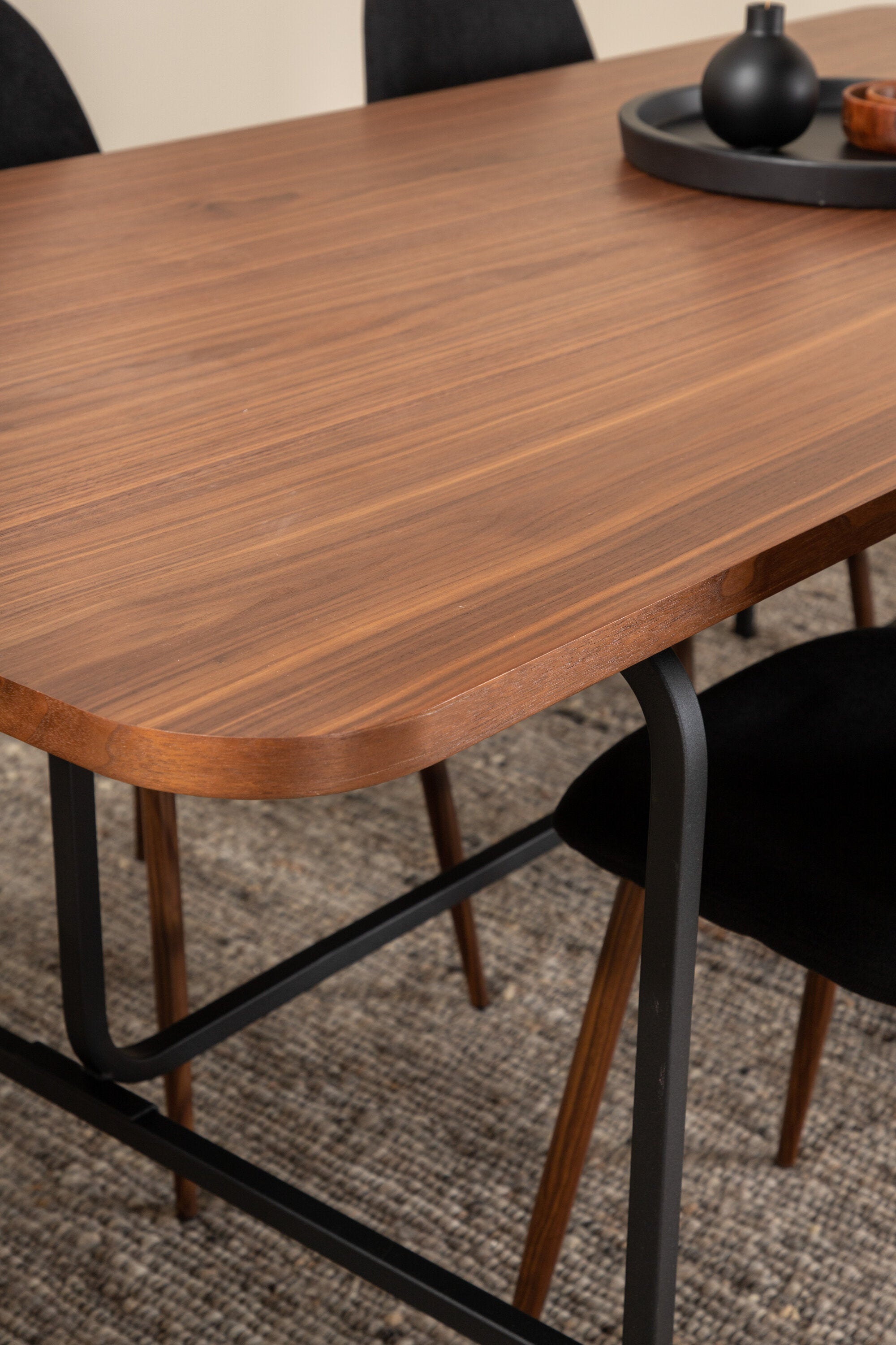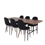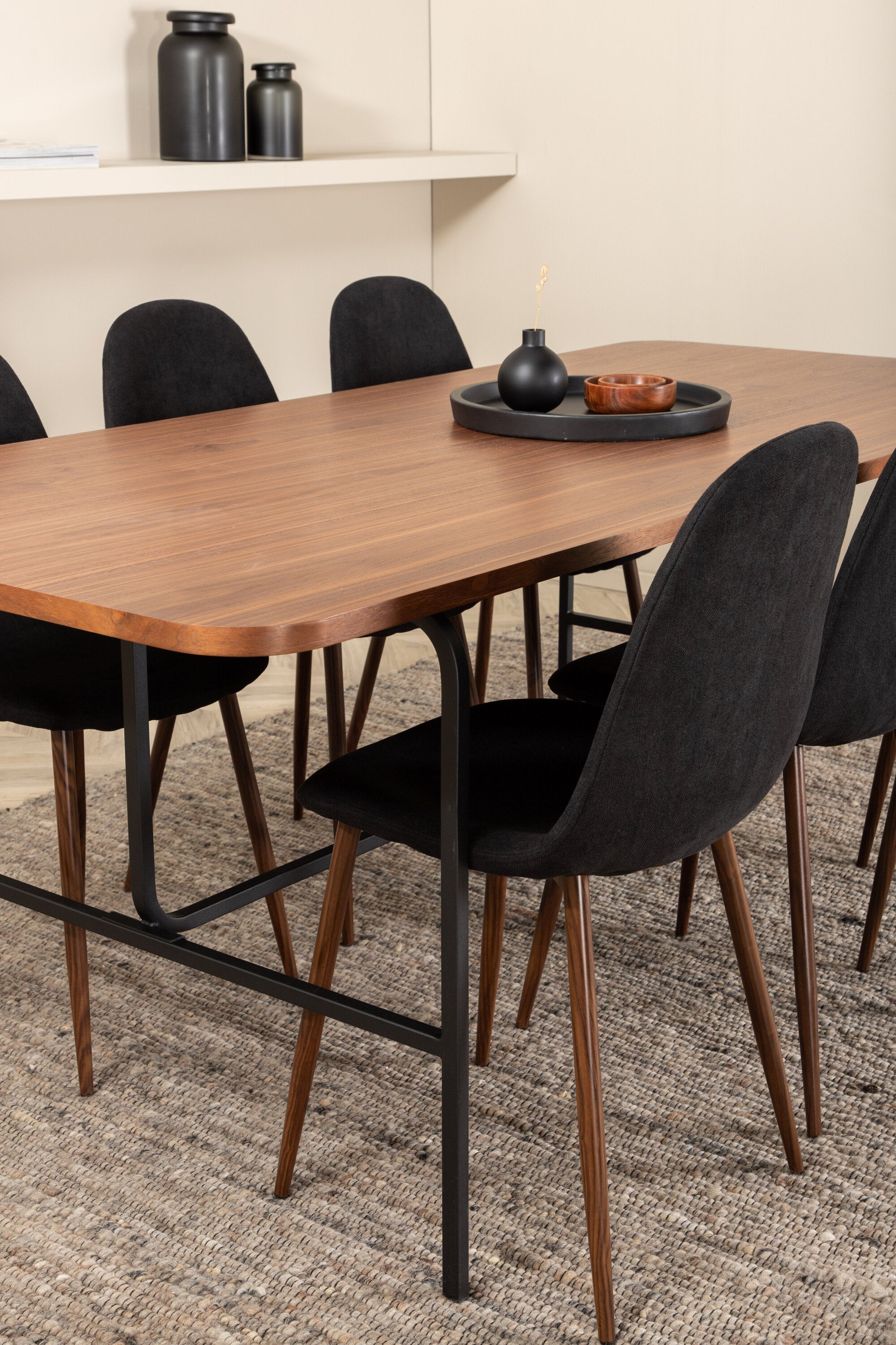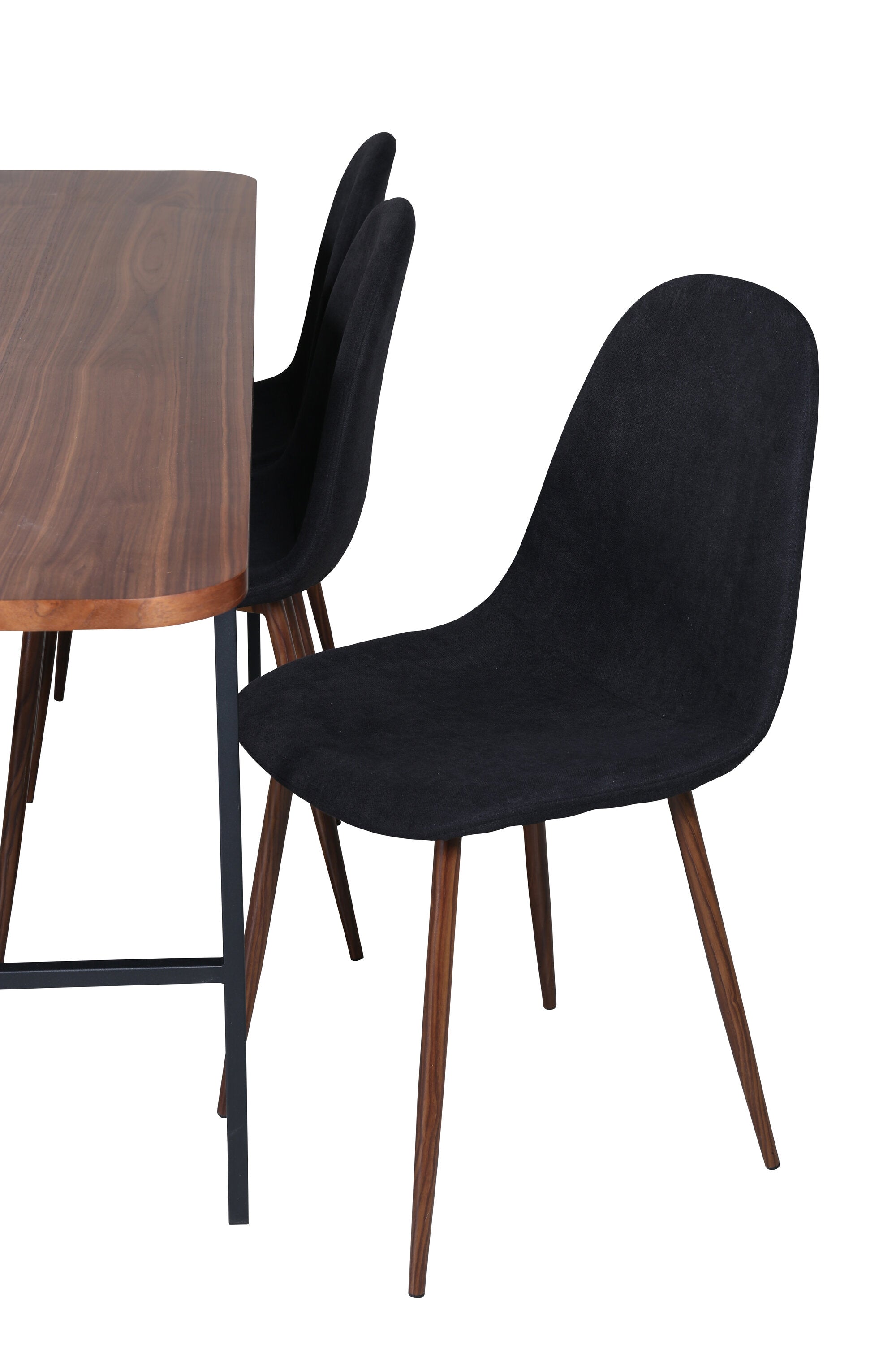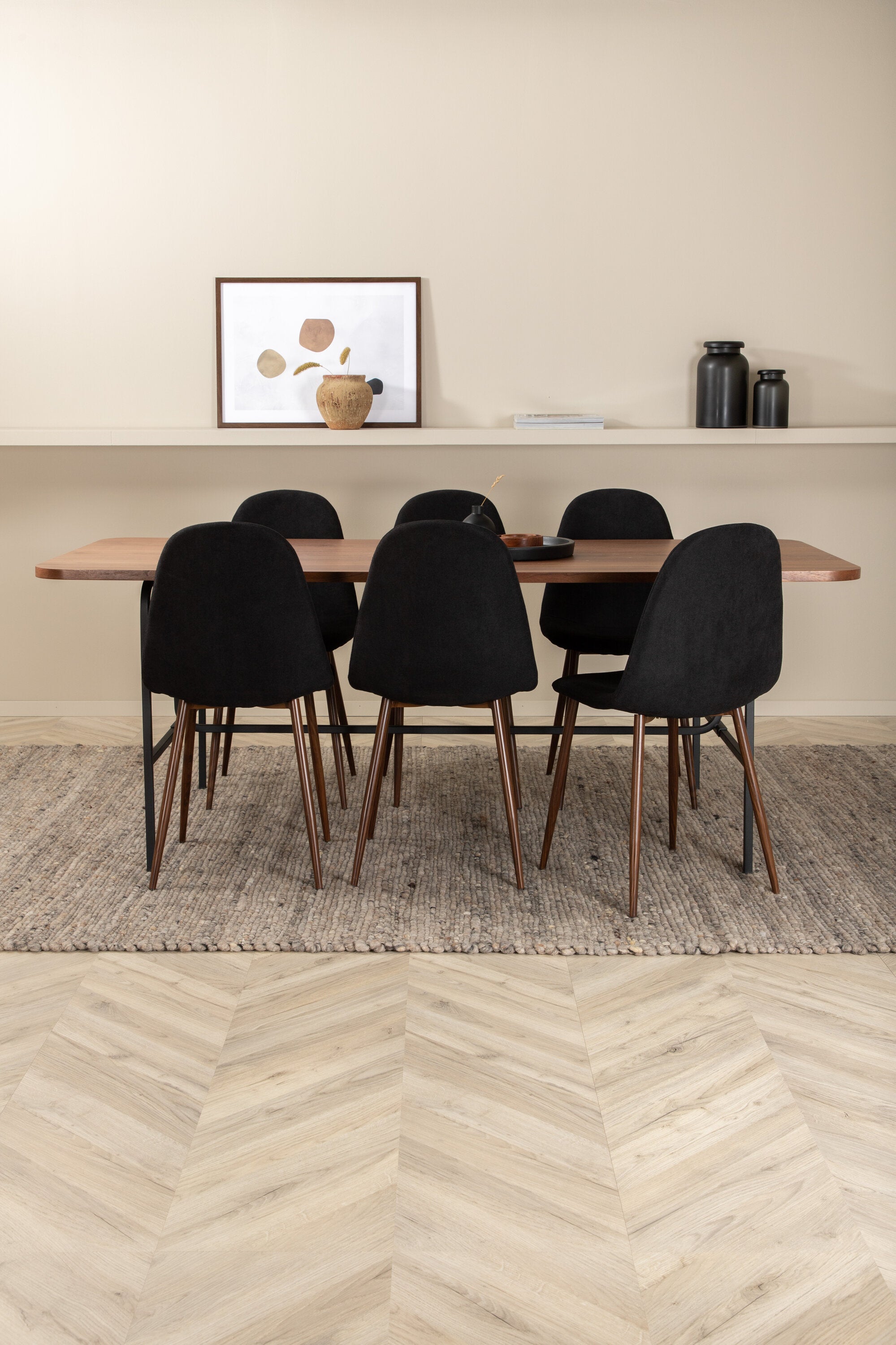 Zvyšte úroveň designu interiéru v obývacím pokoji pomocí lahodné sladěné skupiny jídel v moderních barvách! Jídelní stůl Uno má obdélníkový design s lehce zaoblenými rohy, horní deskou z MDF v barvě ořechu s dýhou a stylovým podvozkem v černém kovu. Rozměry stolu: Délka: 200 cm, Šířka: 90 cm, Výška: 74 cm. Zde spolu se 6 jídelními židlemi Polar v klasickém designu. Nohy židle jsou z kovu v barvě ořechu a sedák z černé polyesterové tkaniny. Rozměry židle: Výška: 87 cm, výška sedáku: 45,5 cm, šířka: 44 cm, hloubka: 53 cm. Nákup předem sestavené skupiny potravin je jak trendově bezpečný, tak praktický!