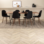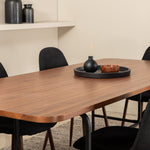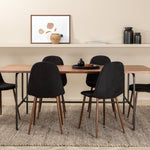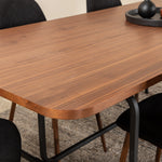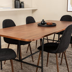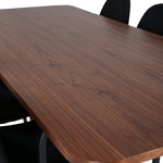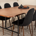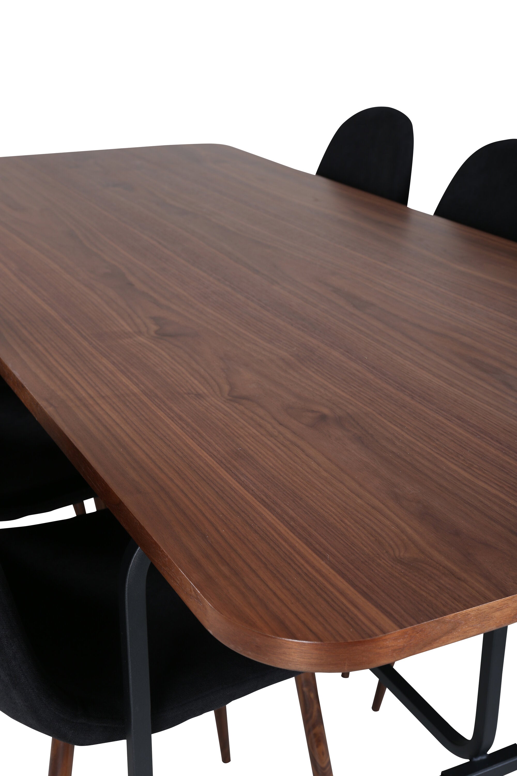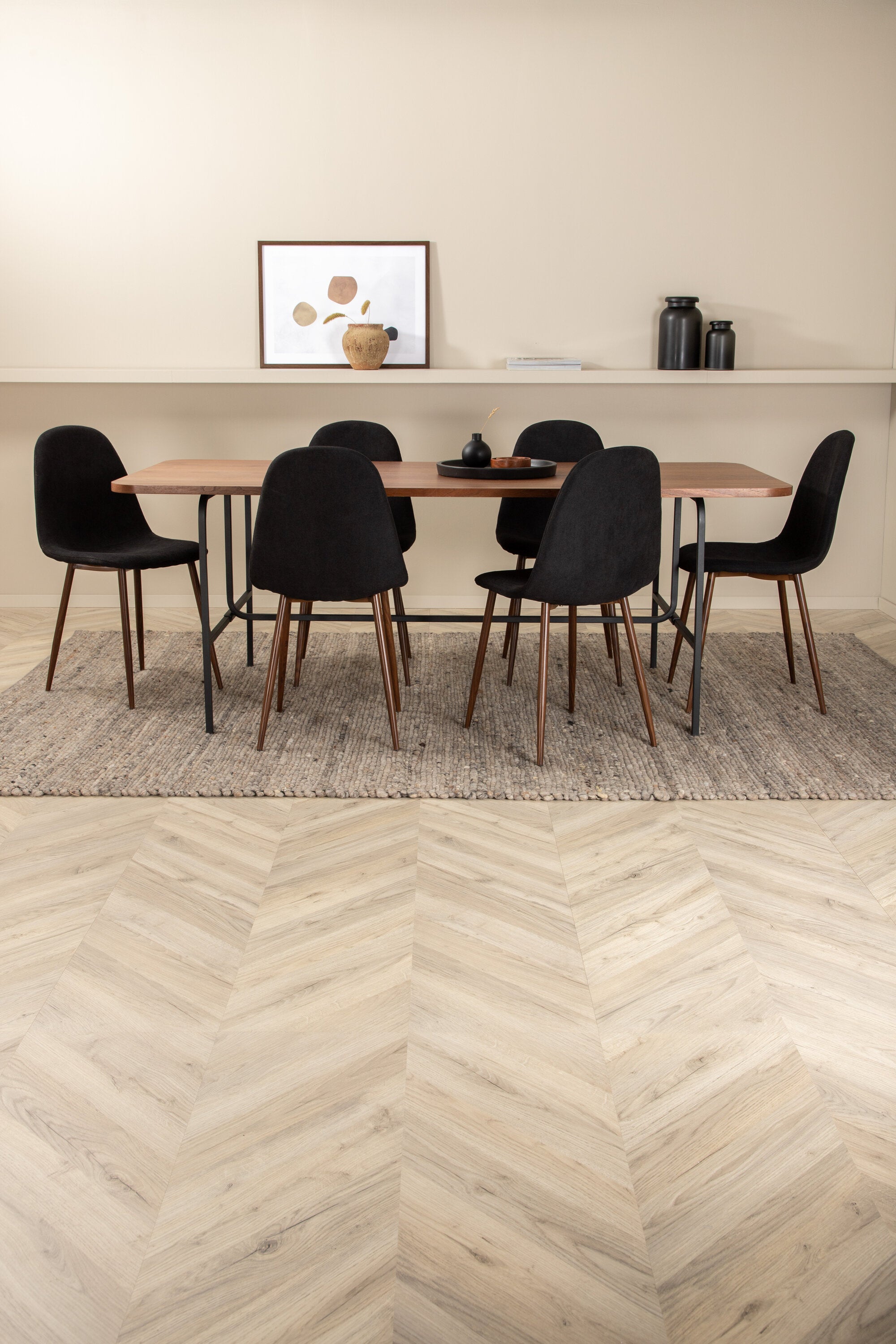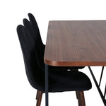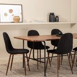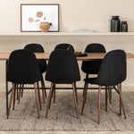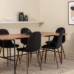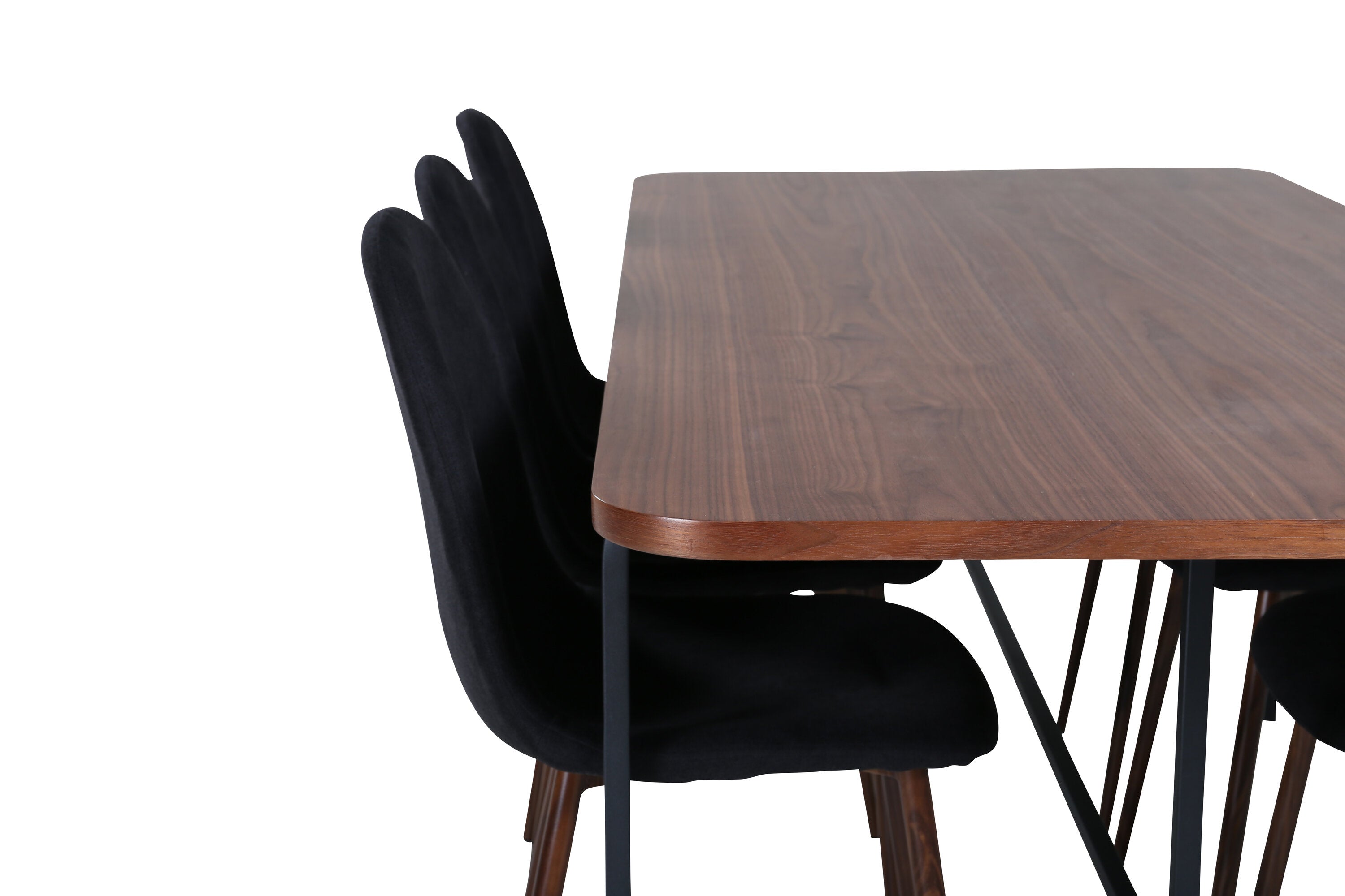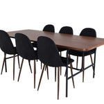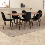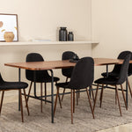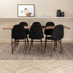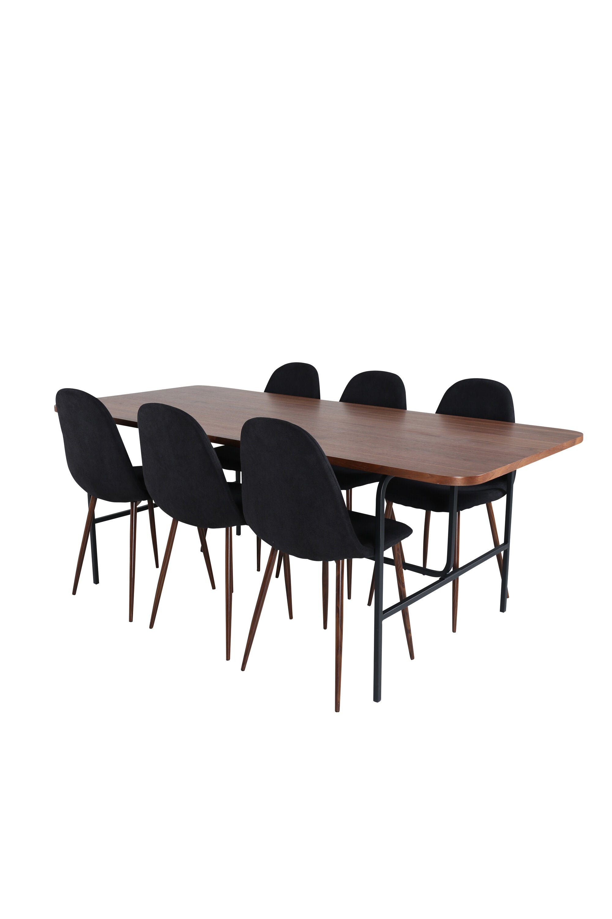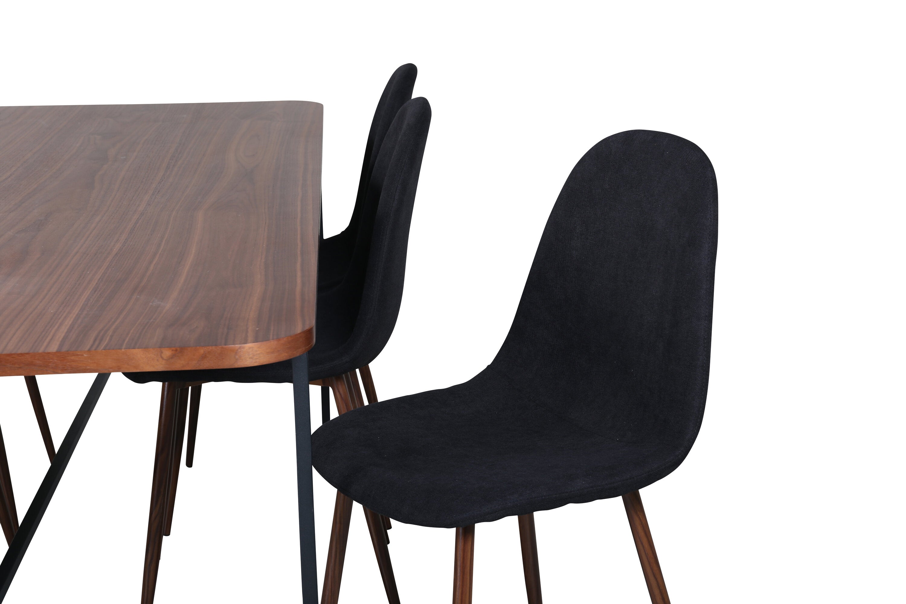 Zvyšte úroveň designu interiéru v obývacím pokoji pomocí lahodné sladěné skupiny jídel v moderních barvách! Jídelní stůl Uno má obdélníkový design s lehce zaoblenými rohy, horní deskou z MDF v barvě ořechu s dýhou a stylovým podvozkem v černém kovu. Rozměry stolu: Délka: 200 cm, Šířka: 90 cm, Výška: 74 cm. Zde spolu se 6 jídelními židlemi Polar v klasickém designu. Nohy židle jsou z kovu v barvě ořechu a sedák z černé polyesterové tkaniny. Rozměry židle: Výška: 87 cm, výška sedáku: 45,5 cm, šířka: 44 cm, hloubka: 53 cm. Nákup předem sestavené skupiny potravin je jak trendově bezpečný, tak praktický!