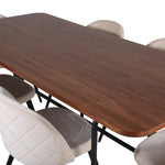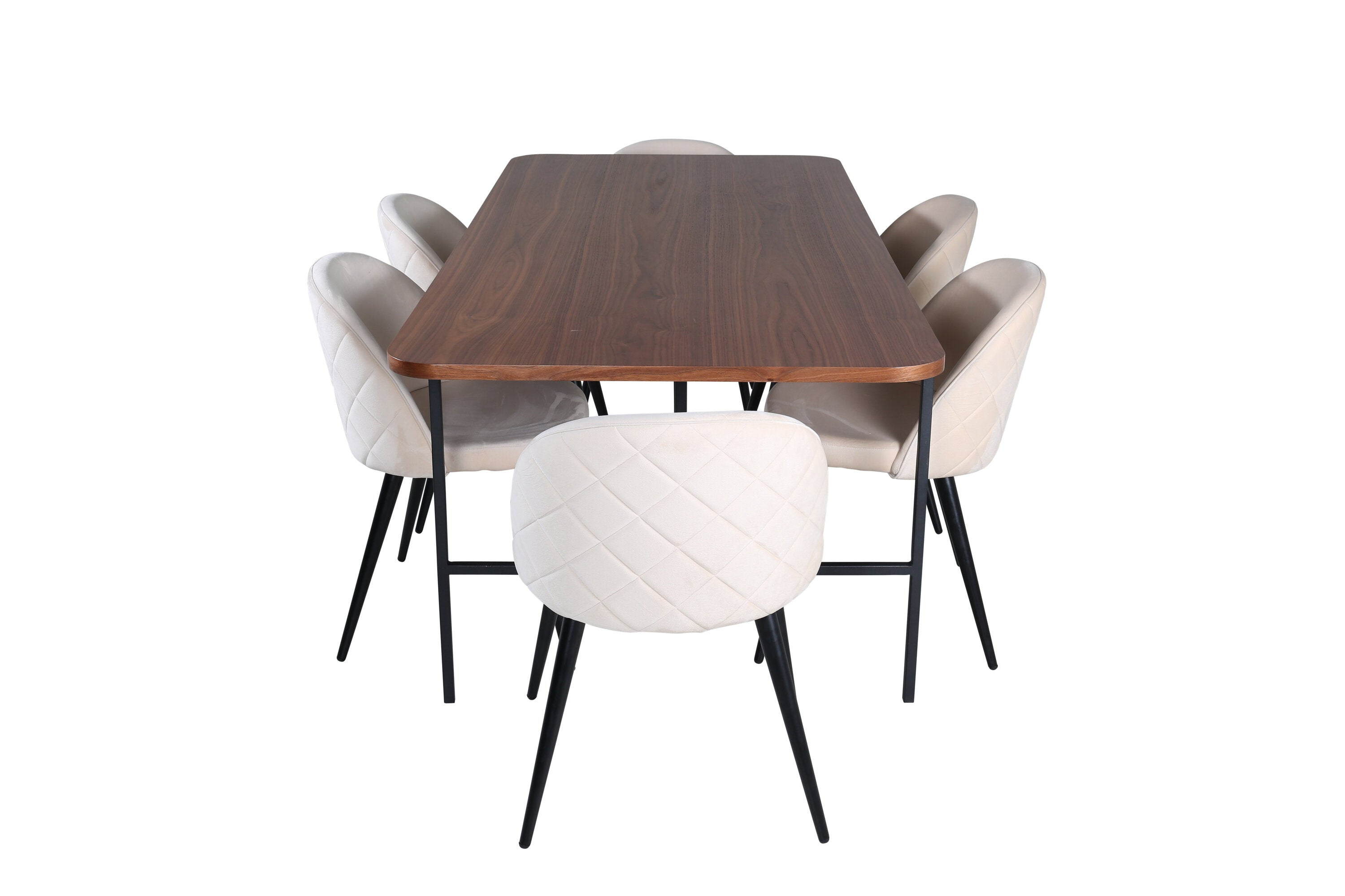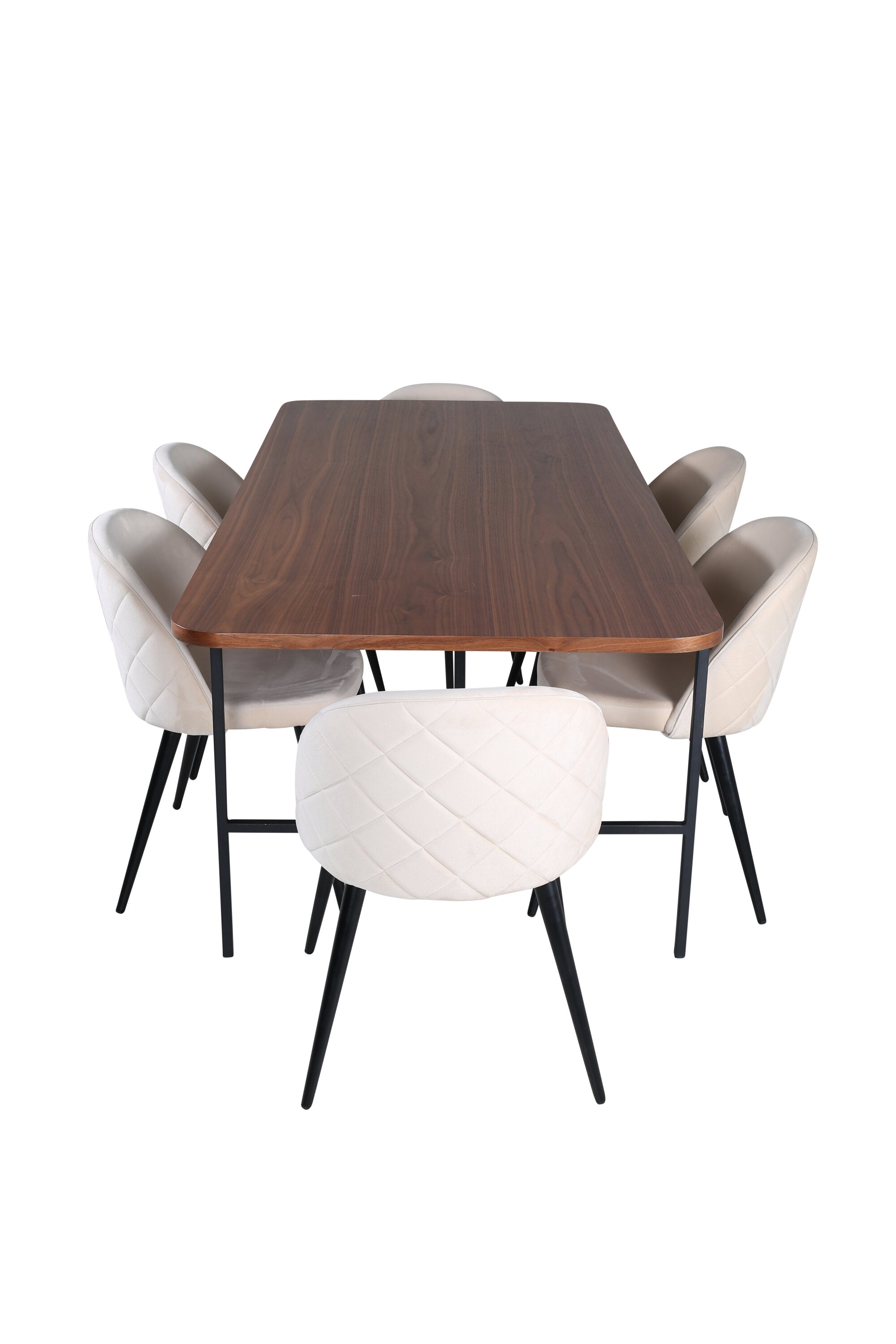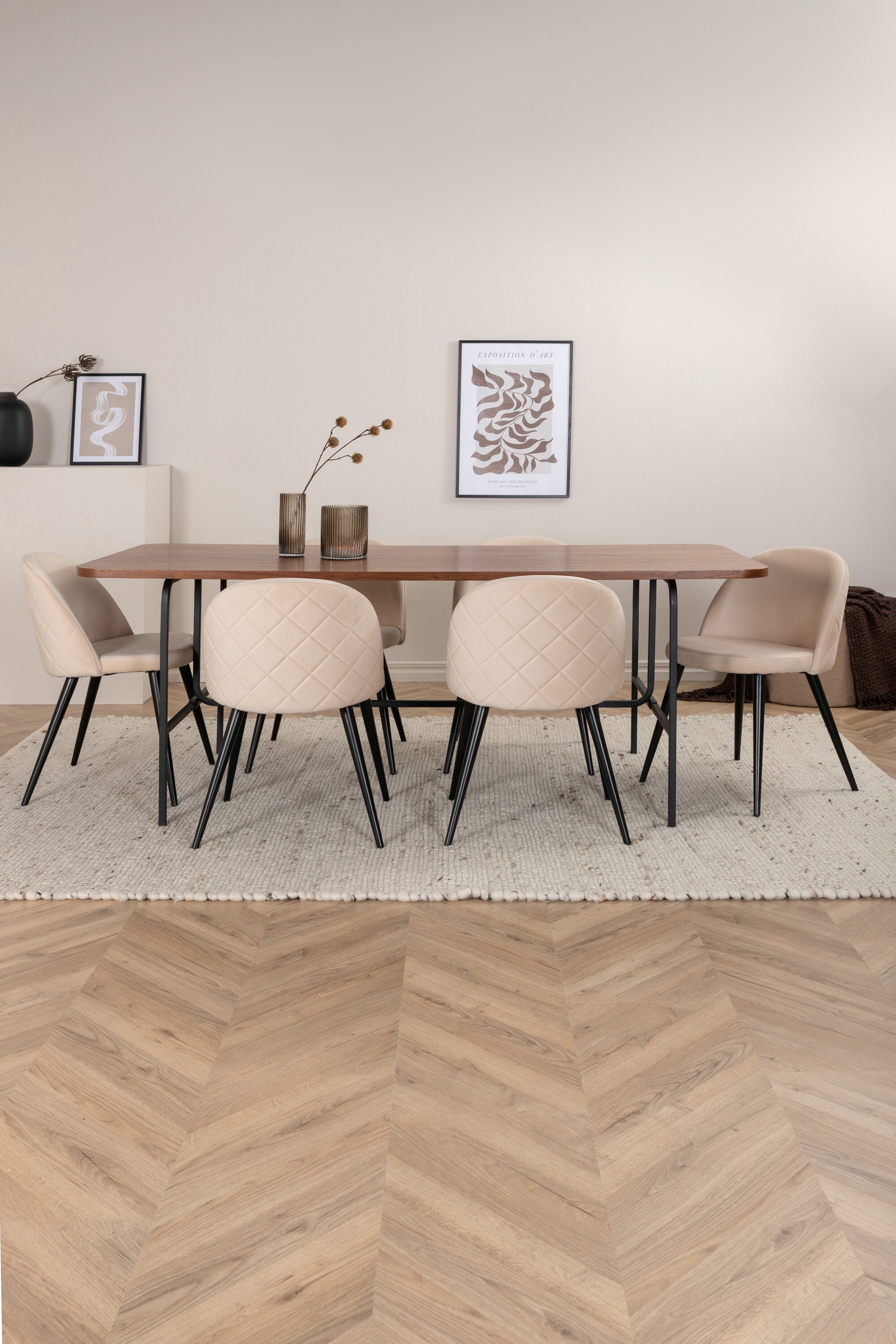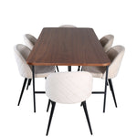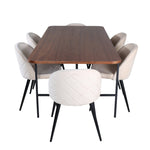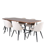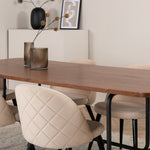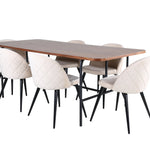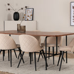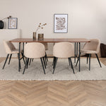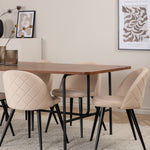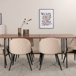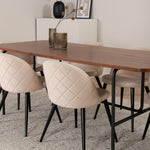 S klasickým a moderním jídelním stolem Uno se může celá rodina sejít k večeři a společenskému setkání. Stůl má obdélníkový design s lehce zaoblenými rohy, horní deskou z MDF v barvě ořechu s dýhou a stylovým podvozkem v černém kovu. Rozměry stolu: Délka: 200 cm, Šířka: 90 cm, Výška: 74 cm. Zde se hodí k 6 jídelním židlím Velvet Stitches s rozšířenými černými kosticemi z kovu a sedáky z béžového sametu s dekorativním stehem. Rozměry židle: Výška: 76,5 cm, výška sedáku: 46,5 cm, šířka: 50 cm, hloubka: 57 cm. Nechte se inspirovat poutavou skupinou jídel!