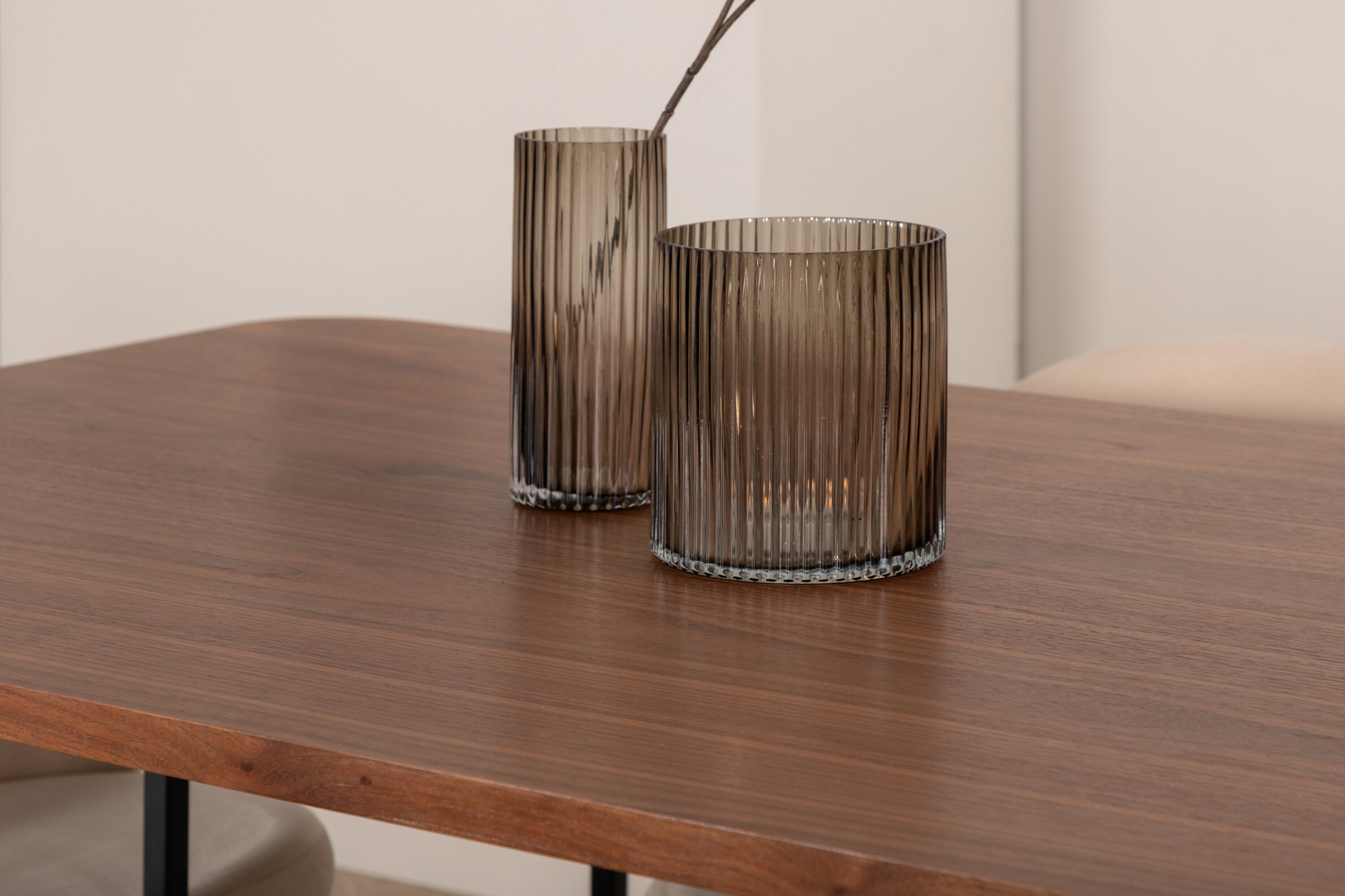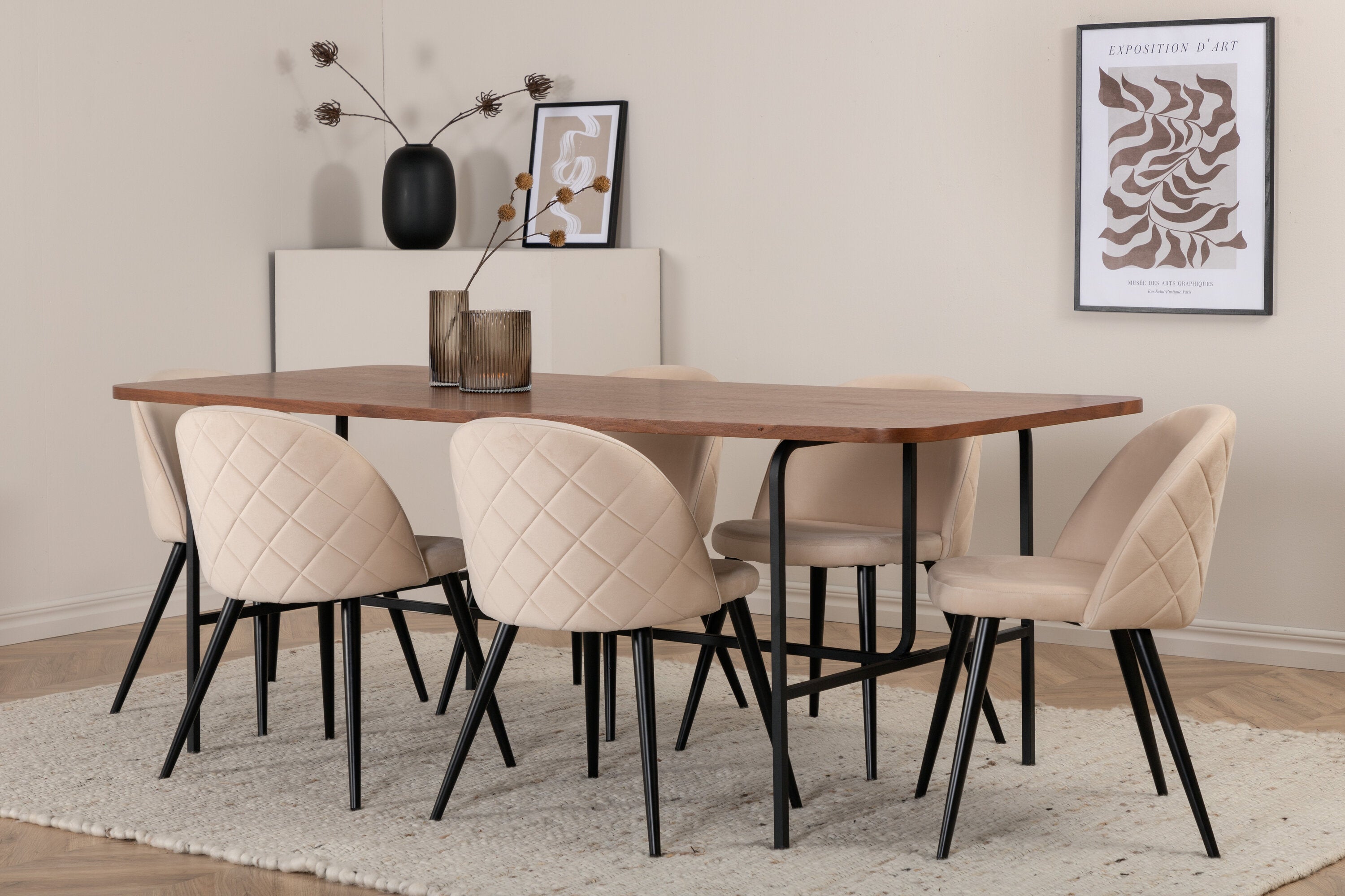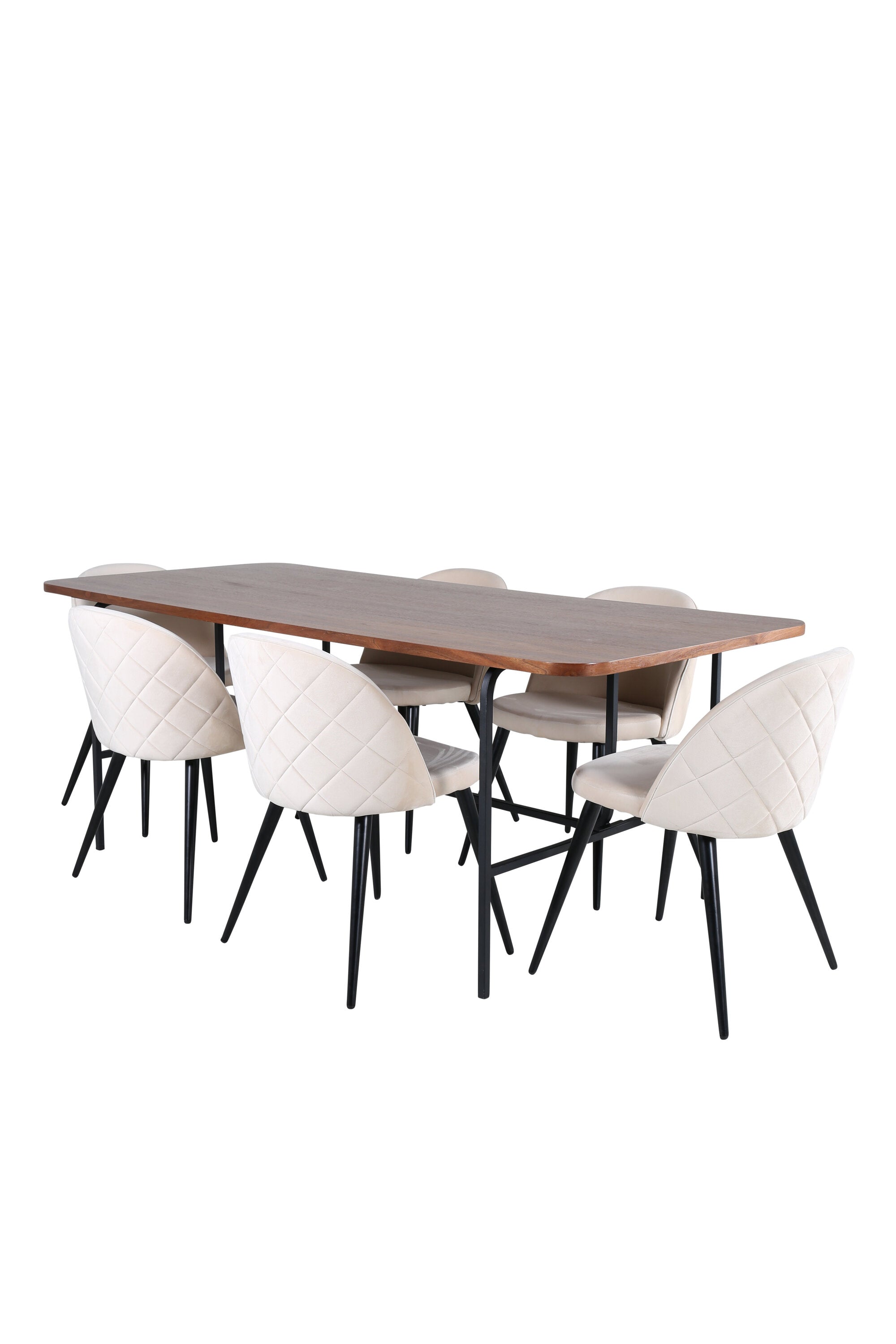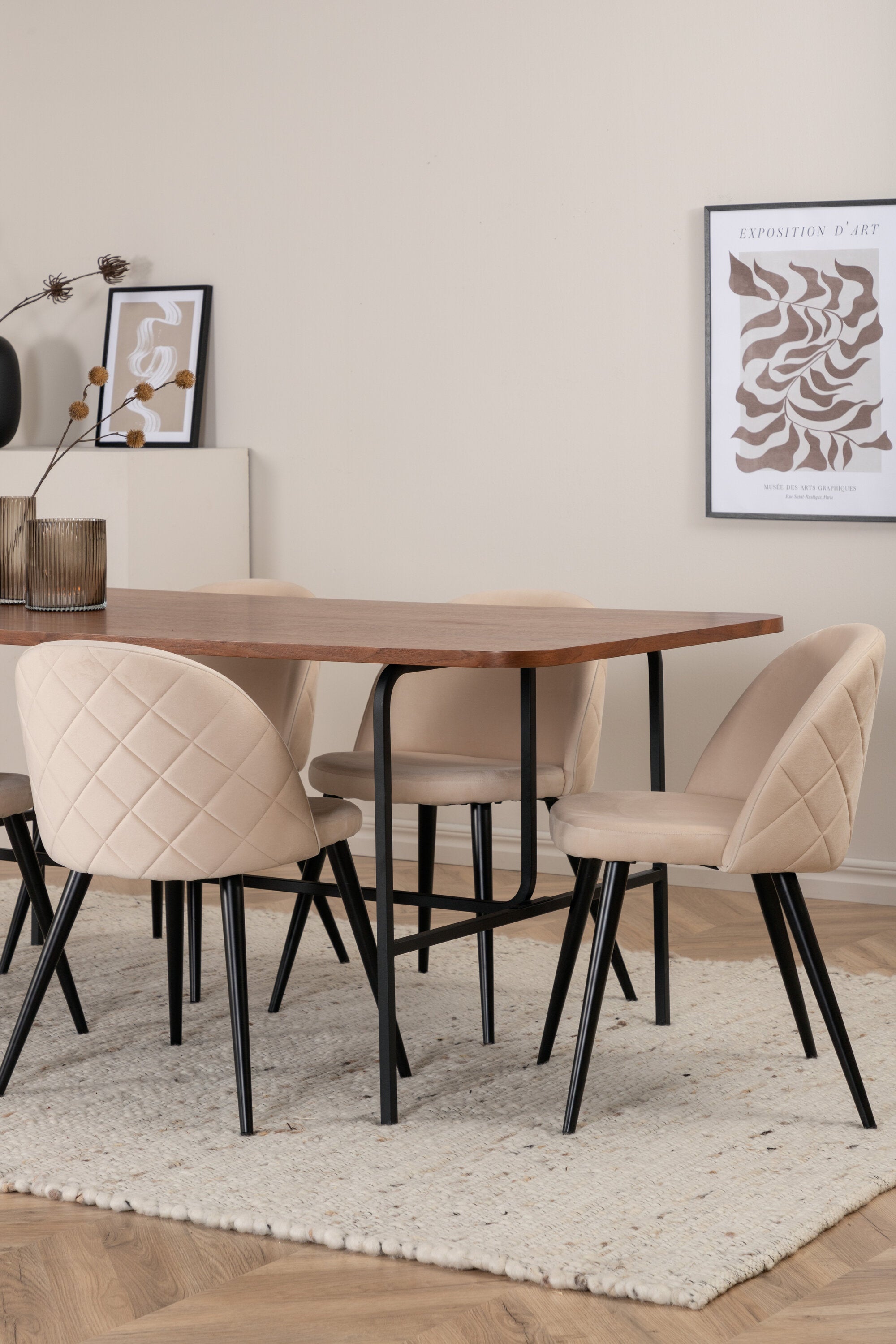 S klasickým a moderním jídelním stolem Uno se může celá rodina sejít k večeři a společenskému setkání. Stůl má obdélníkový design s lehce zaoblenými rohy, horní deskou z MDF v barvě ořechu s dýhou a stylovým podvozkem v černém kovu. Rozměry stolu: Délka: 200 cm, Šířka: 90 cm, Výška: 74 cm. Zde se hodí k 6 jídelním židlím Velvet Stitches s rozšířenými černými kosticemi z kovu a sedáky z béžového sametu s dekorativním stehem. Rozměry židle: Výška: 76,5 cm, výška sedáku: 46,5 cm, šířka: 50 cm, hloubka: 57 cm. Nechte se inspirovat poutavou skupinou jídel!
