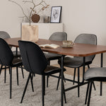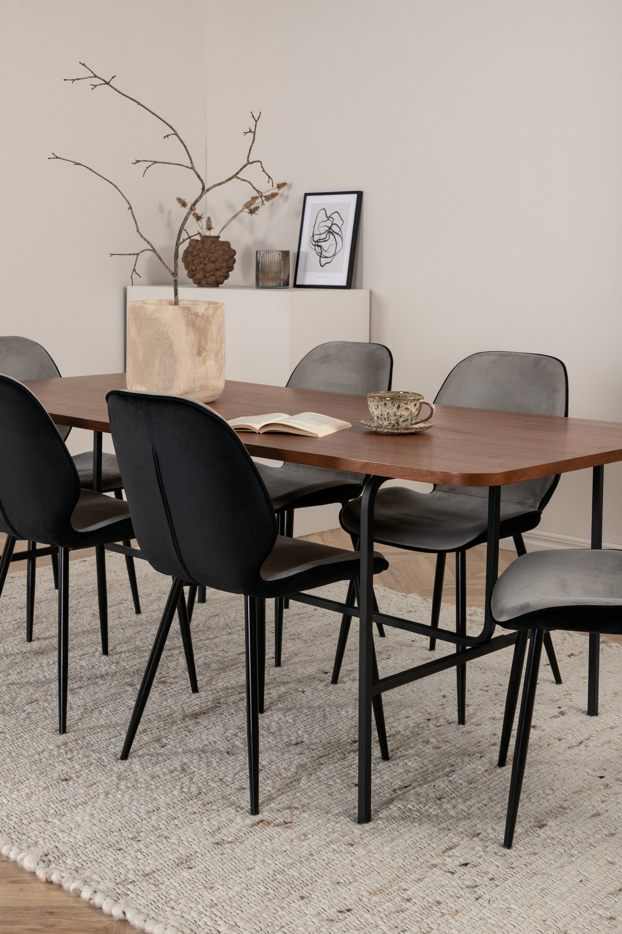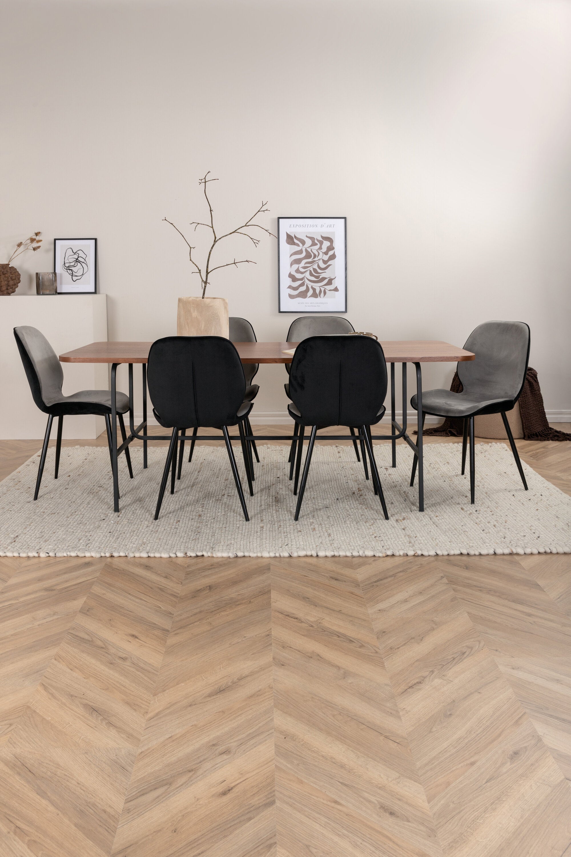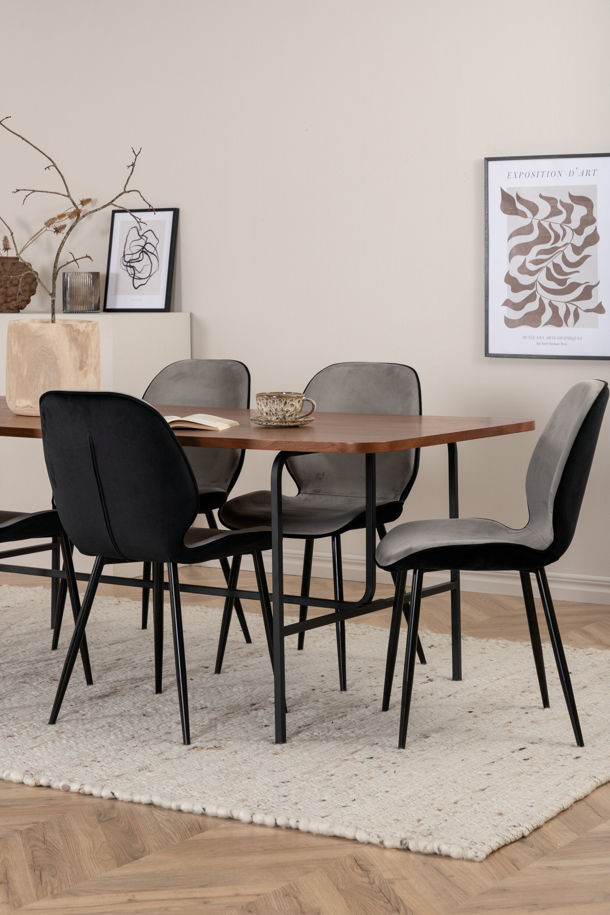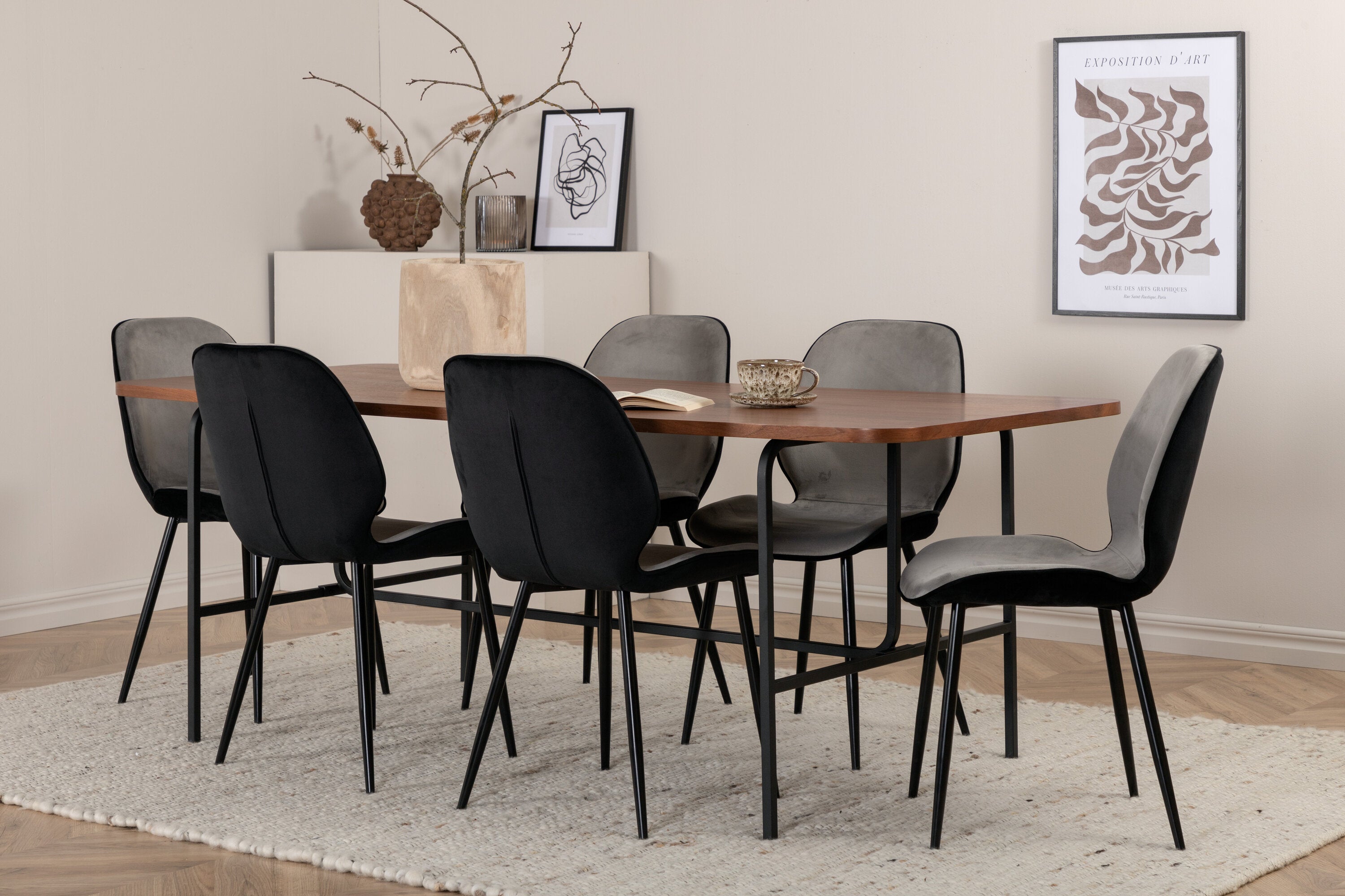 Naše oblíbené jídelní židle Emma Smaster Design! Židle mají figurální a stylový design se sedákem ze světle šedého sametu a opěradlem z černého sametu a nohama židle ze železa. Rozměry židle: výška: 89 cm, výška sedáku: 45 cm, šířka: 47 cm, hloubka: 57 cm. Zde je 6 jídelních židlí sladěno kolem jídelního stolu uno - trendy i nadčasové! Stůl má obdélníkový design s lehce zaoblenými rohy, horní deskou z MDF v barvě ořechu s dýhou a stylovým podvozkem v černém kovu. Rozměry stolu: Délka: 200 cm, Šířka: 90 cm, Výška: 74 cm. Vytvořte příjemný středobod pro setkání s rodinou a přáteli!