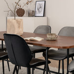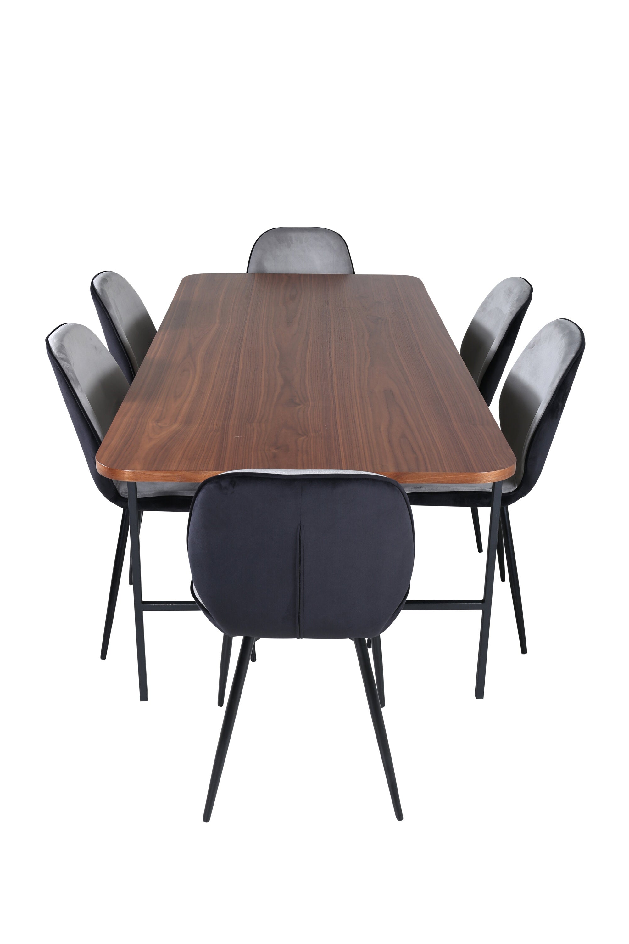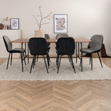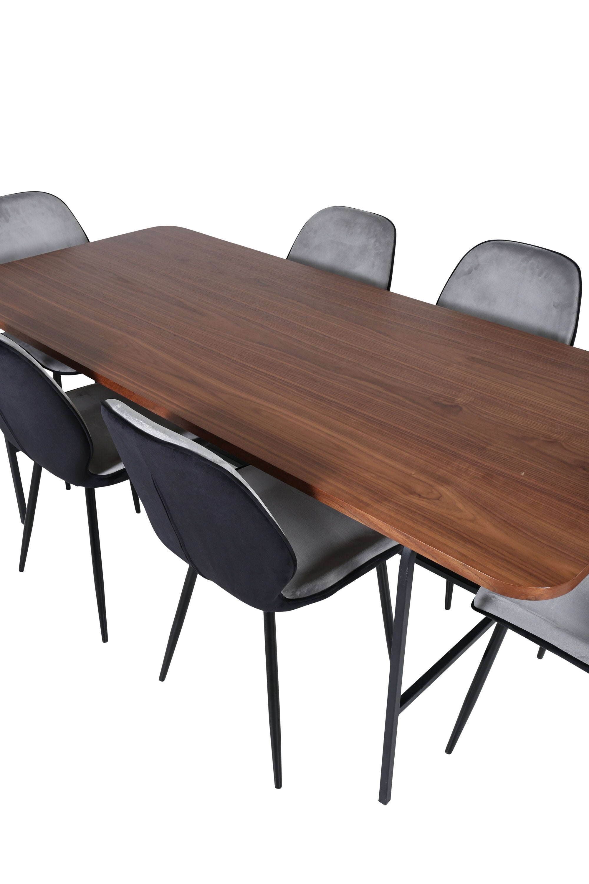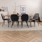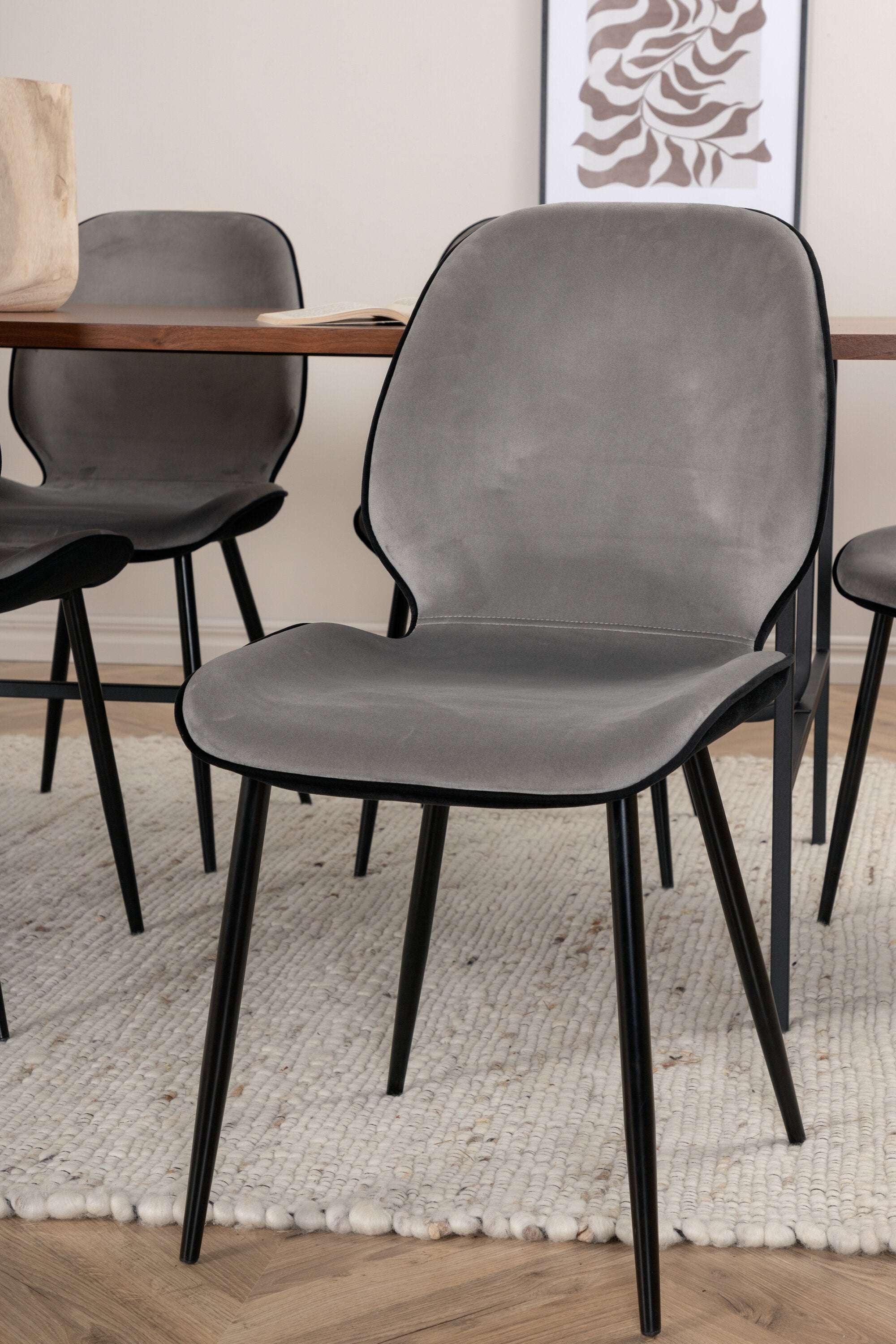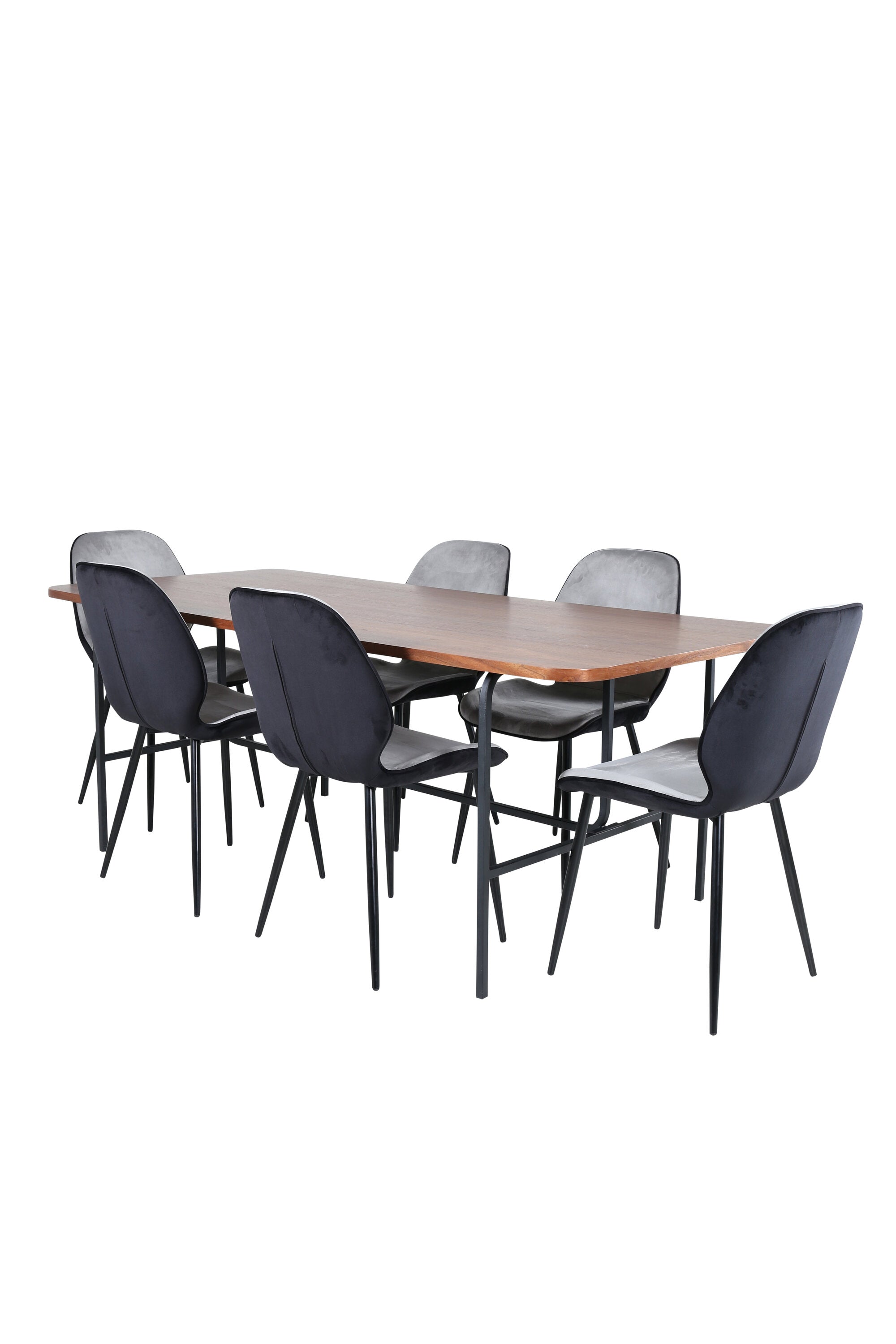 Naše oblíbené jídelní židle Emma Smaster Design! Židle mají figurální a stylový design se sedákem ze světle šedého sametu a opěradlem z černého sametu a nohama židle ze železa. Rozměry židle: výška: 89 cm, výška sedáku: 45 cm, šířka: 47 cm, hloubka: 57 cm. Zde je 6 jídelních židlí sladěno kolem jídelního stolu uno - trendy i nadčasové! Stůl má obdélníkový design s lehce zaoblenými rohy, horní deskou z MDF v barvě ořechu s dýhou a stylovým podvozkem v černém kovu. Rozměry stolu: Délka: 200 cm, Šířka: 90 cm, Výška: 74 cm. Vytvořte příjemný středobod pro setkání s rodinou a přáteli!