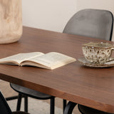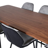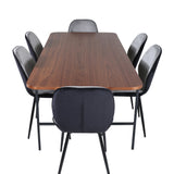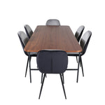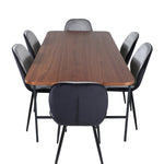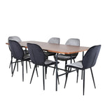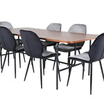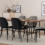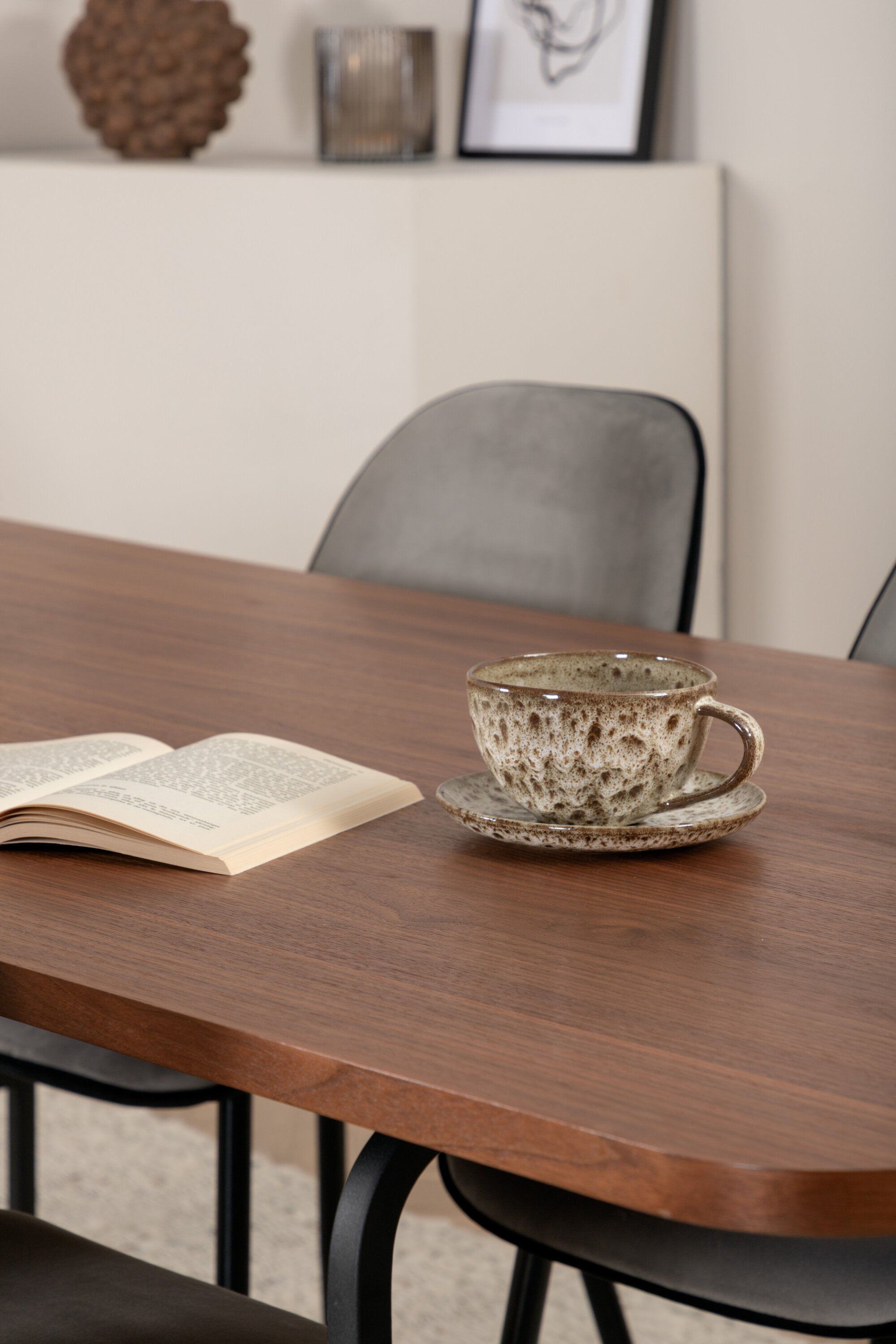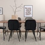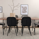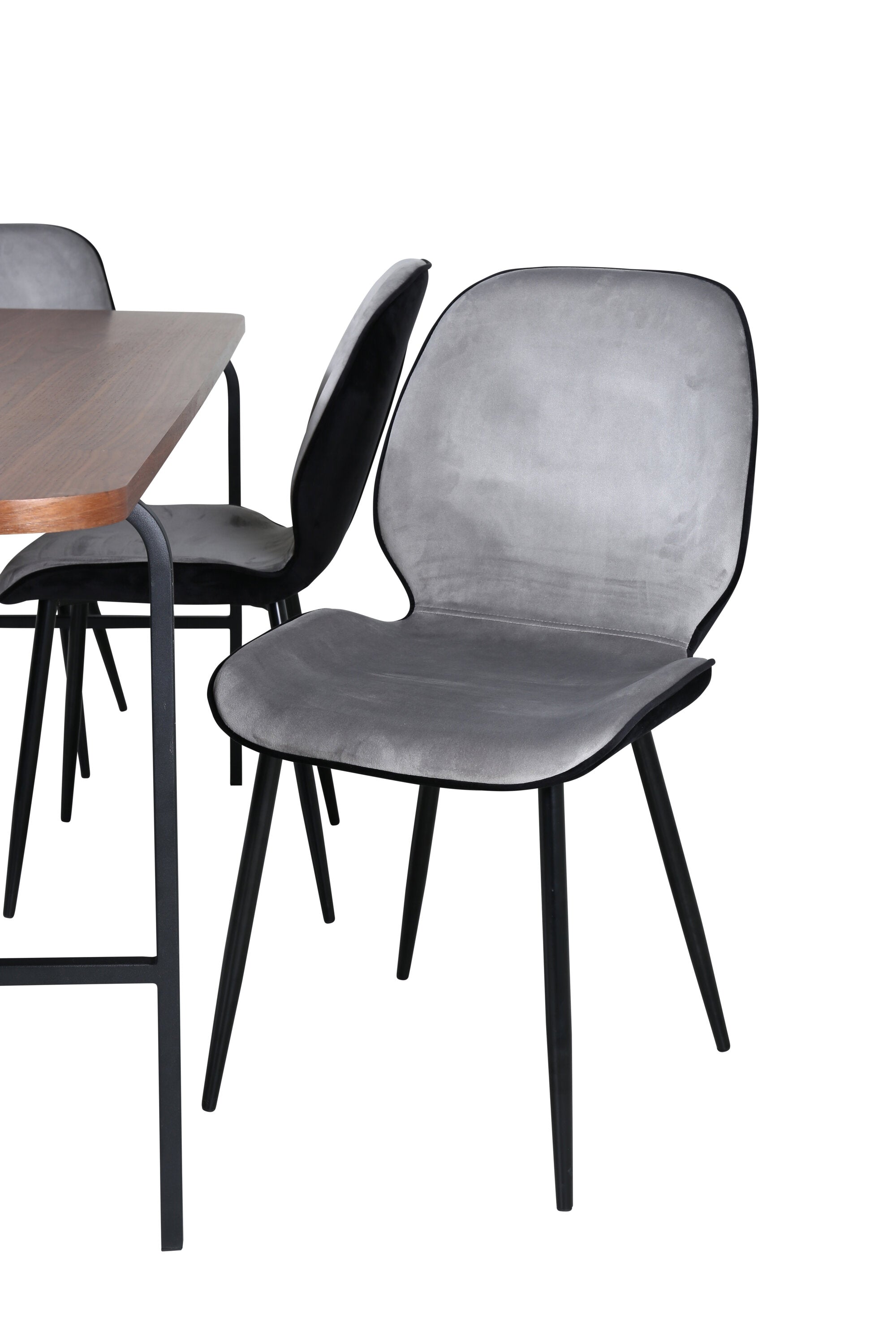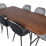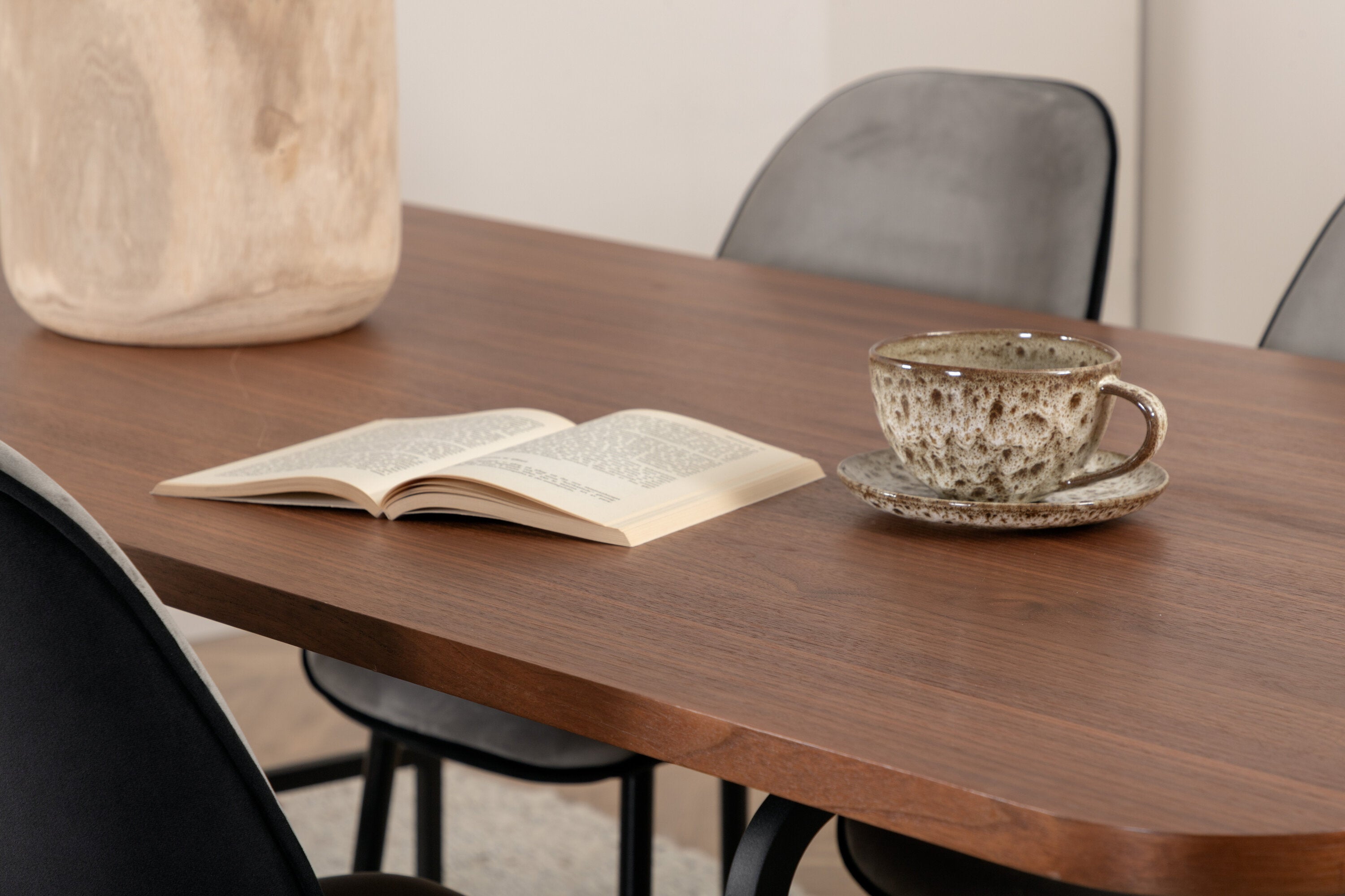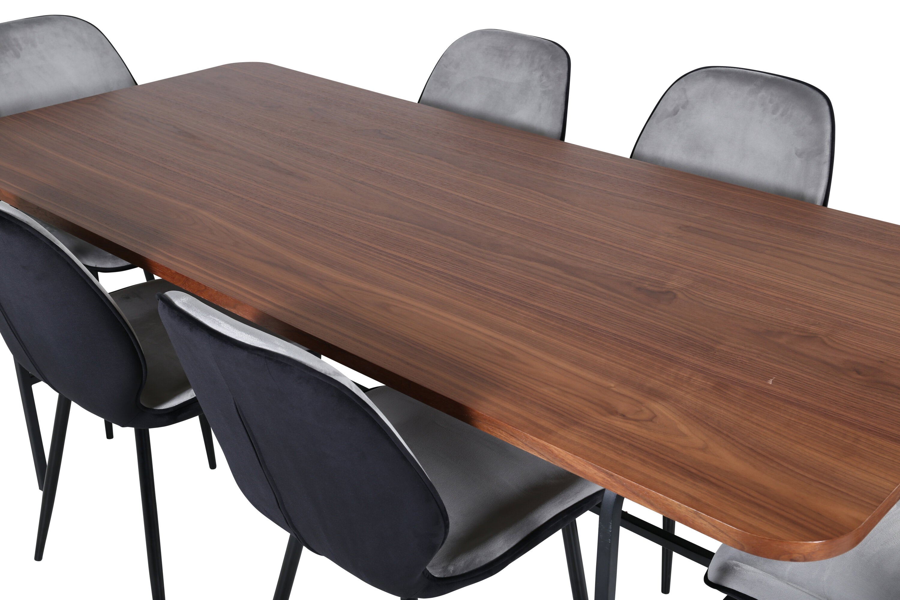 Naše oblíbené jídelní židle Emma Smaster Design! Židle mají figurální a stylový design se sedákem ze světle šedého sametu a opěradlem z černého sametu a nohama židle ze železa. Rozměry židle: výška: 89 cm, výška sedáku: 45 cm, šířka: 47 cm, hloubka: 57 cm. Zde je 6 jídelních židlí sladěno kolem jídelního stolu uno - trendy i nadčasové! Stůl má obdélníkový design s lehce zaoblenými rohy, horní deskou z MDF v barvě ořechu s dýhou a stylovým podvozkem v černém kovu. Rozměry stolu: Délka: 200 cm, Šířka: 90 cm, Výška: 74 cm. Vytvořte příjemný středobod pro setkání s rodinou a přáteli!