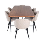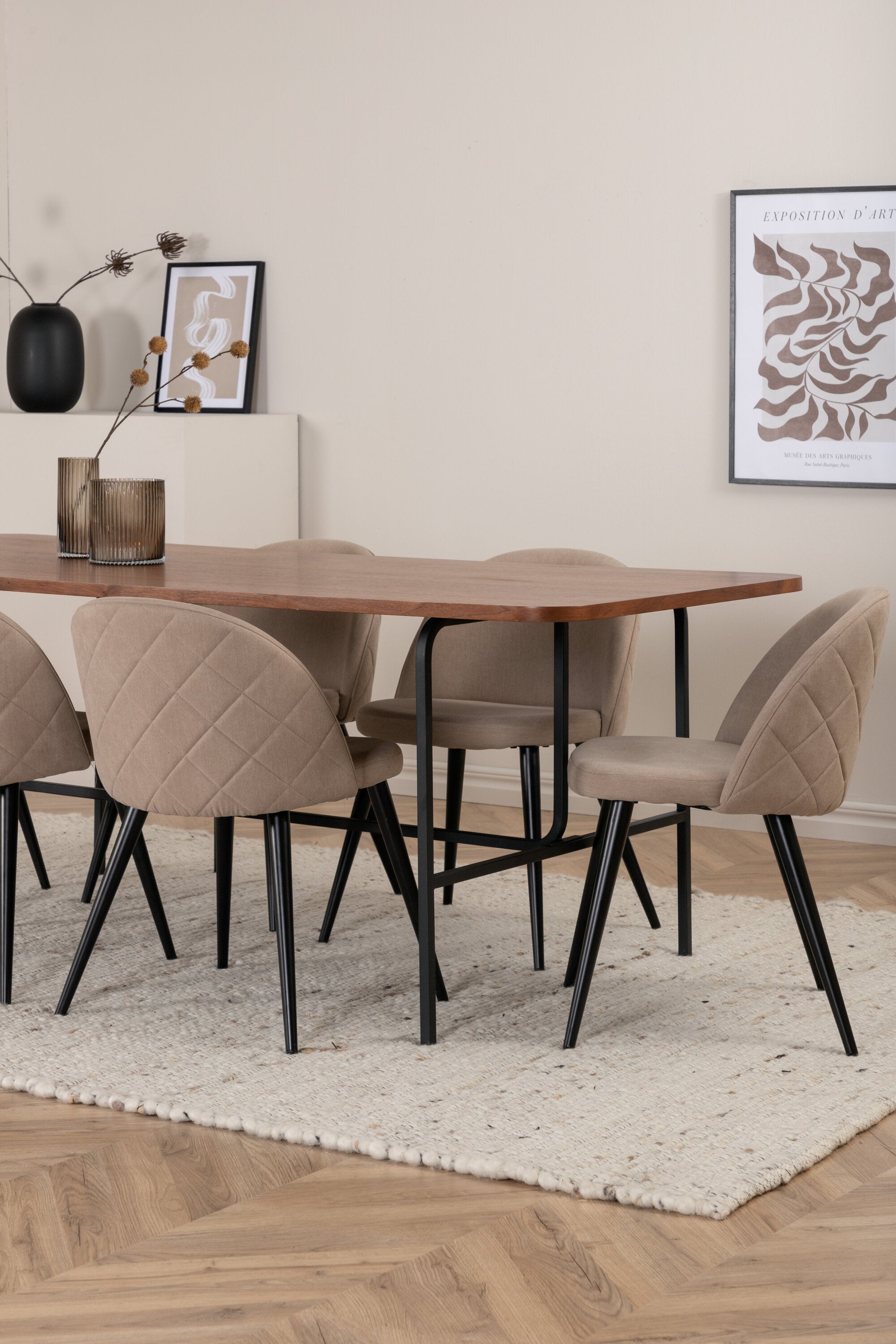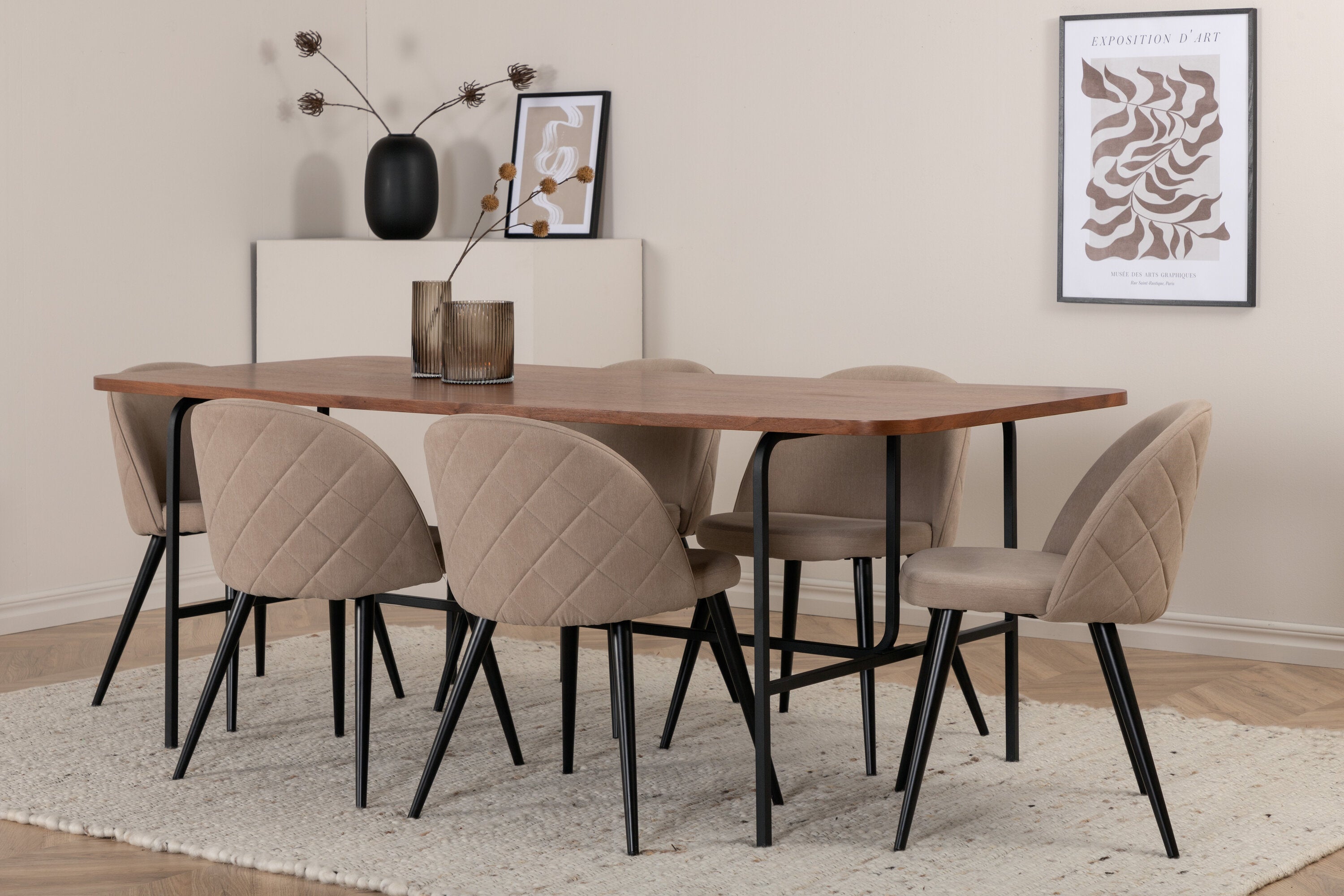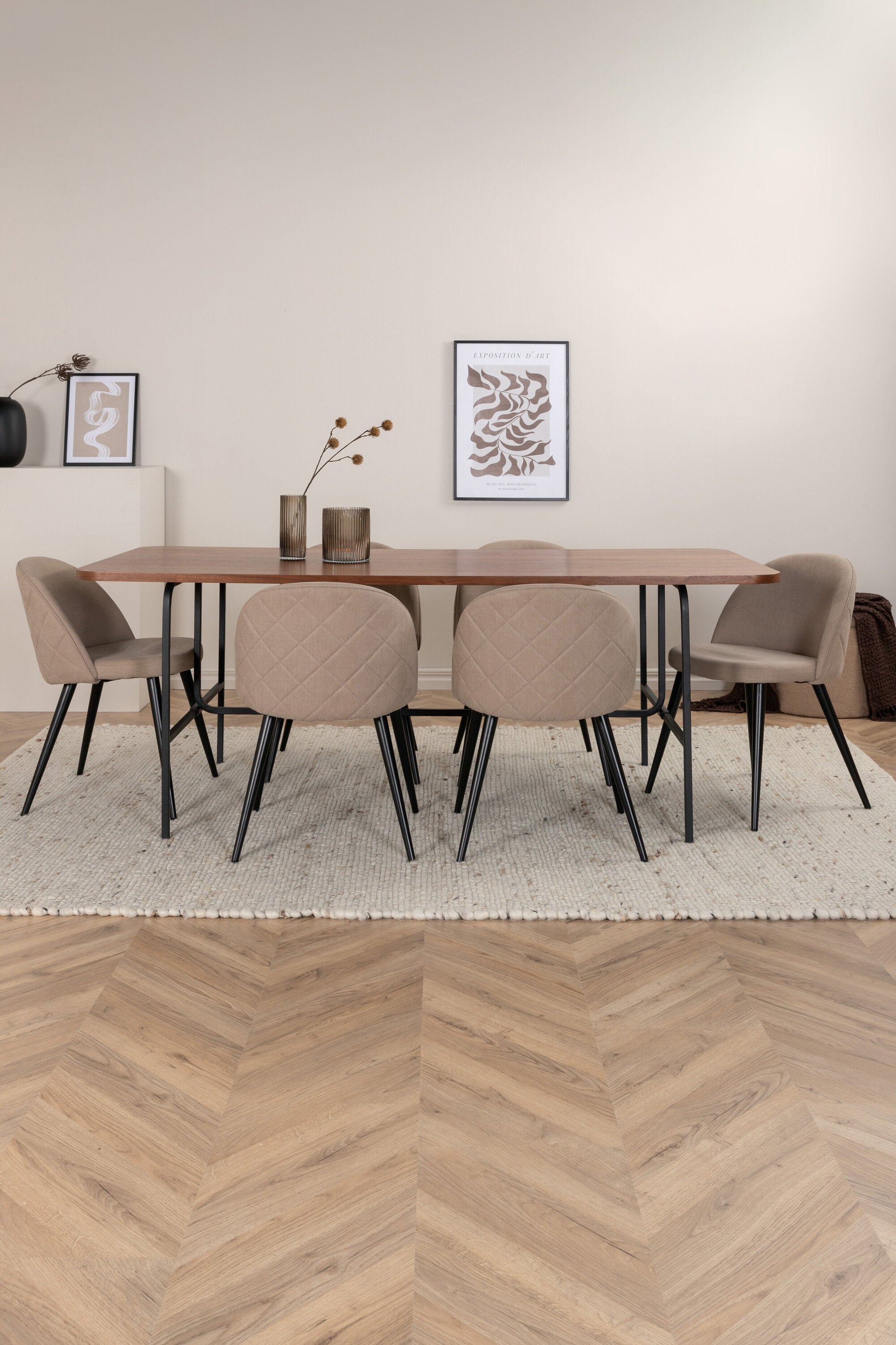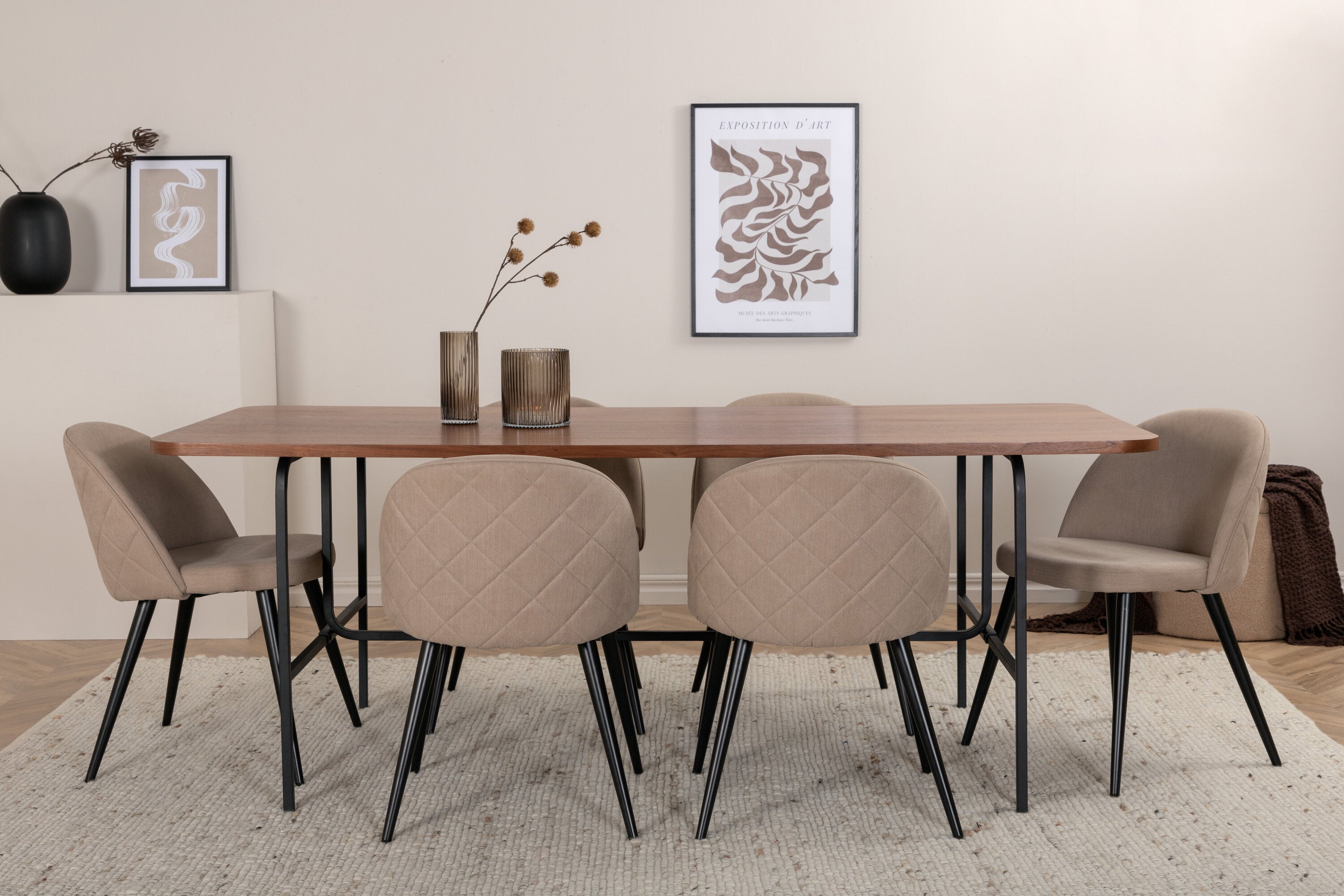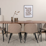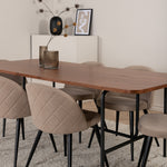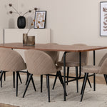 S klasickým a moderním jídelním stolem Uno se může celá rodina sejít k večeři a společenskému setkání. Stůl má obdélníkový design s lehce zaoblenými rohy, horní deskou z MDF v barvě ořechu s dýhou a stylovým podvozkem v černém kovu. Rozměry stolu: Délka: 200 cm, Šířka: 90 cm, Výška: 74 cm. Sladěno s 6 jídelními židlemi Velvet Stitches s rozšířenými černými kostmi z kovu a sedáky z béžového polyesterového plátna s dekorativním stehem. Rozměry židle: Výška: 76,5 cm, výška sedáku: 46,5 cm, šířka: 50 cm, hloubka: 57 cm. Nechte se inspirovat poutavou skupinou jídel!