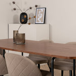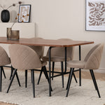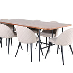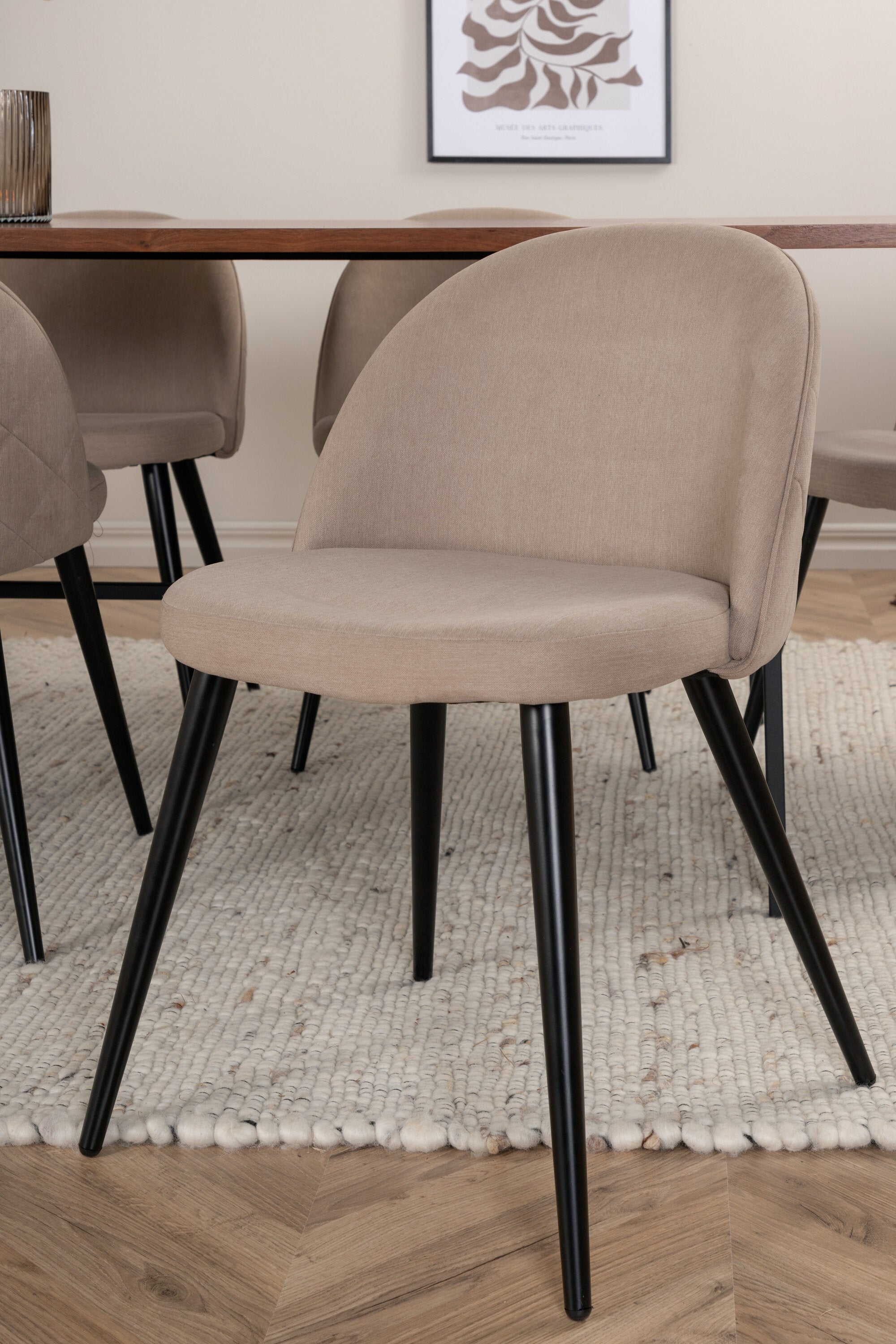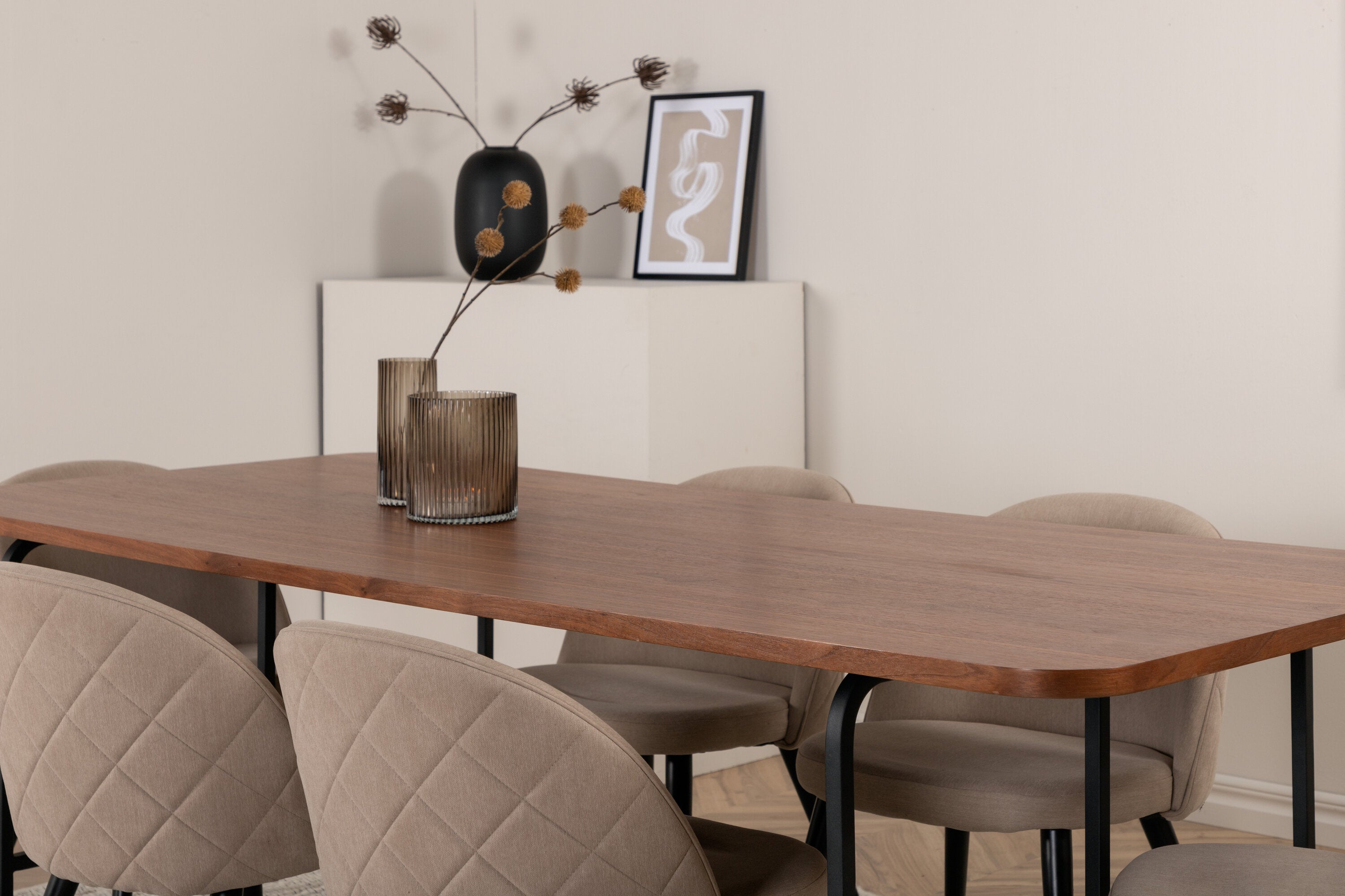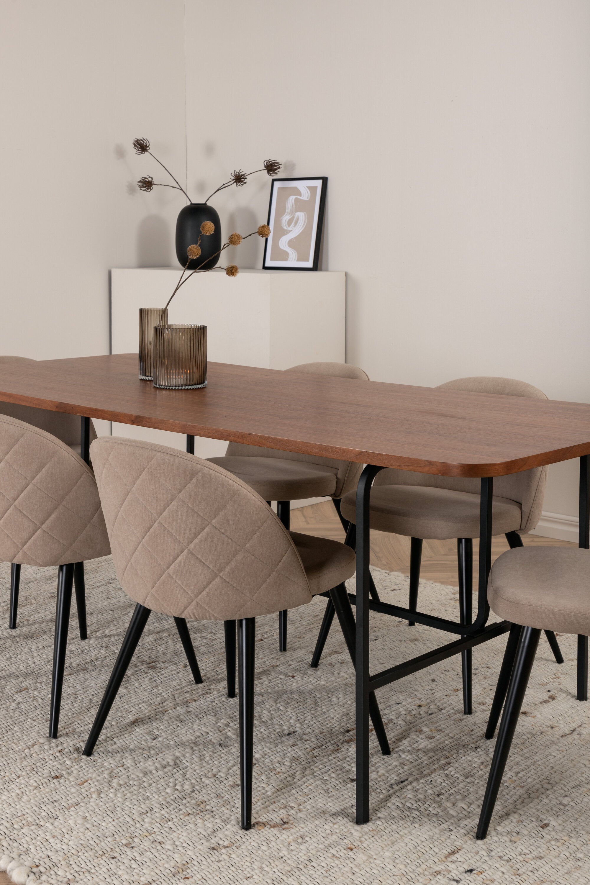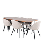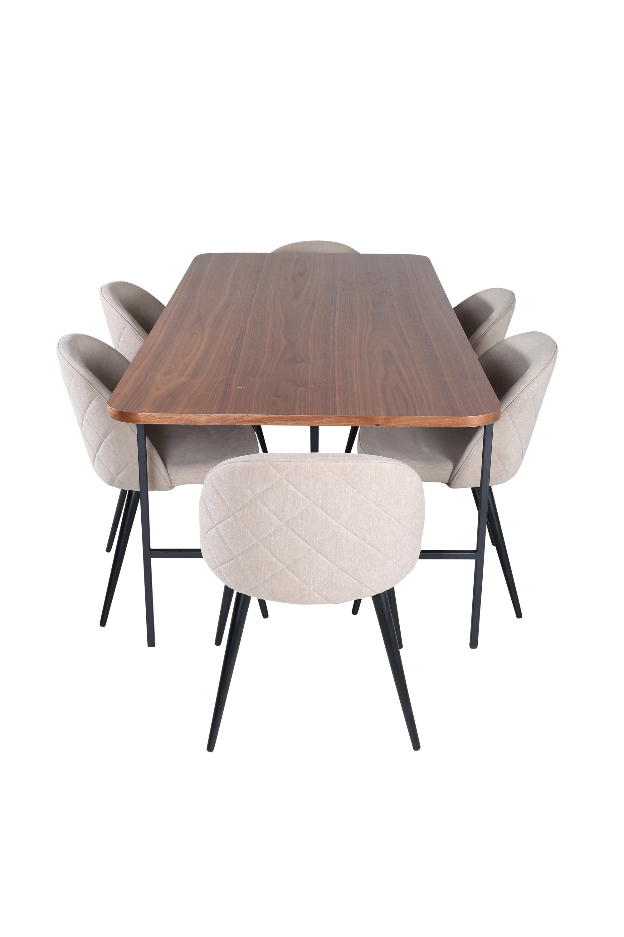 S klasickým a moderním jídelním stolem Uno se může celá rodina sejít k večeři a společenskému setkání. Stůl má obdélníkový design s lehce zaoblenými rohy, horní deskou z MDF v barvě ořechu s dýhou a stylovým podvozkem v černém kovu. Rozměry stolu: Délka: 200 cm, Šířka: 90 cm, Výška: 74 cm. Sladěno s 6 jídelními židlemi Velvet Stitches s rozšířenými černými kostmi z kovu a sedáky z béžového polyesterového plátna s dekorativním stehem. Rozměry židle: Výška: 76,5 cm, výška sedáku: 46,5 cm, šířka: 50 cm, hloubka: 57 cm. Nechte se inspirovat poutavou skupinou jídel!